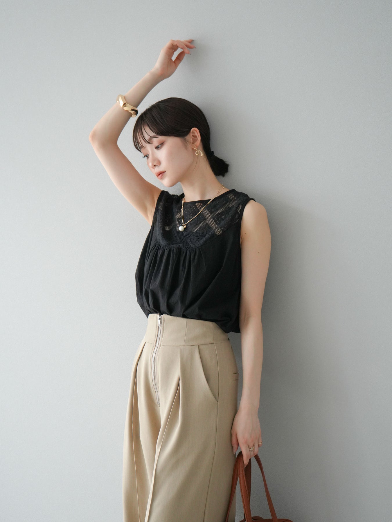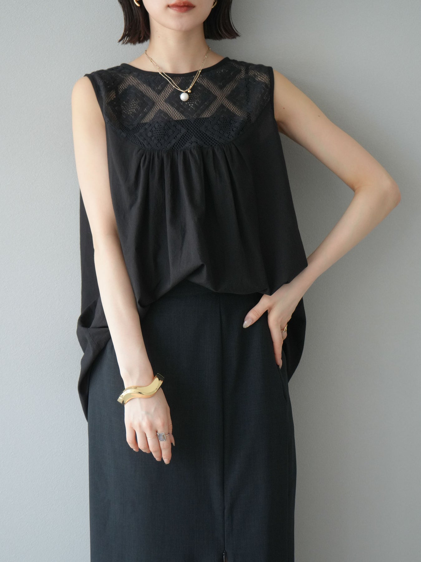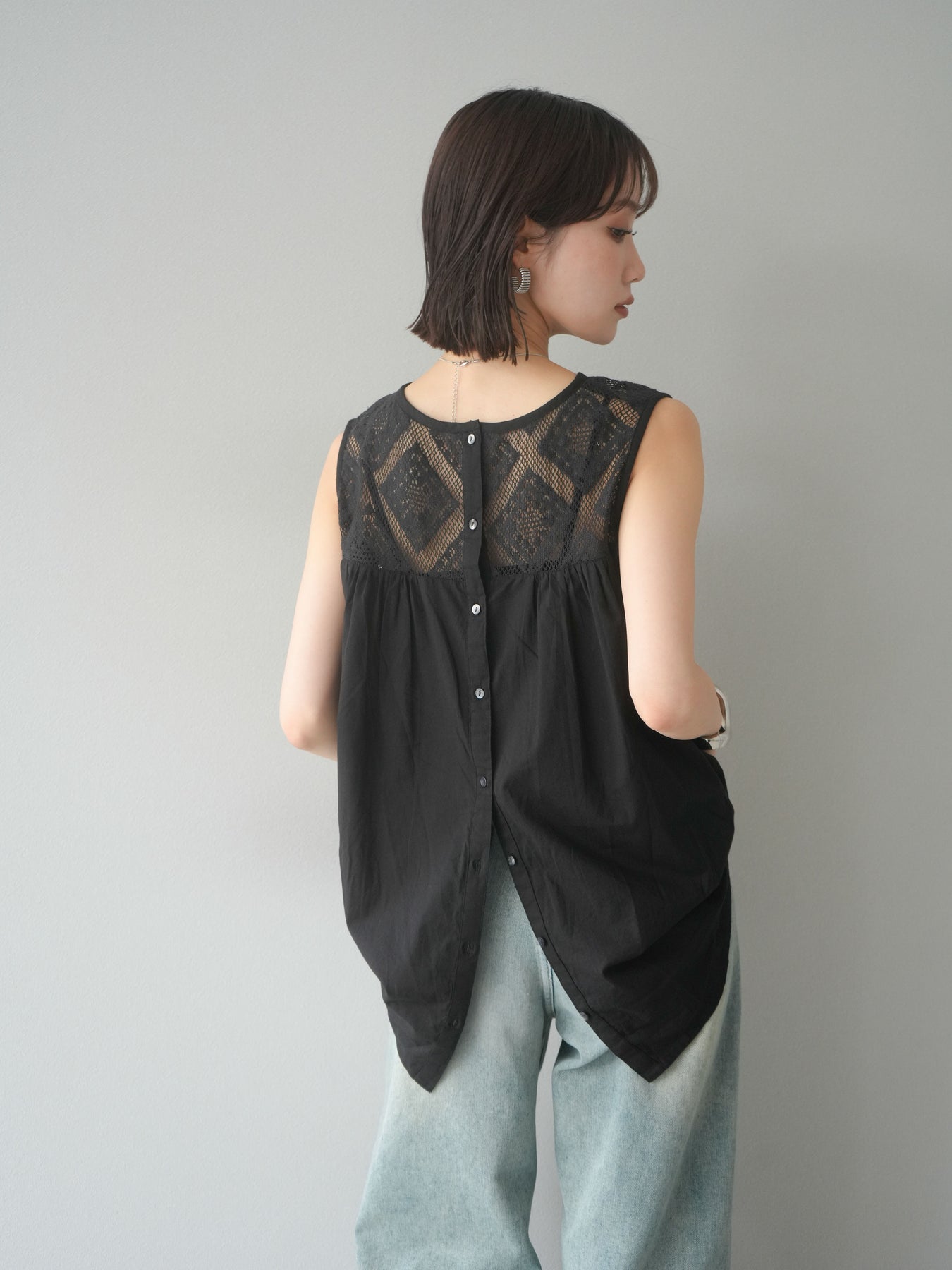 [予約]インド製コットンレース切替ノースリブラウス/ブラック