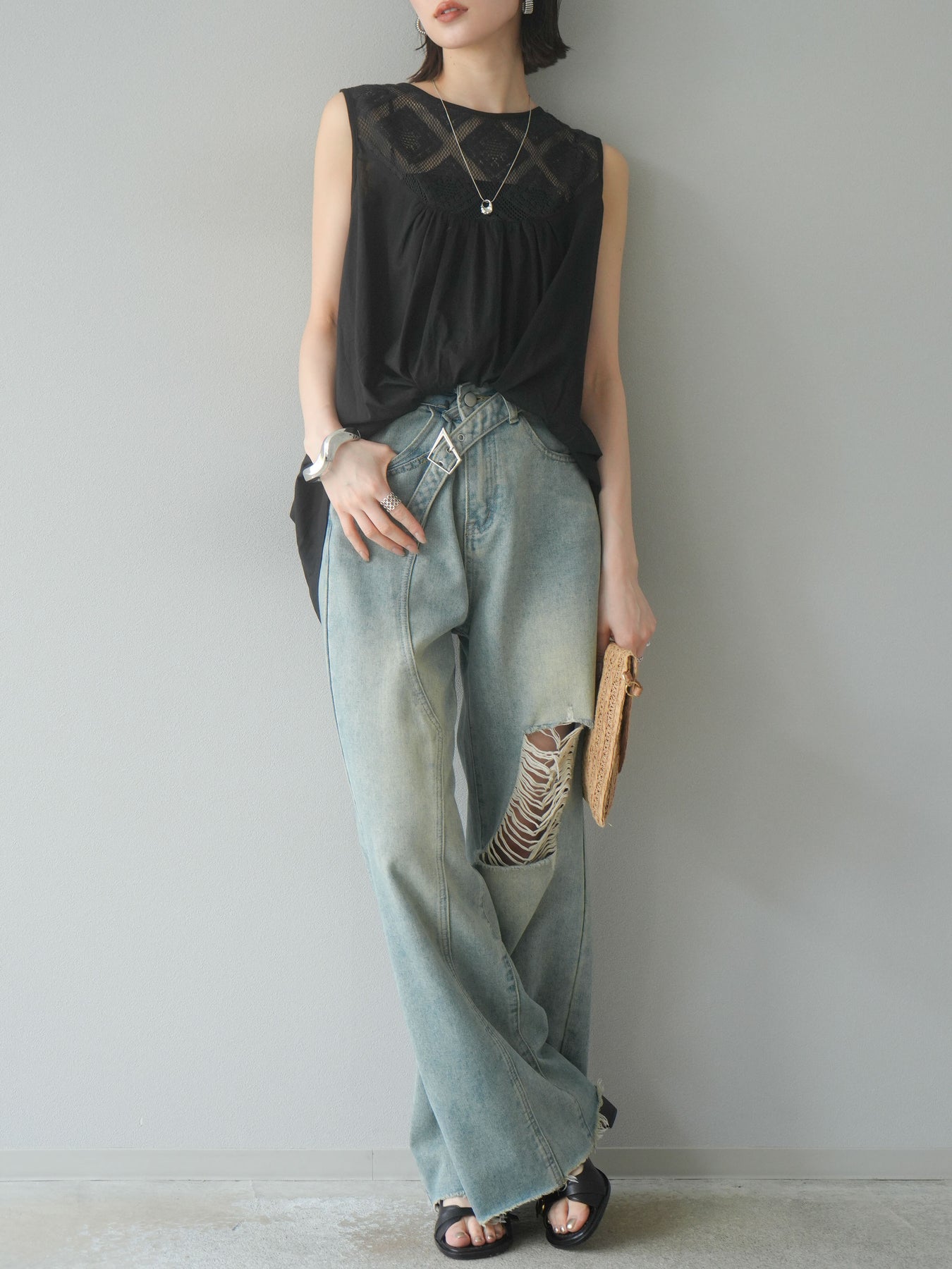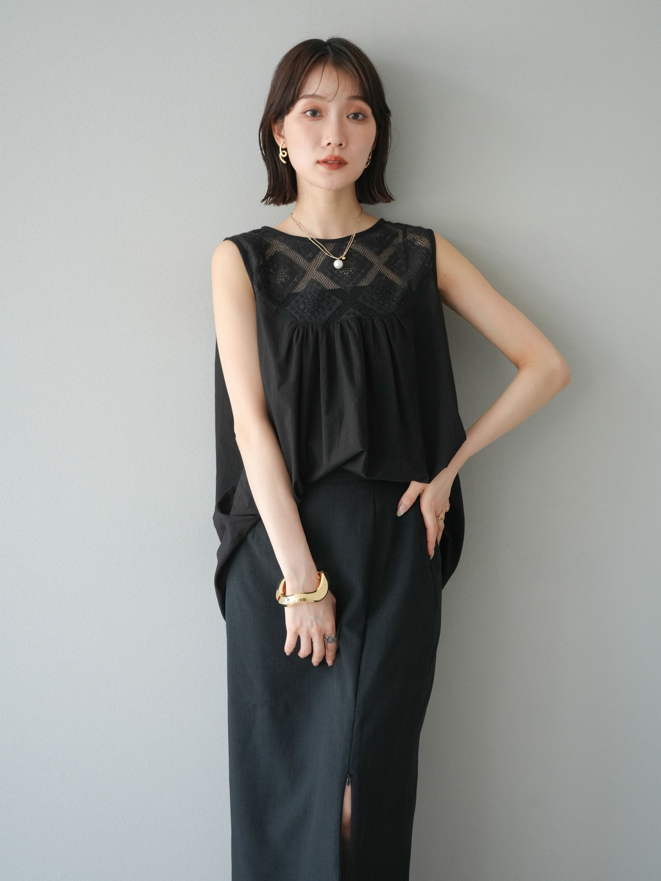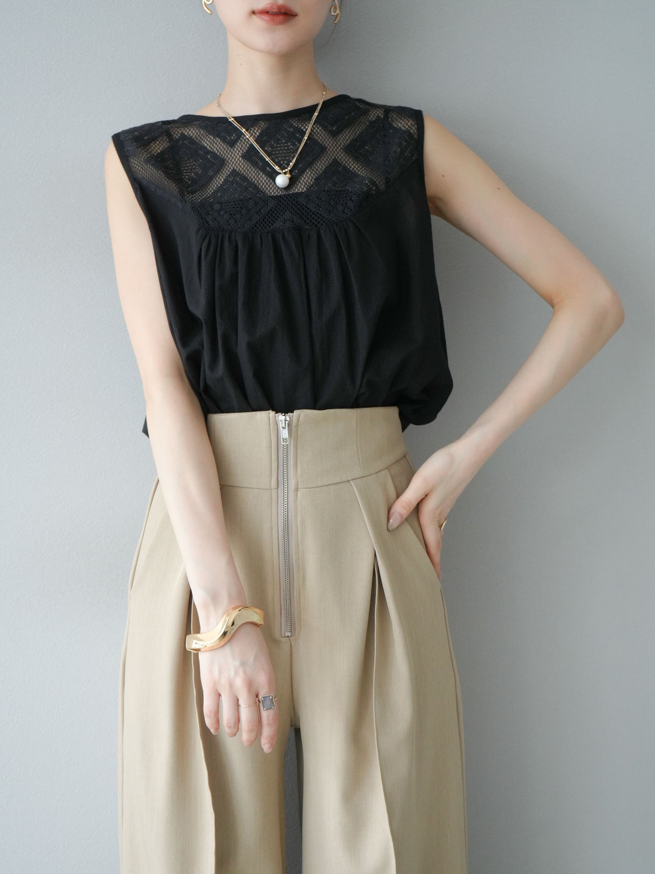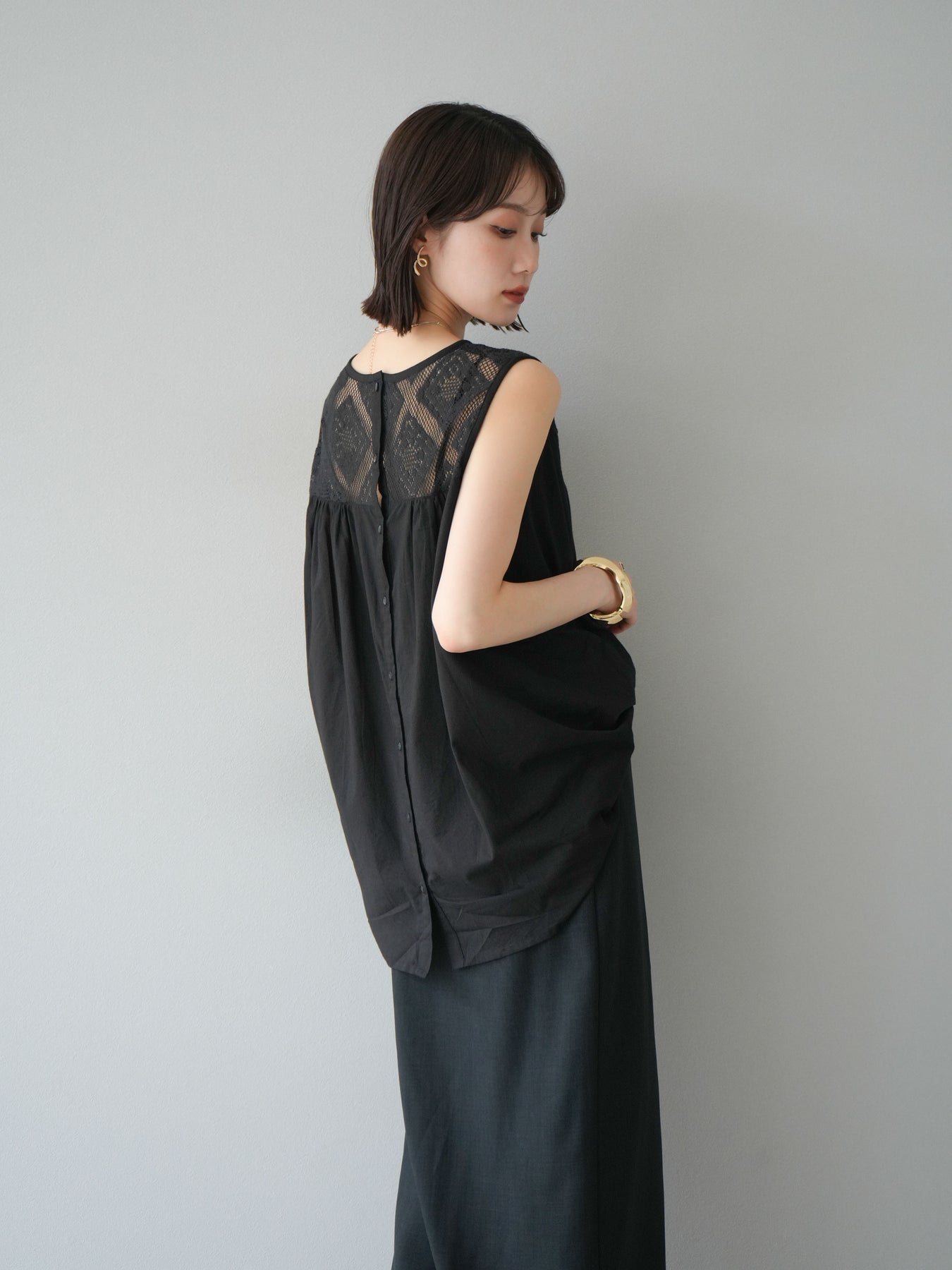 [予約]インド製コットンレース切替ノースリブラウス/ブラック
