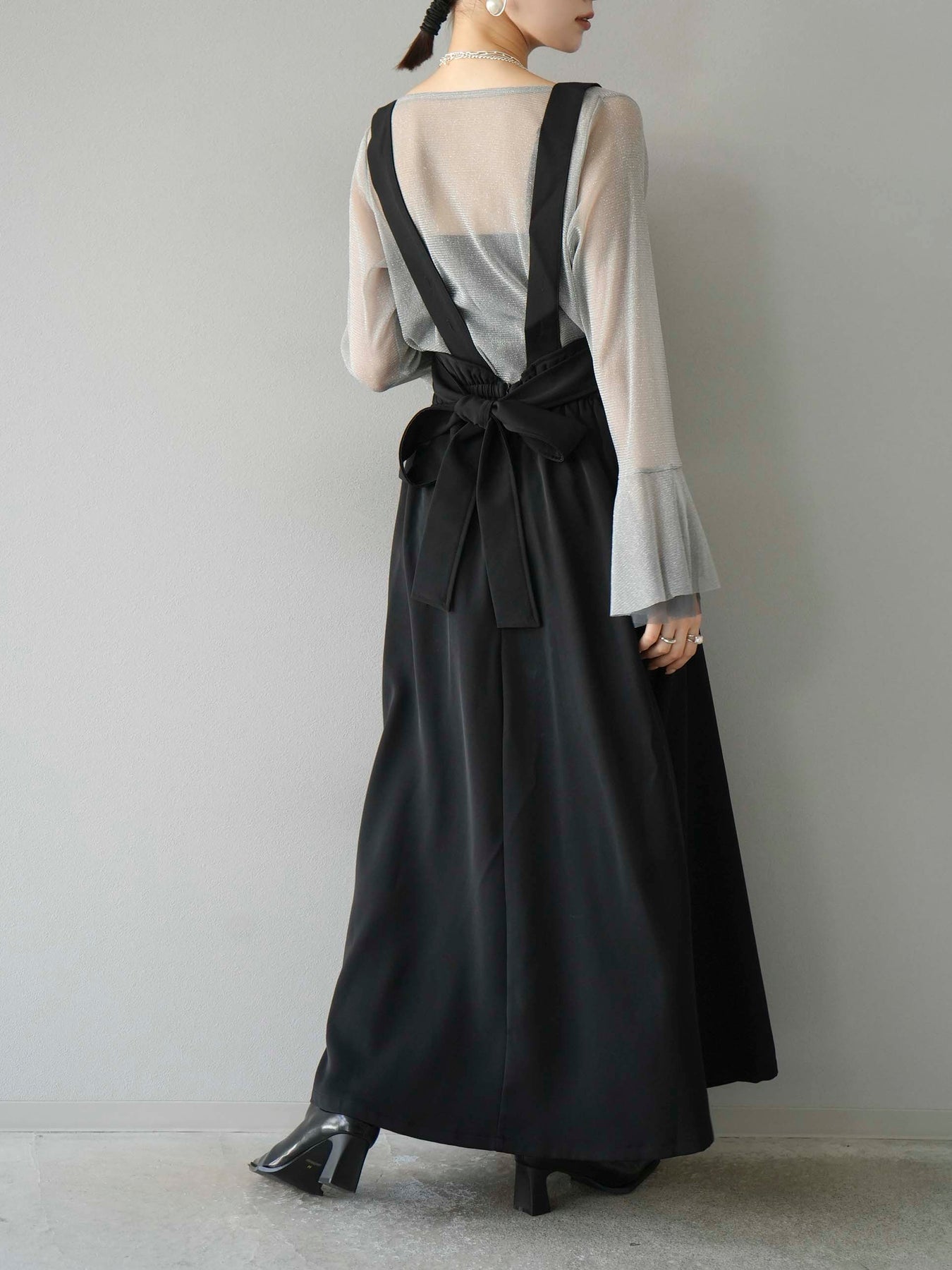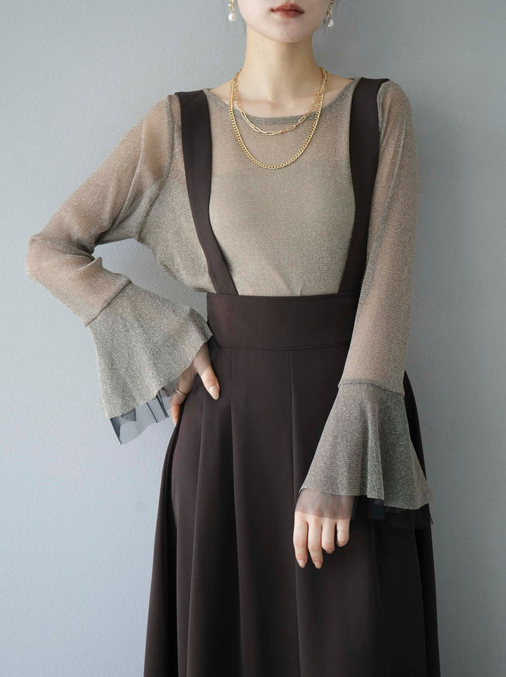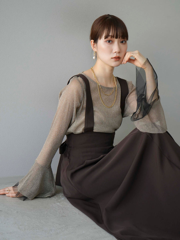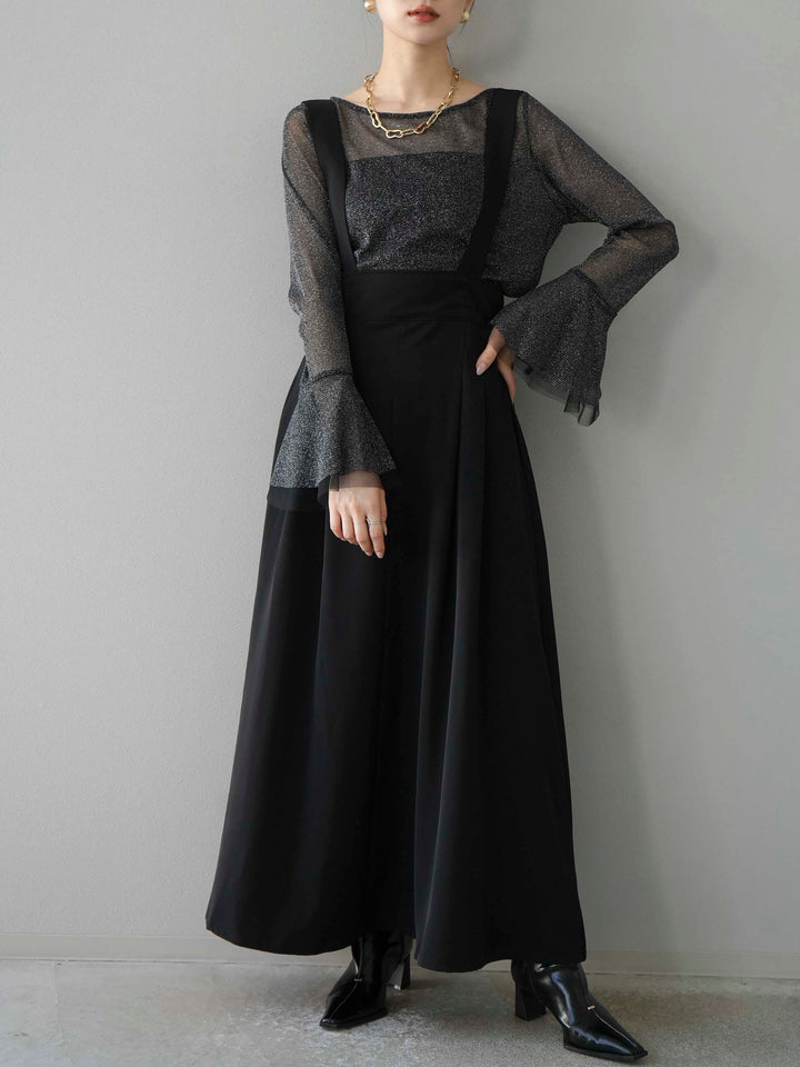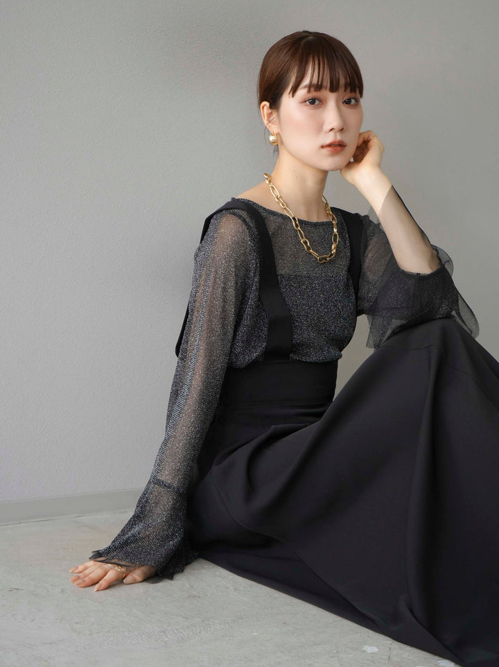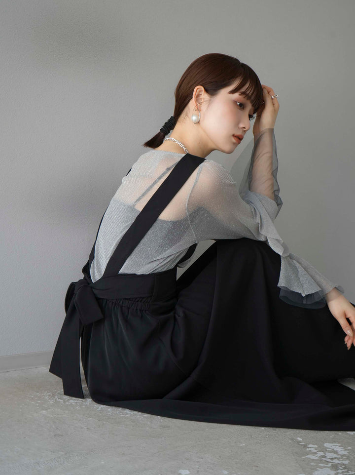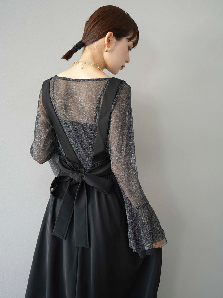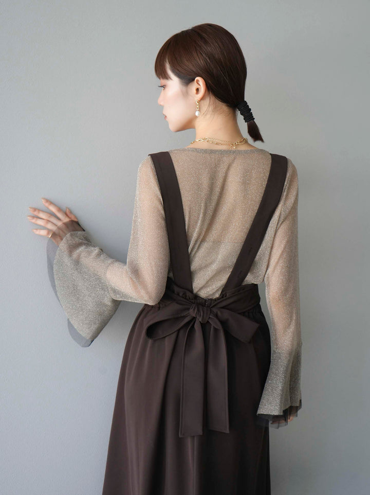 [SET]バックリボンフレアジャンパースカート+ラメシアーベルスリーブトップス(2set)
