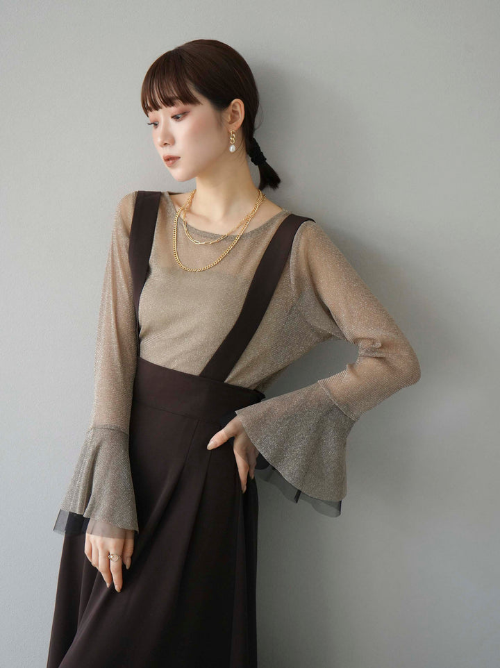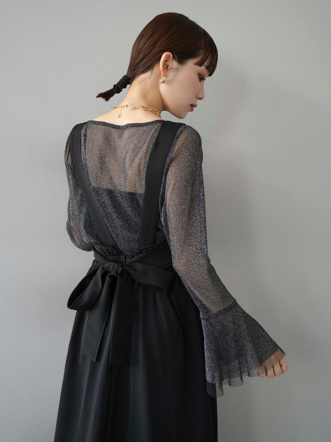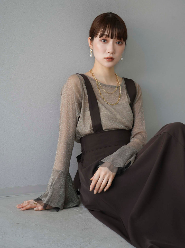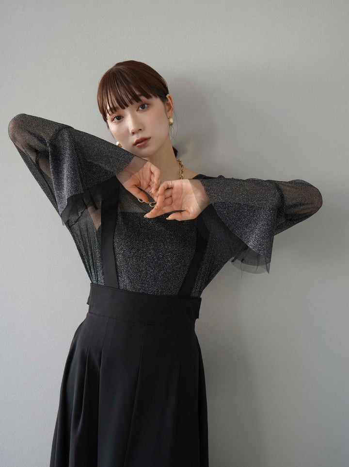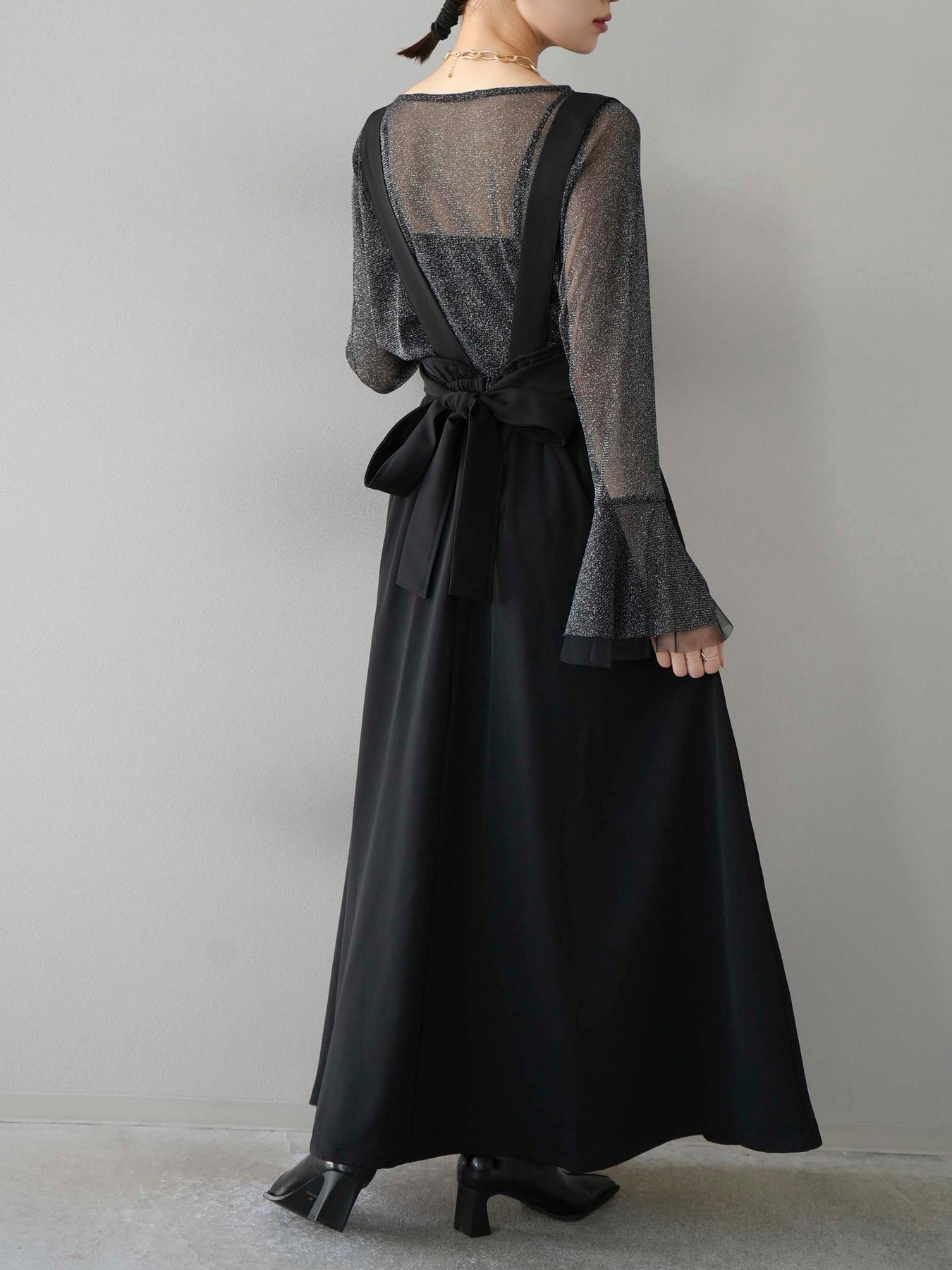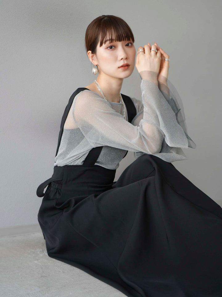 [SET]バックリボンフレアジャンパースカート+ラメシアーベルスリーブトップス(2set)