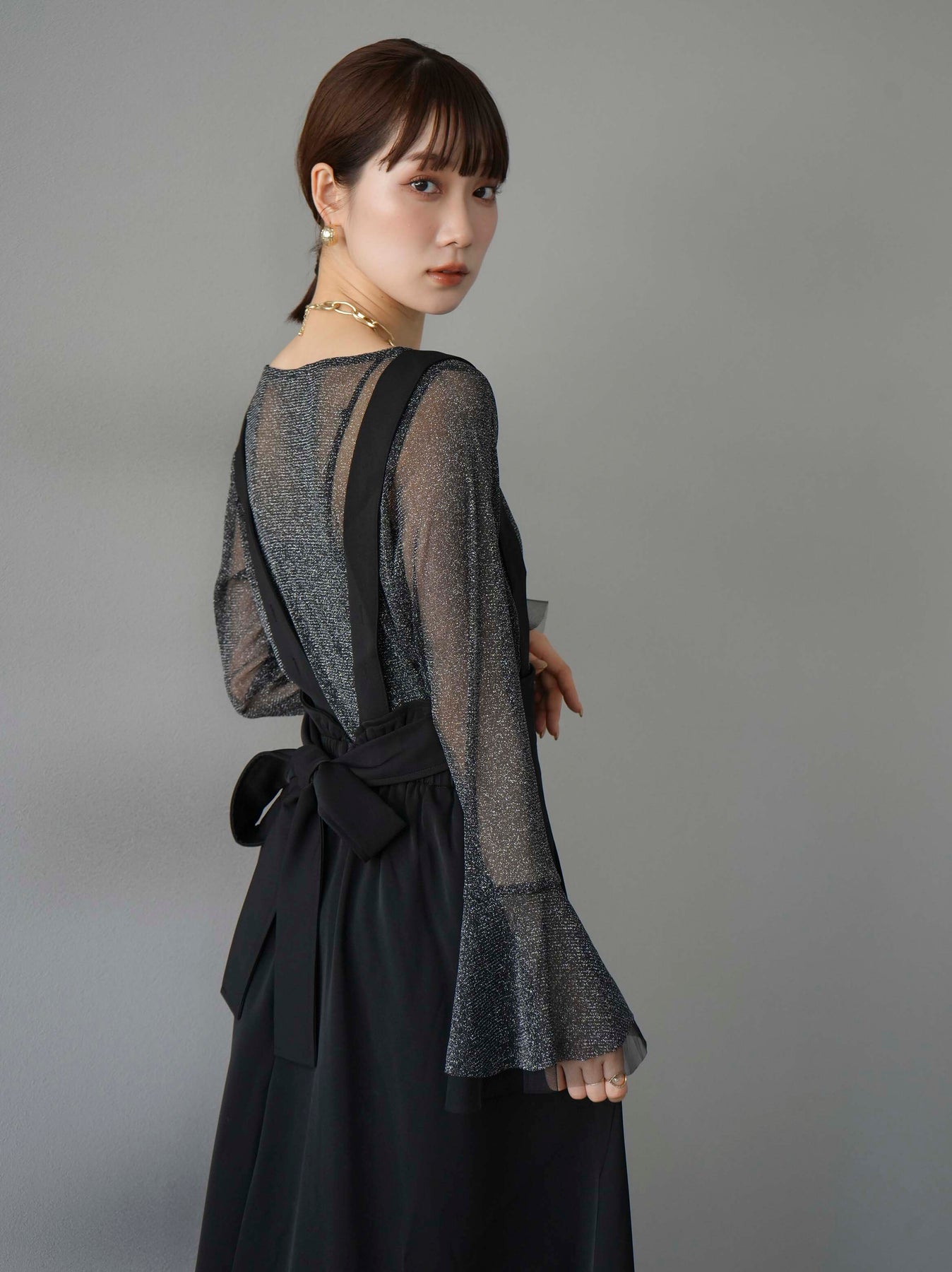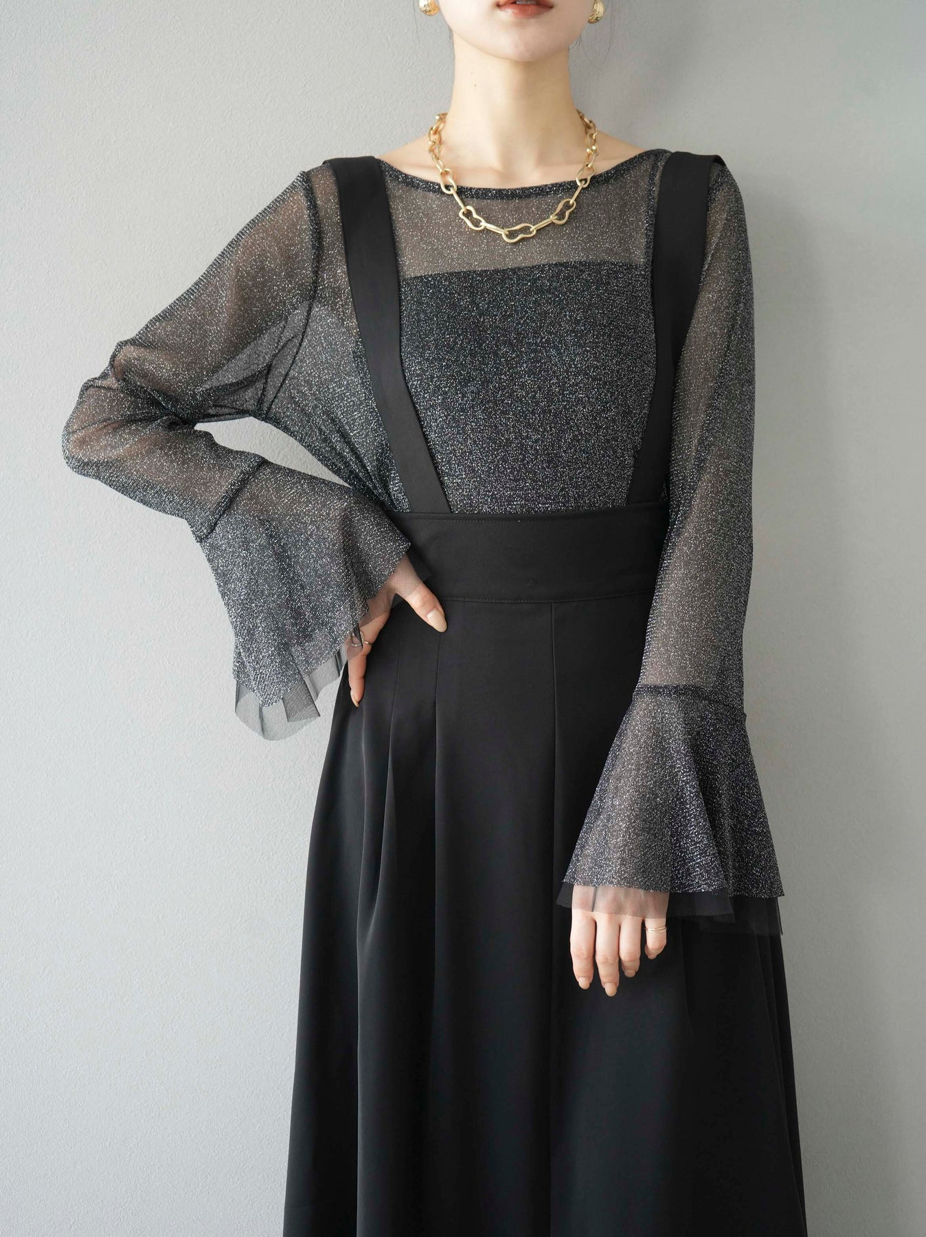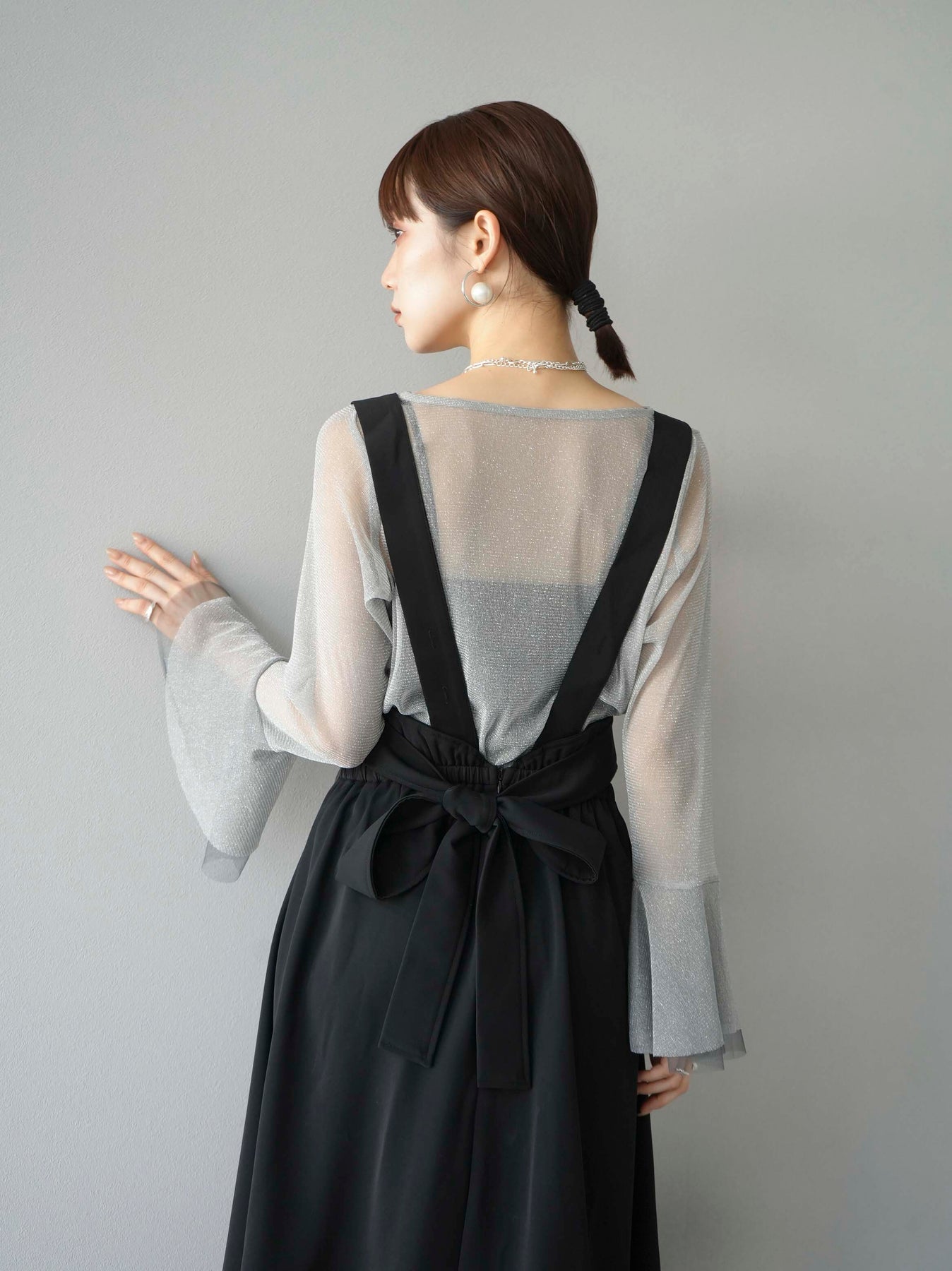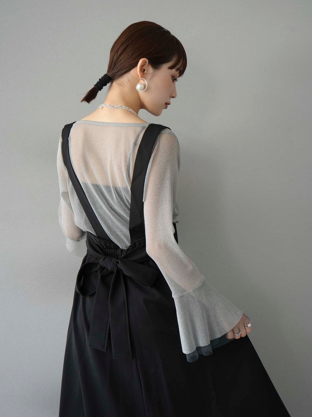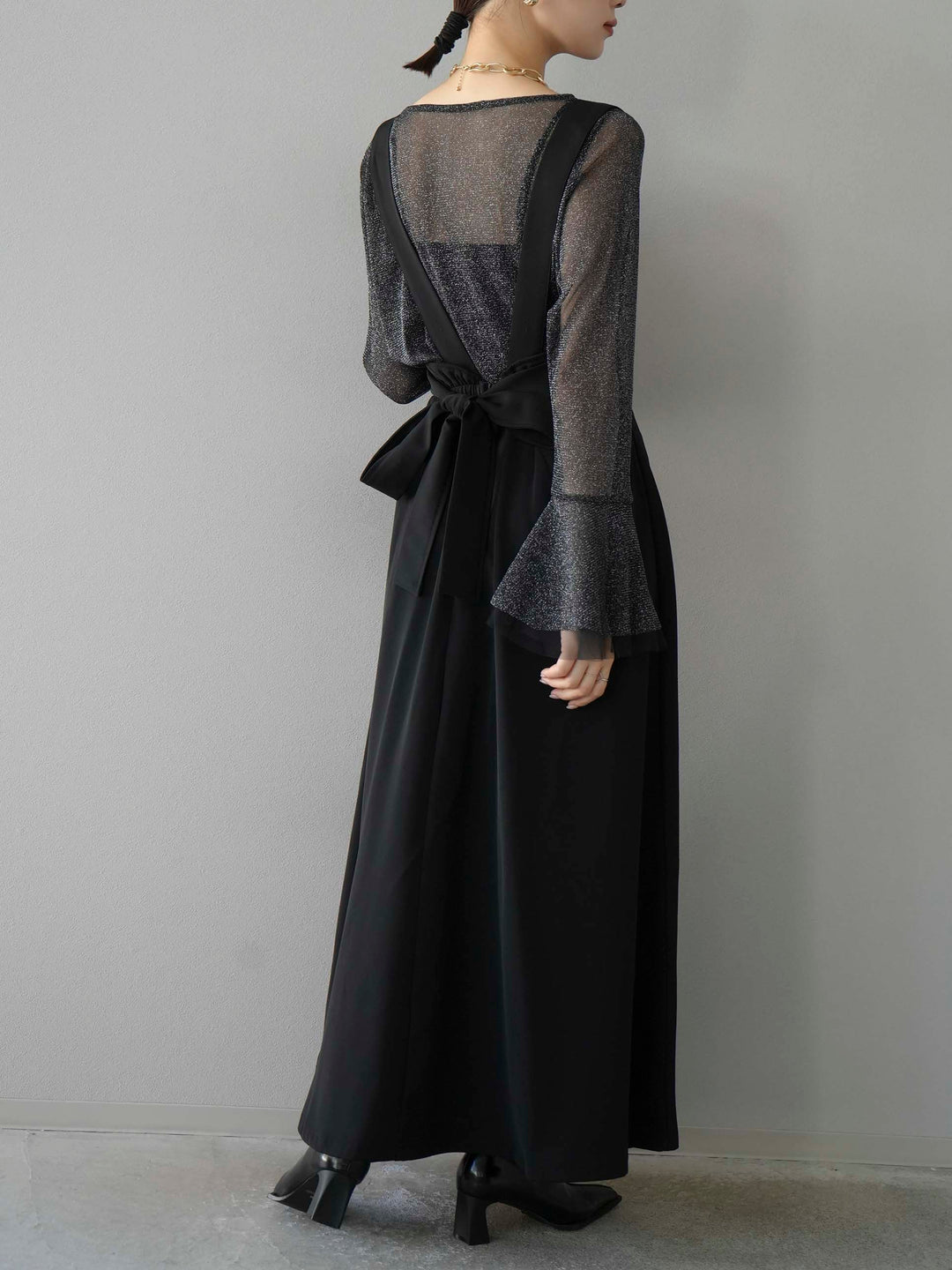 [SET]バックリボンフレアジャンパースカート+ラメシアーベルスリーブトップス(2set)