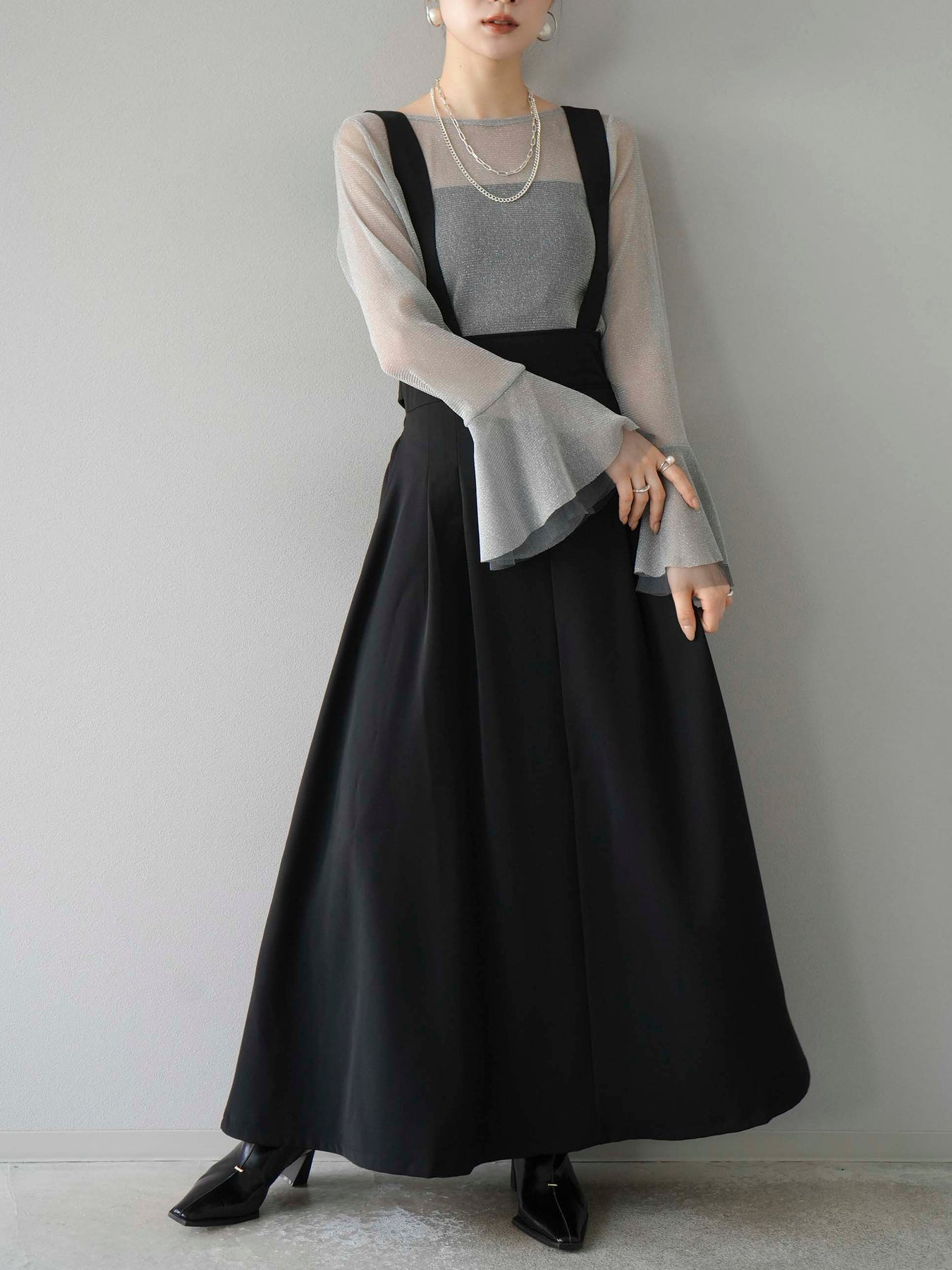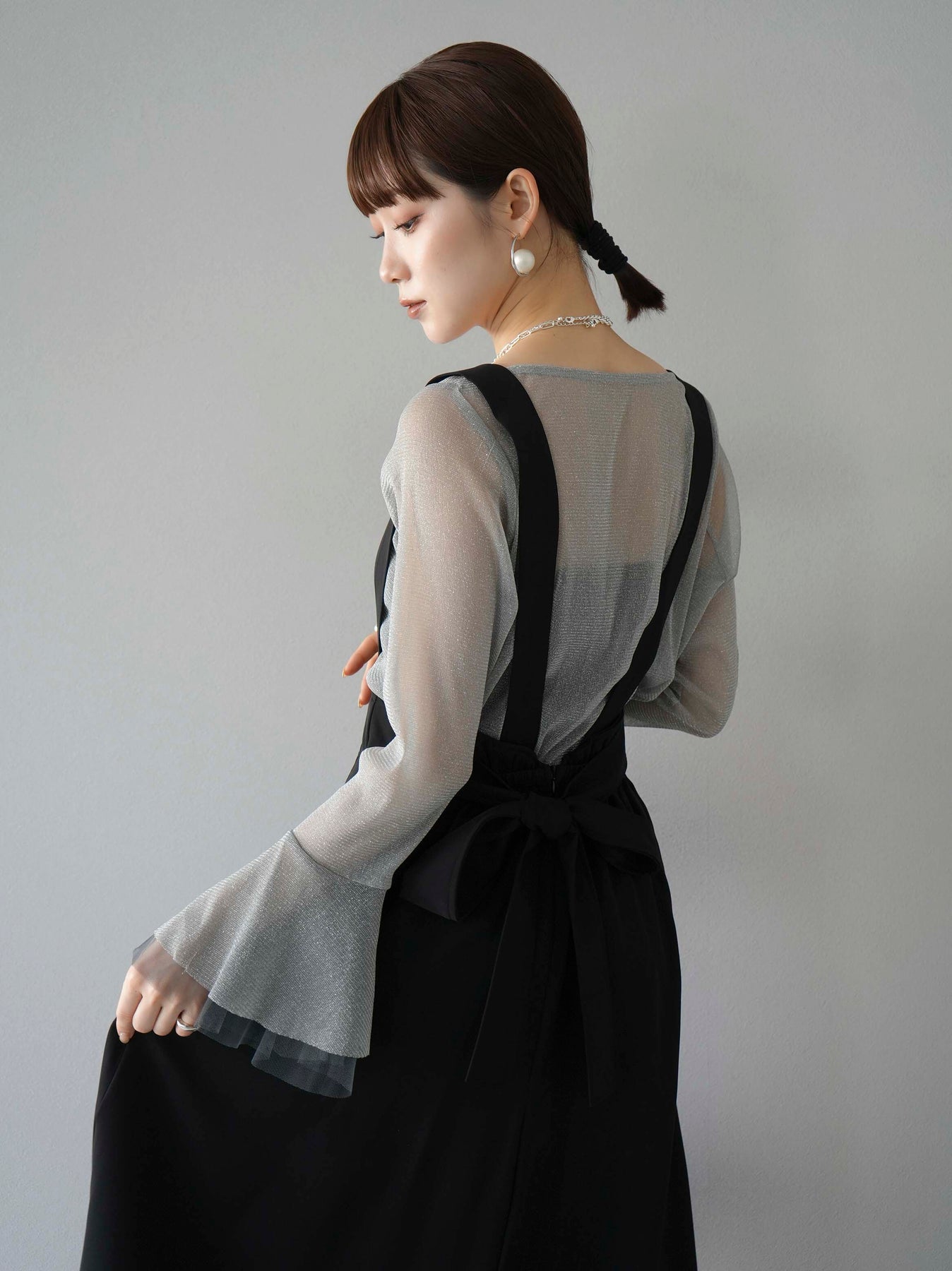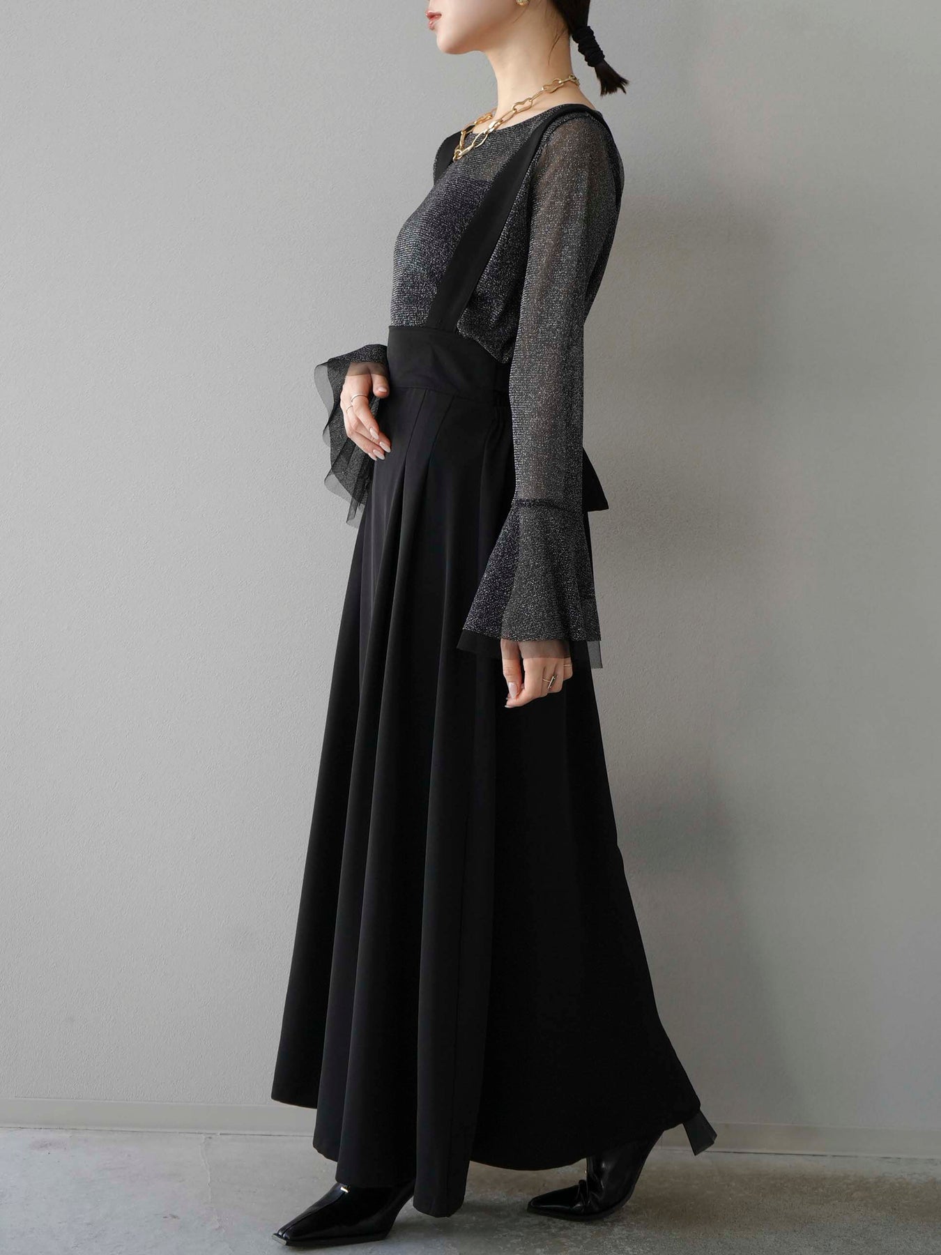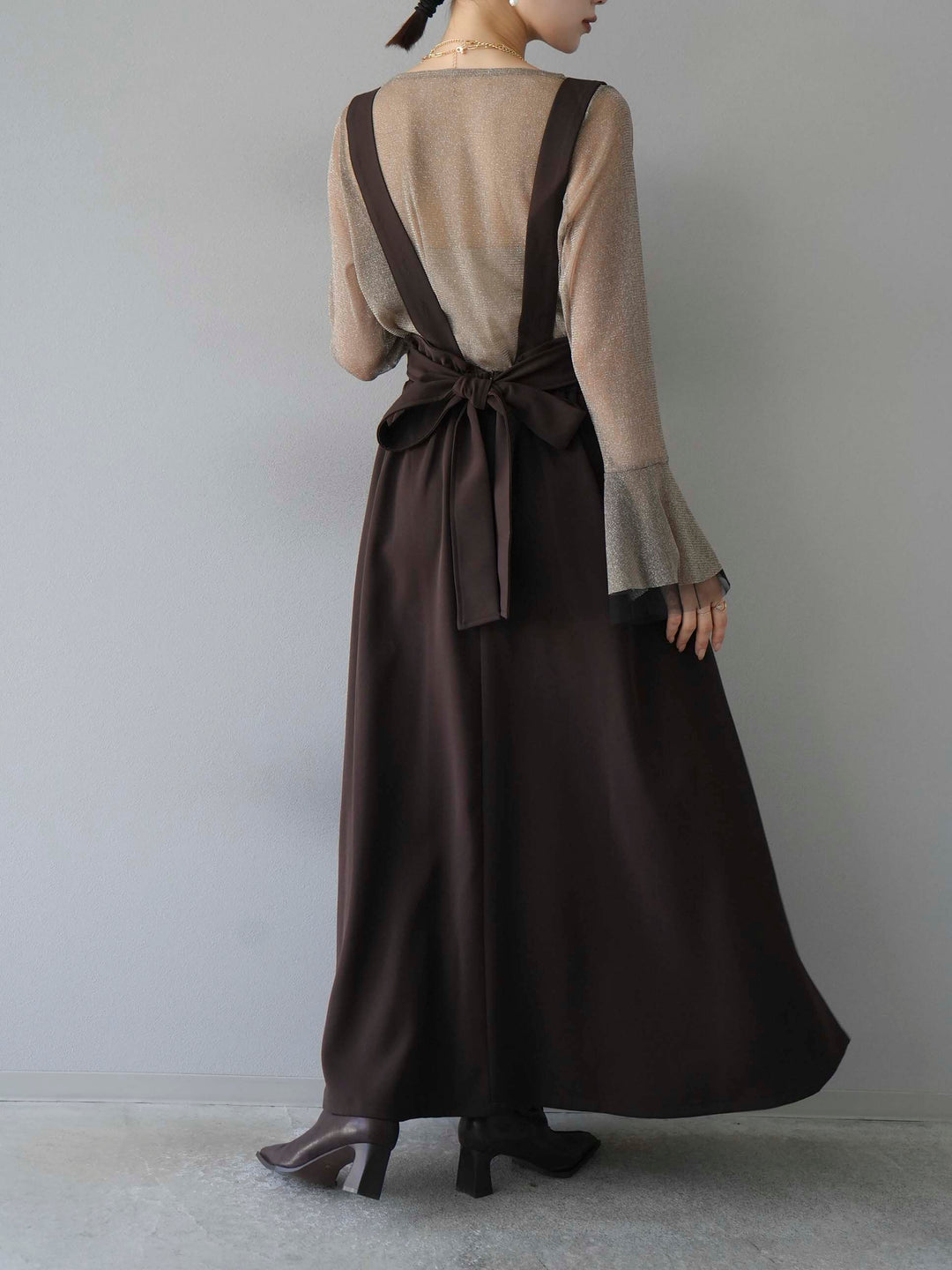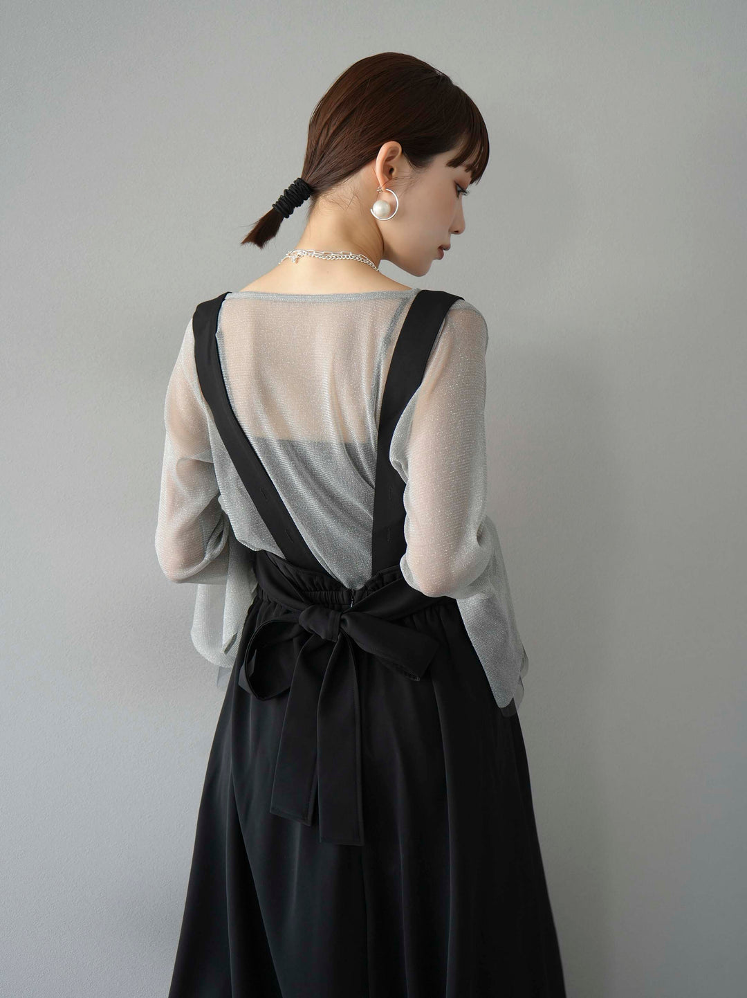 [SET]バックリボンフレアジャンパースカート+ラメシアーベルスリーブトップス(2set)