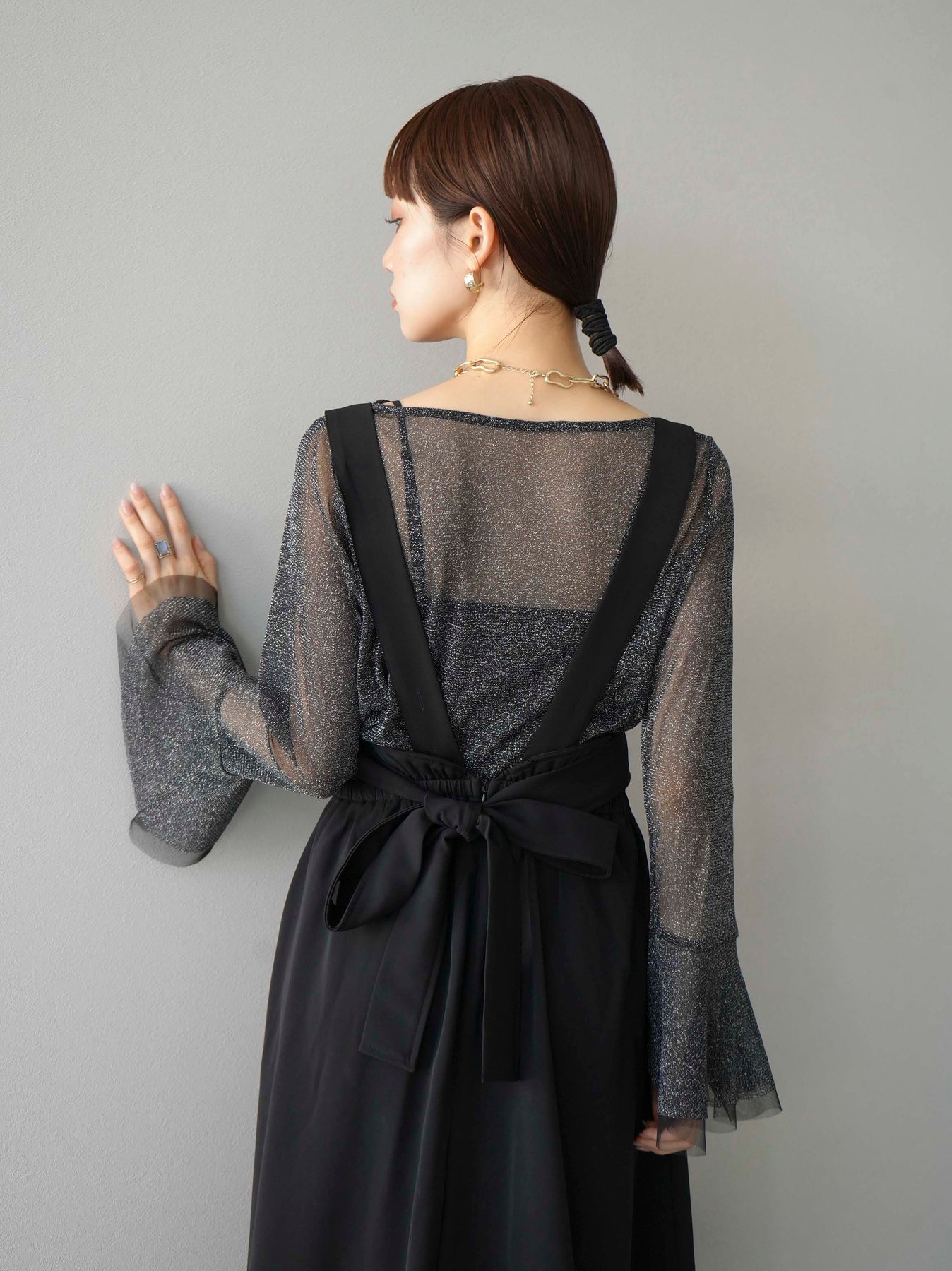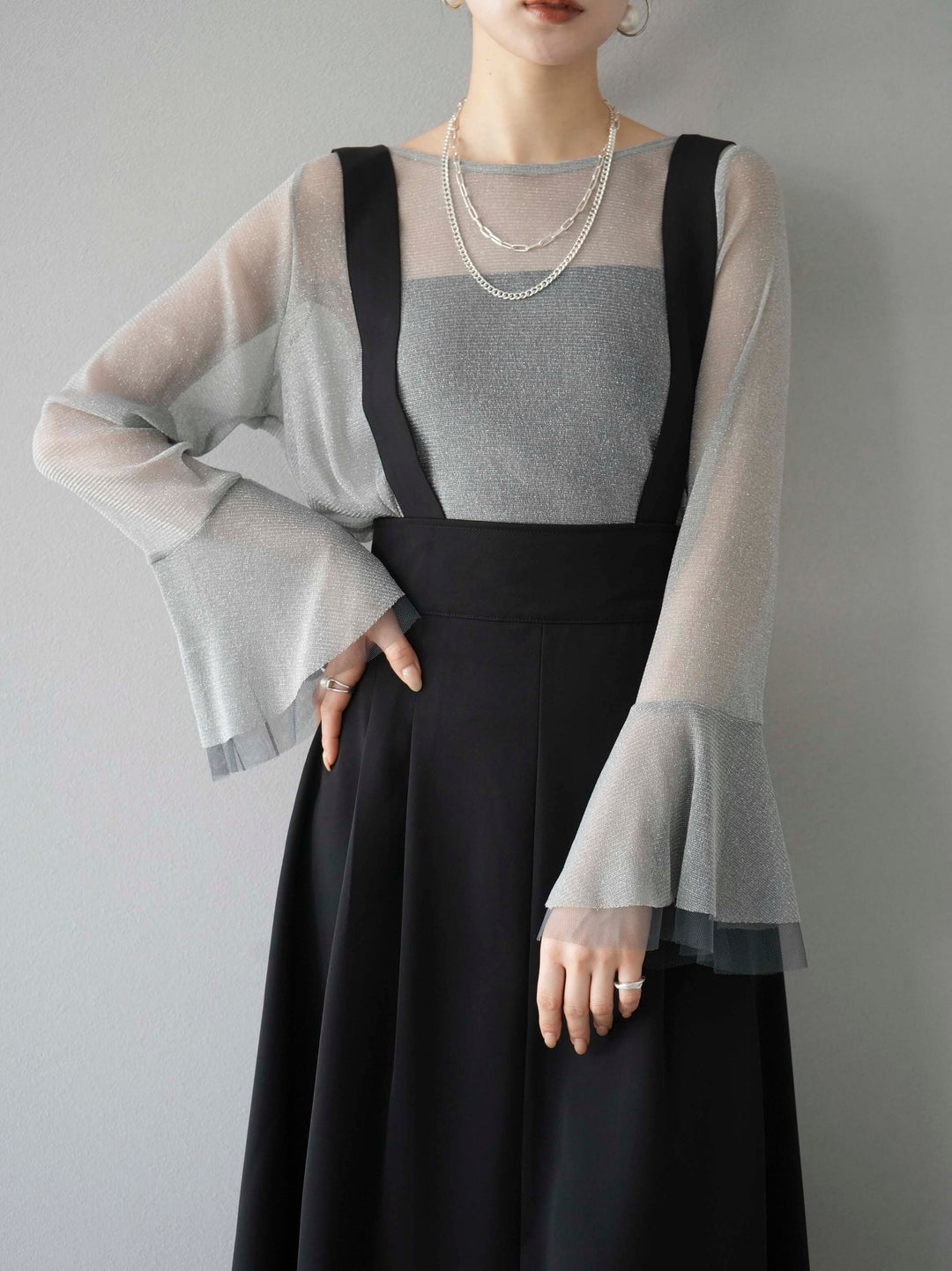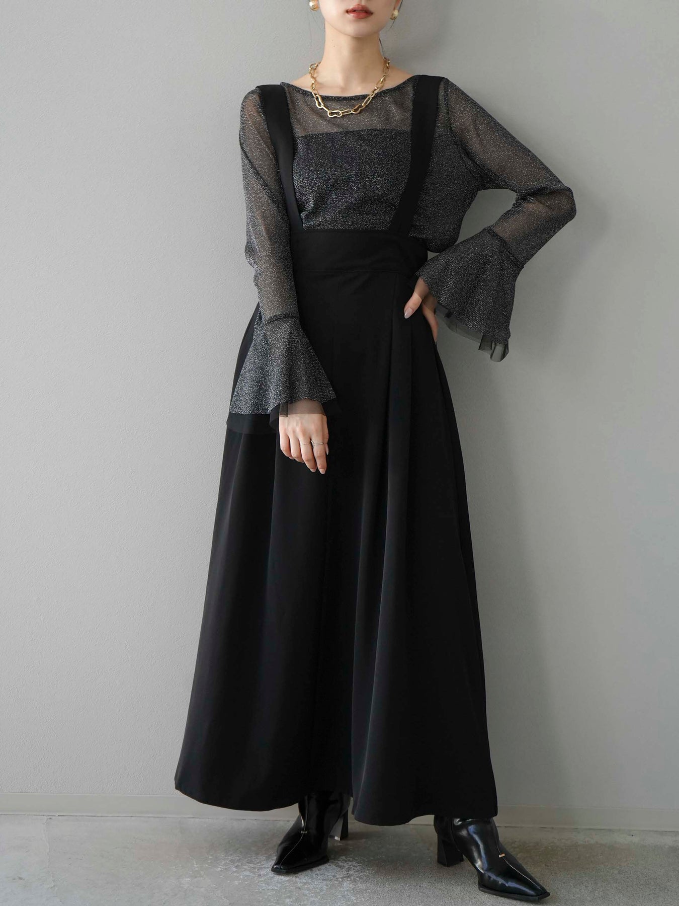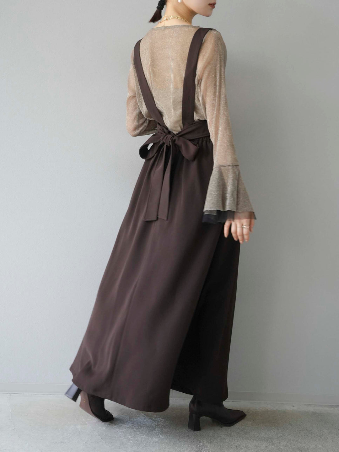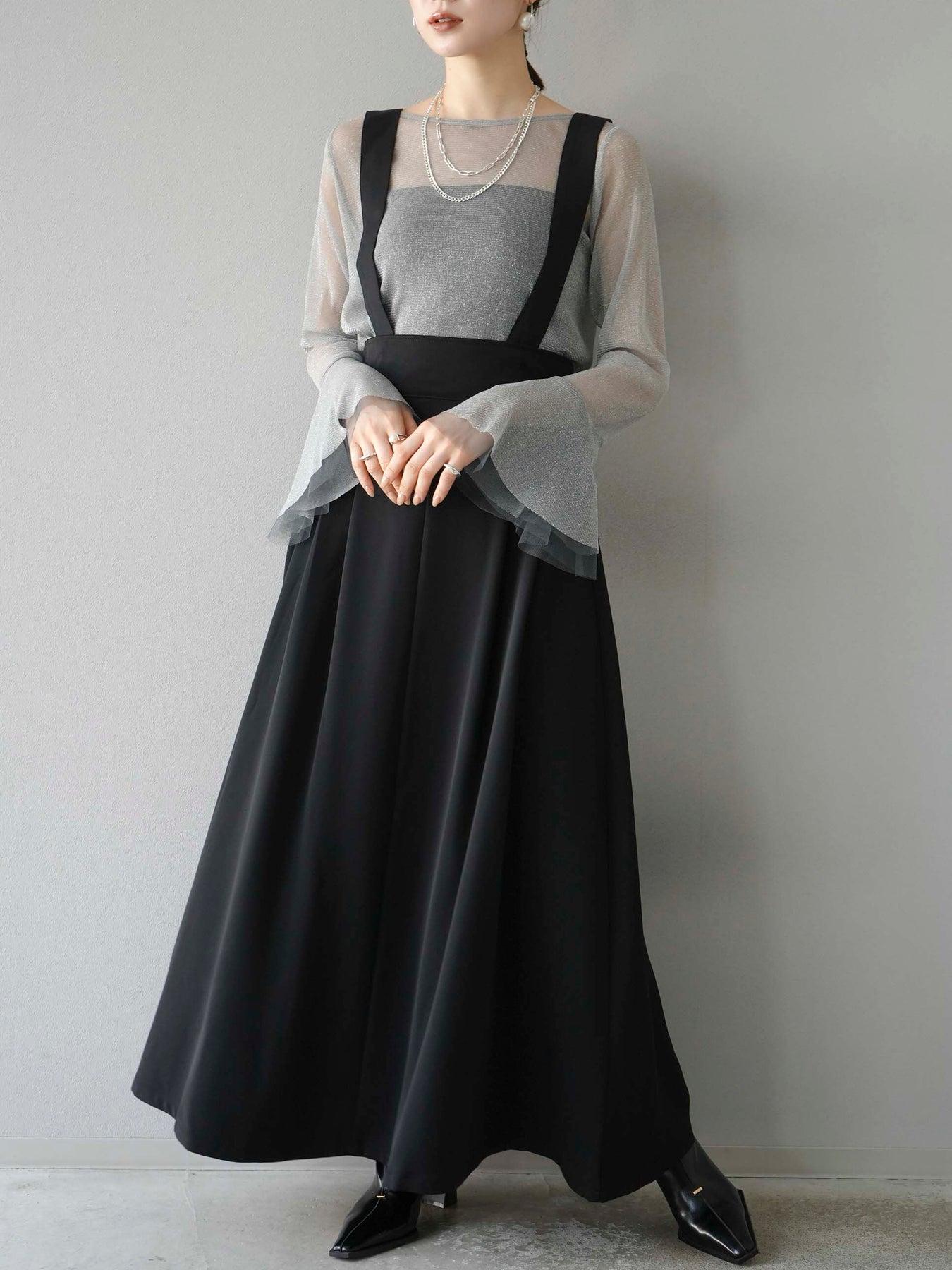 [SET]バックリボンフレアジャンパースカート+ラメシアーベルスリーブトップス(2set)