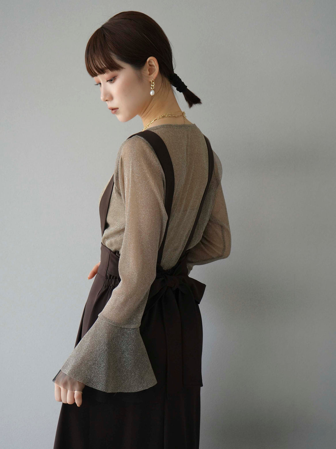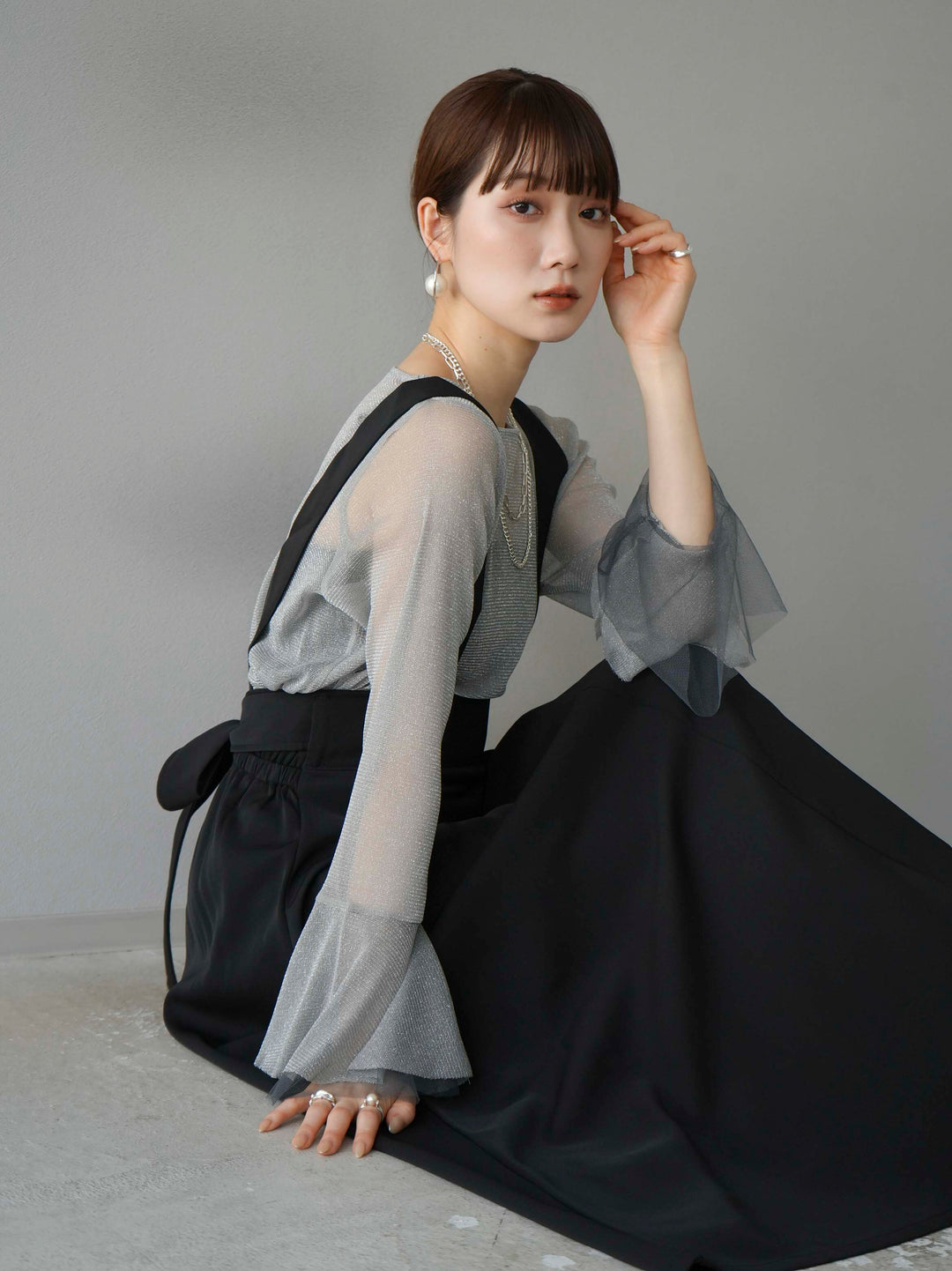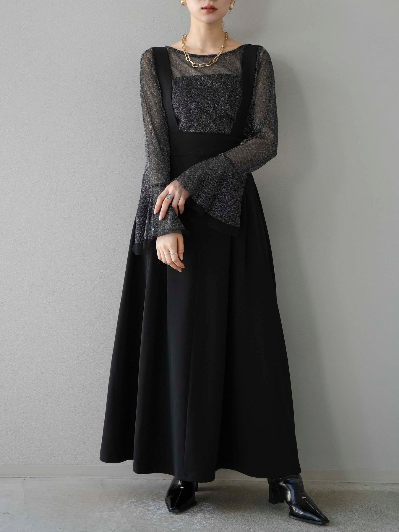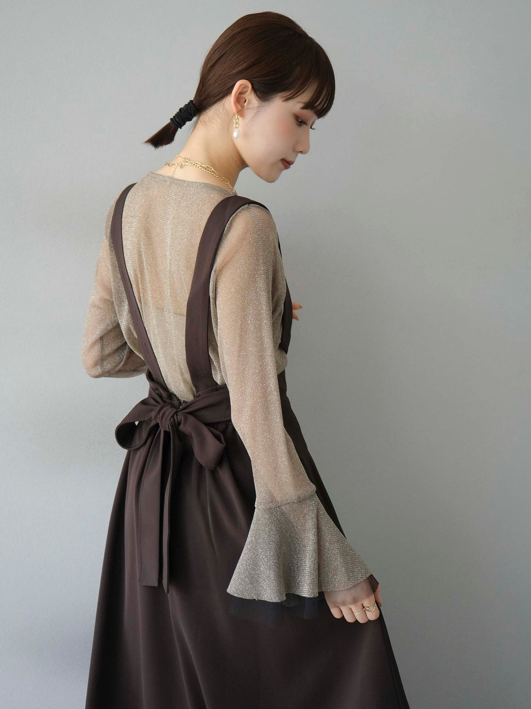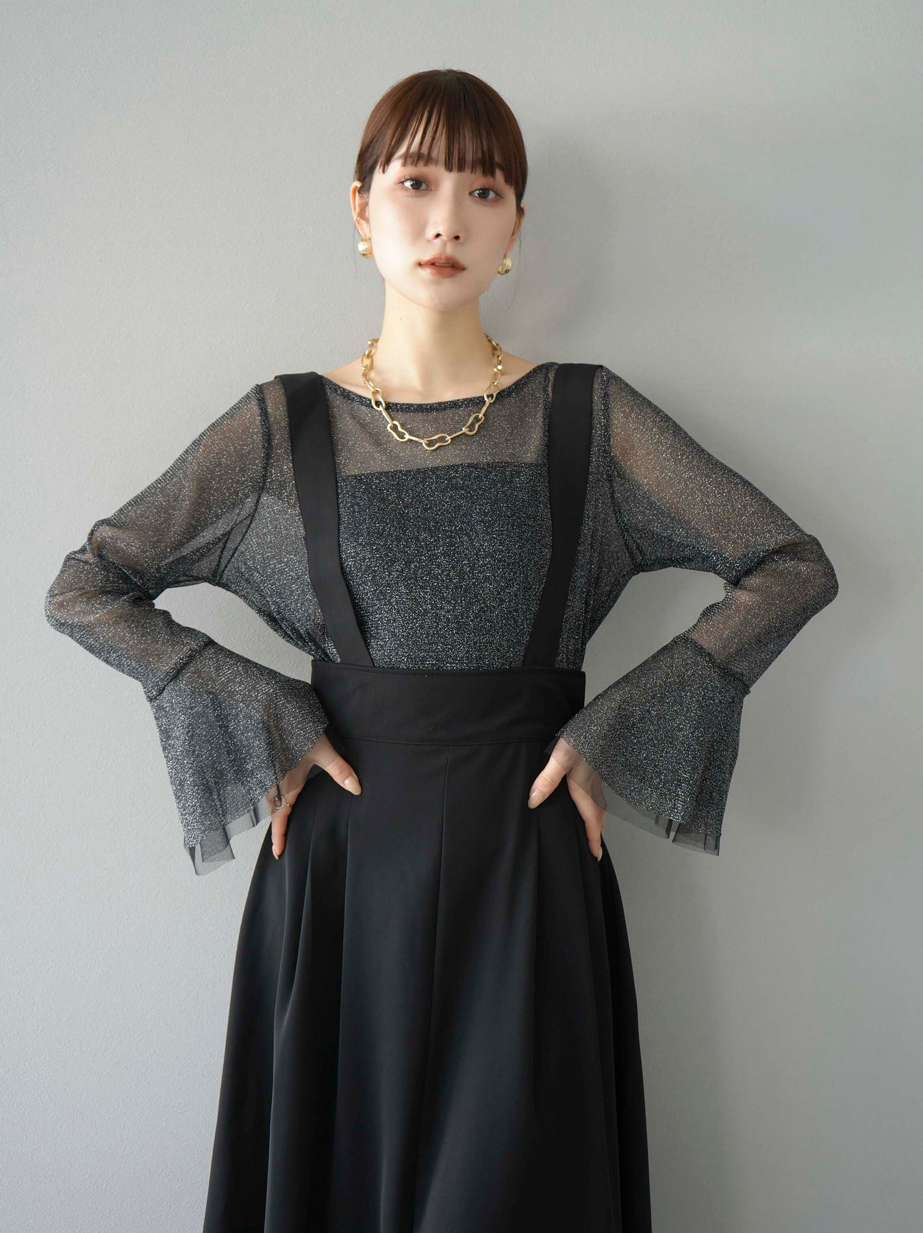 [SET]バックリボンフレアジャンパースカート+ラメシアーベルスリーブトップス(2set)