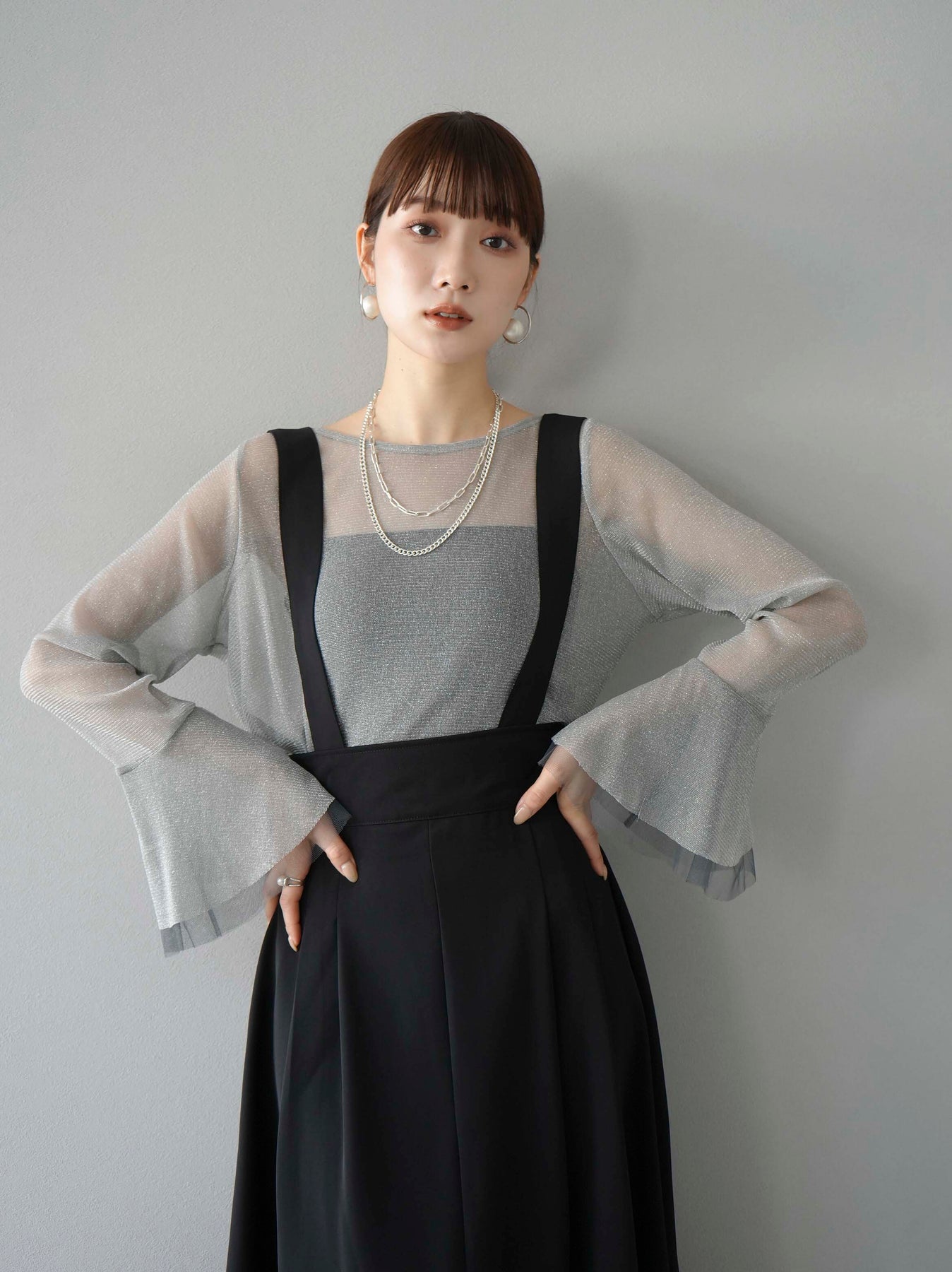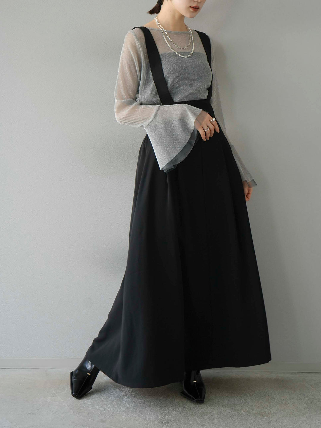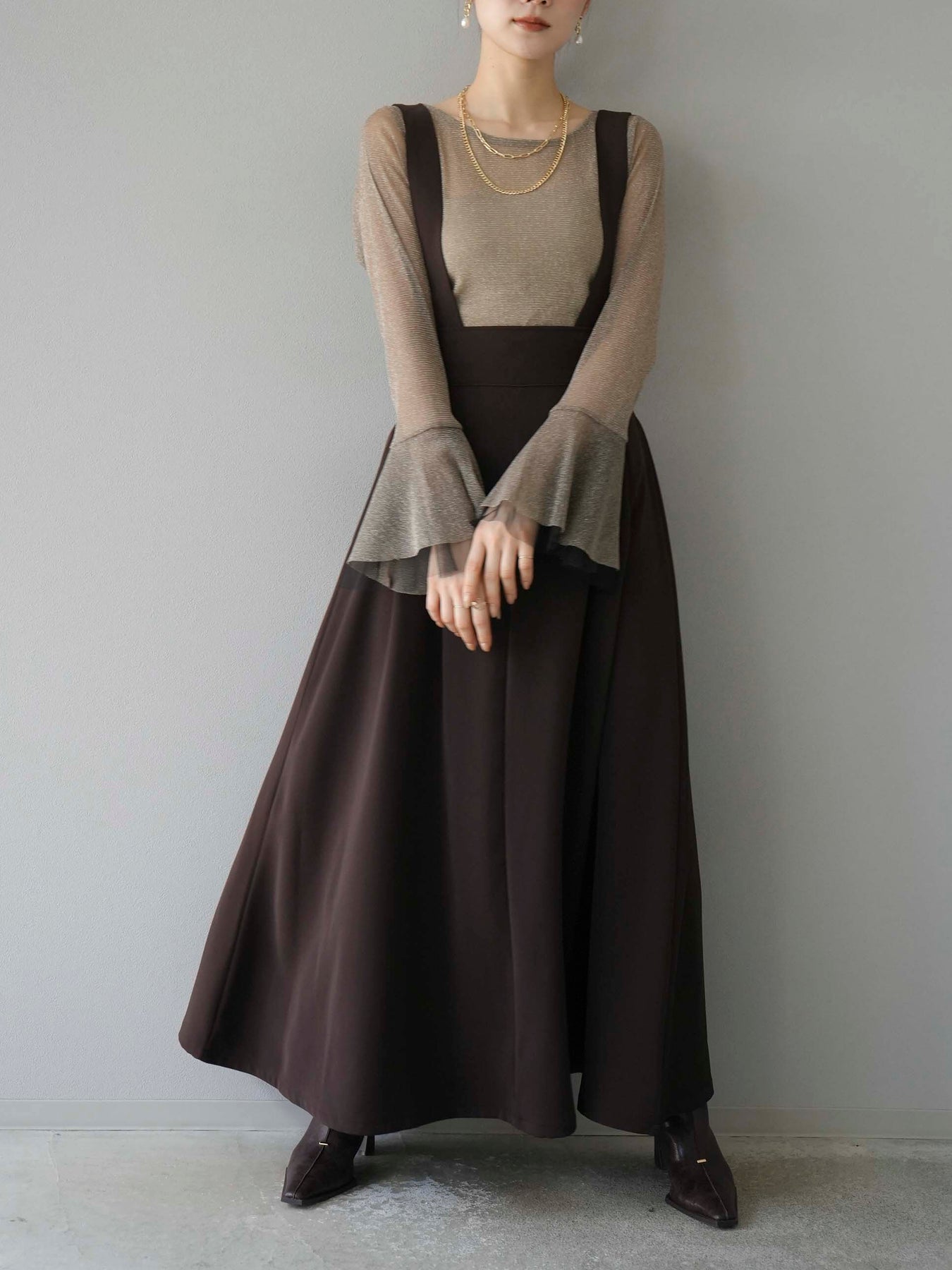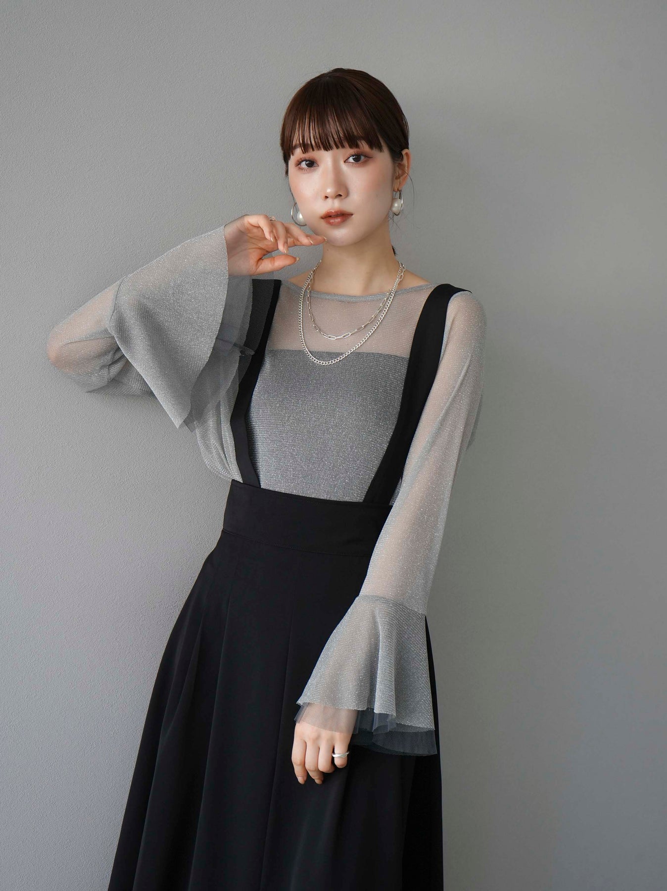 [SET]バックリボンフレアジャンパースカート+ラメシアーベルスリーブトップス(2set)