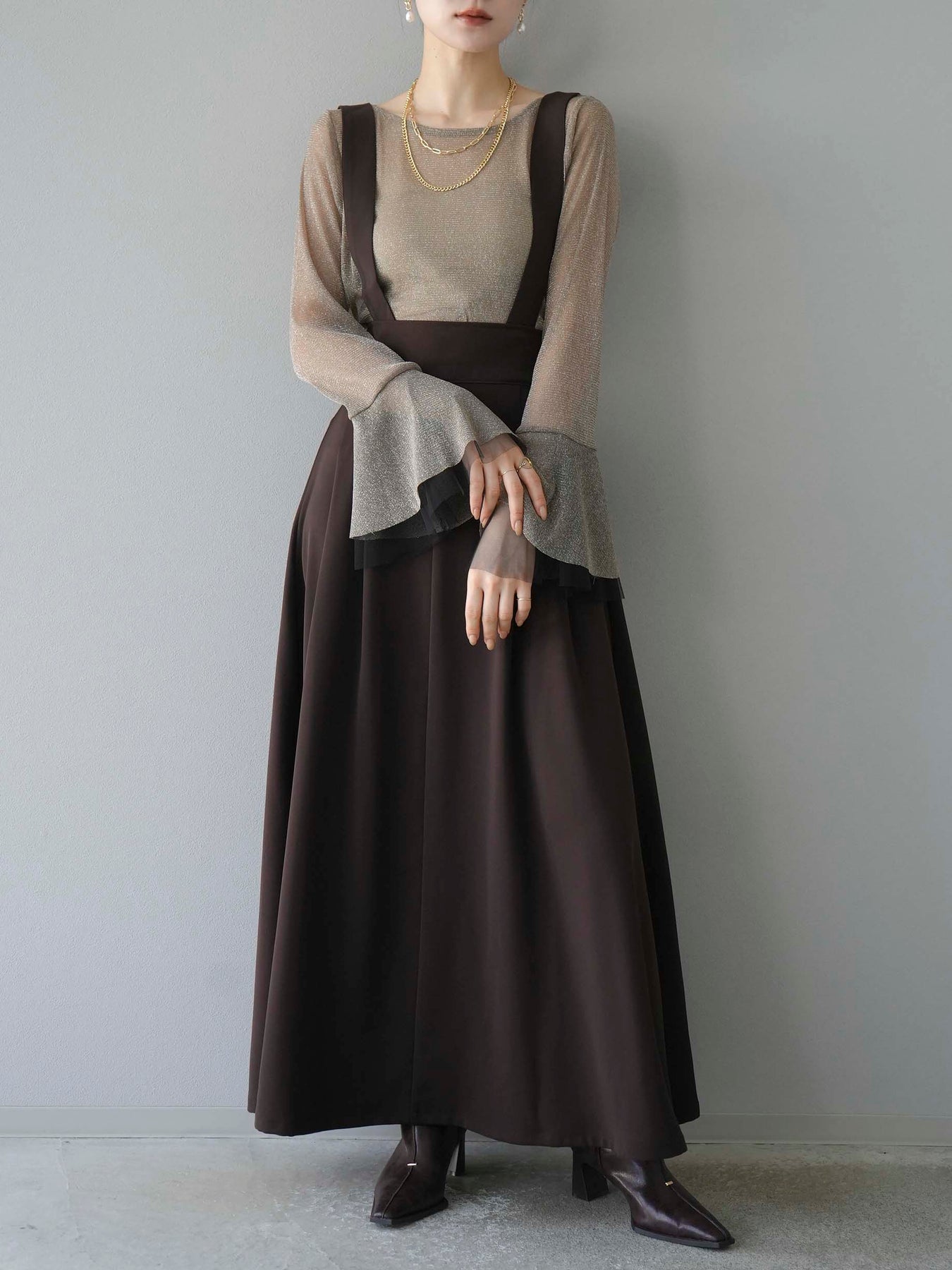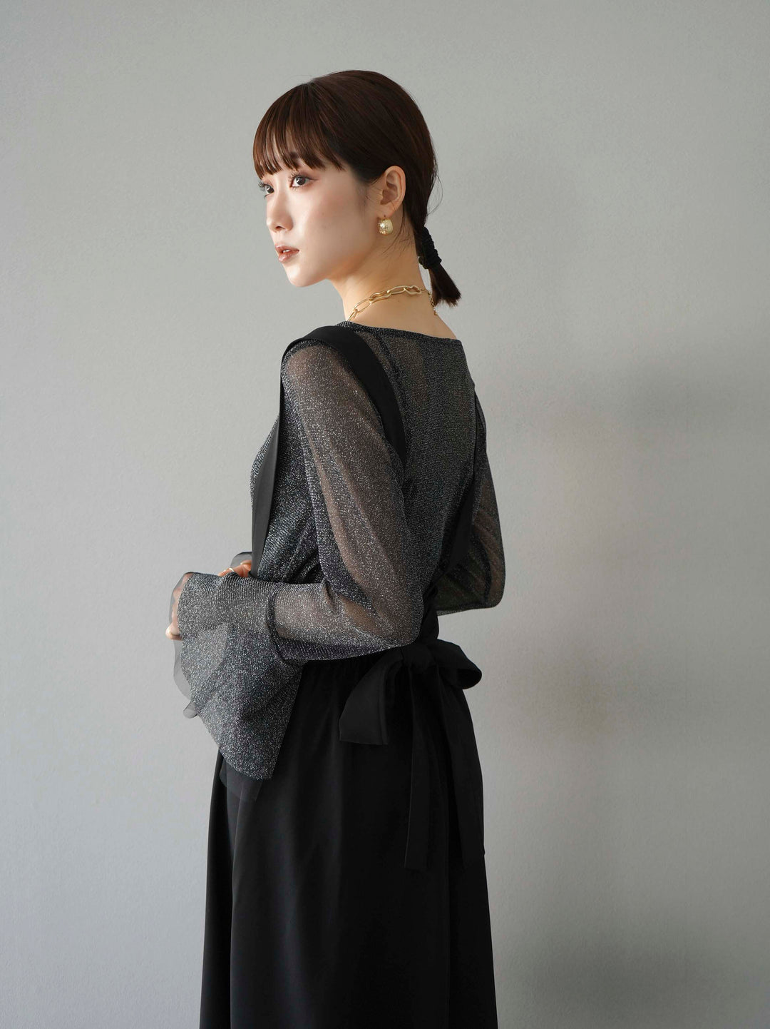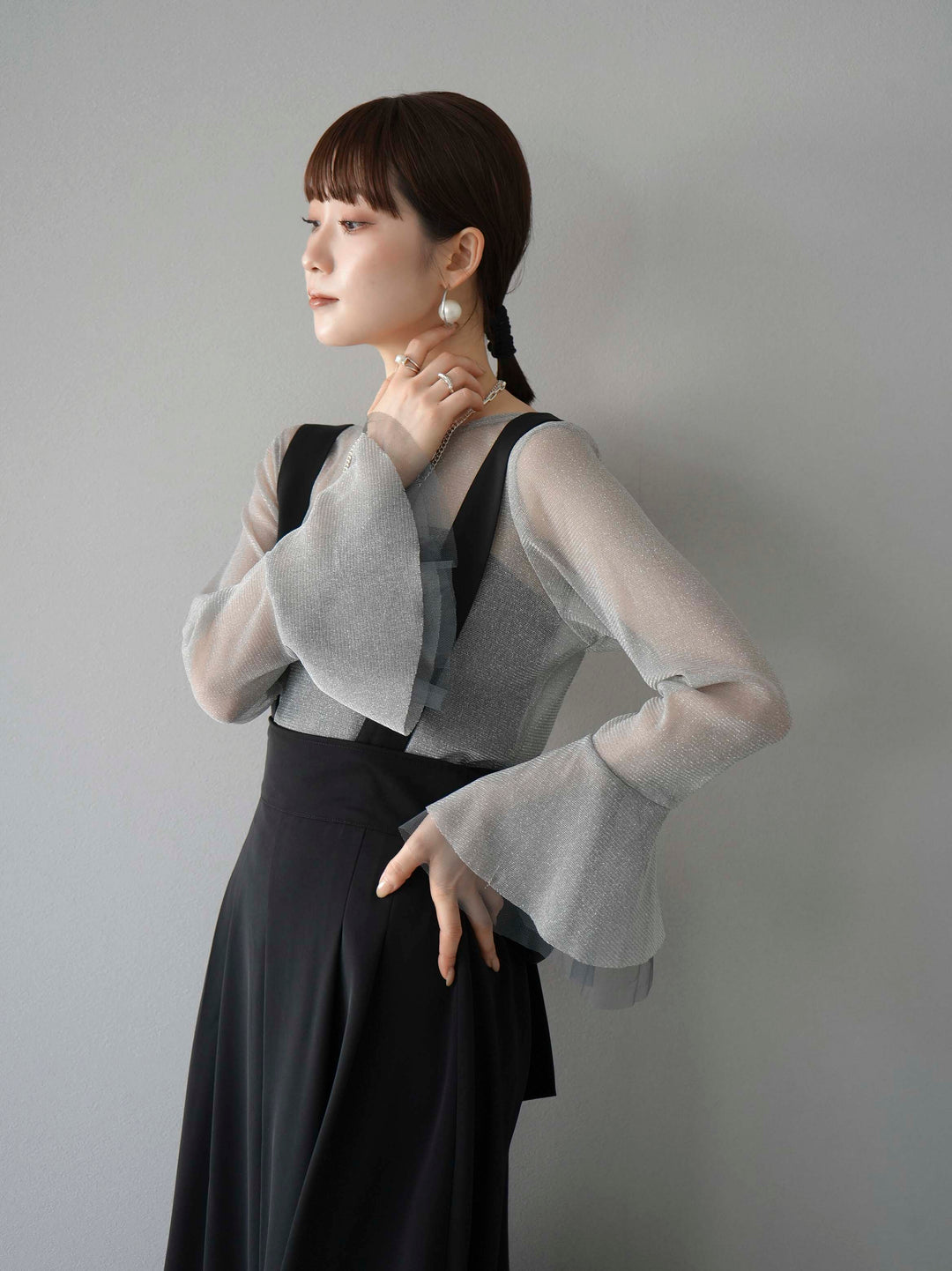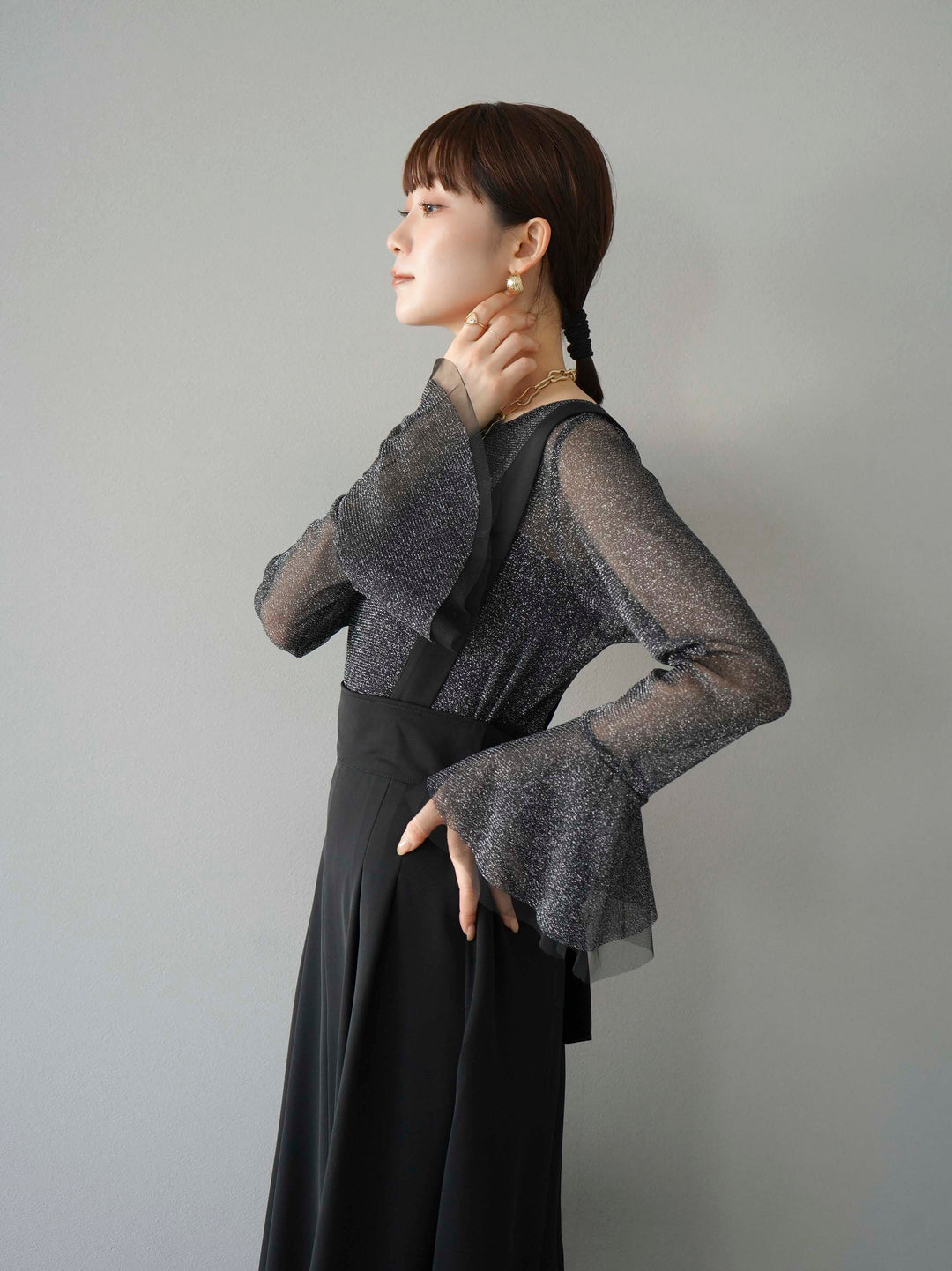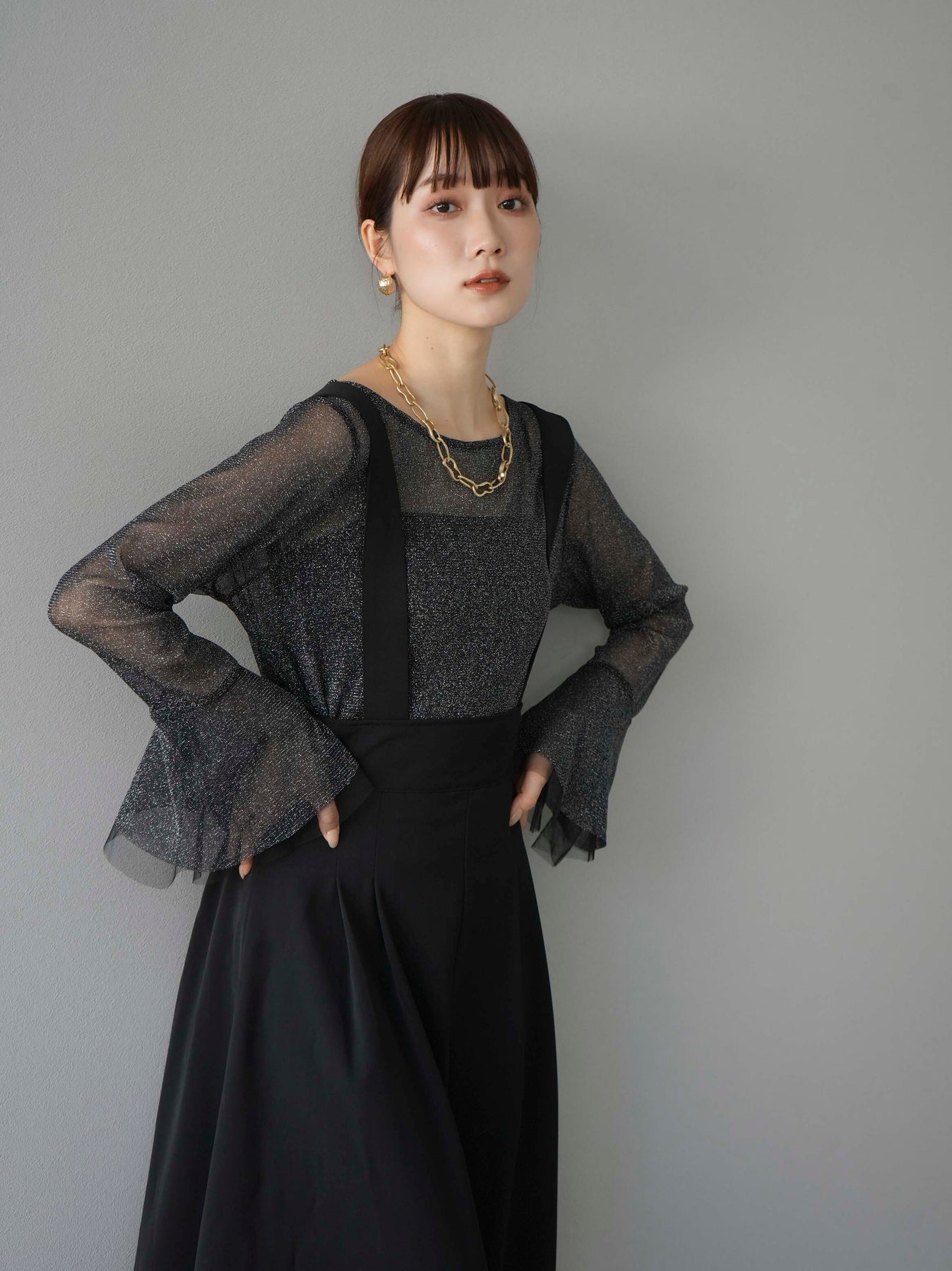 [SET]バックリボンフレアジャンパースカート+ラメシアーベルスリーブトップス(2set)