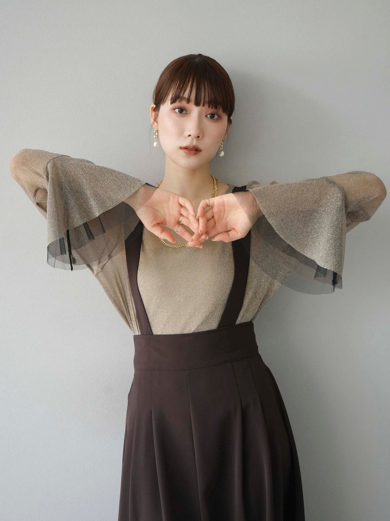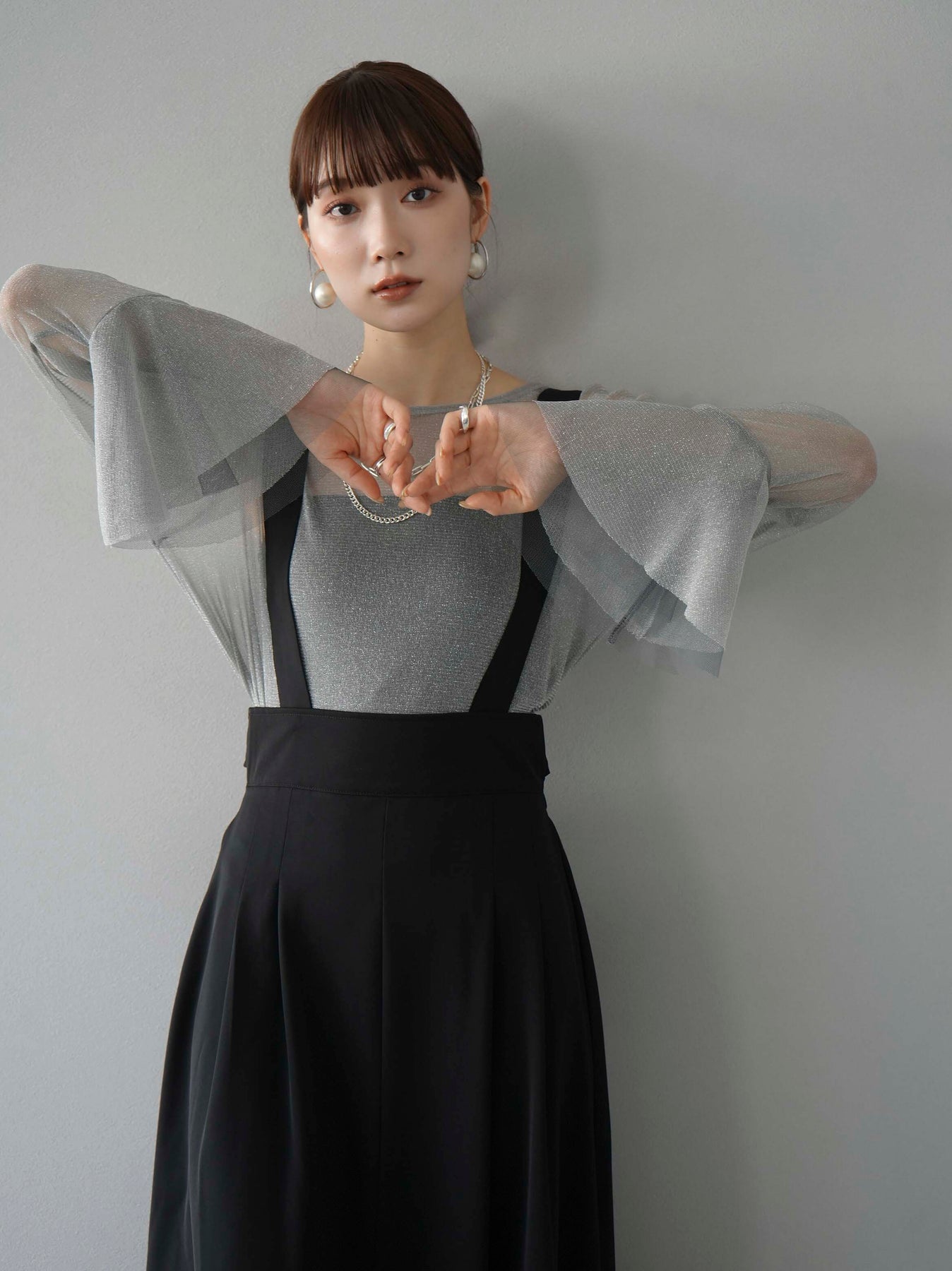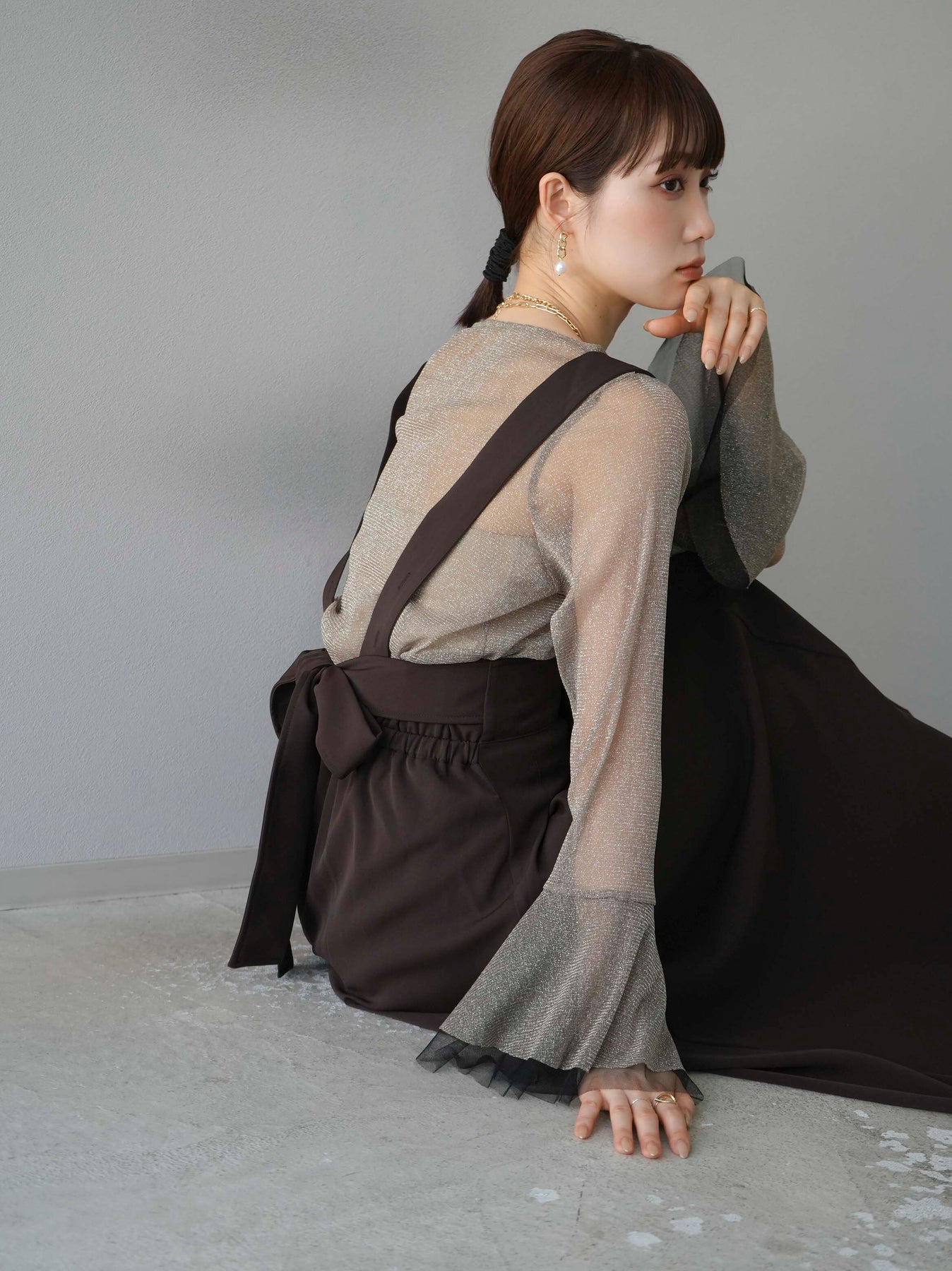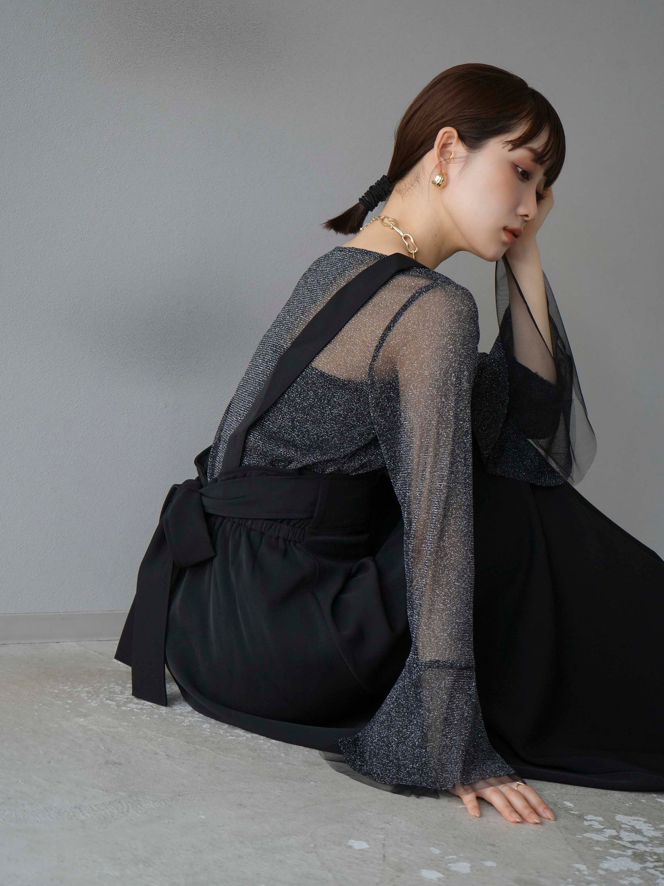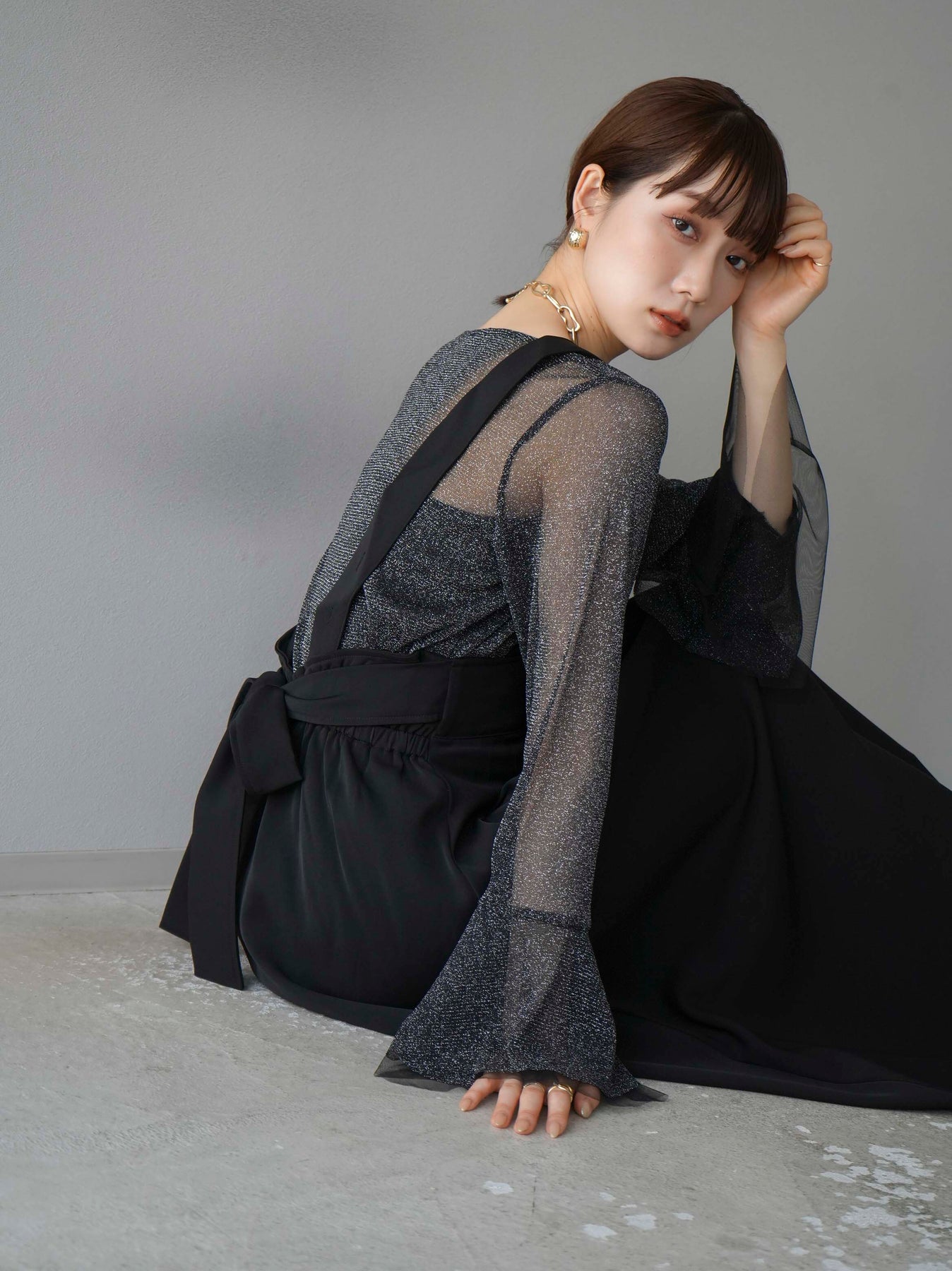 [SET]バックリボンフレアジャンパースカート+ラメシアーベルスリーブトップス(2set)