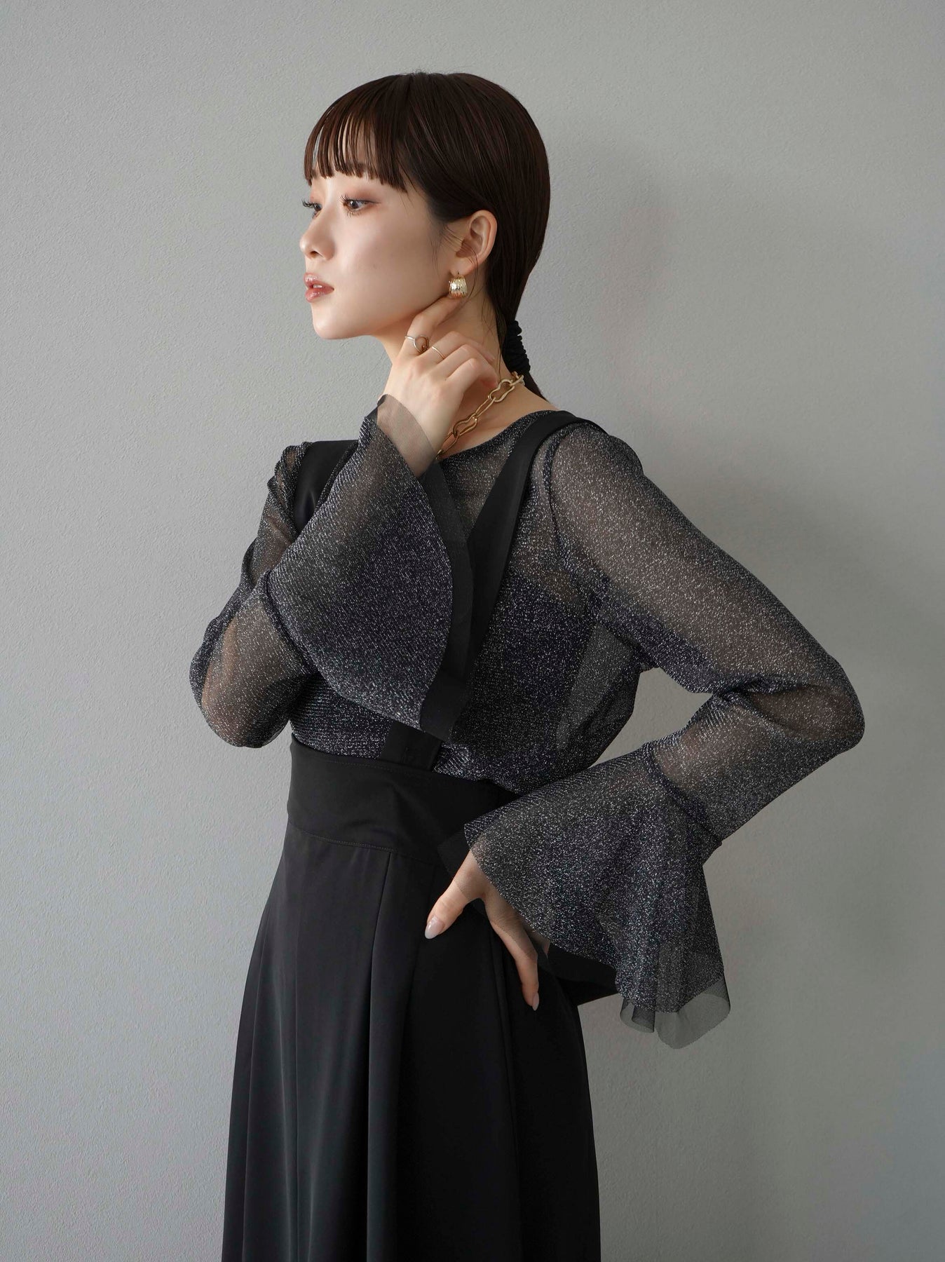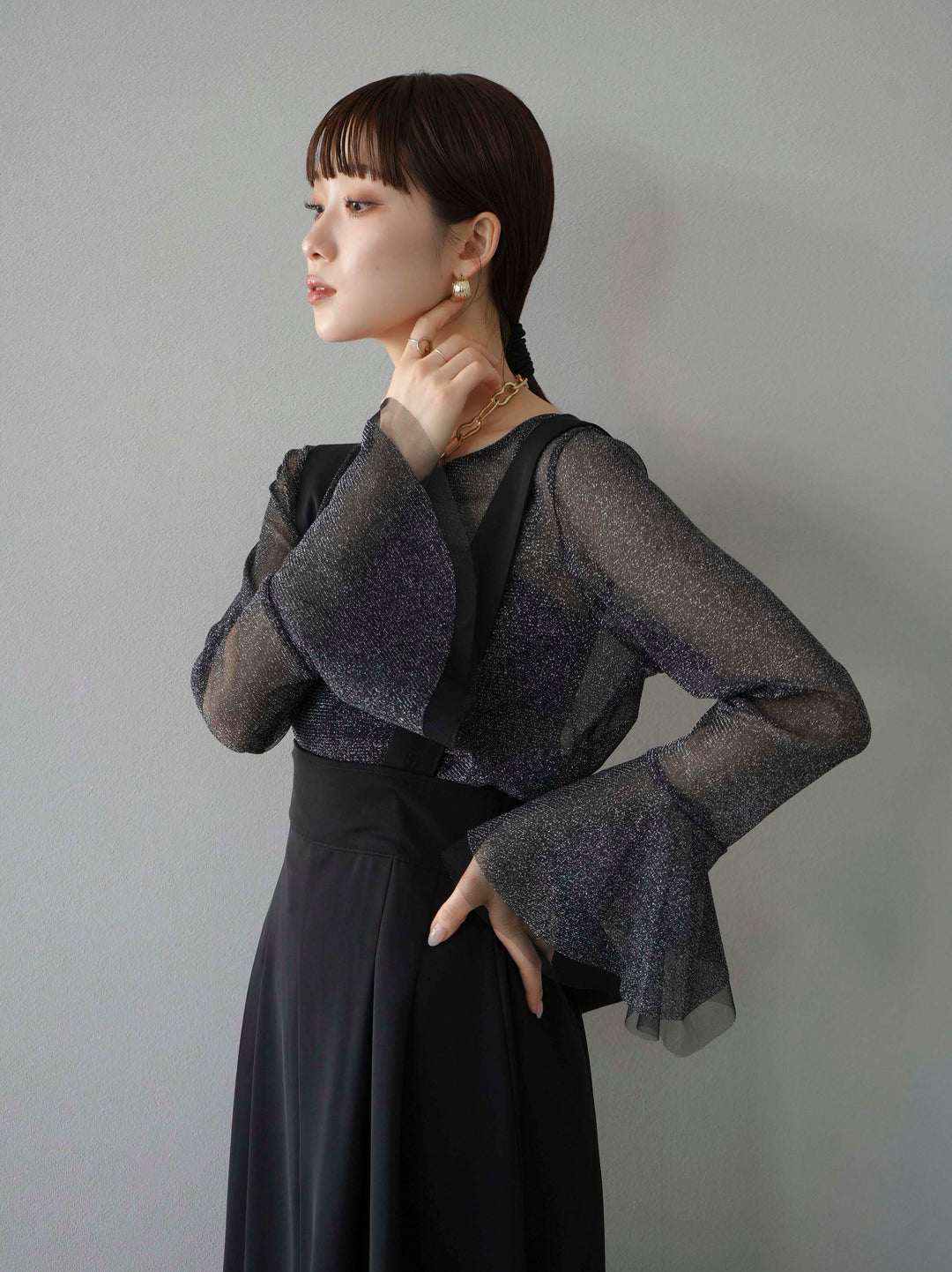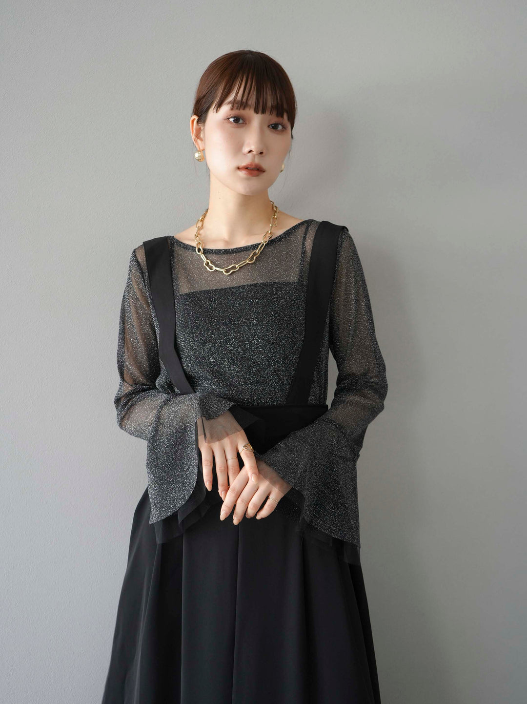 透け感のあるラメ素材で、華やかさをプラスするベルスリーブトップス。袖口のフレアデザインが女性らしさを引き立てます。シアーな質感と繊細な光沢が、コーディネートに上品なアクセントを加えます。インナーとのレイヤードスタイルが楽しめるアイテムです。トレンド感溢れるデザインで、日常使いから特別なシーンまで幅広く活躍します。 ※ボトムス、キャミソール(インナー)以外の商品は一律でインナーは付属していません。