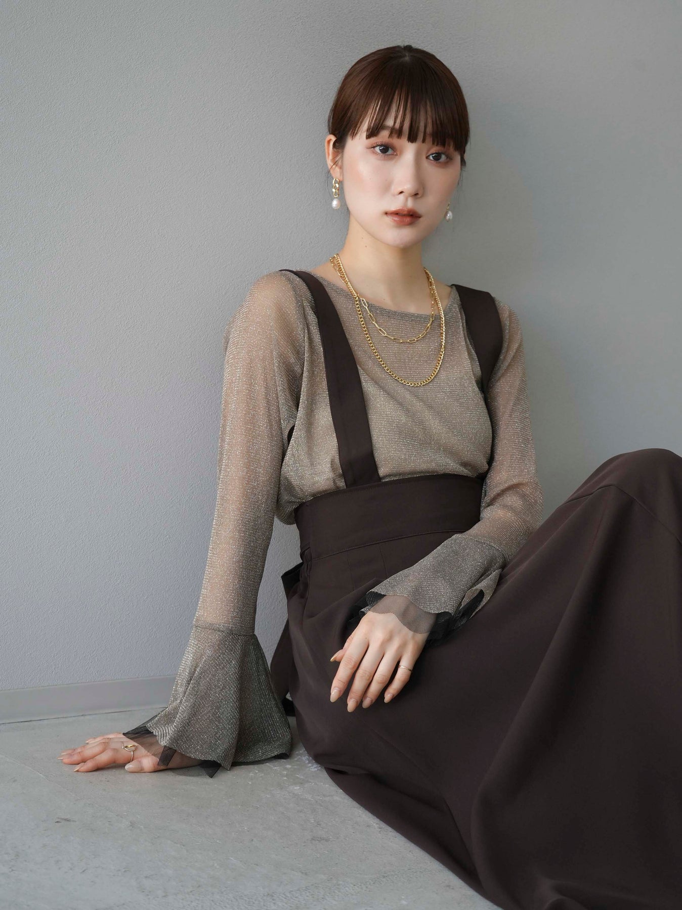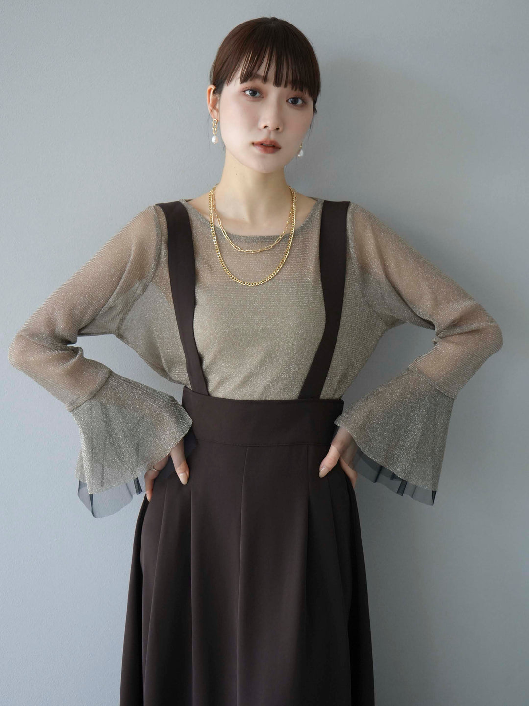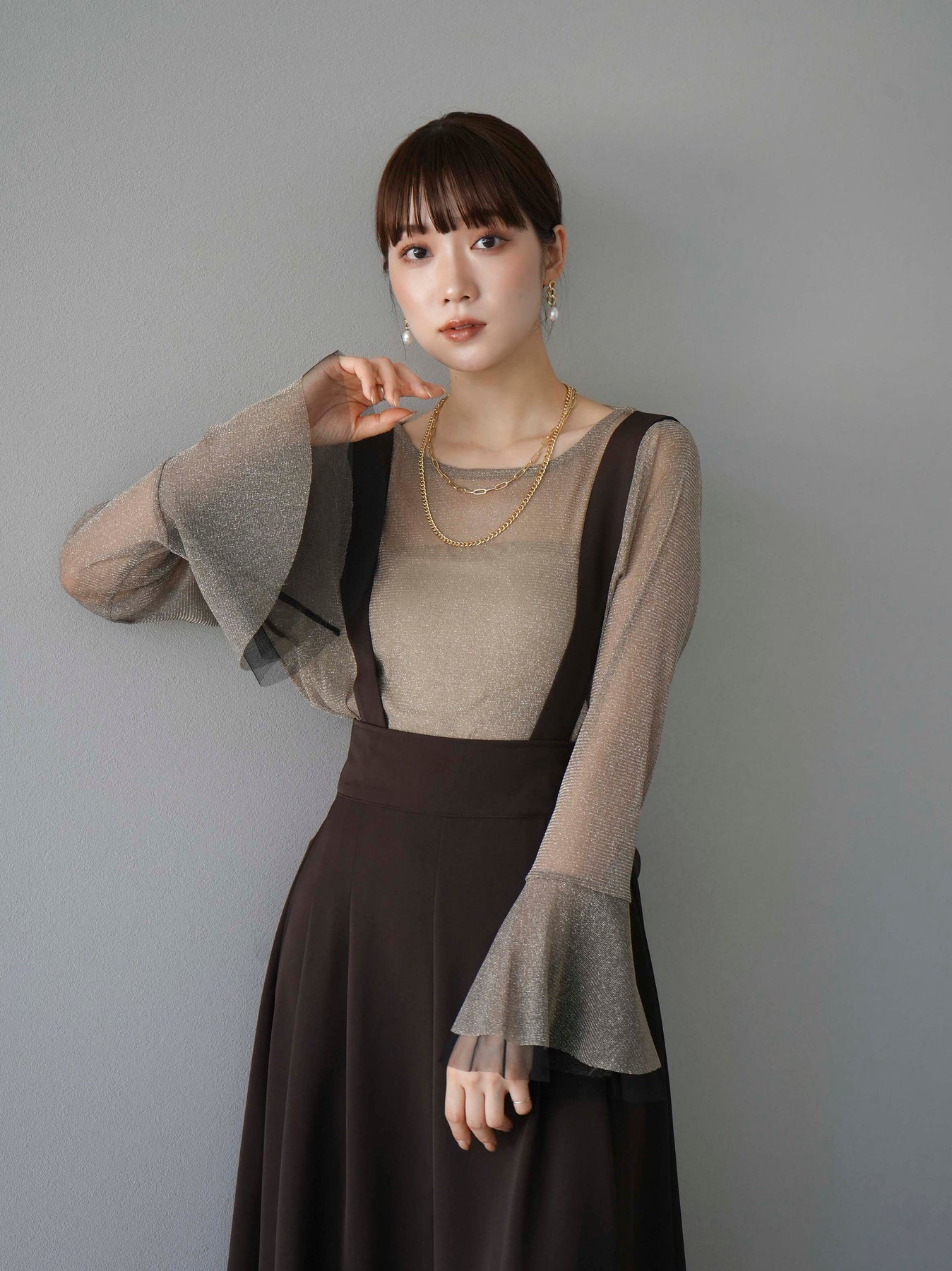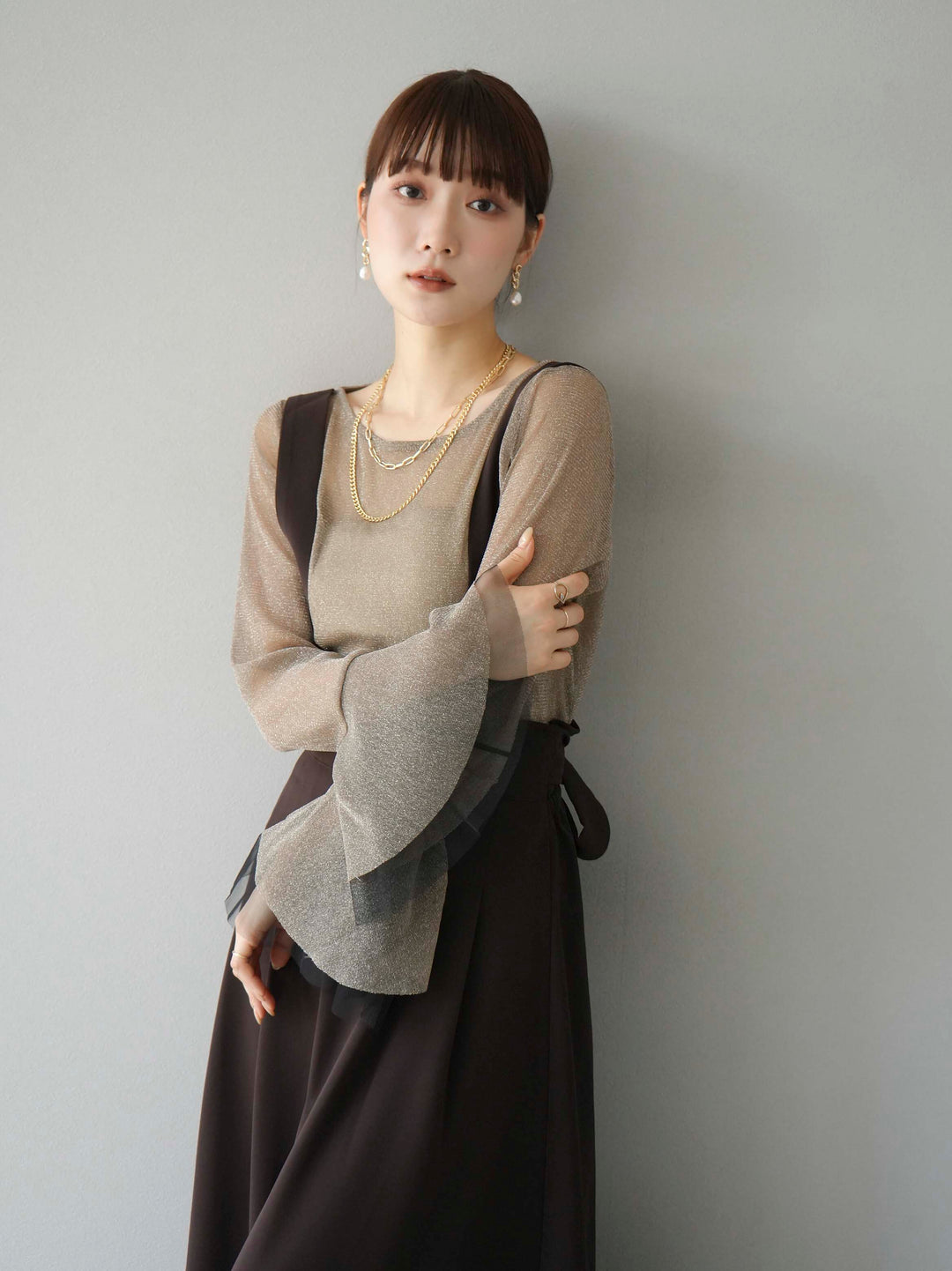 透け感のあるラメ素材で、華やかさをプラスするベルスリーブトップス。袖口のフレアデザインが女性らしさを引き立てます。シアーな質感と繊細な光沢が、コーディネートに上品なアクセントを加えます。インナーとのレイヤードスタイルが楽しめるアイテムです。トレンド感溢れるデザインで、日常使いから特別なシーンまで幅広く活躍します。 ※ボトムス、キャミソール(インナー)以外の商品は一律でインナーは付属していません。