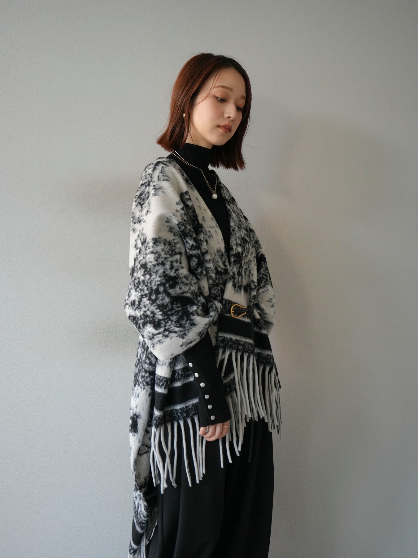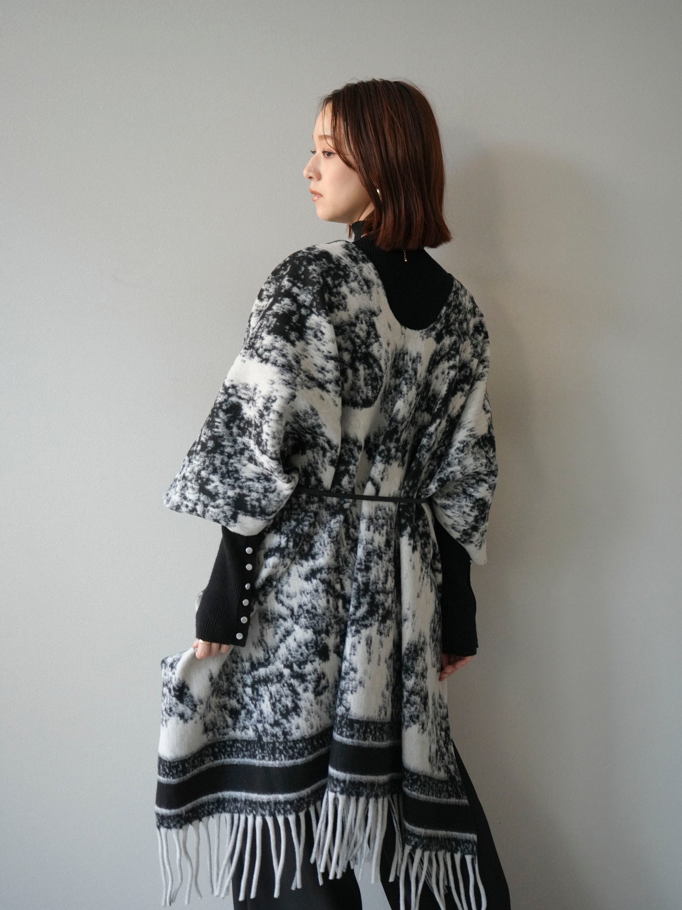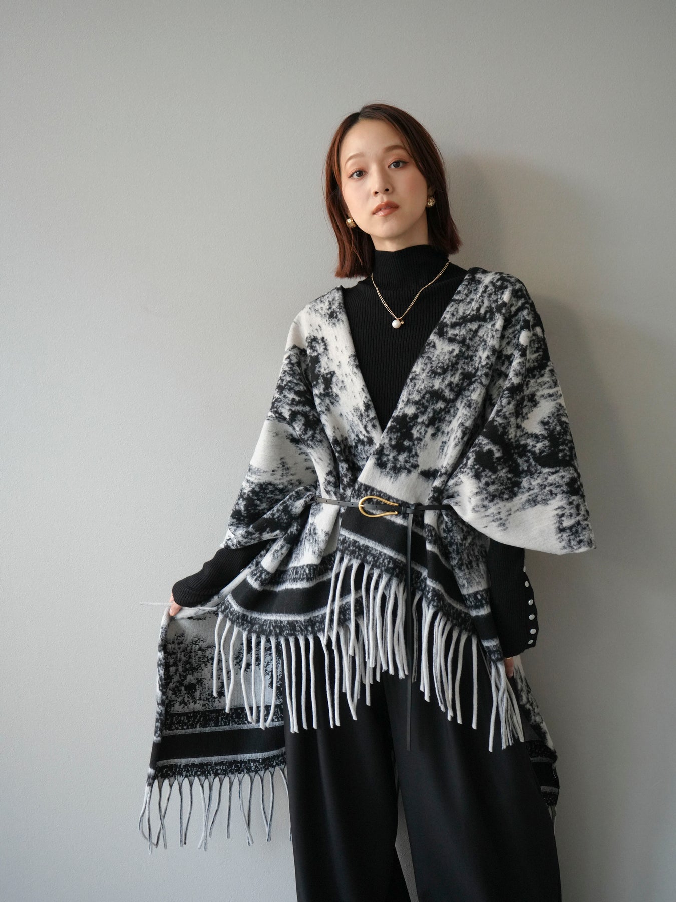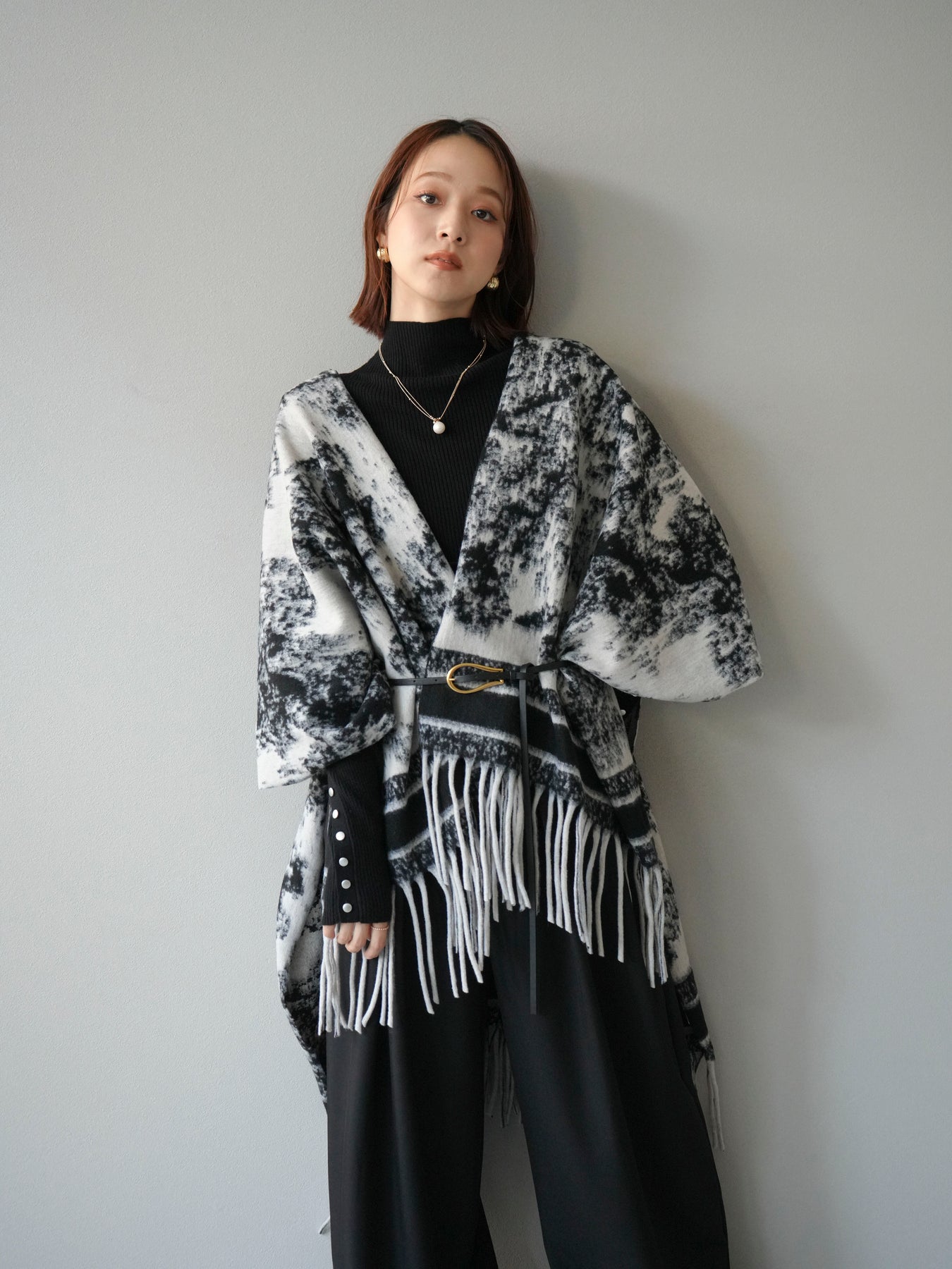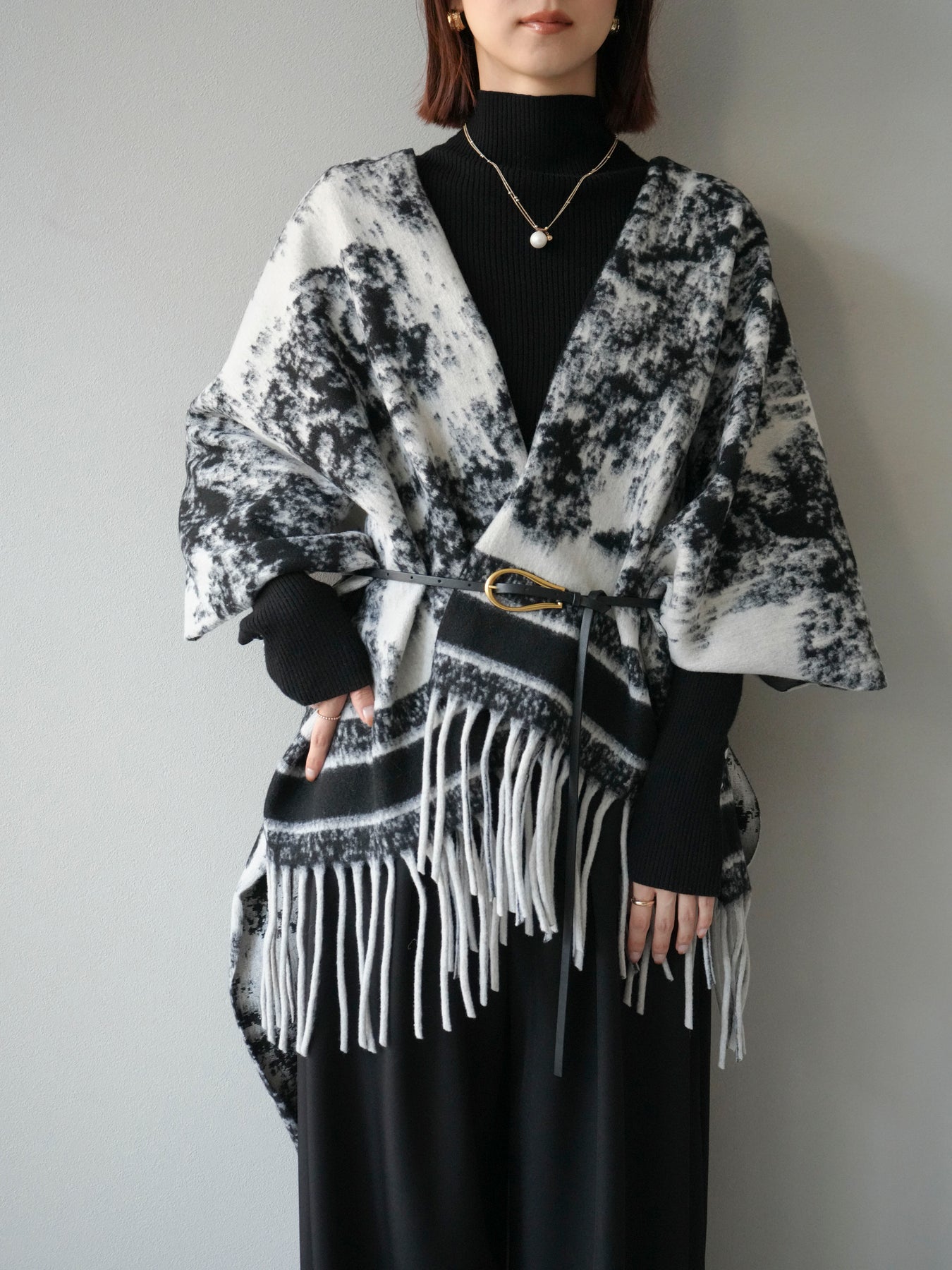 抽象的なアブストラクト柄が目を惹くストールポンチョ。やわらかな肌触りと程よいボリューム感で、羽織るだけでこなれた印象を演出します。両サイドにフリンジをあしらい、動きのあるデザインに仕上げました。肩からふんわりと掛けるだけで、コートいらずの軽やかなアウター代わりとしても活躍。デイリー使いはもちろん、旅行やお出かけにもぴったりな万能アイテムです。 ※ボトムス、キャミソール(インナー)以外の商品は一律でインナーは付属していません。
