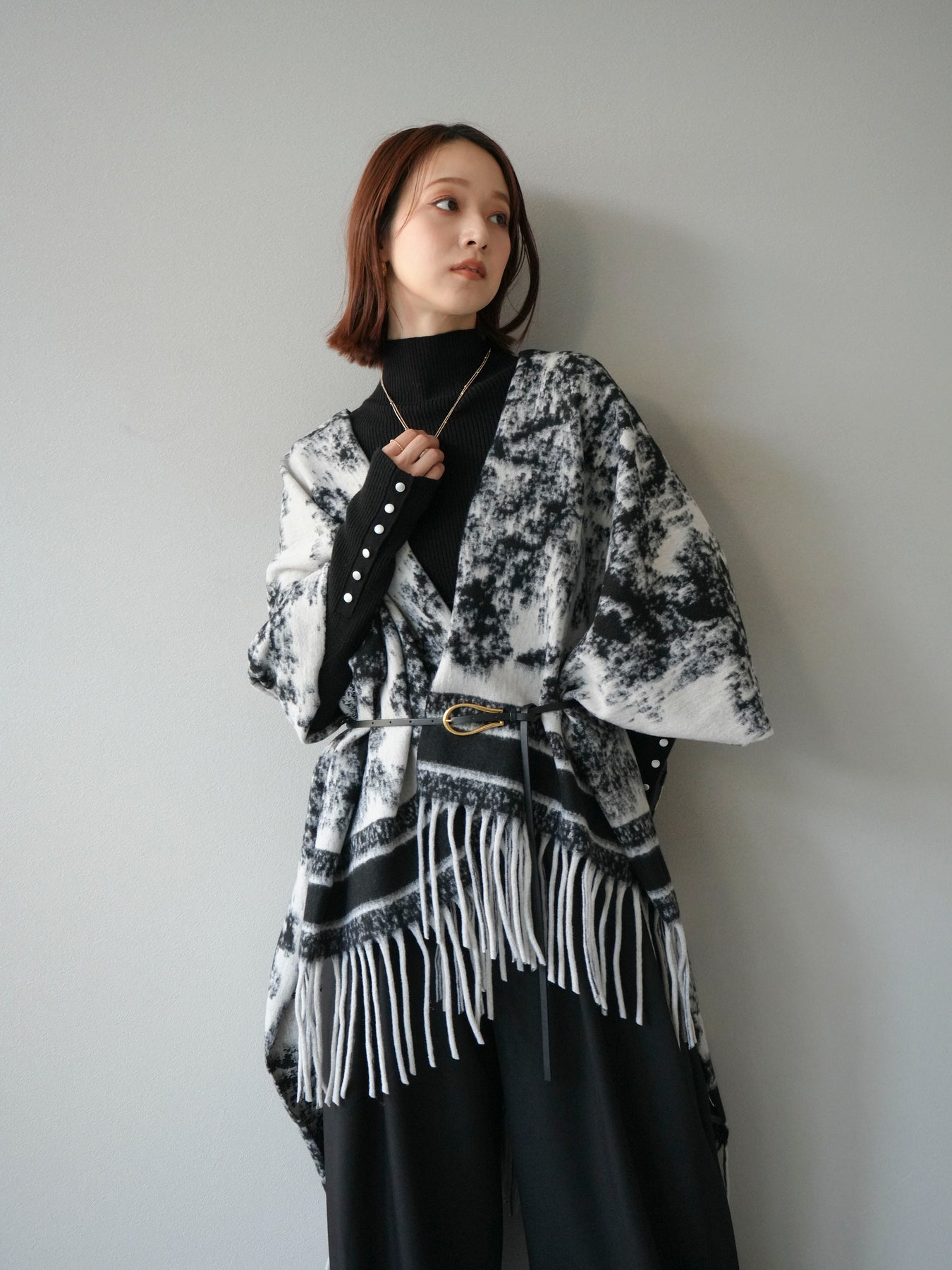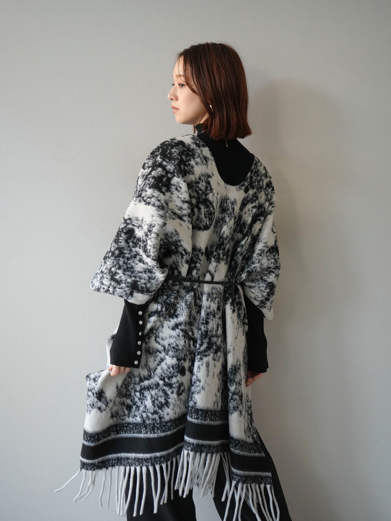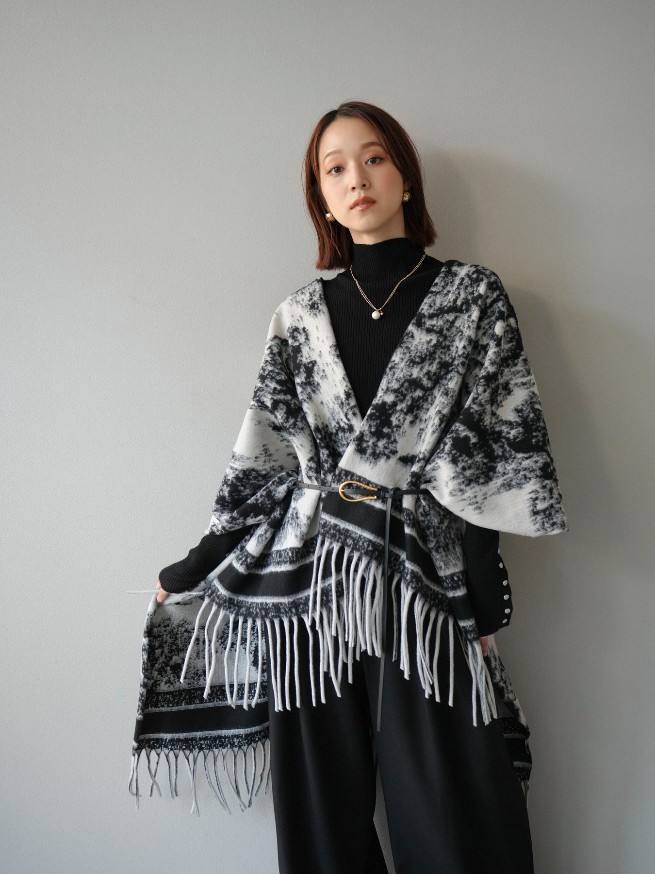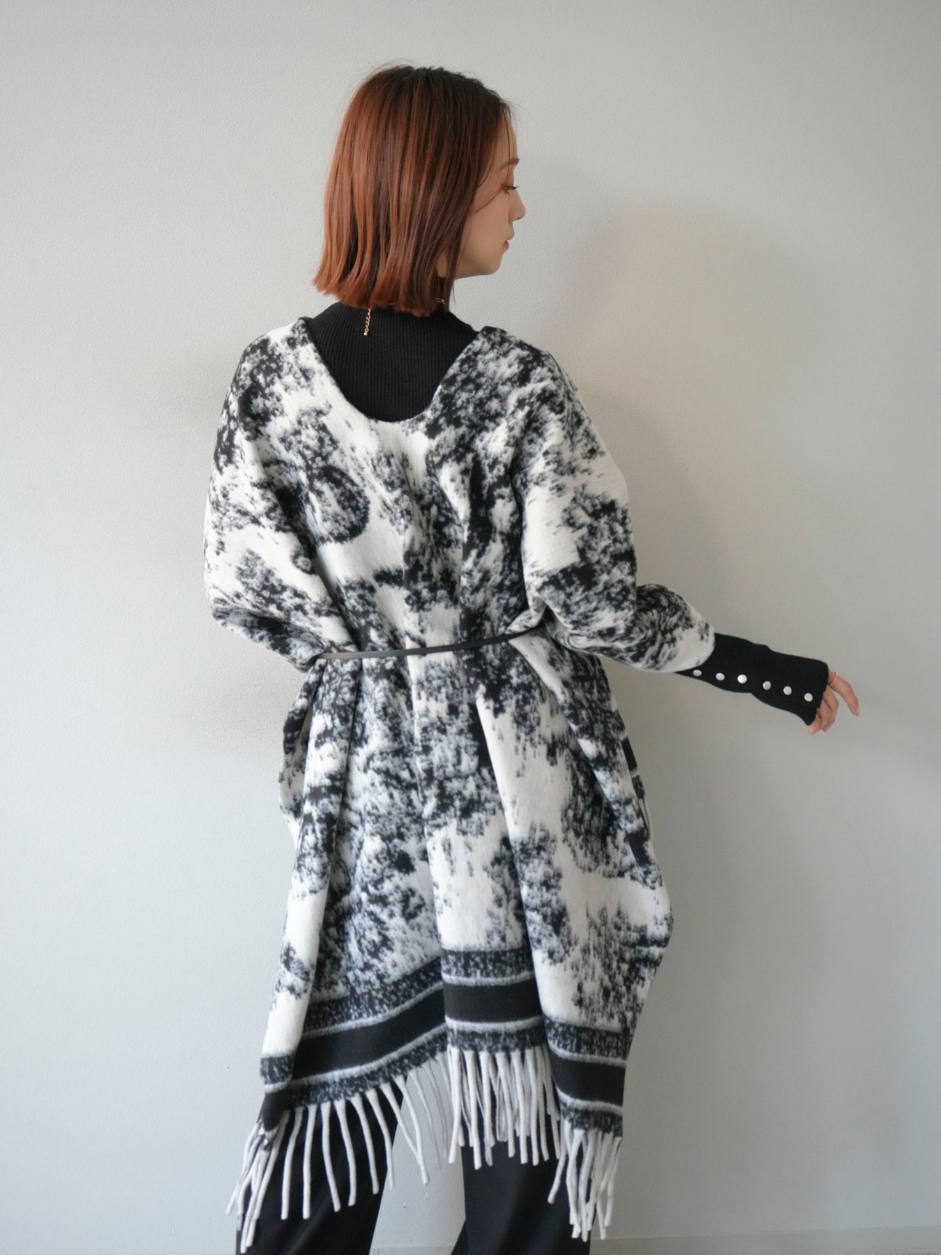 抽象的なアブストラクト柄が目を惹くストールポンチョ。やわらかな肌触りと程よいボリューム感で、羽織るだけでこなれた印象を演出します。両サイドにフリンジをあしらい、動きのあるデザインに仕上げました。肩からふんわりと掛けるだけで、コートいらずの軽やかなアウター代わりとしても活躍。デイリー使いはもちろん、旅行やお出かけにもぴったりな万能アイテムです。 ※ボトムス、キャミソール(インナー)以外の商品は一律でインナーは付属していません。