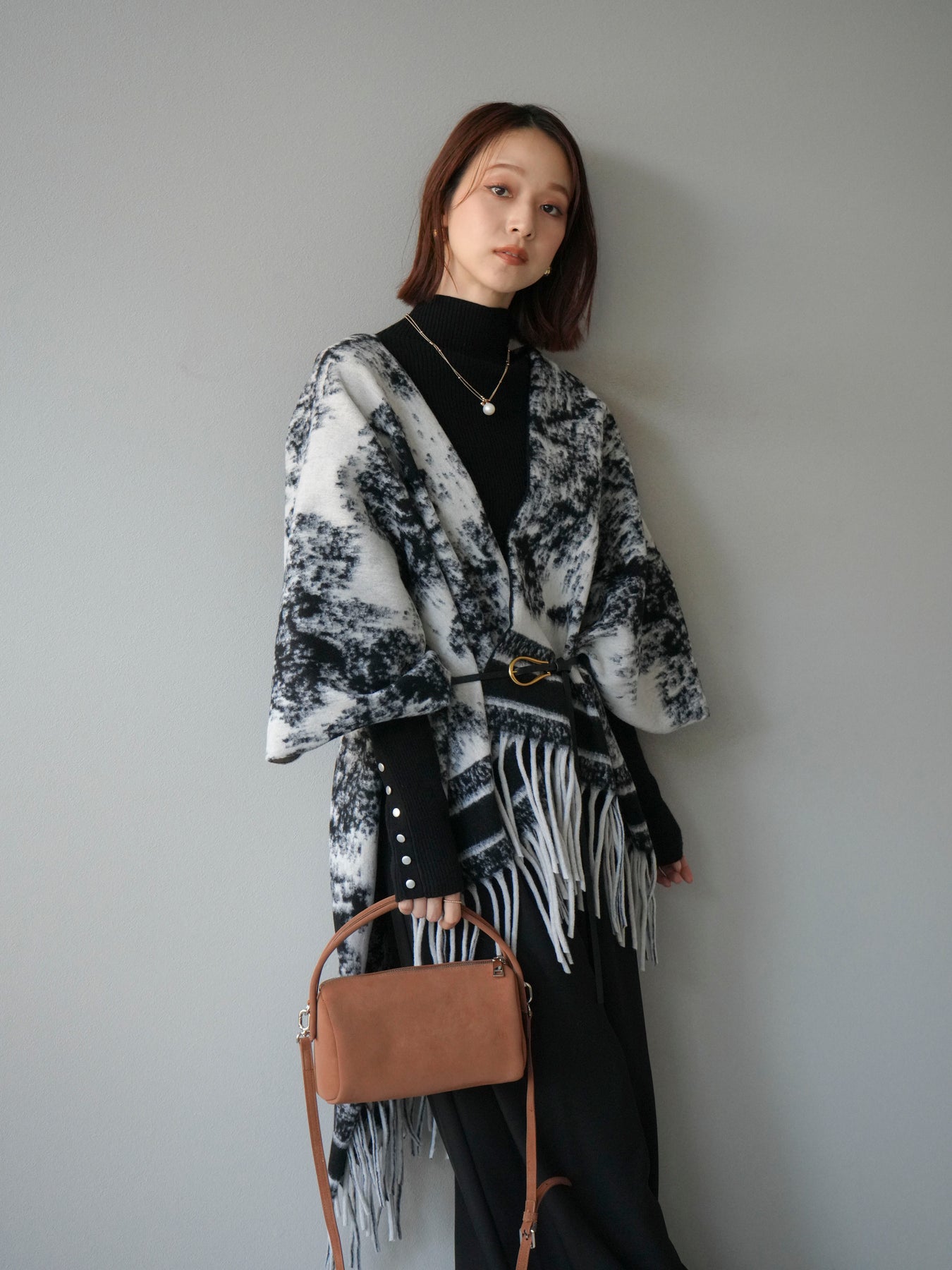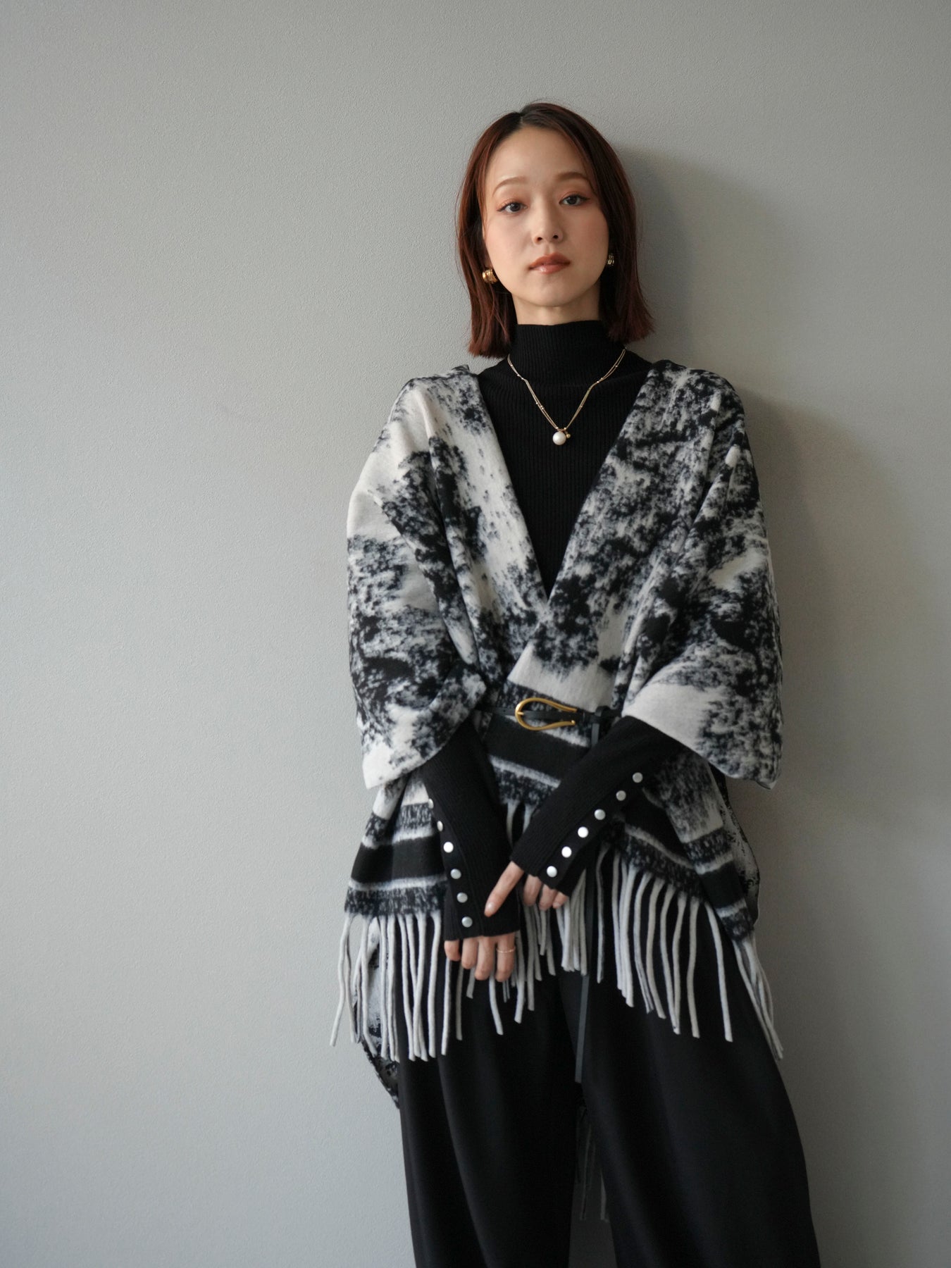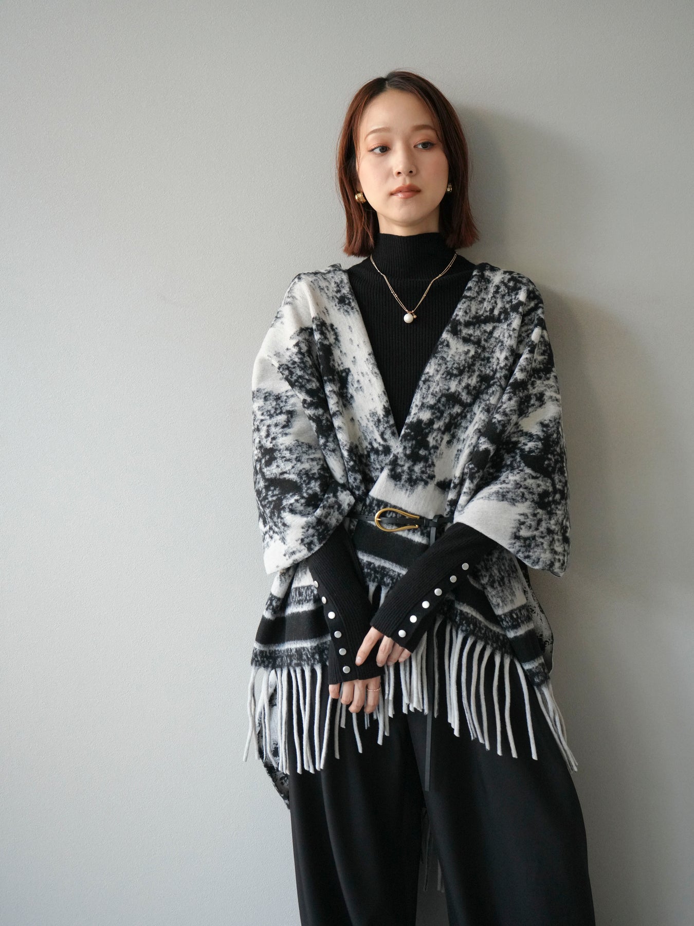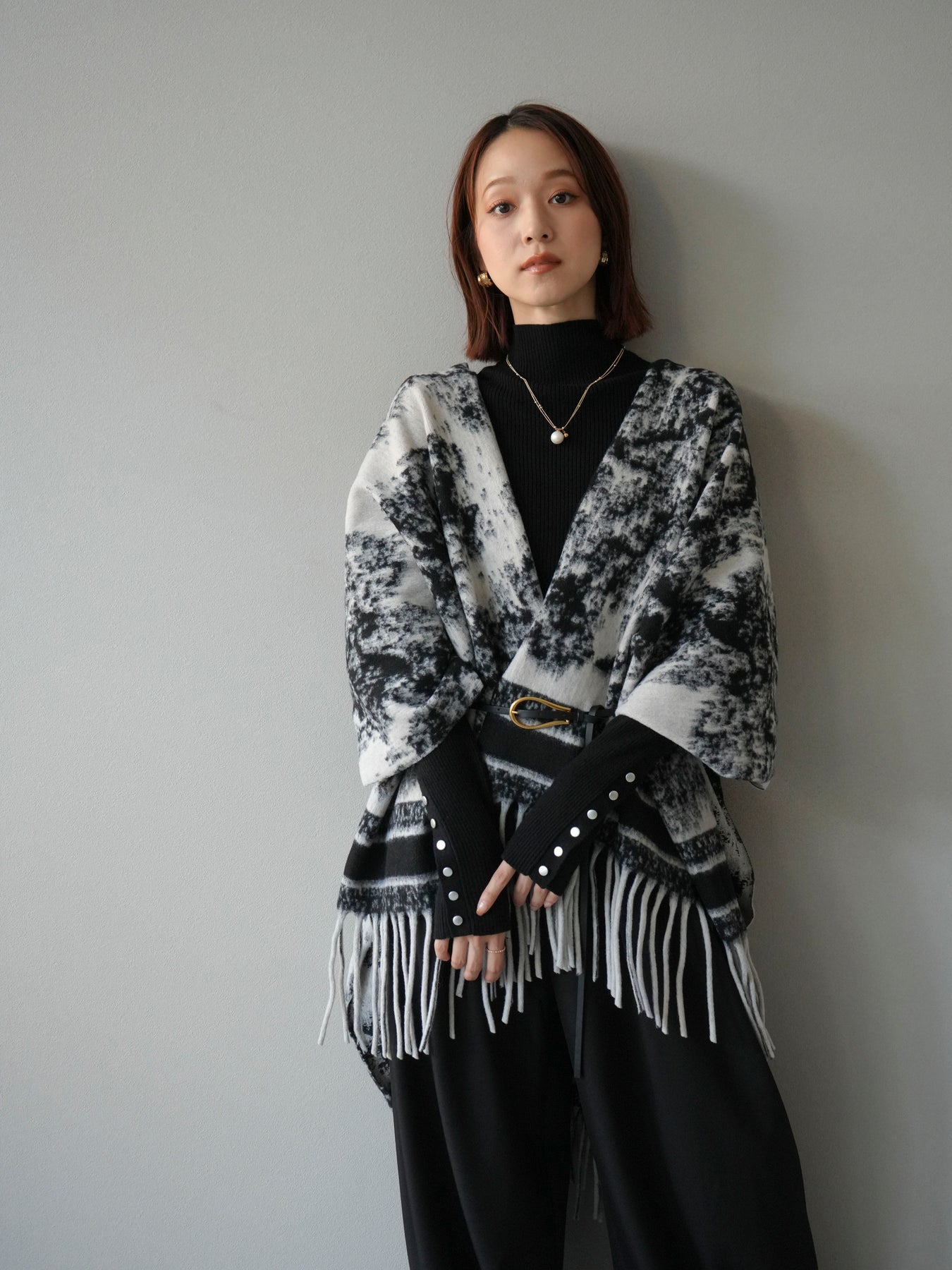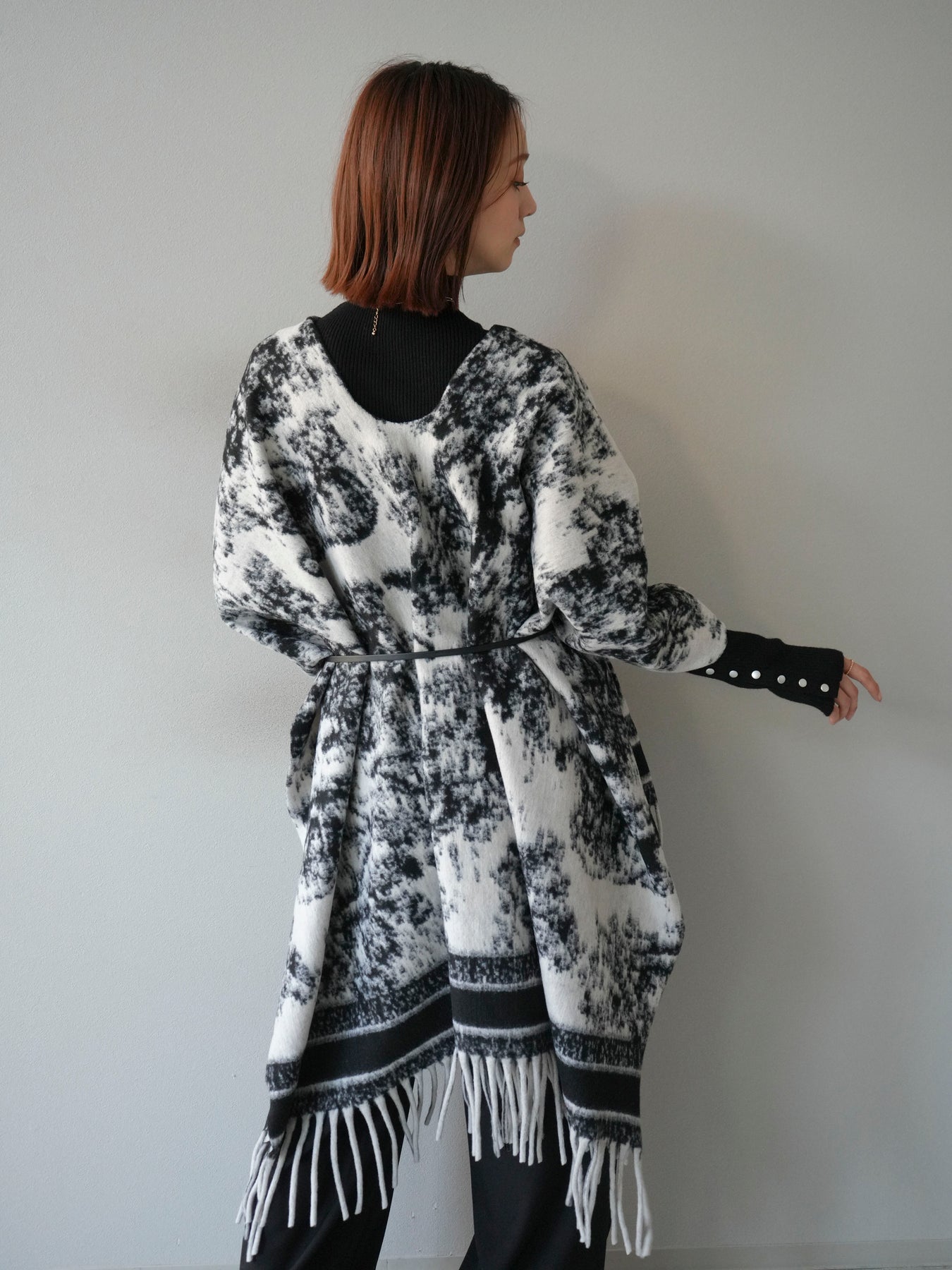 抽象的なアブストラクト柄が目を惹くストールポンチョ。やわらかな肌触りと程よいボリューム感で、羽織るだけでこなれた印象を演出します。両サイドにフリンジをあしらい、動きのあるデザインに仕上げました。肩からふんわりと掛けるだけで、コートいらずの軽やかなアウター代わりとしても活躍。デイリー使いはもちろん、旅行やお出かけにもぴったりな万能アイテムです。 ※ボトムス、キャミソール(インナー)以外の商品は一律でインナーは付属していません。