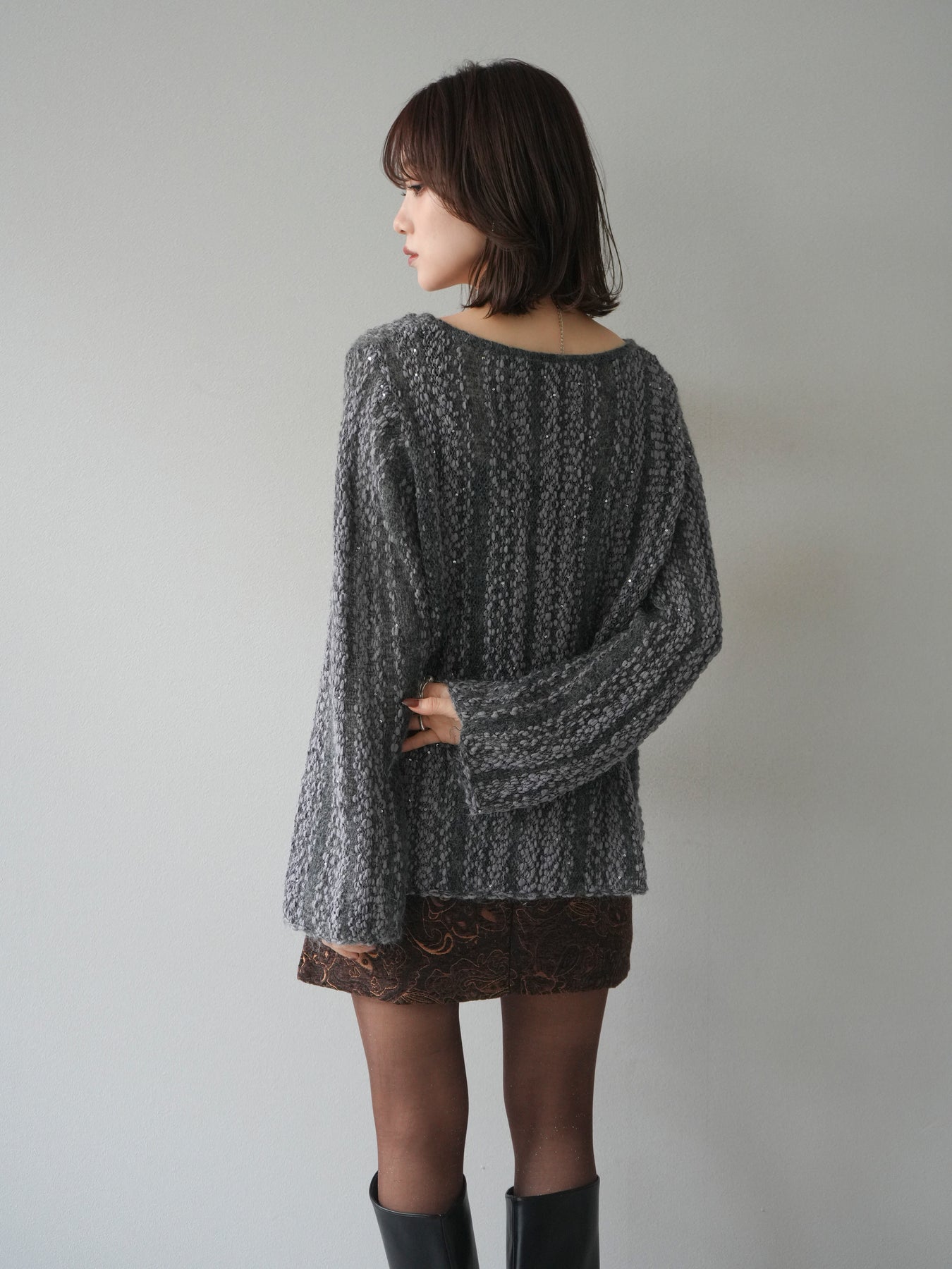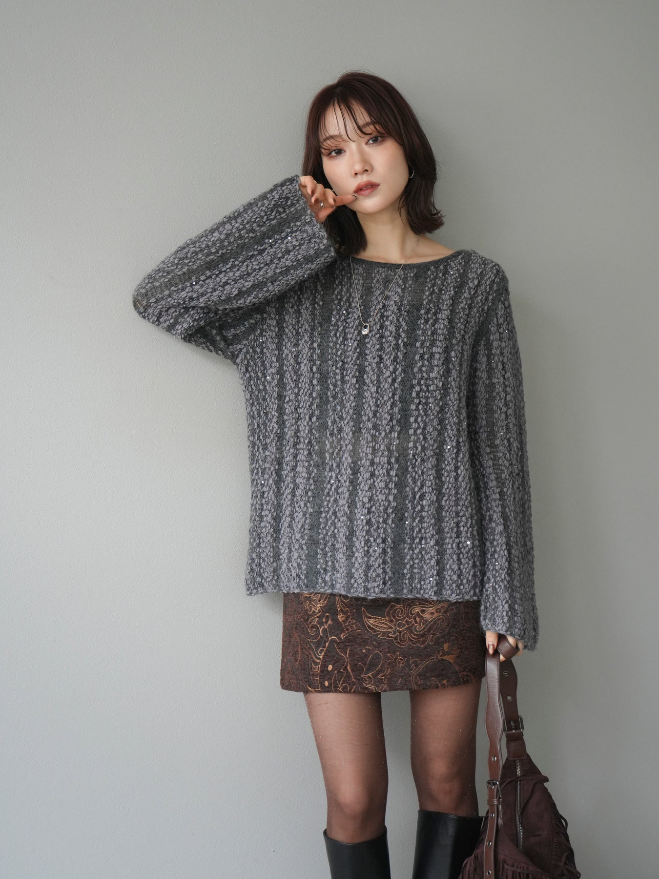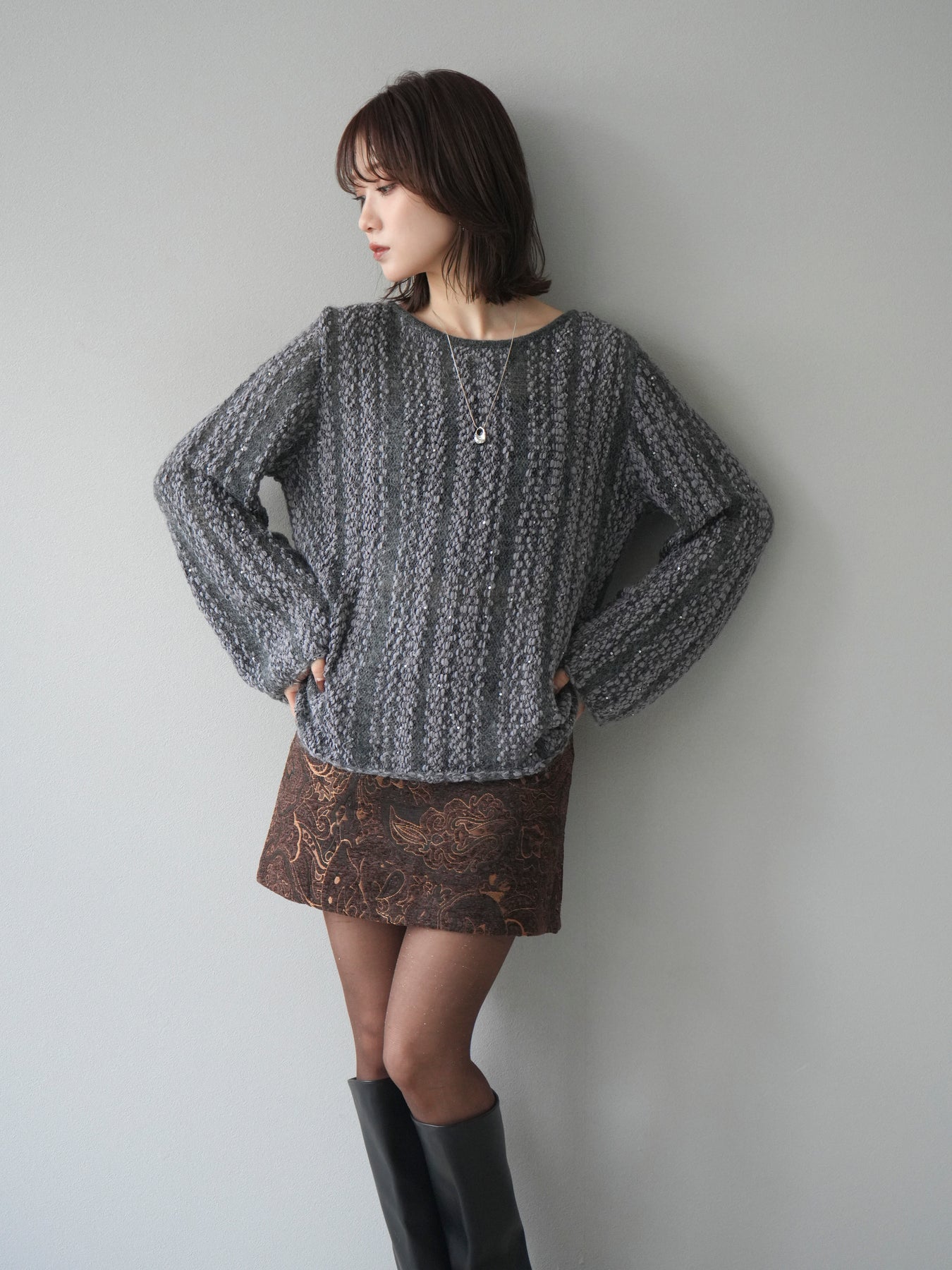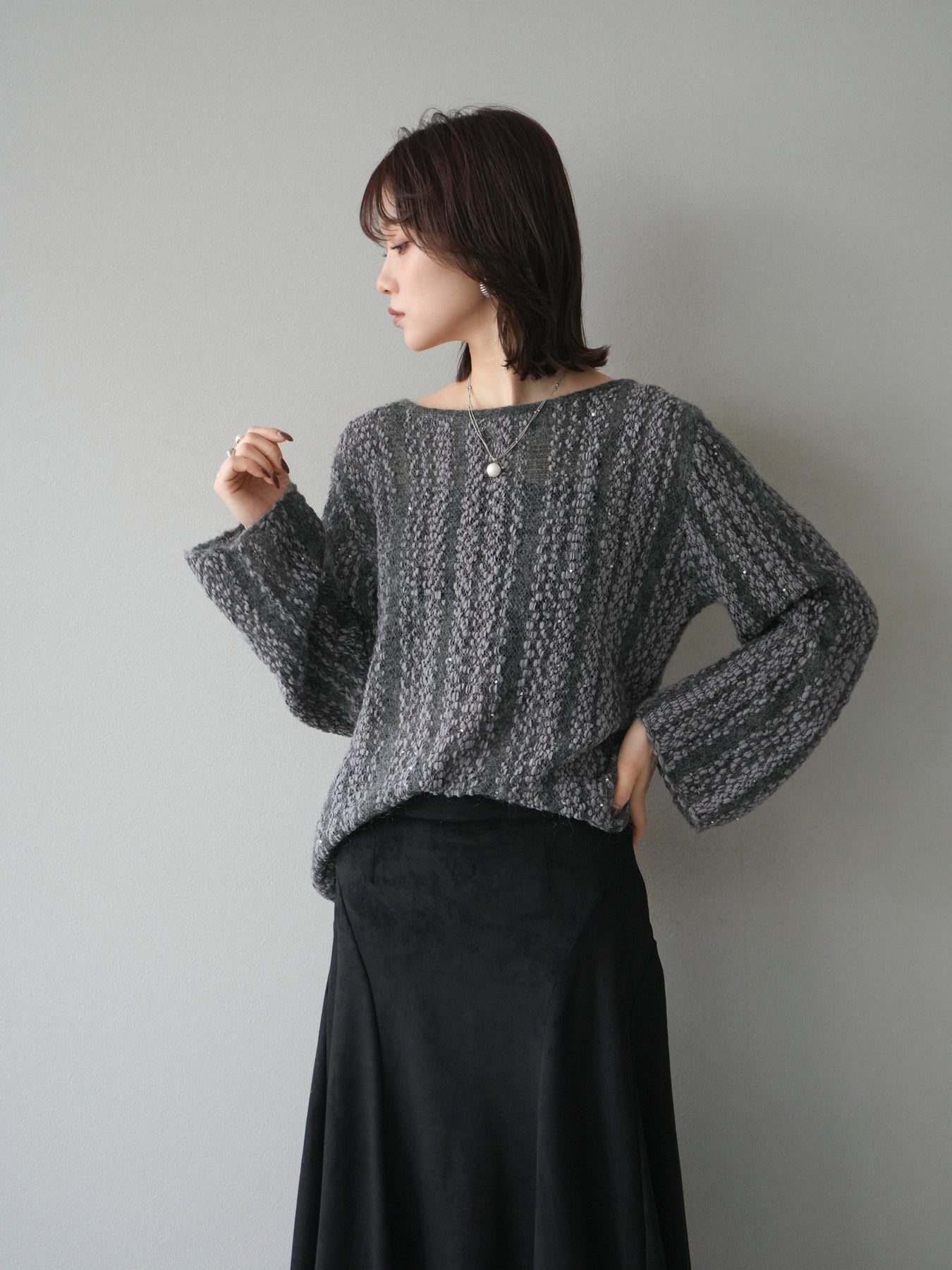 [予約]スパンコール異素材ストライプニットプルオーバー/gray