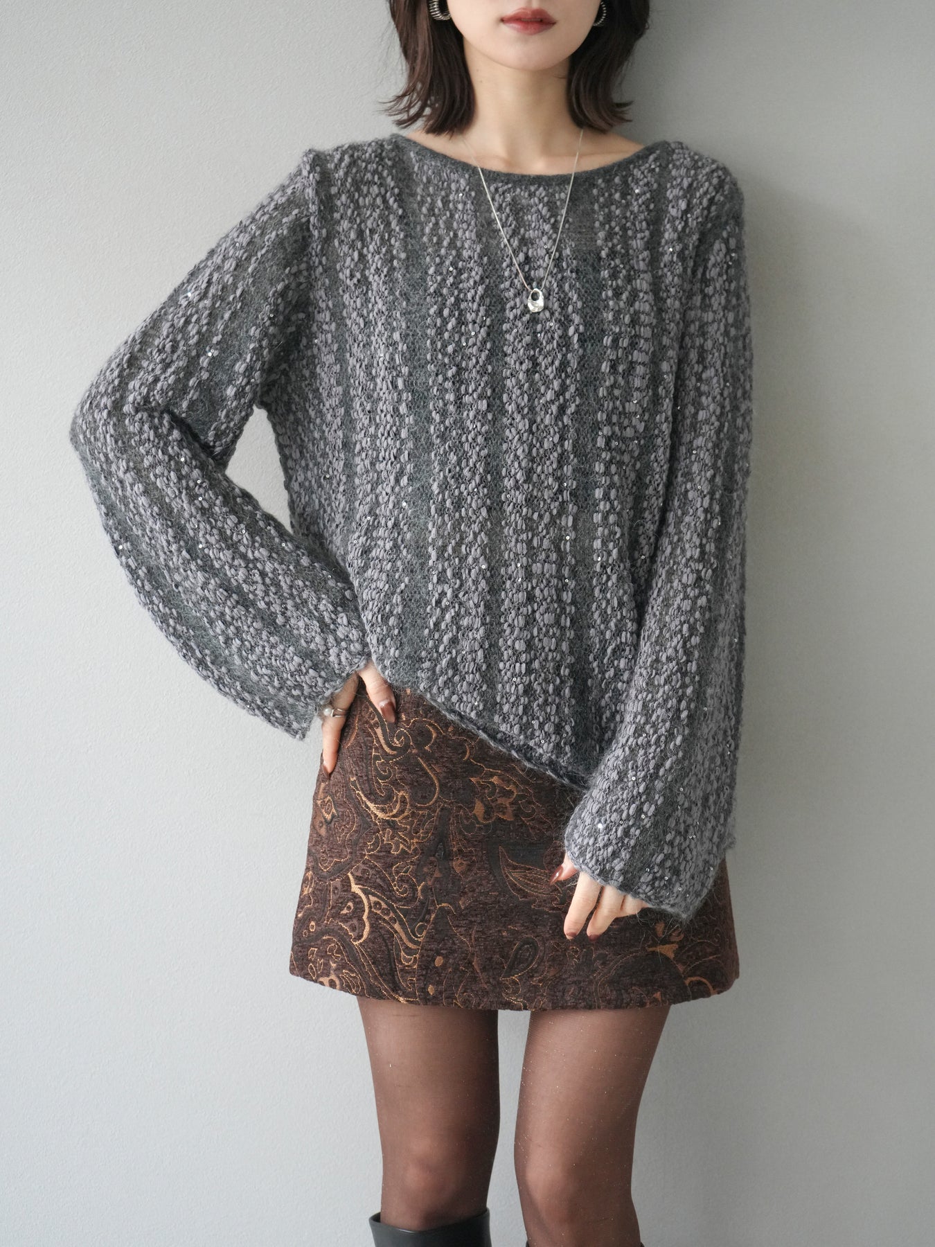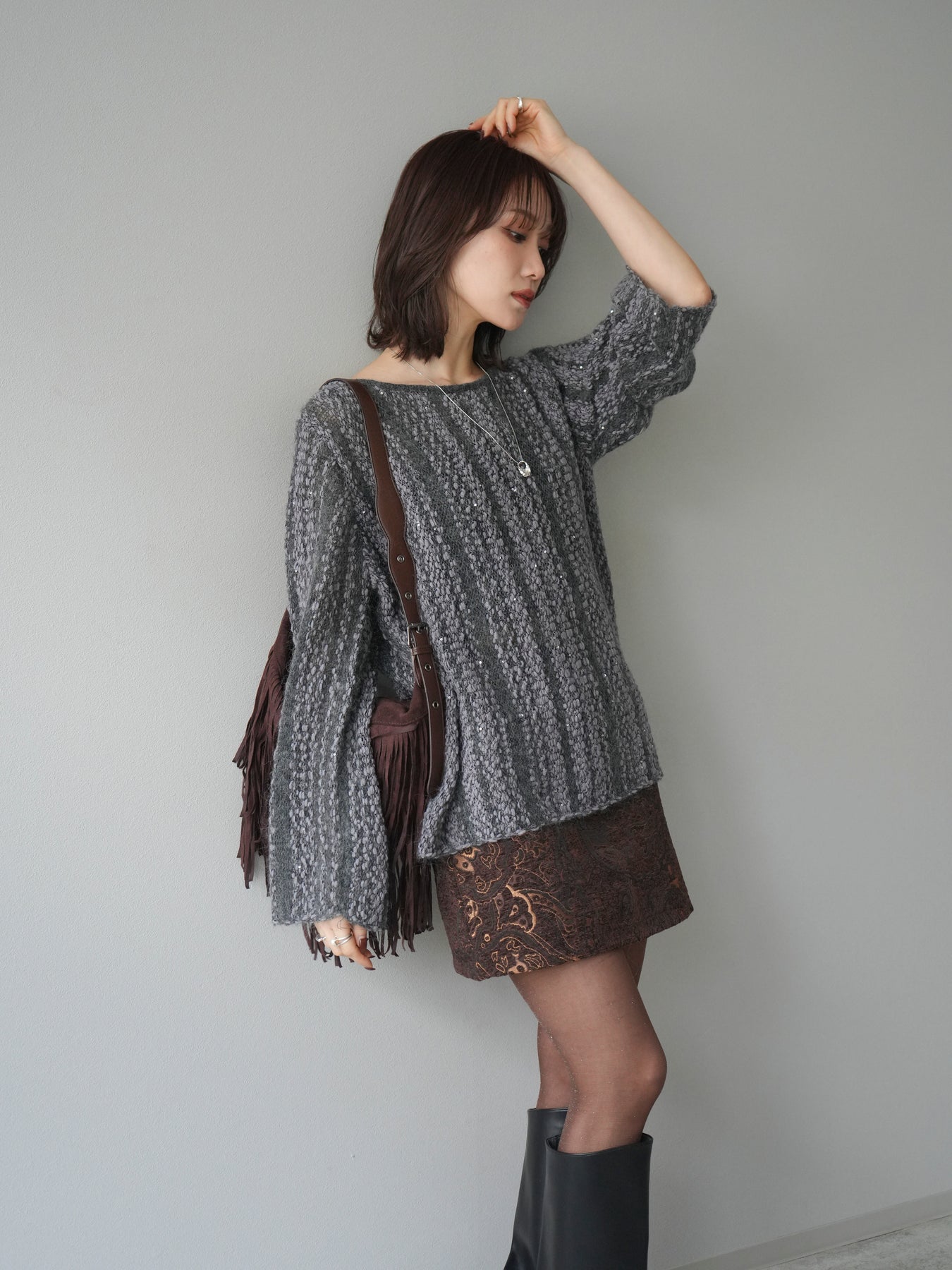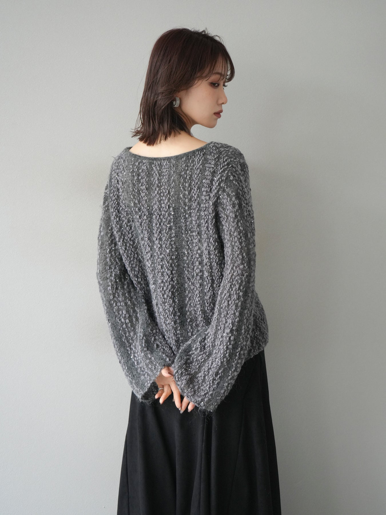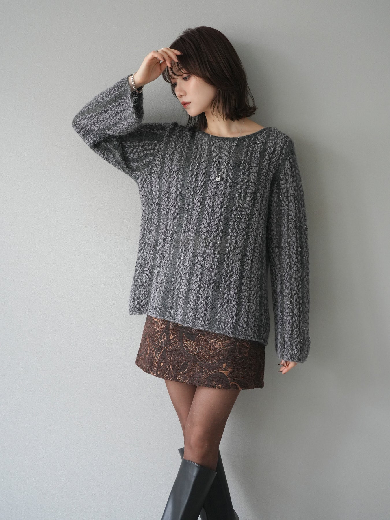 [予約]スパンコール異素材ストライプニットプルオーバー/gray
