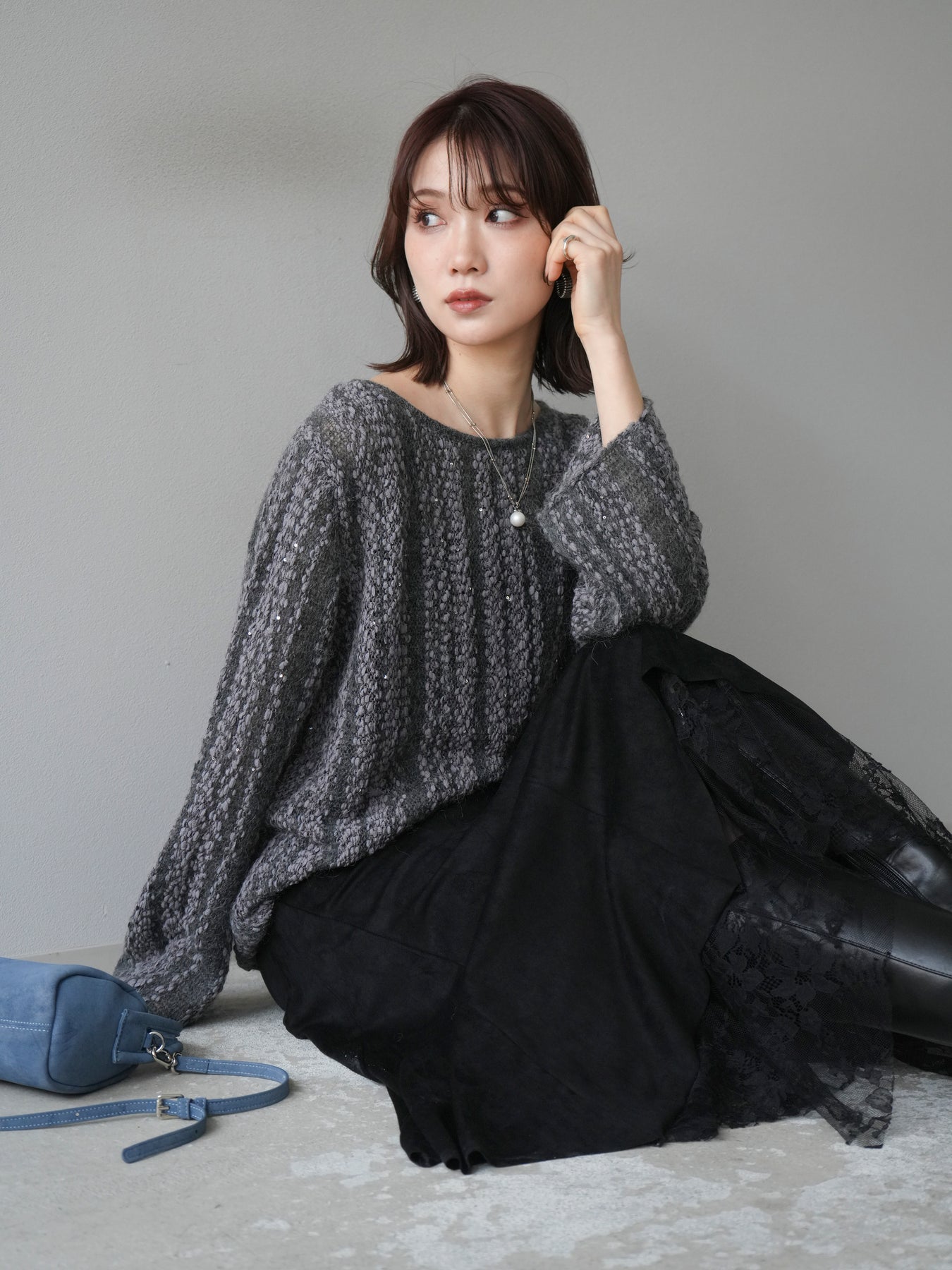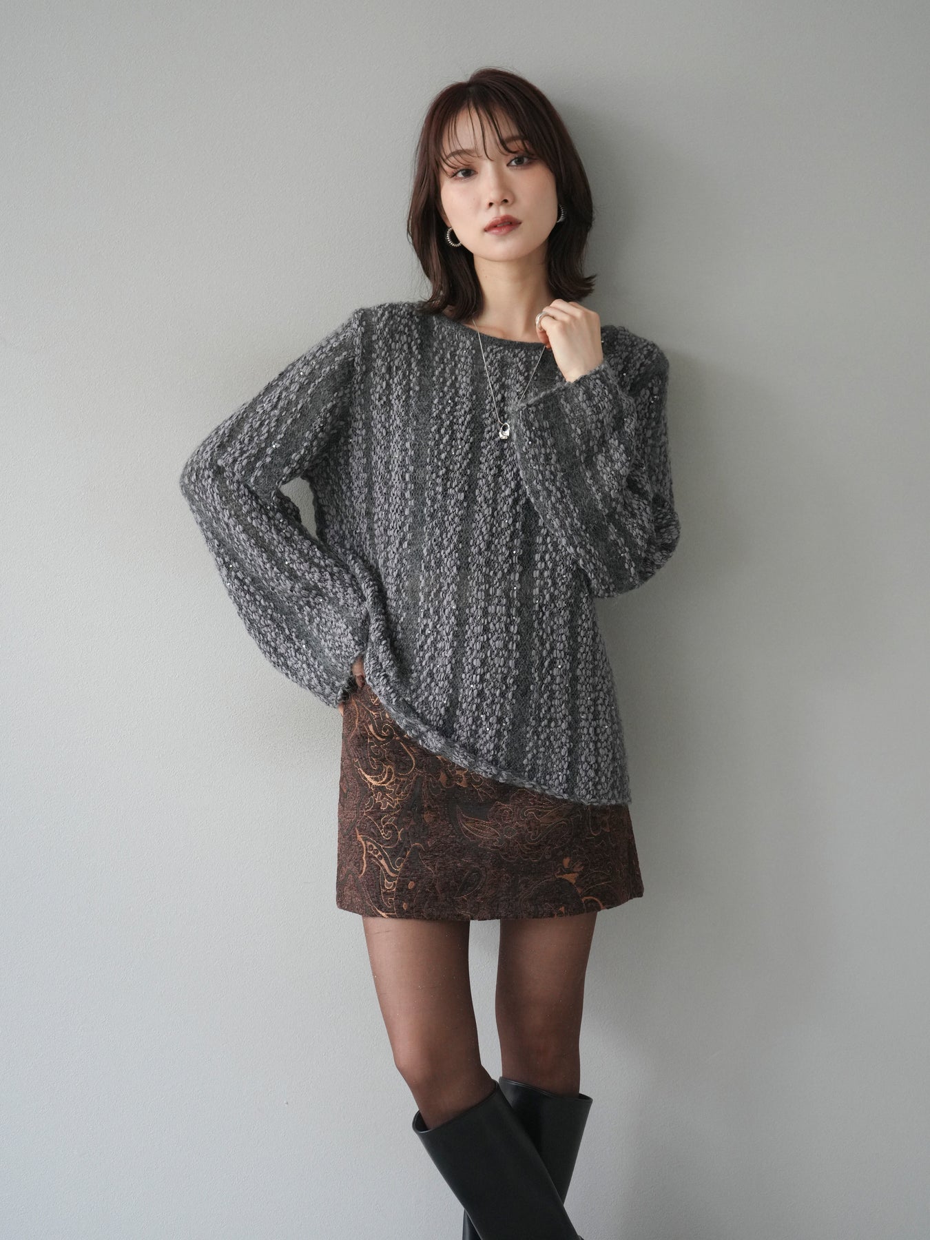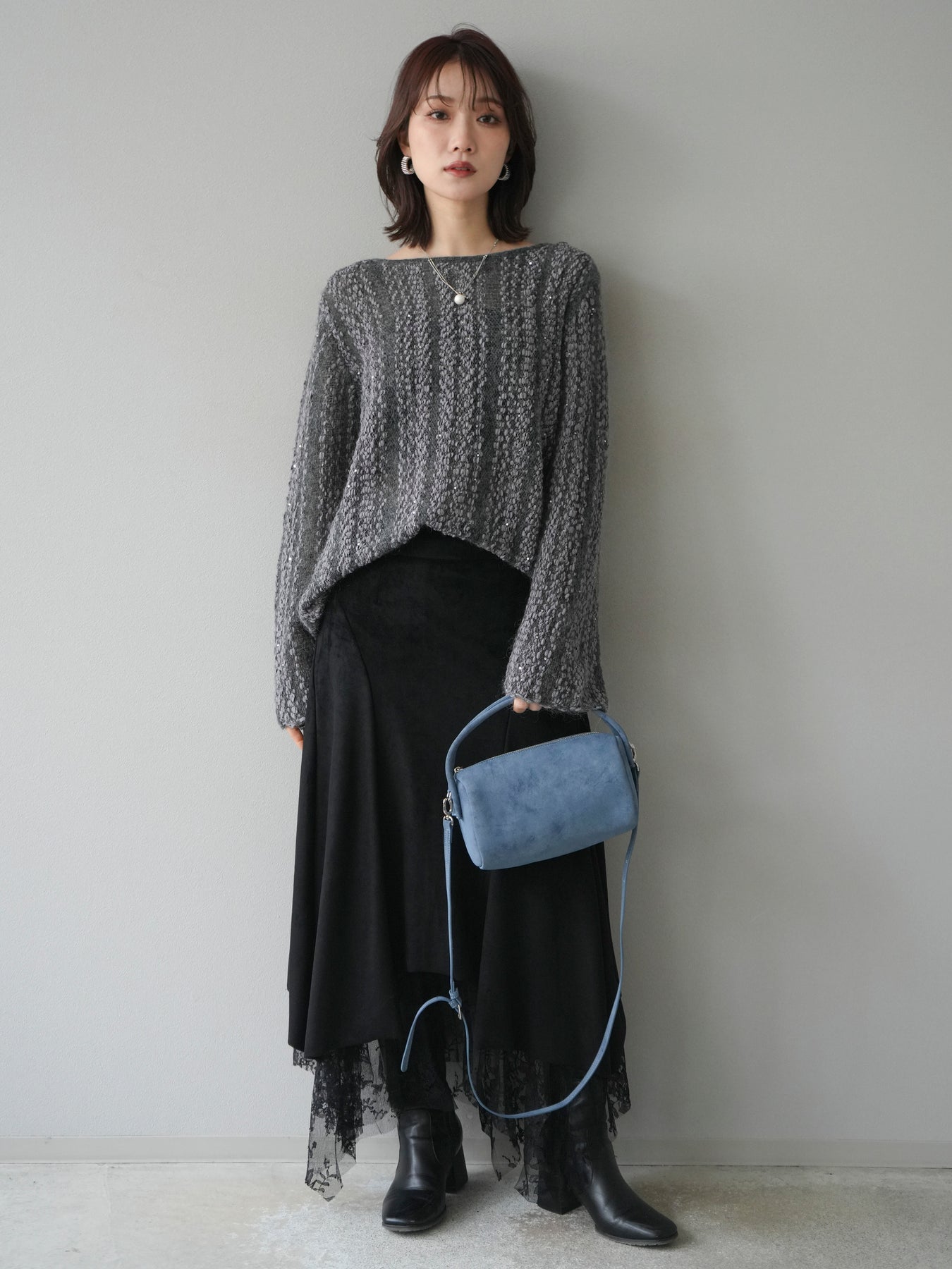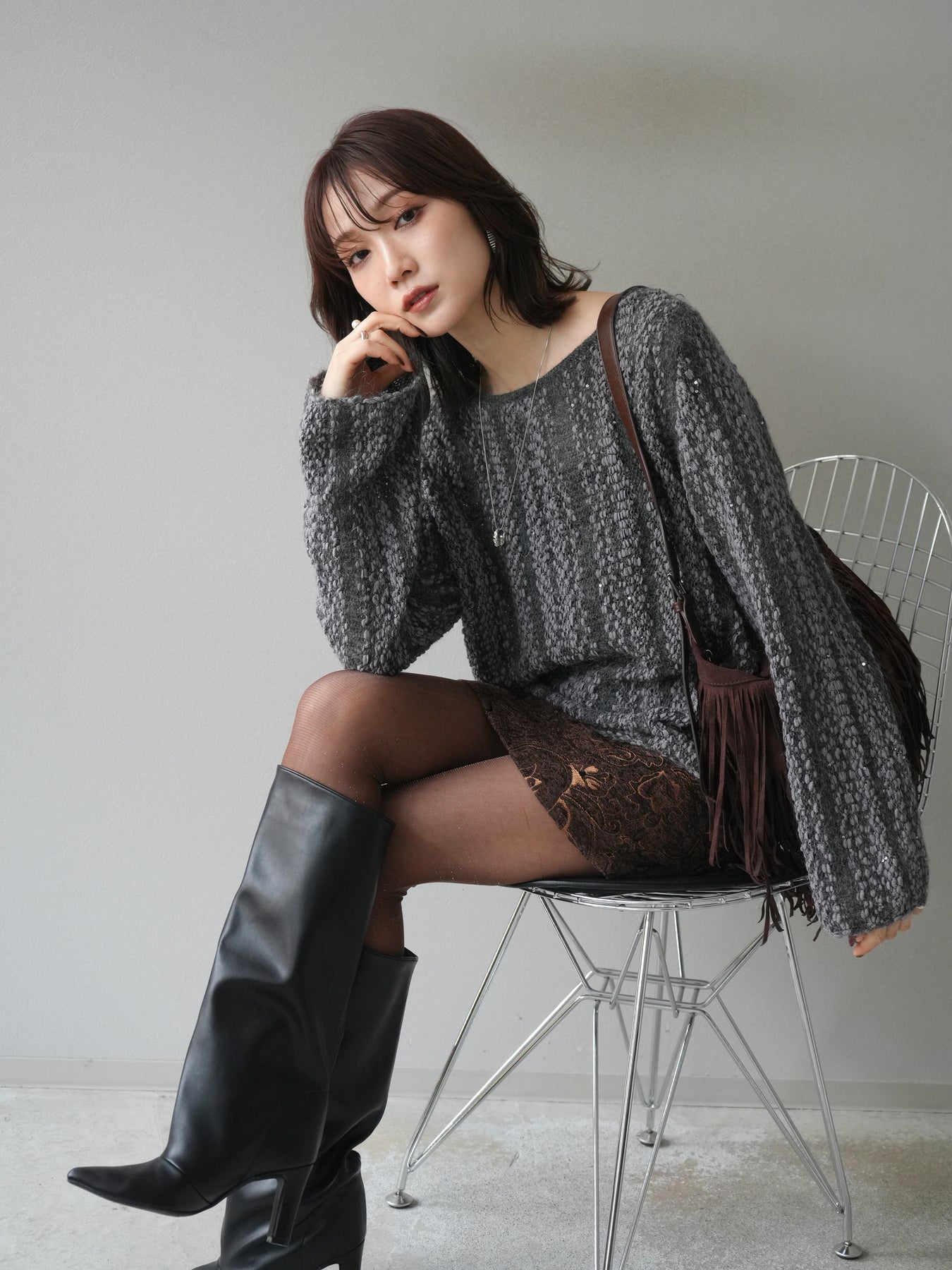 [予約]スパンコール異素材ストライプニットプルオーバー/gray