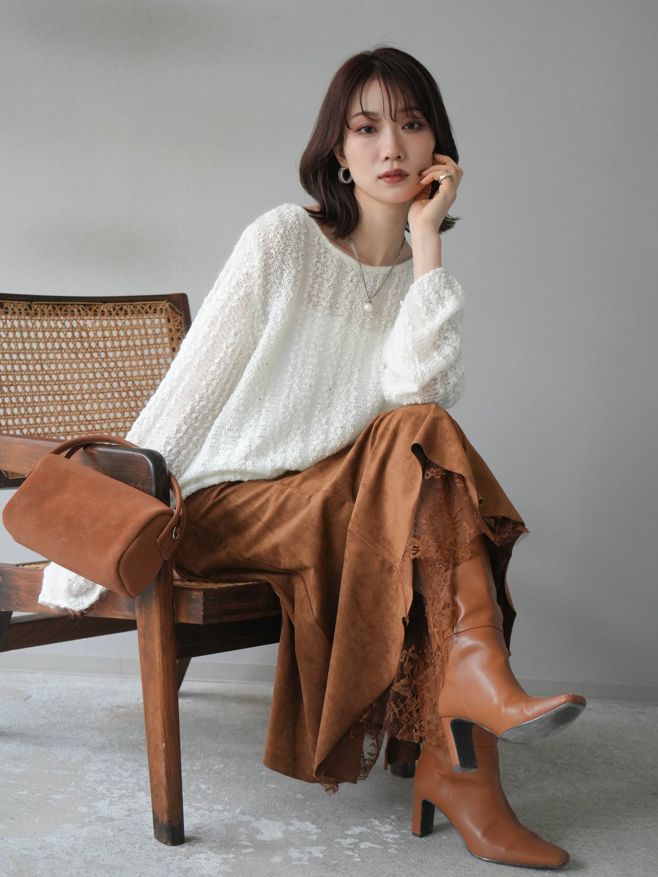スパンコールを編み込んだ異素材ミックスのストライプニットプルオーバー。 光の加減でさりげなくきらめくスパンコールが、華やかさと上品さを兼ね備えた一枚です。 立体感のある編地と程よい透け感が軽やかな印象を与え、シンプルなボトムと合わせても存在感のあるスタイルに。 ゆったりとしたシルエットでリラックス感がありながらも、女性らしい抜け感を演出します。 デイリーにはもちろん、ちょっとしたお出かけにも映える大人のためのニットです。 ※ボトムス、キャミソール(インナー)以外の商品は一律でインナーは付属していません。