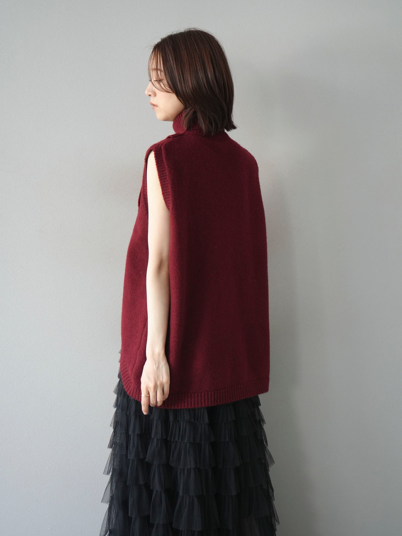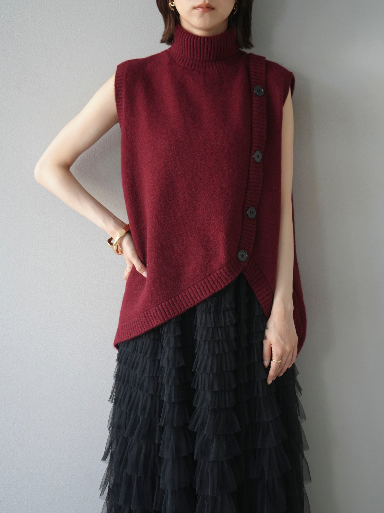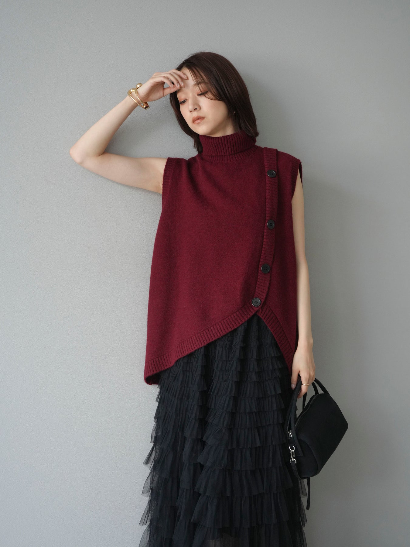 フロントにデザイン性のあるボタンディテールを施した、目を惹くニットベスト。アシンメトリーに重なる前立てがレイヤードスタイルに奥行きを与え、シンプルながらも洒落感をプラス。しっかりと厚みがありつつも柔らかさのある素材で、タートル風のネックが顔まわりをすっきりと引き締めてくれます。インナーとの組み合わせ次第で秋口から冬本番まで長く活躍します。