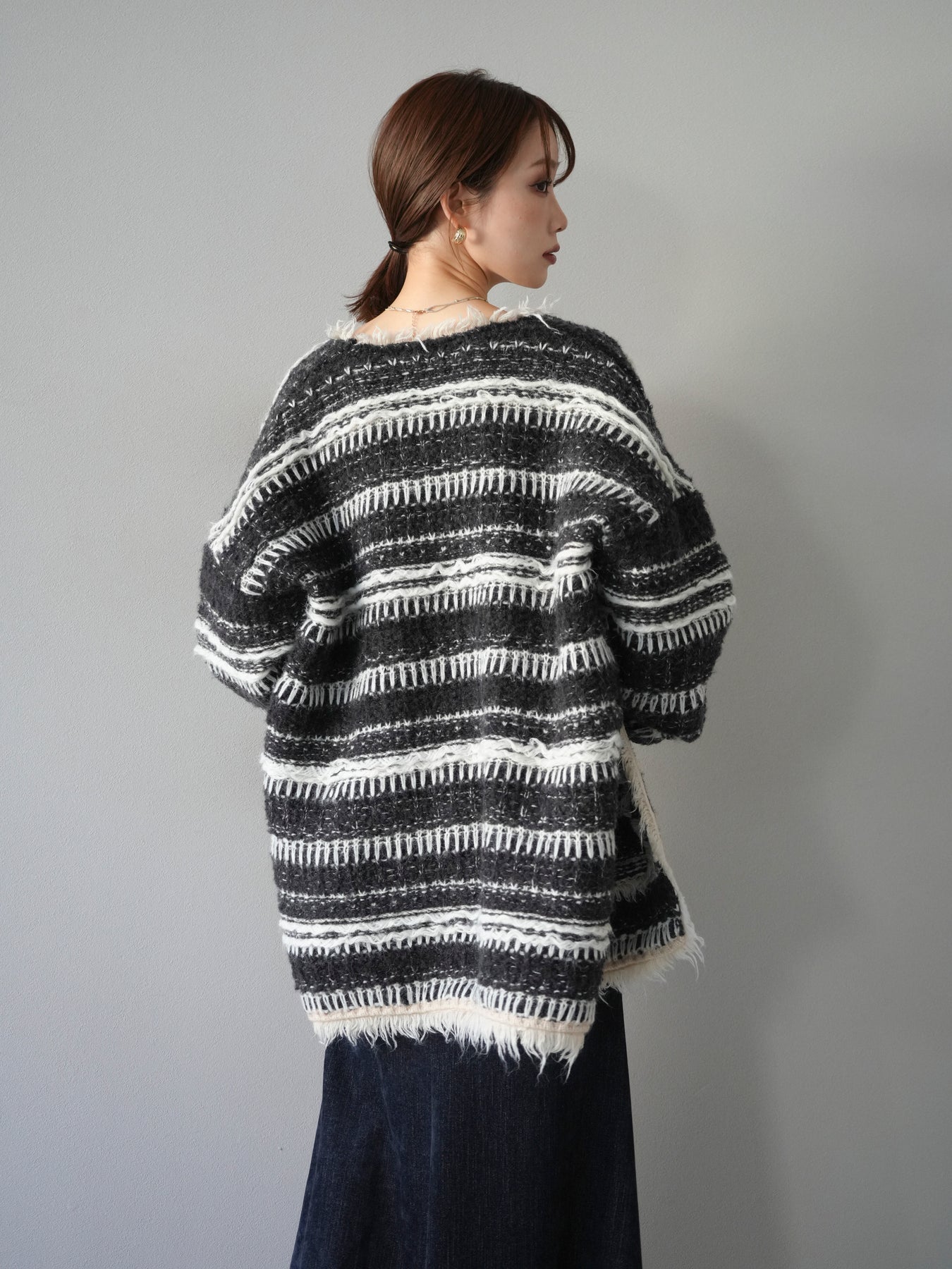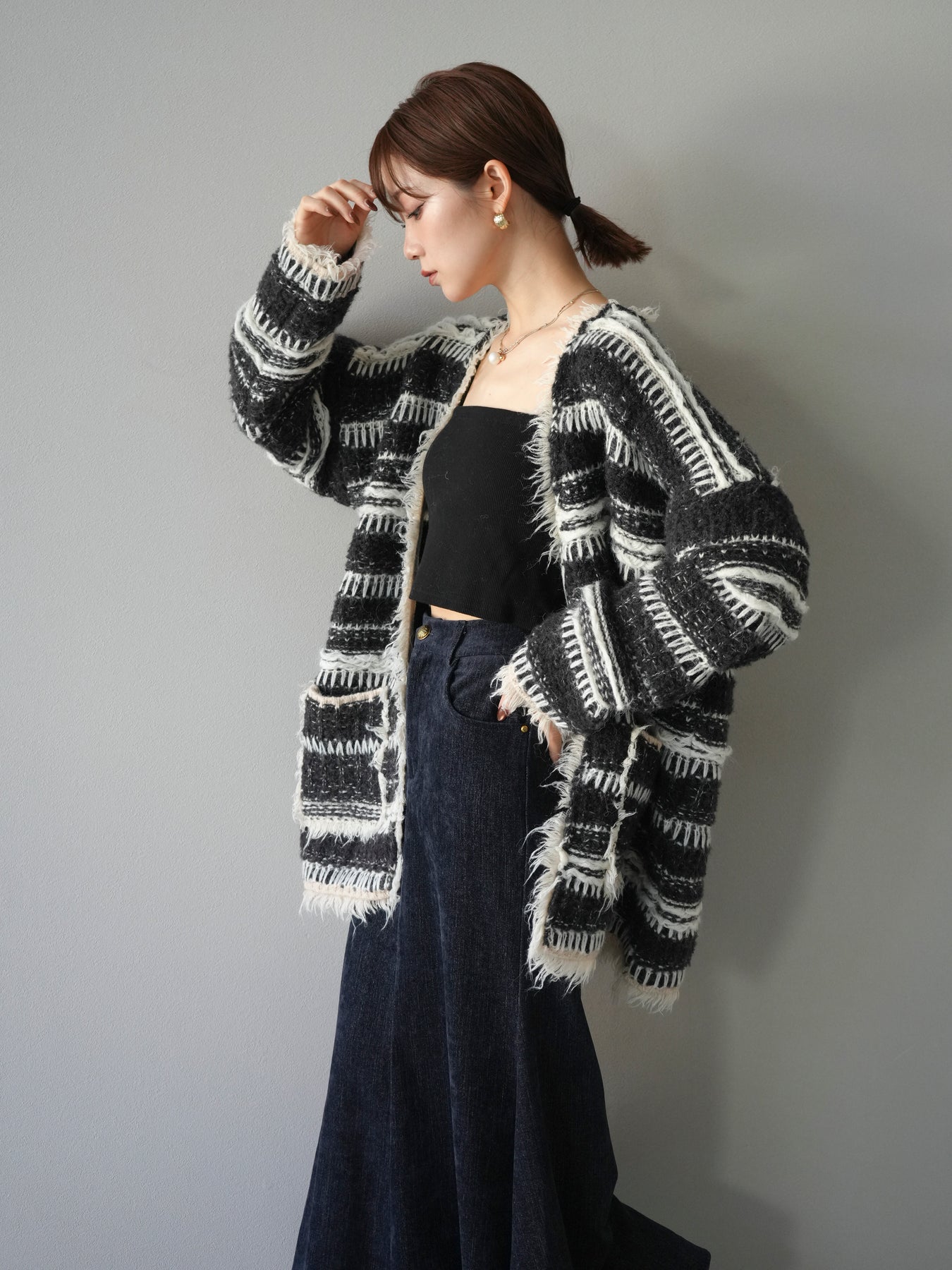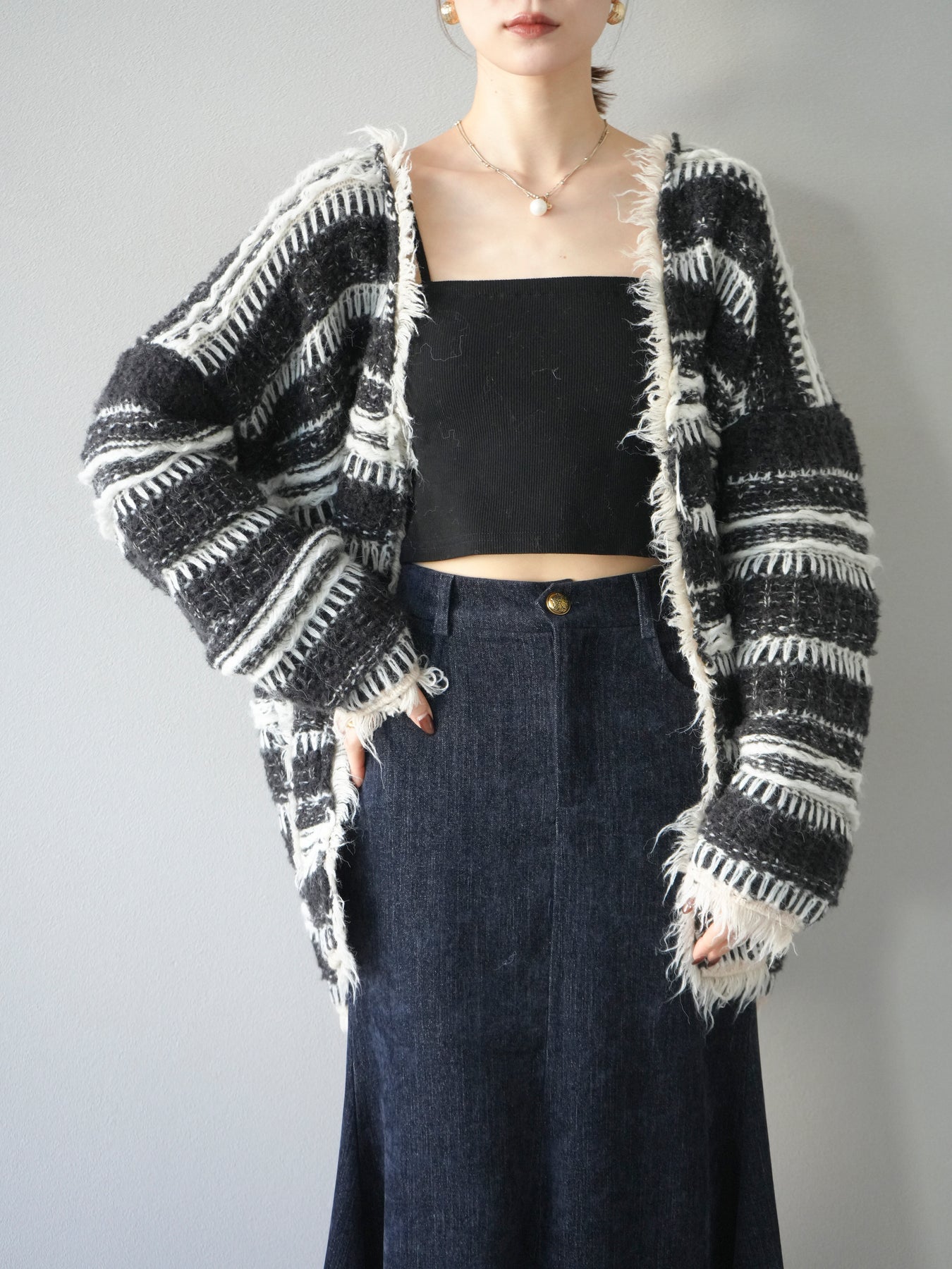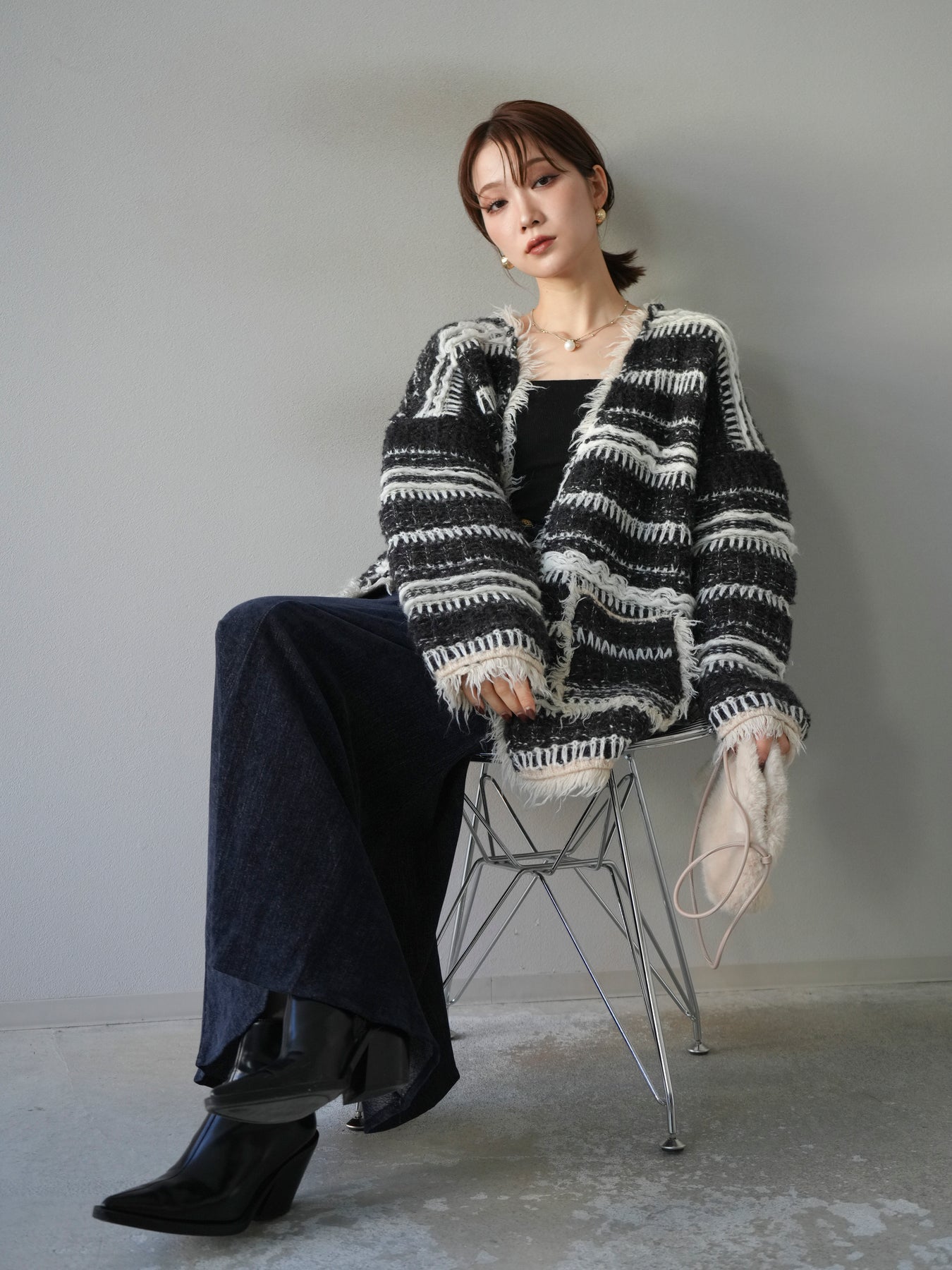 [予約]ミックスフリンジオーバーニットカーディガン/black