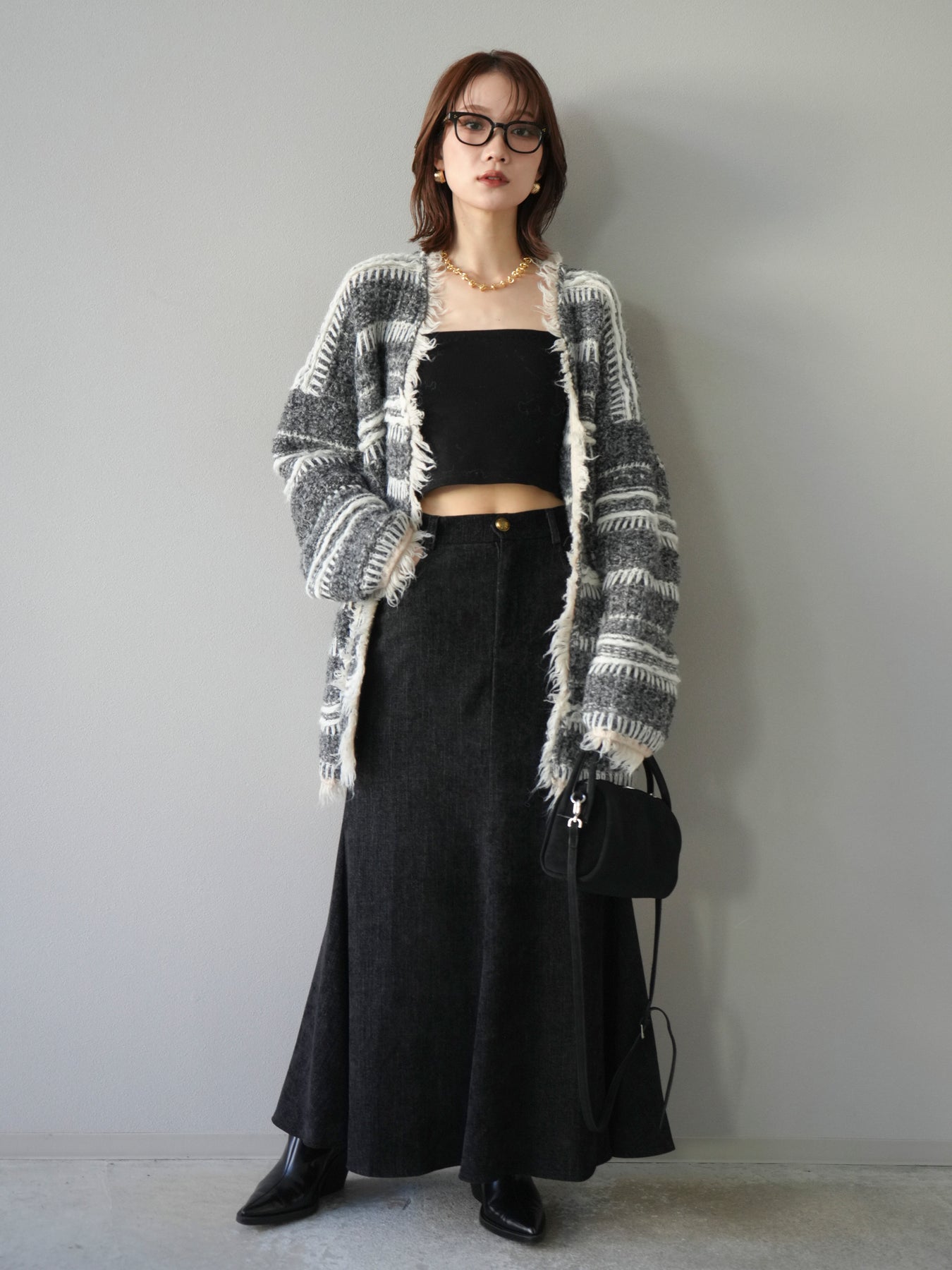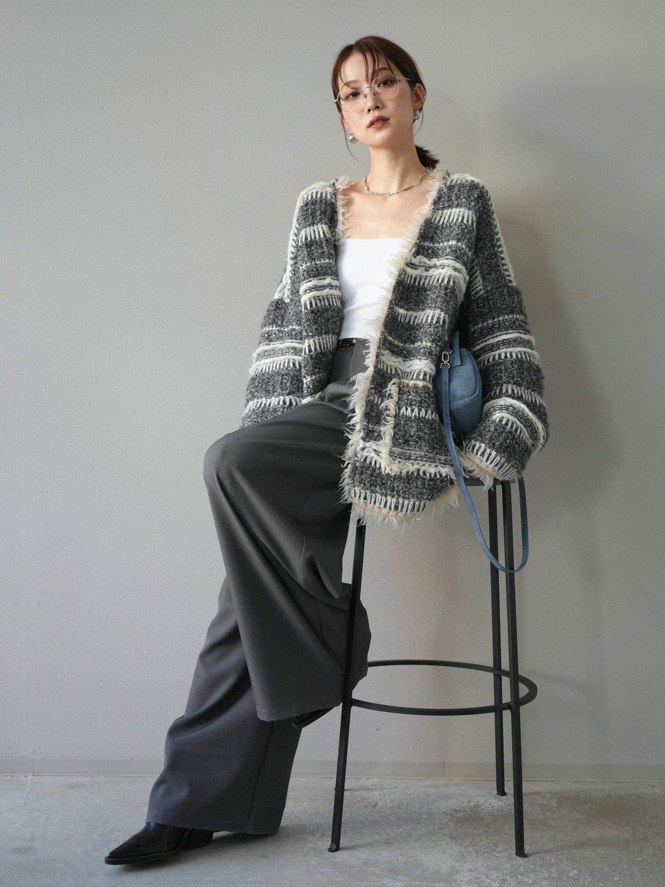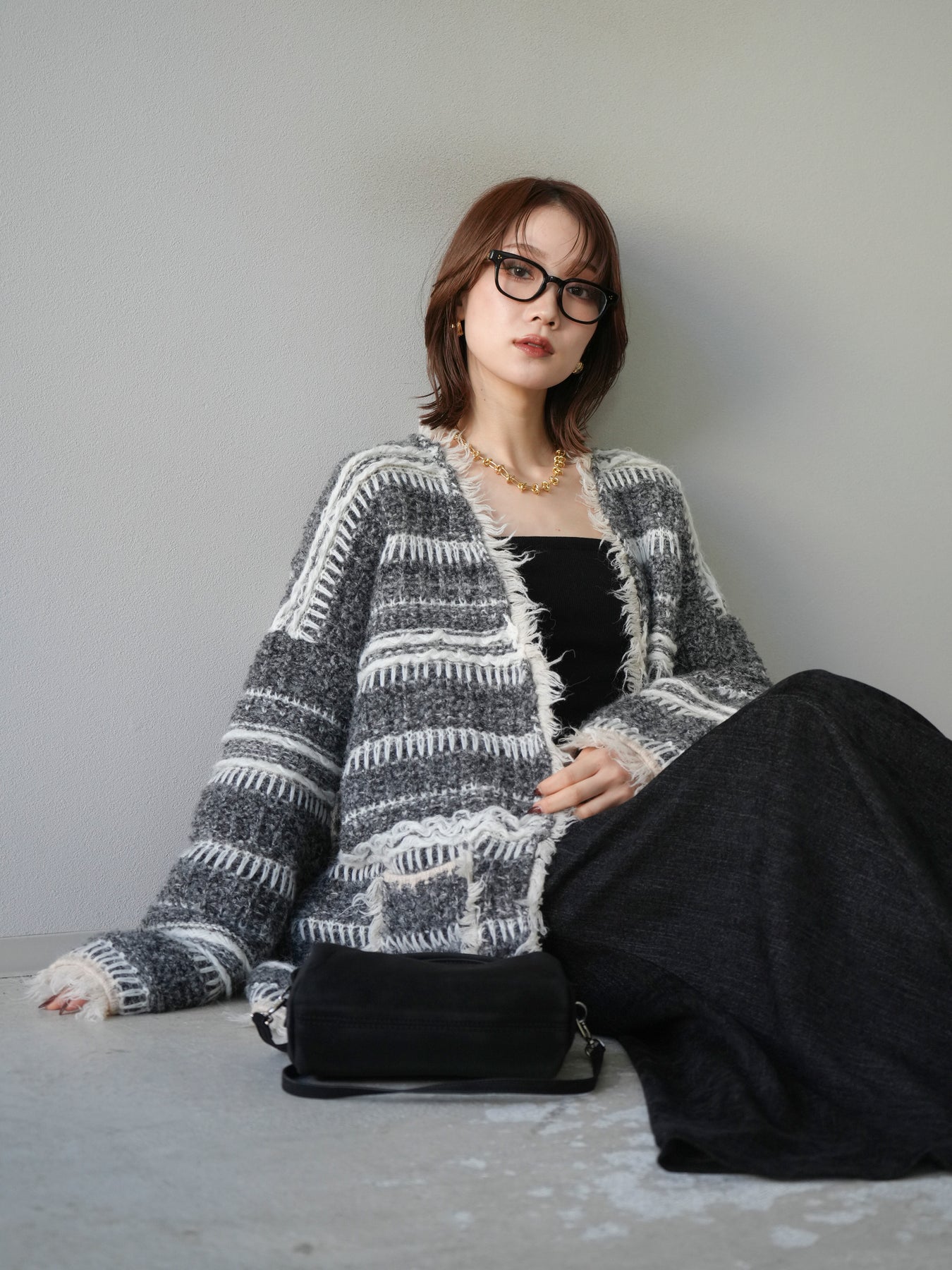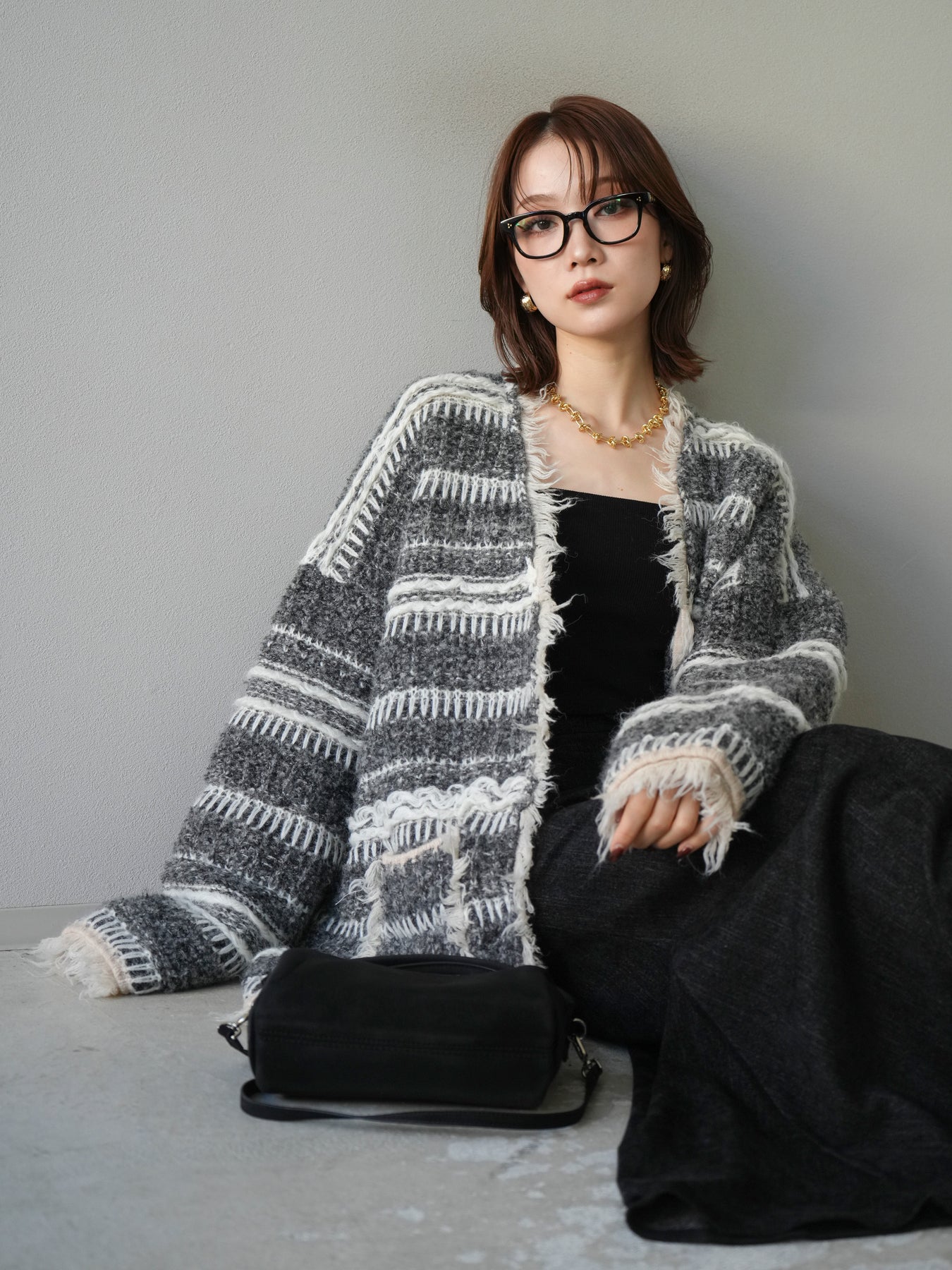 表情豊かなフリンジミックス編みが目を引くニットカーディガン。ざっくりとした編み地とゆったりとしたオーバーサイズシルエットで、リラクシーながらも存在感のある着こなしが叶います。前を閉じてトップス風にも着用でき、羽織るだけでスタイリングの主役になる一枚です。