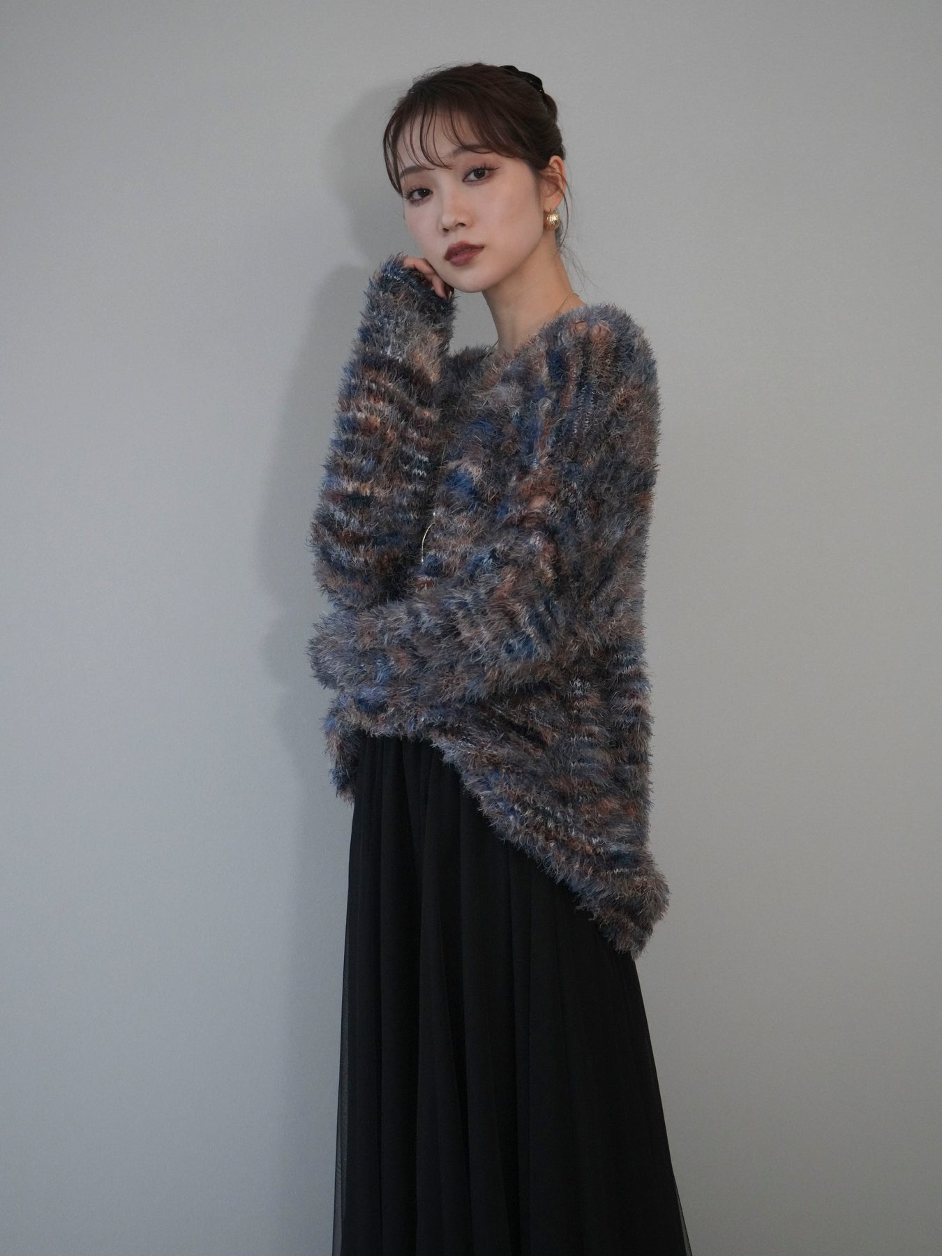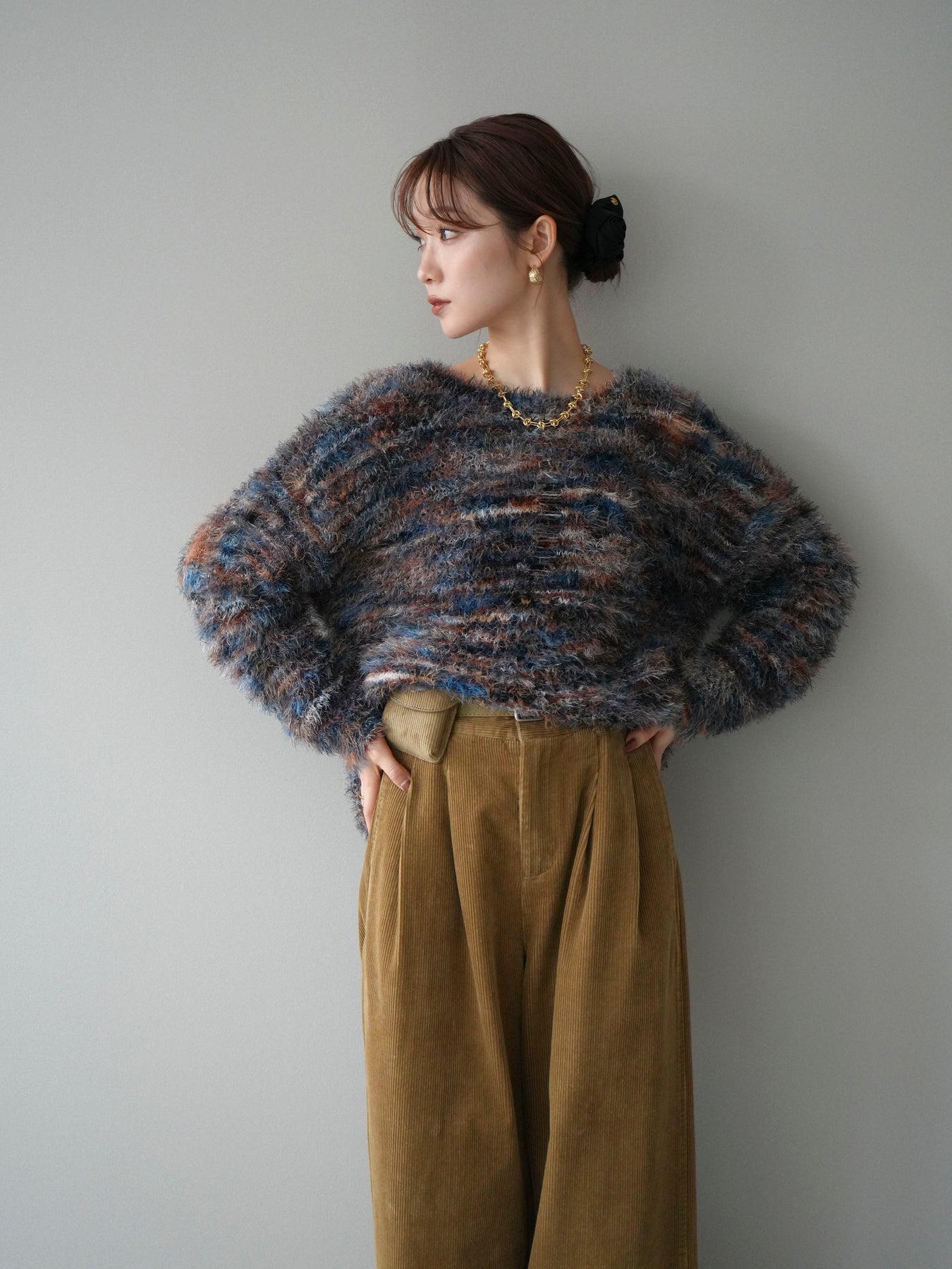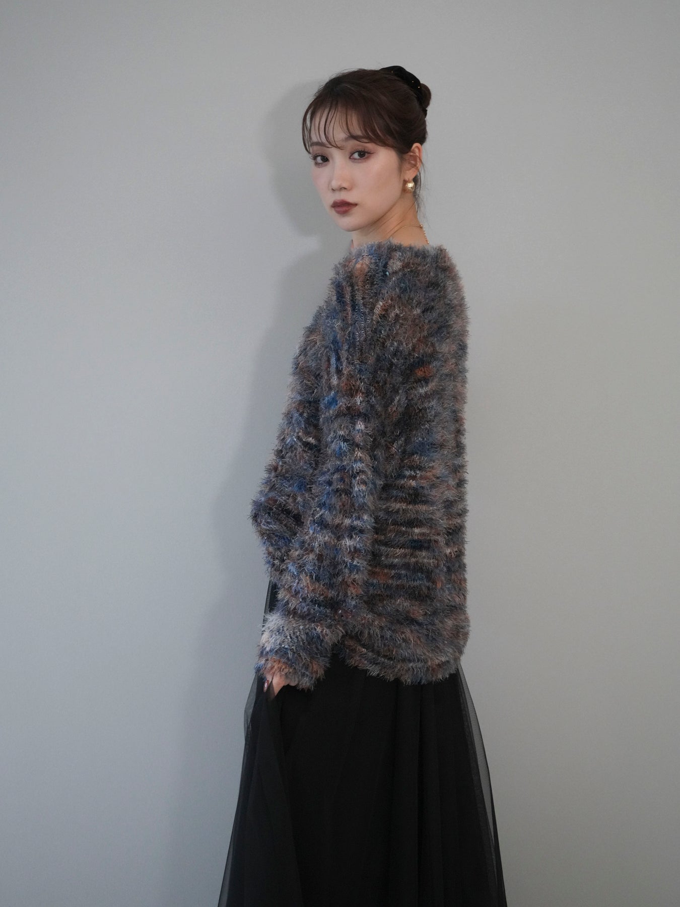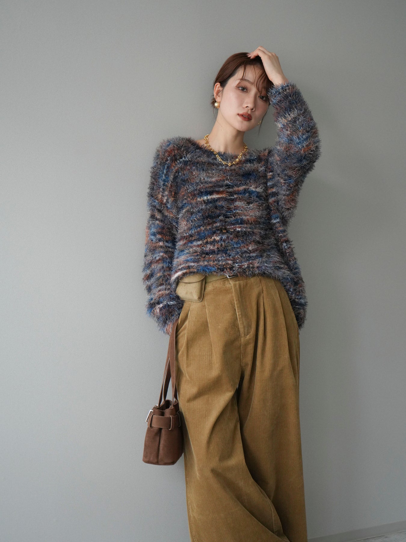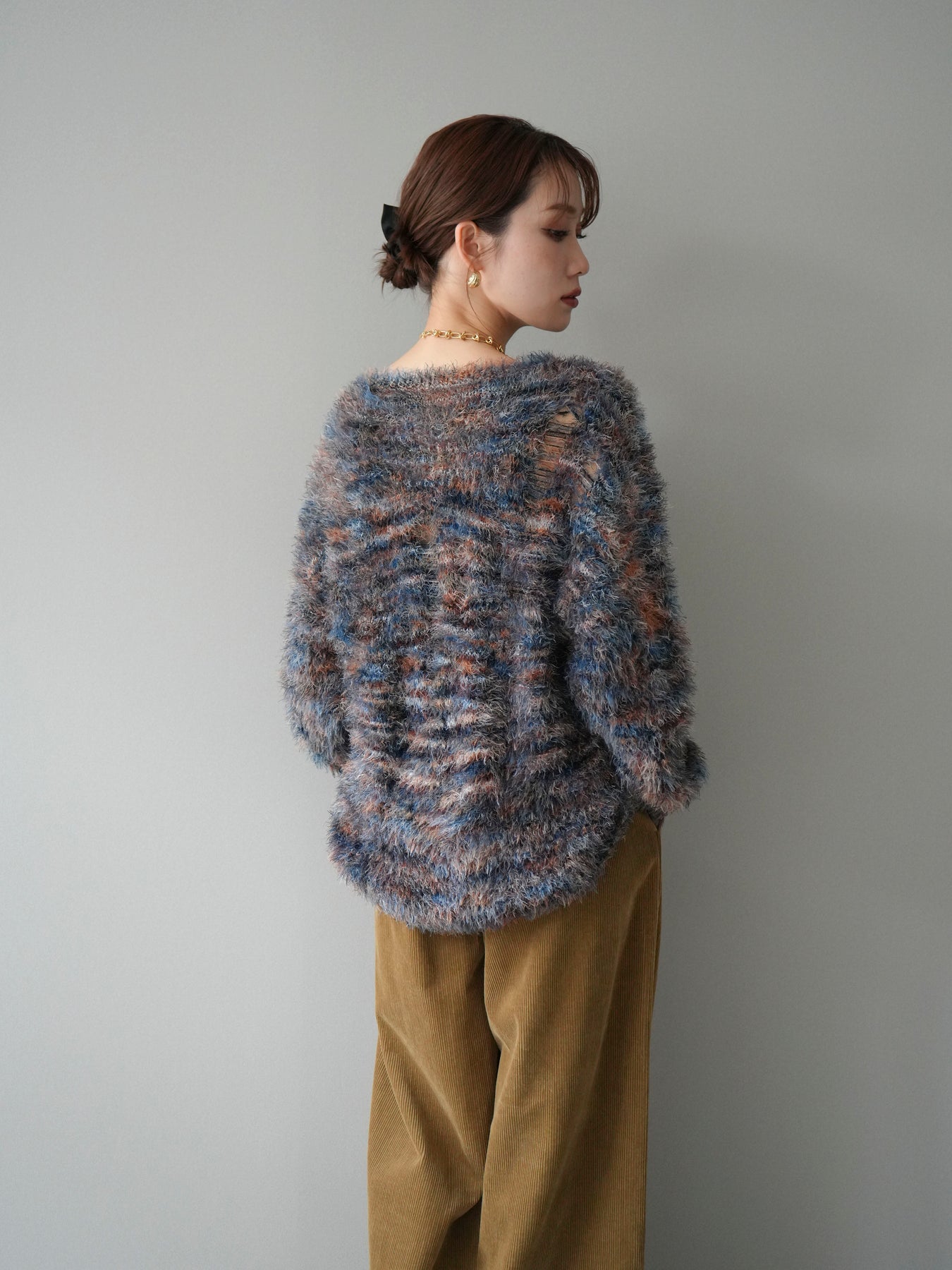 ふんわりとしたシャギー素材とミックスカラーが魅力のルーズニットプルオーバー。 奥行きのある色合いと柔らかな質感が、シーズンムードを高めてくれます。 ゆったりとしたシルエットが抜け感を演出し、リラクシーながらも女性らしい印象に。 軽やかな着心地で、1枚で着るのはもちろん、シャツやハイネックとのレイヤードもおすすめです。 デニムやスカートなど、どんなボトムともバランス良く合わせられる万能アイテムです。 ※ボトムス、キャミソール(インナー)以外の商品は一律でインナーは付属していません。