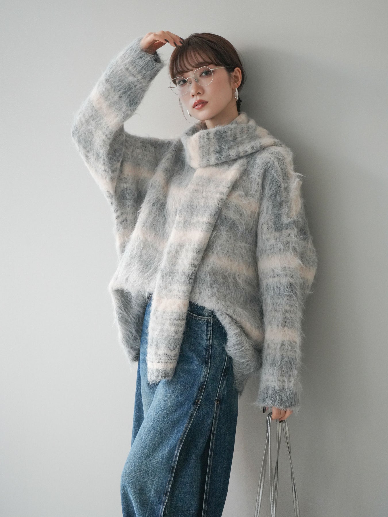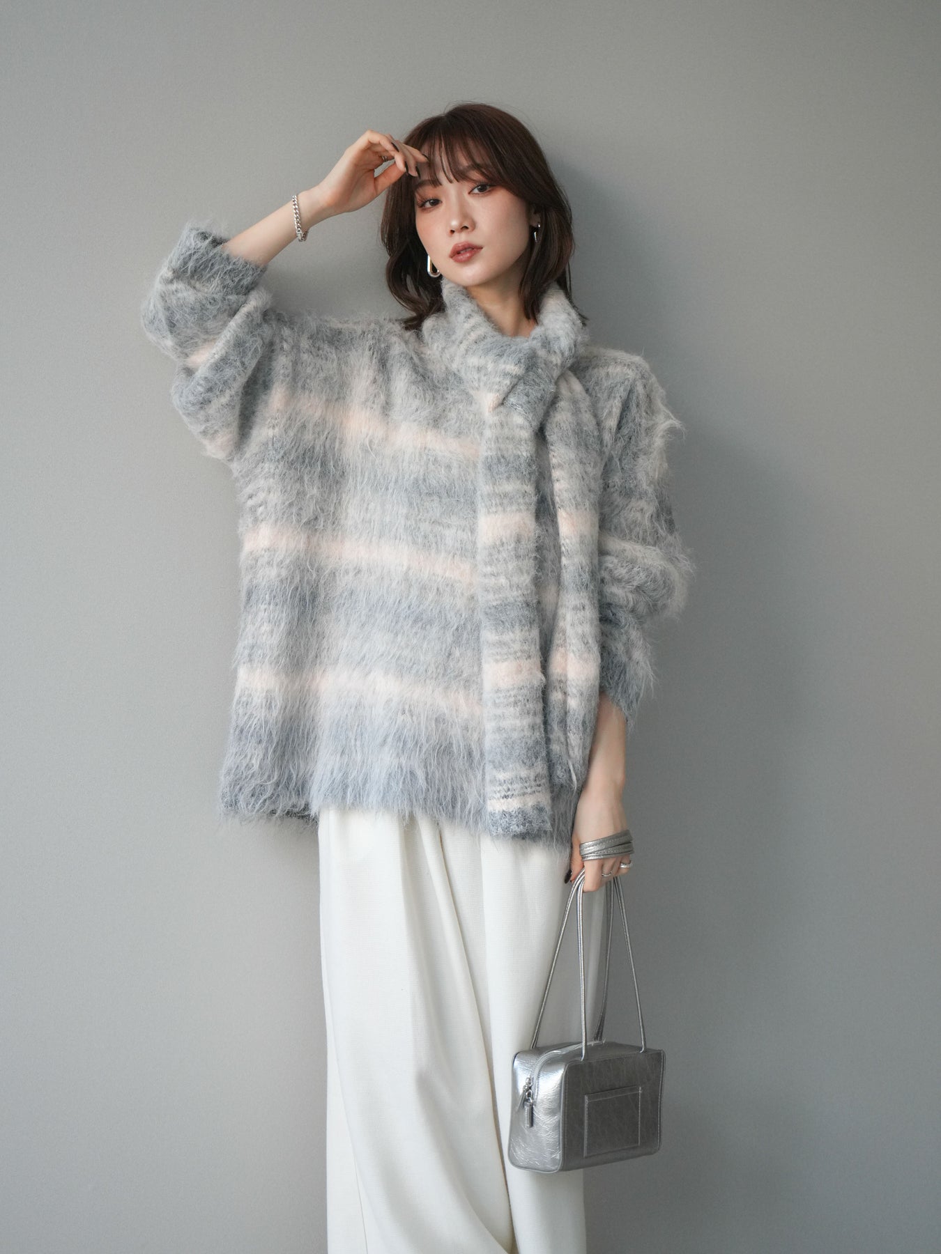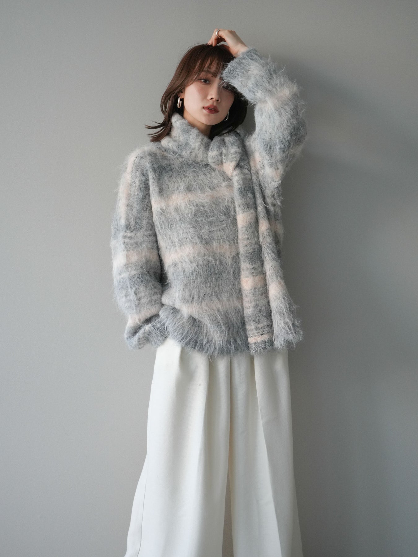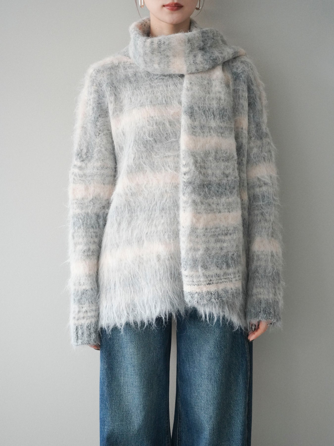 [予約]ストール付シャギーマルチボーダーニットプルオーバー/gray