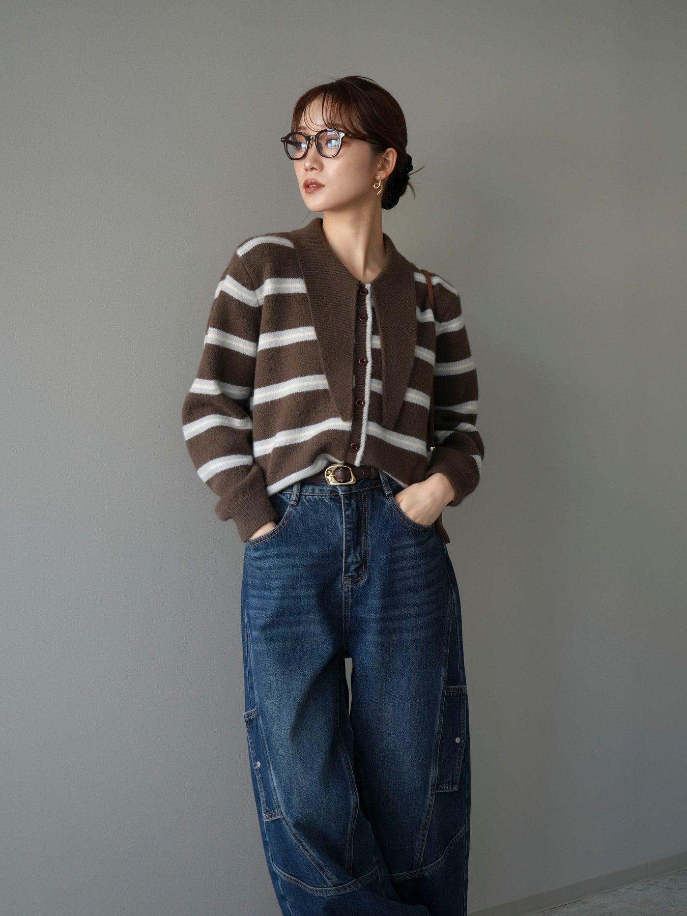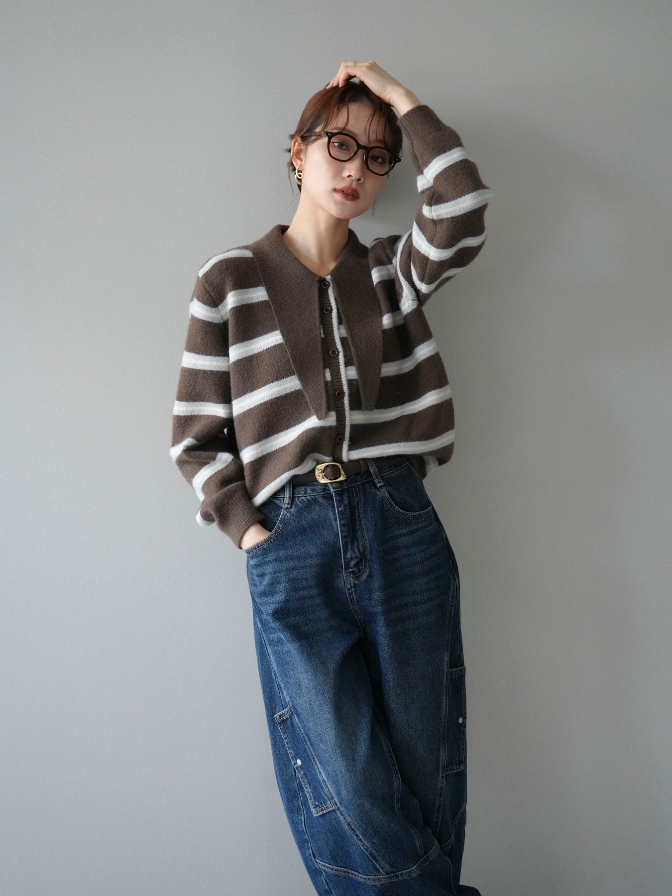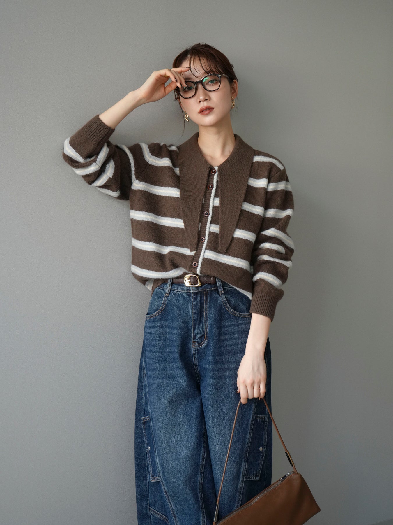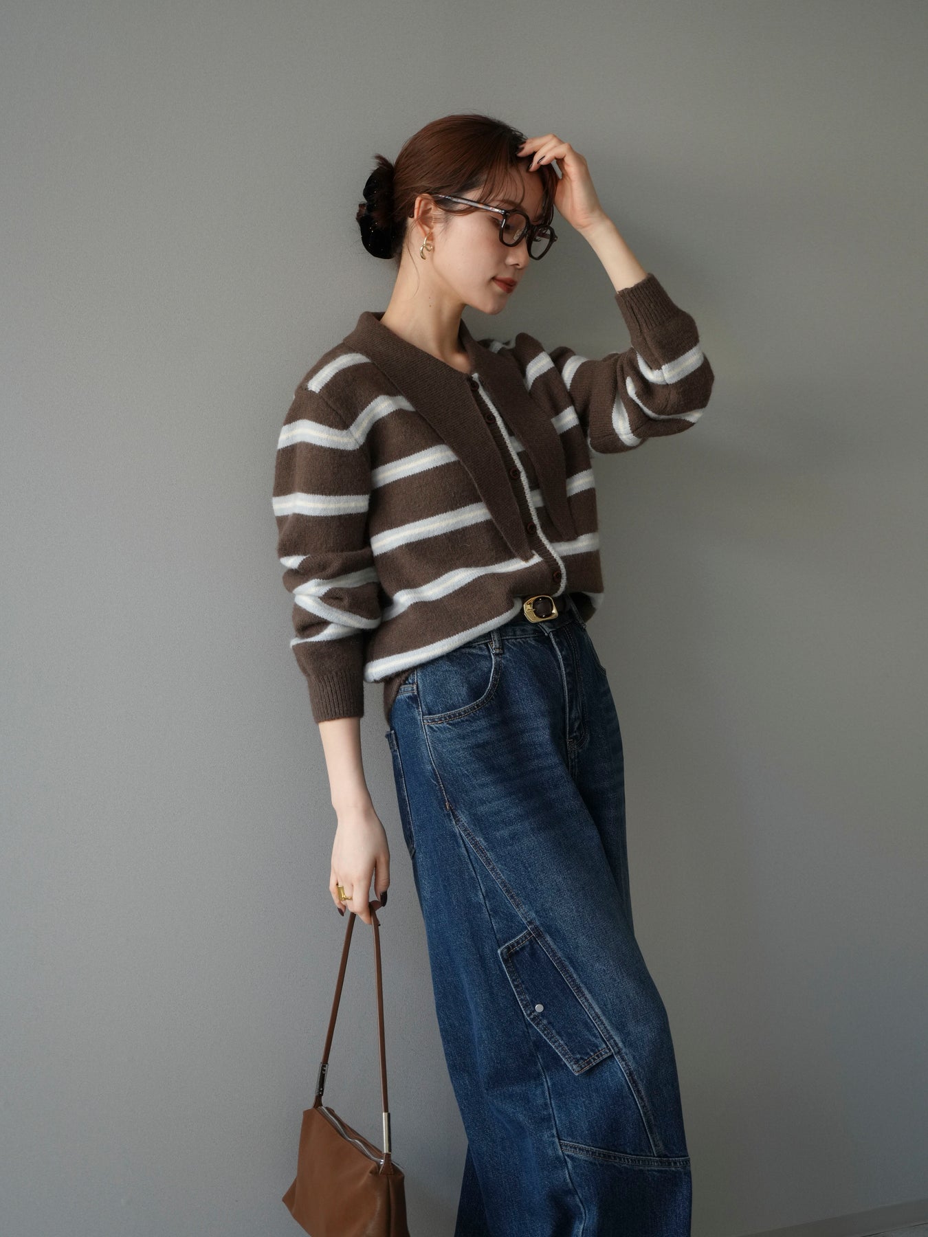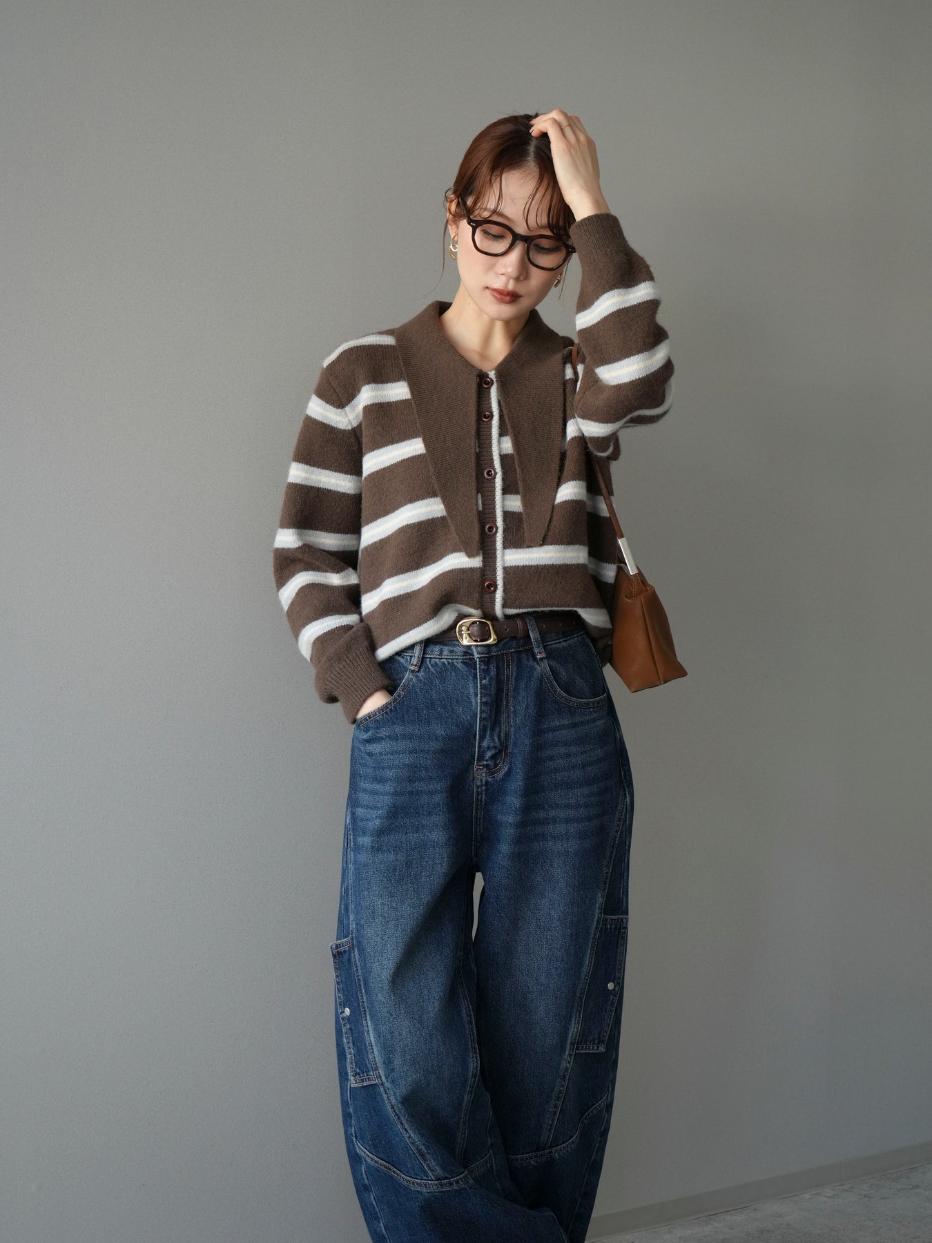 ボウタイデザインがポイントになったボーダーニットカーディガン。 首元のリボンディテールが女性らしい抜け感を演出し、カジュアルなボーダー柄に品のあるアクセントをプラスします。 ややゆとりのあるシルエットで、1枚でトップスとしても、羽織りとしても活躍。 柔らかなニット素材が心地よく、デイリーにもきれいめにも取り入れやすい万能アイテムです。 シンプルながら存在感のあるデザインで、コーディネートの主役としてもおすすめです。