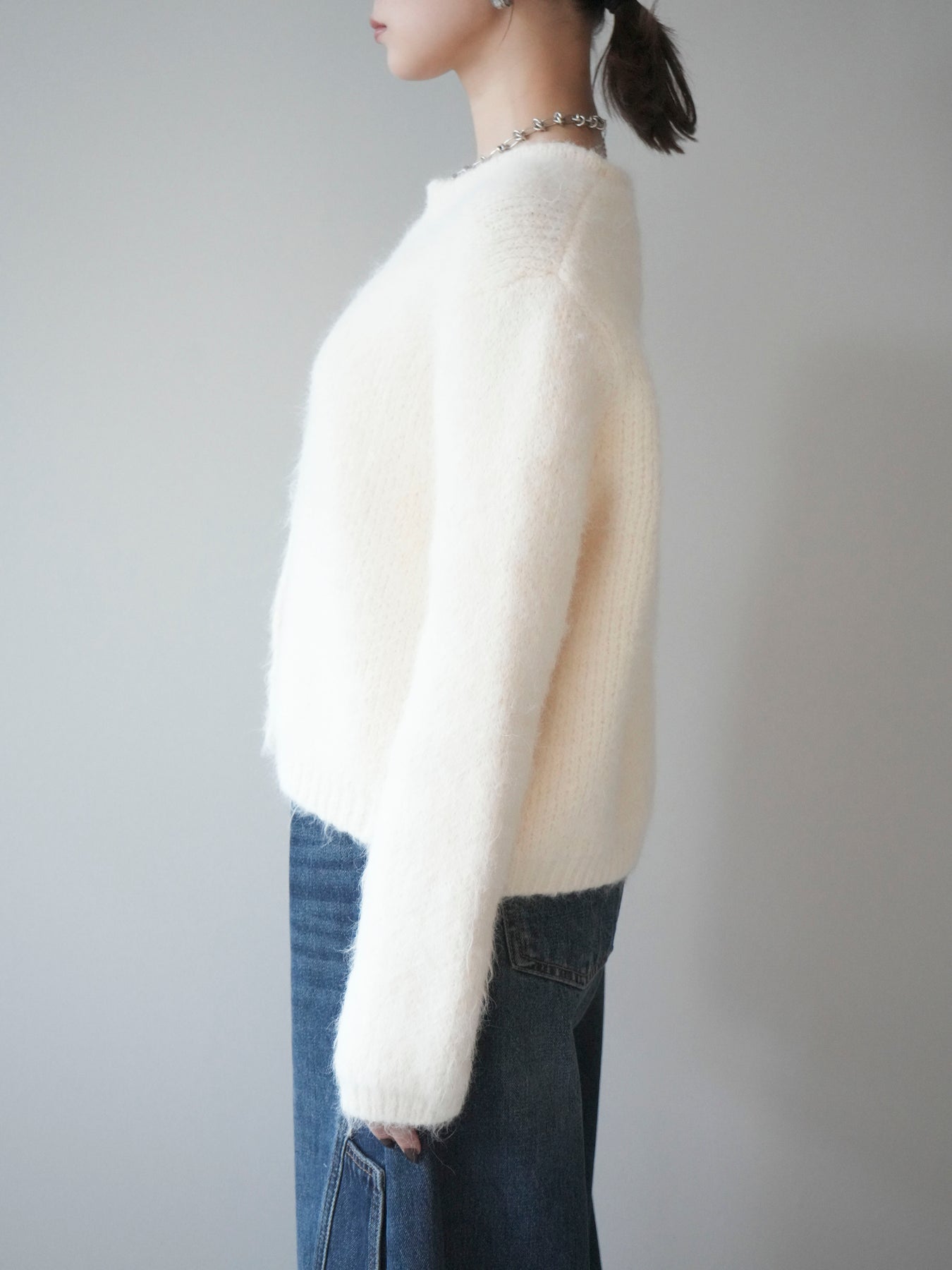 ふんわりとしたシャギー素材が女性らしさを引き立てるキーネックカーディガン。 柔らかな風合いと軽やかな着心地で、シーズンムードをたっぷりと感じられる一枚です。 首元のキーネックデザインが抜け感をプラスし、顔まわりをすっきりと見せてくれるのもポイント。 程よくゆとりのあるシルエットで、トップスとしても羽織りとしても着回しやすく、さまざまなスタイリングにマッチします。 シンプルながらも素材感で魅せる、上品で大人な印象のアイテムです。