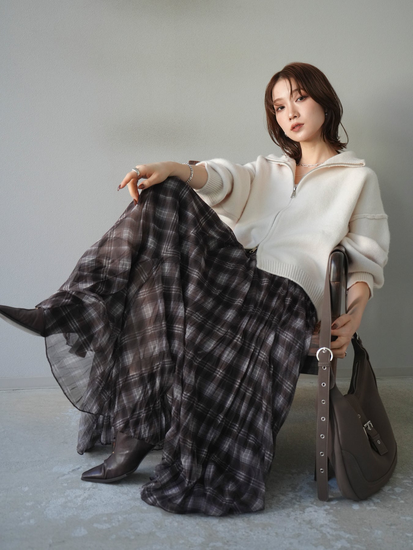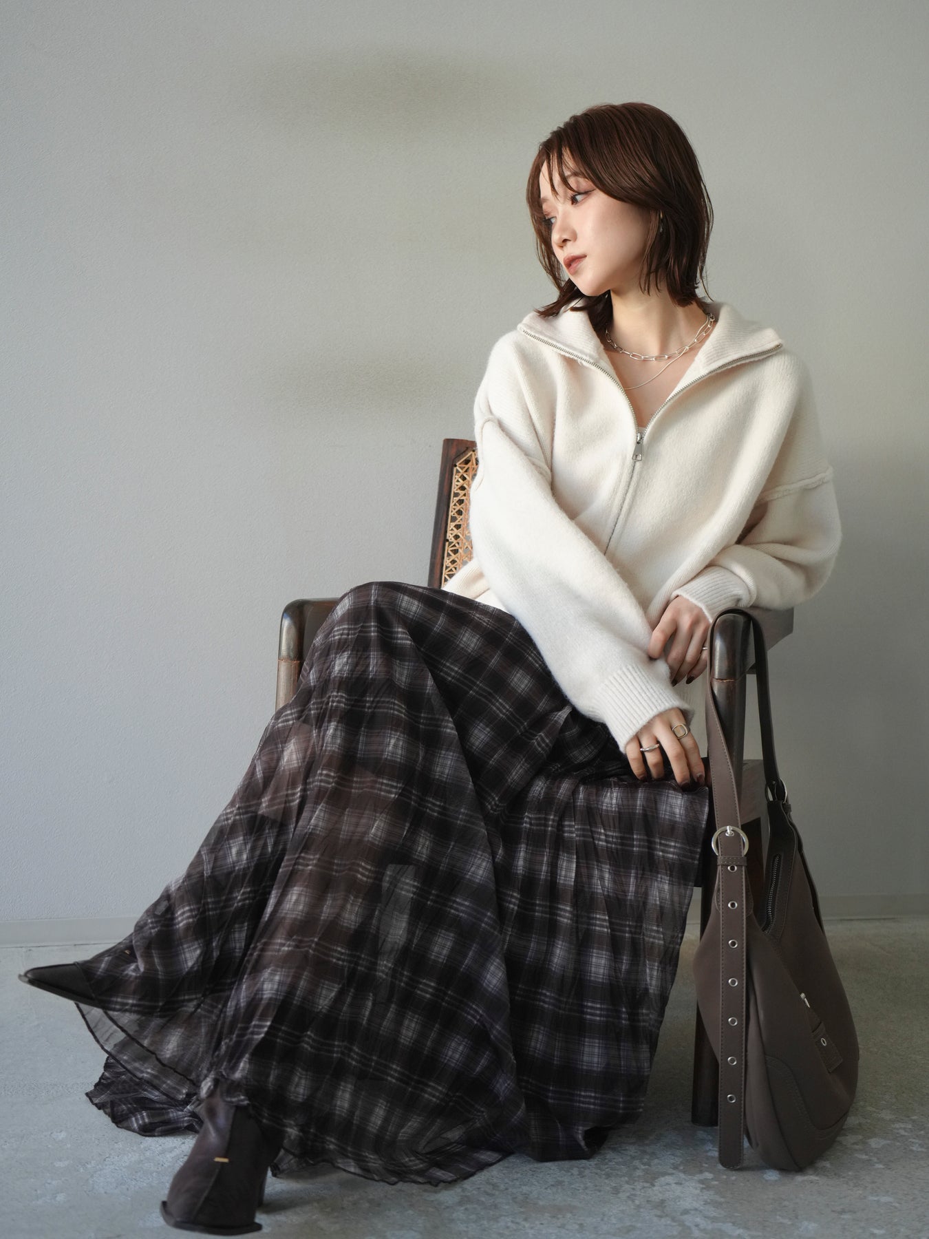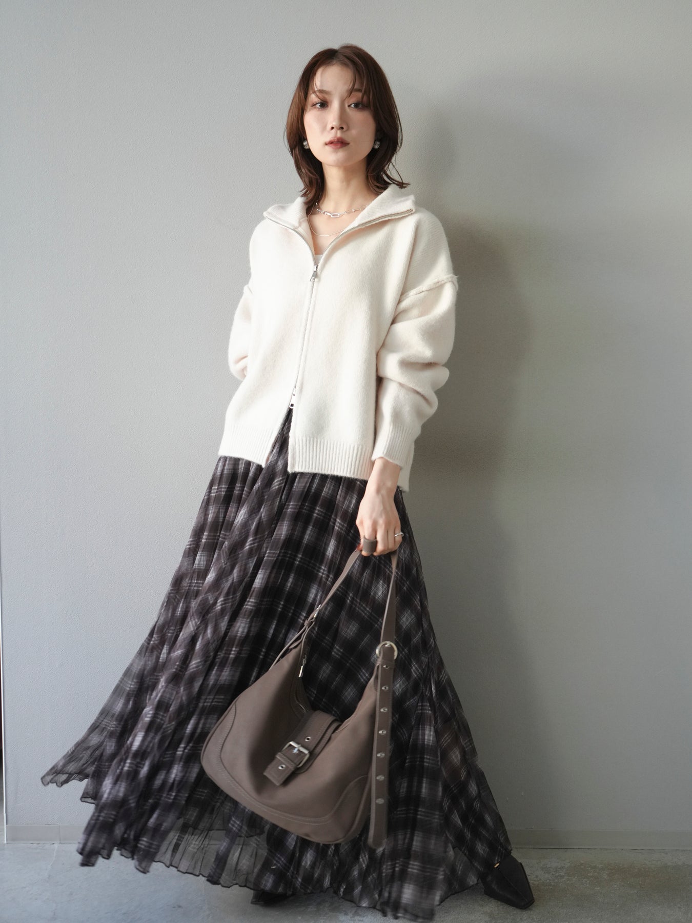 程よい厚みと柔らかなタッチで快適に羽織れるニットカーディガン。スタンドネック仕様で首元にボリュームが出すぎず、すっきりとした印象に。ダブルジップデザインでシルエットの調整がしやすく、ニュアンスのある着こなしが楽しめます。スカートにもパンツにもバランス良く合わせやすく、シーズンをまたいで活躍する一枚です。
