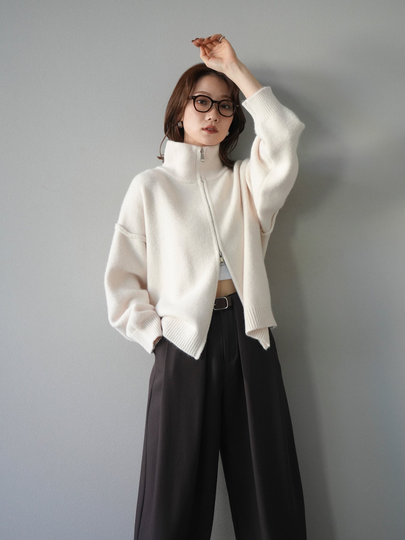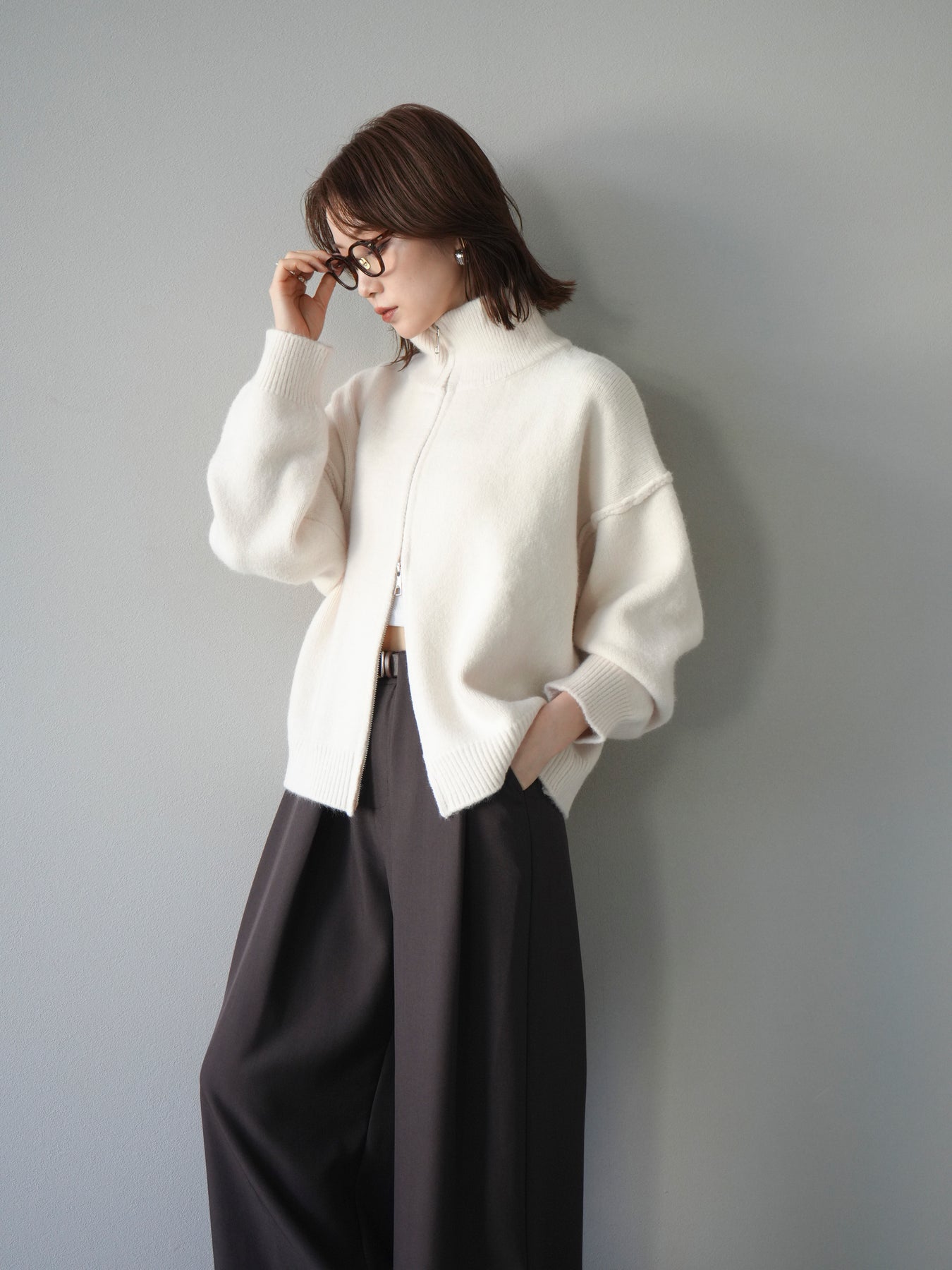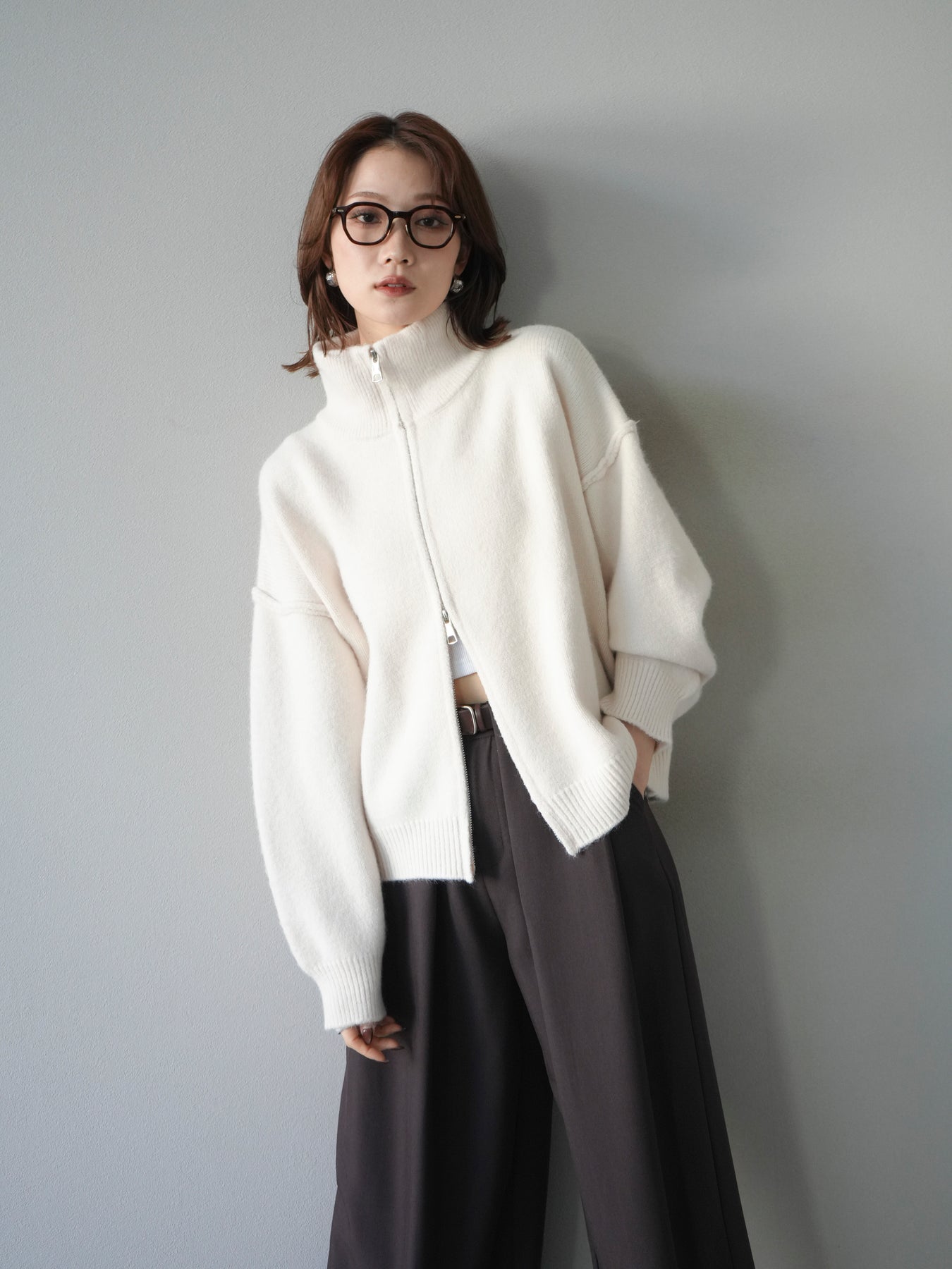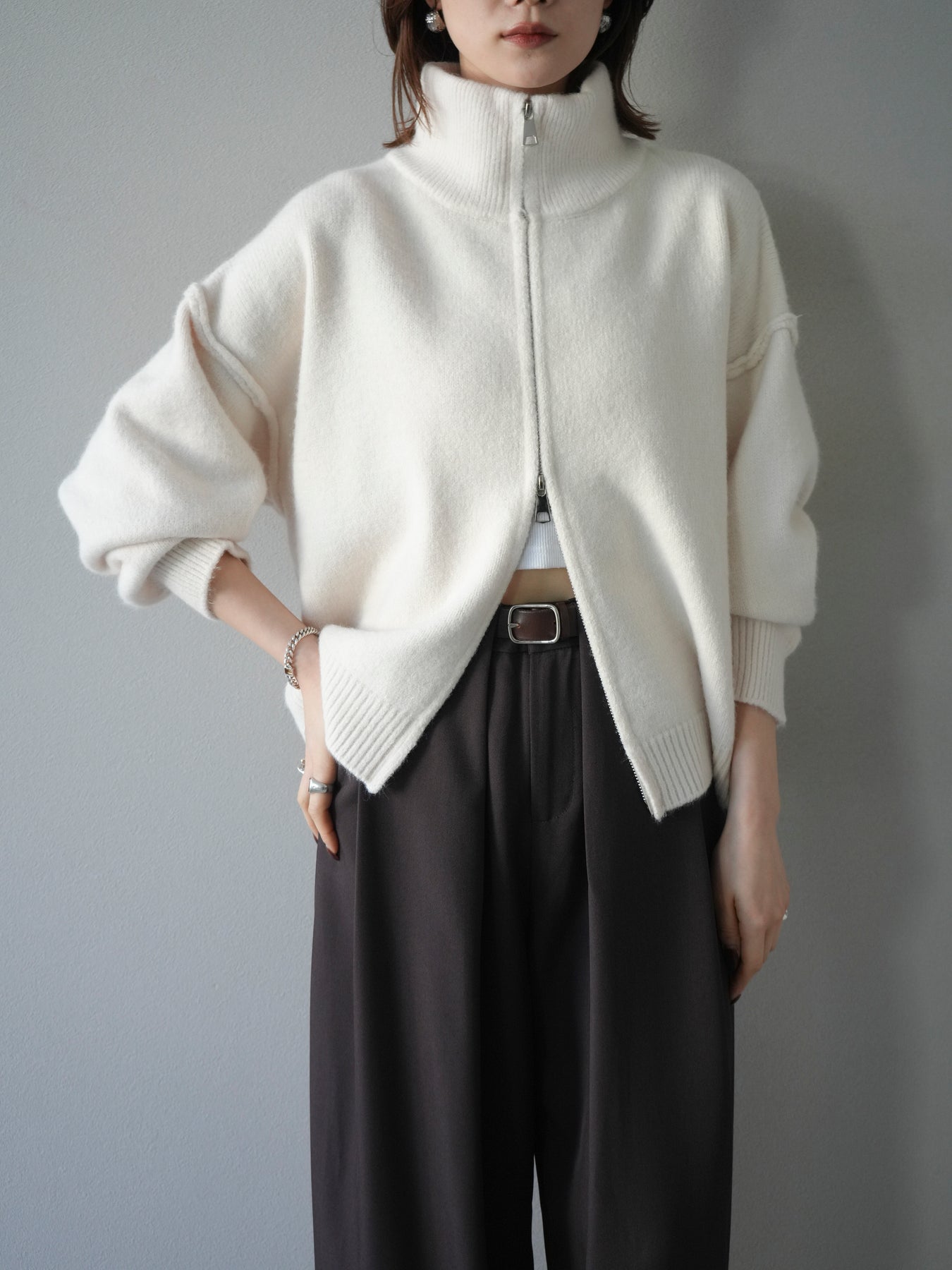 [予約]スタンドネックダブルZIPニットカーディガン/ivory