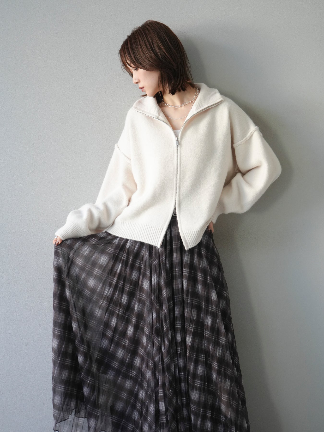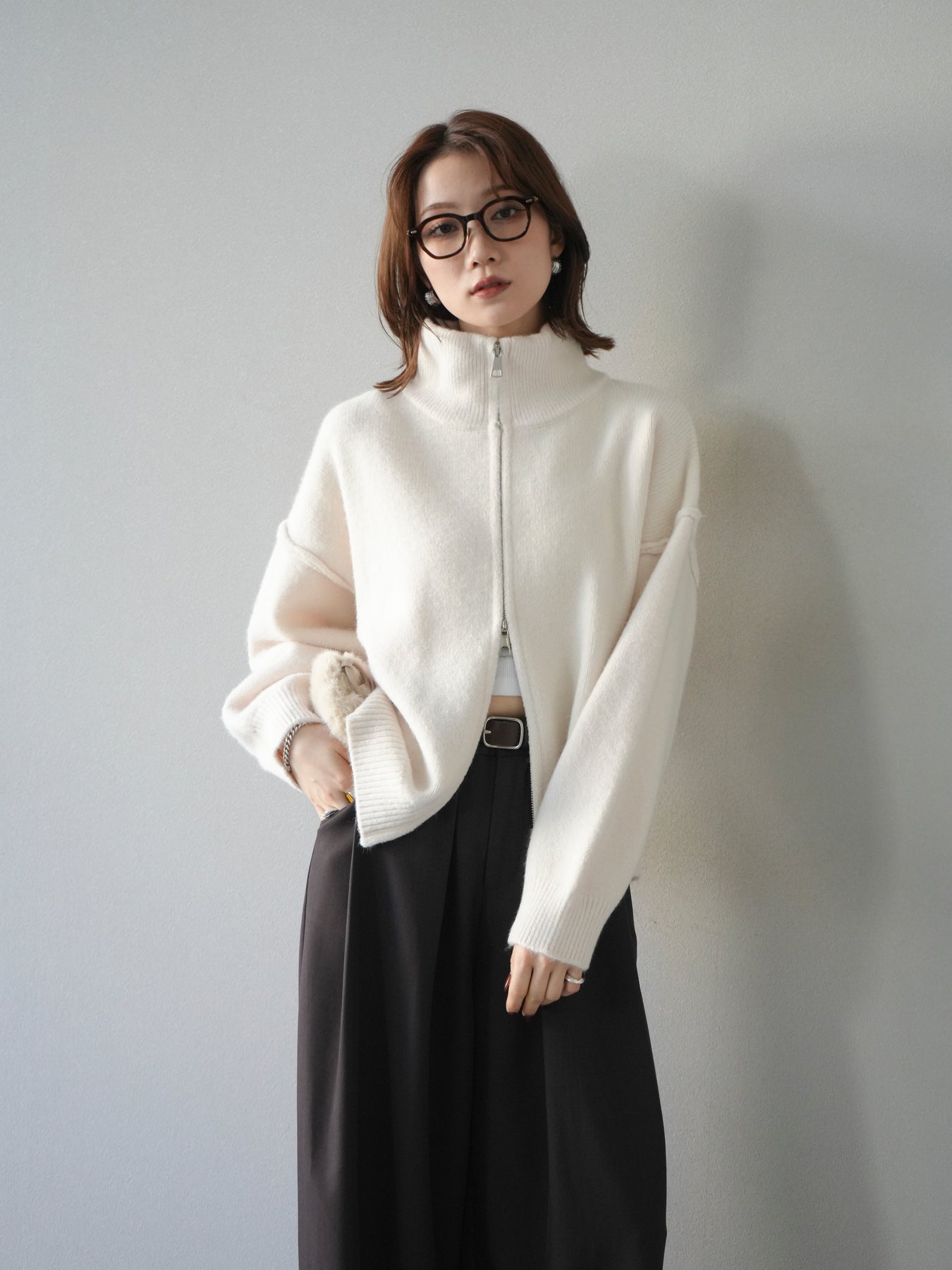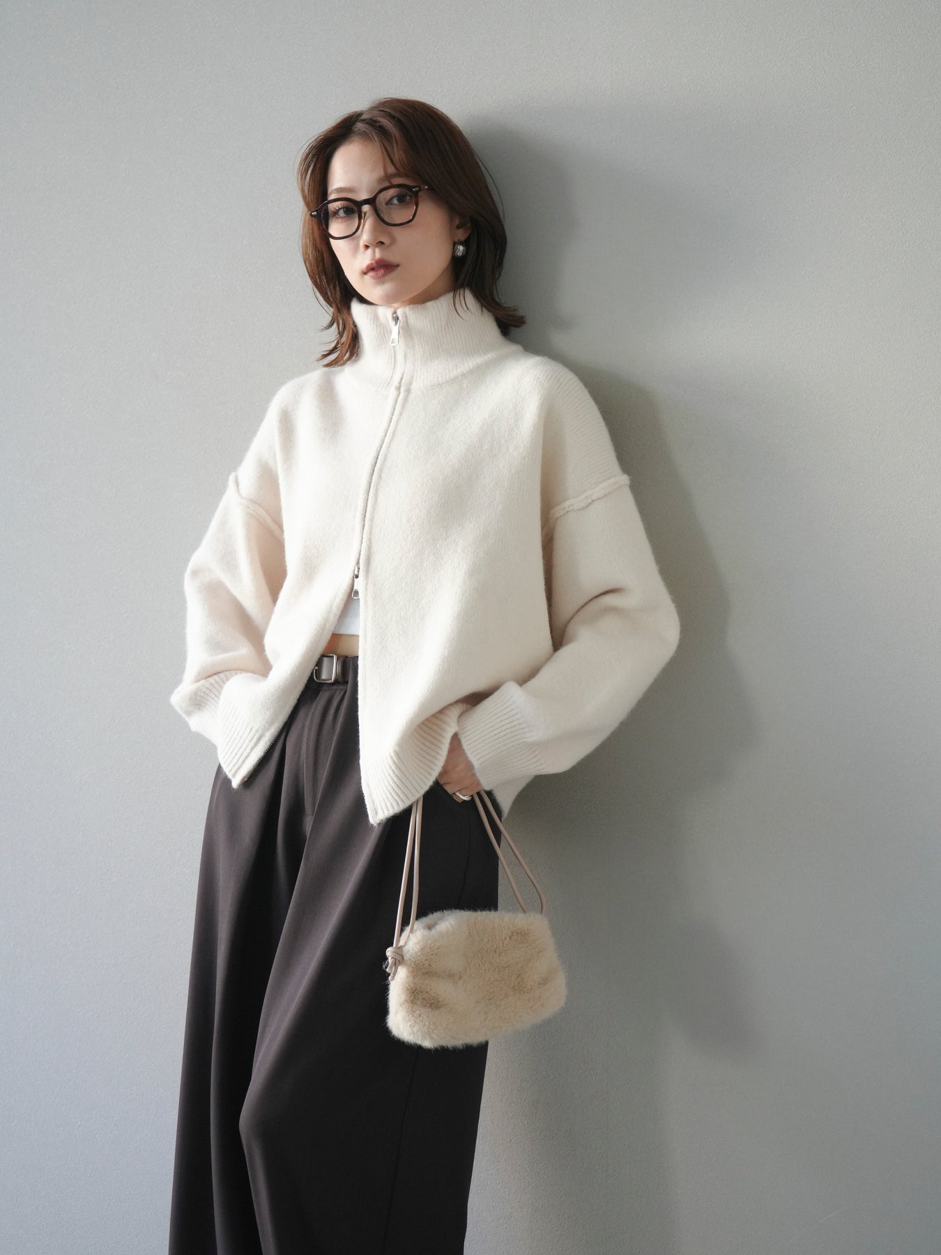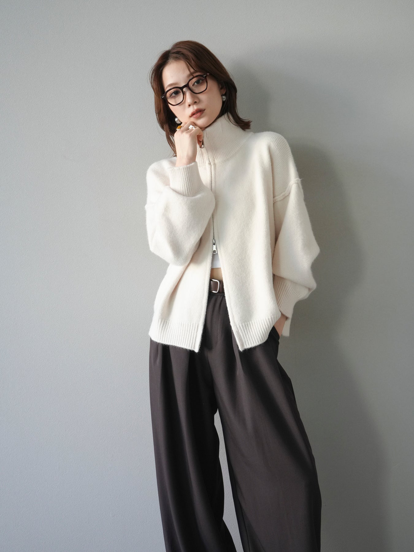 [予約]スタンドネックダブルZIPニットカーディガン/ivory