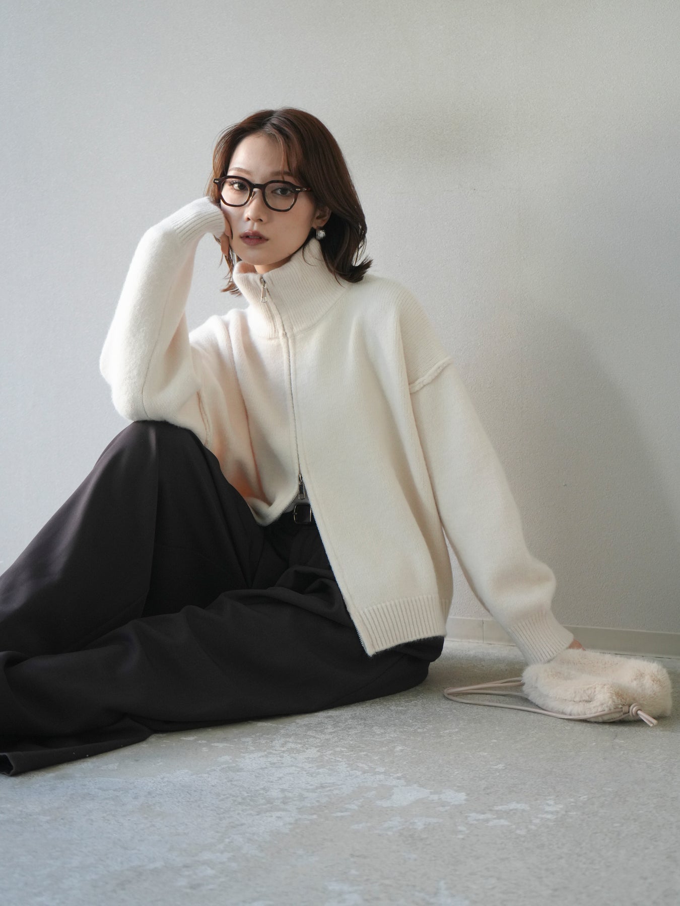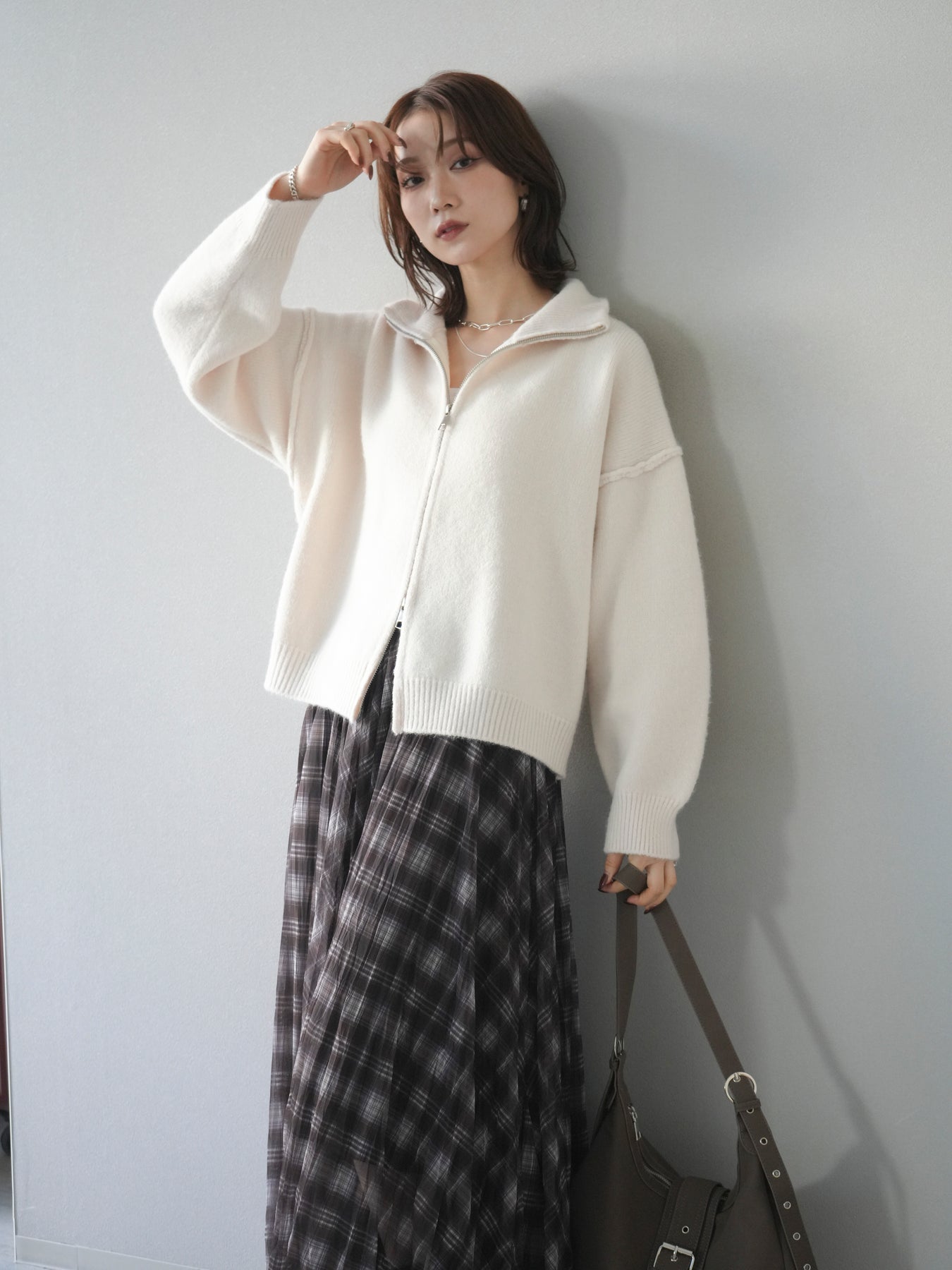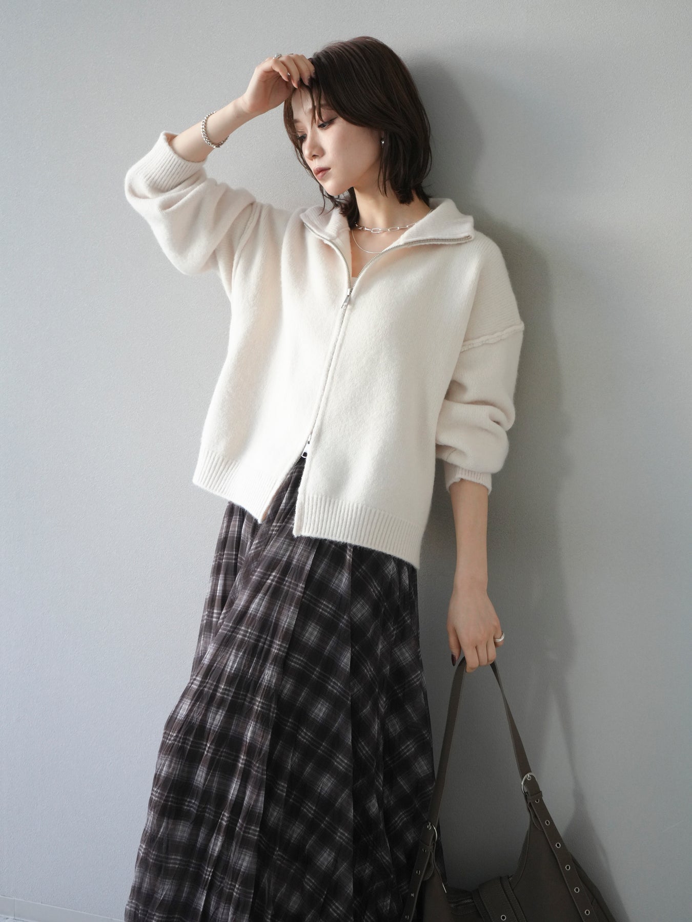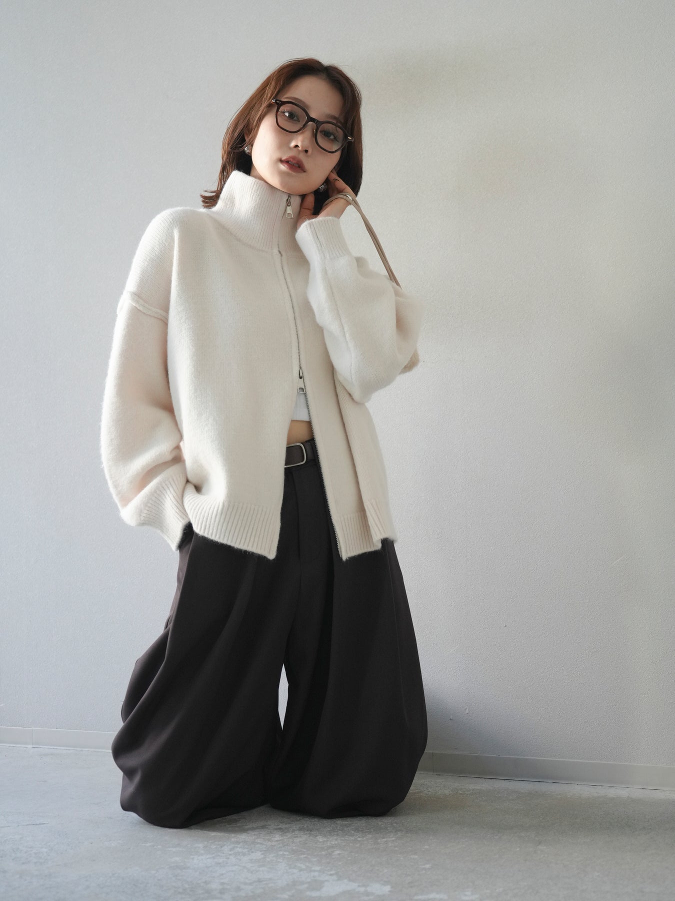 [予約]スタンドネックダブルZIPニットカーディガン/ivory