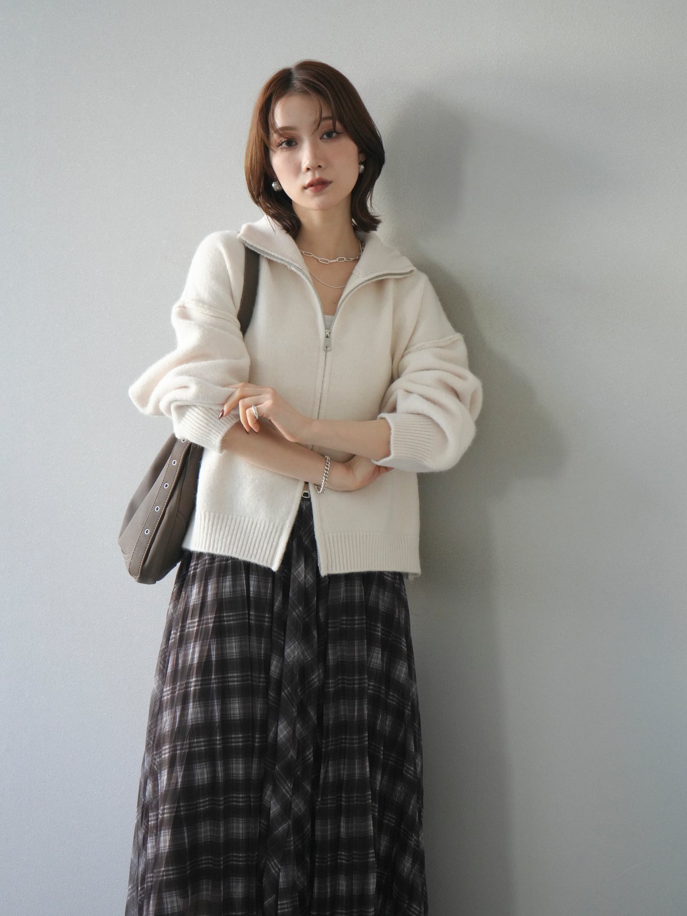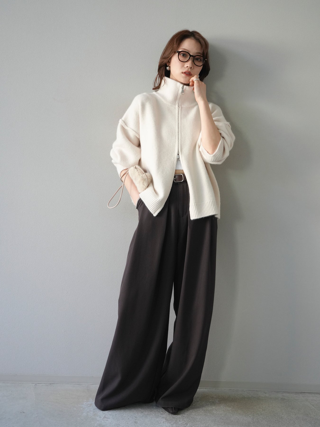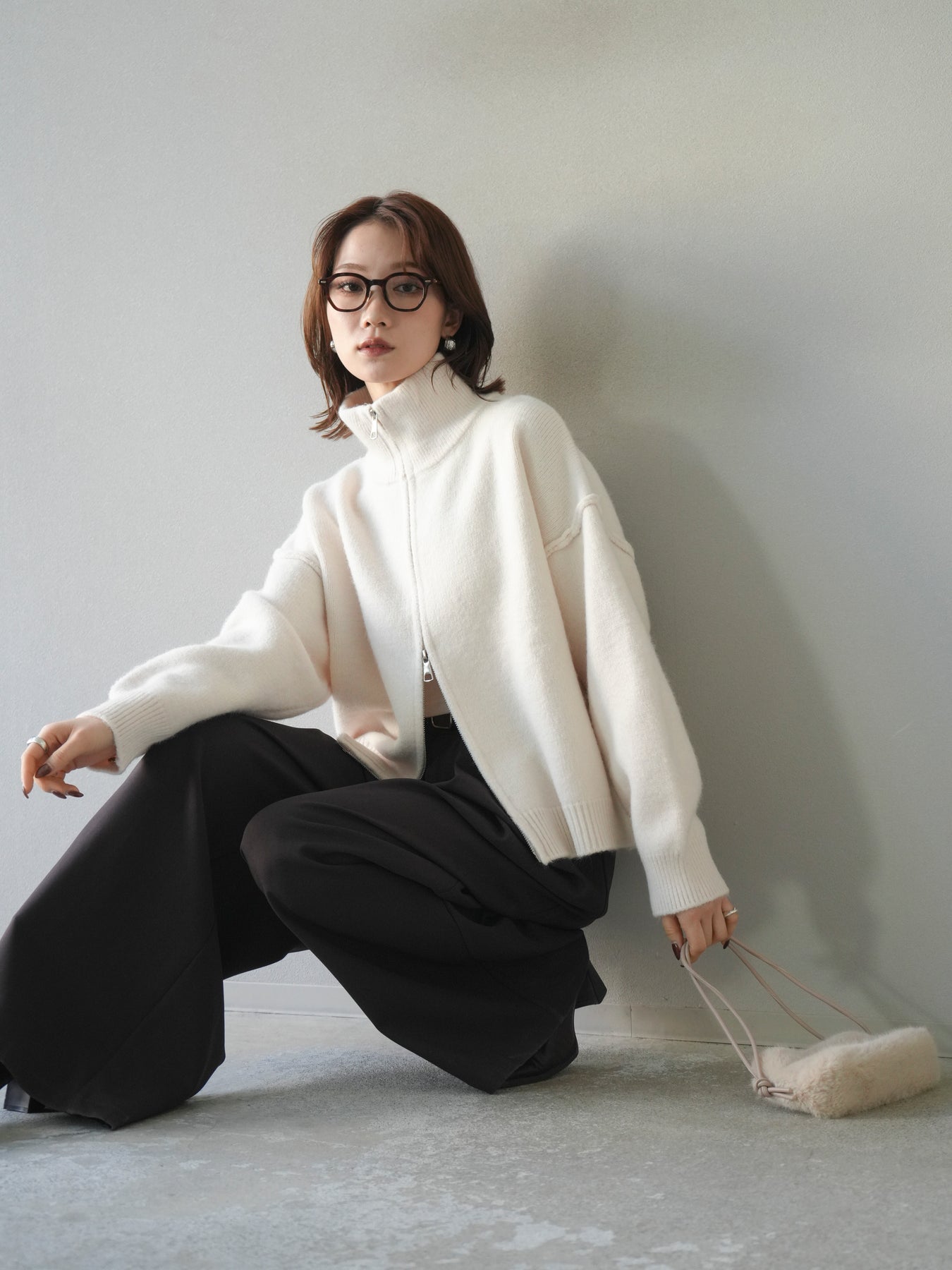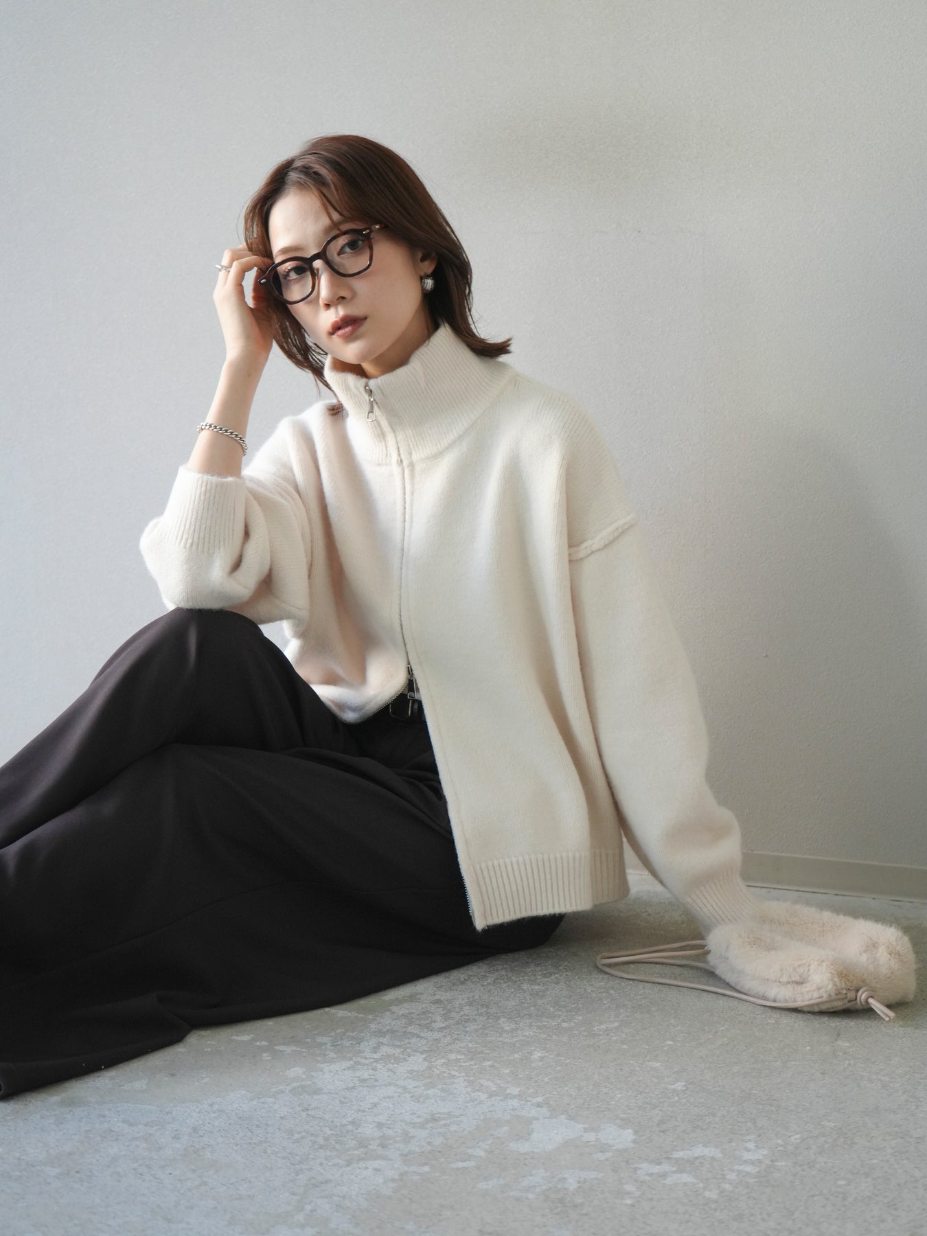 [予約]スタンドネックダブルZIPニットカーディガン/ivory