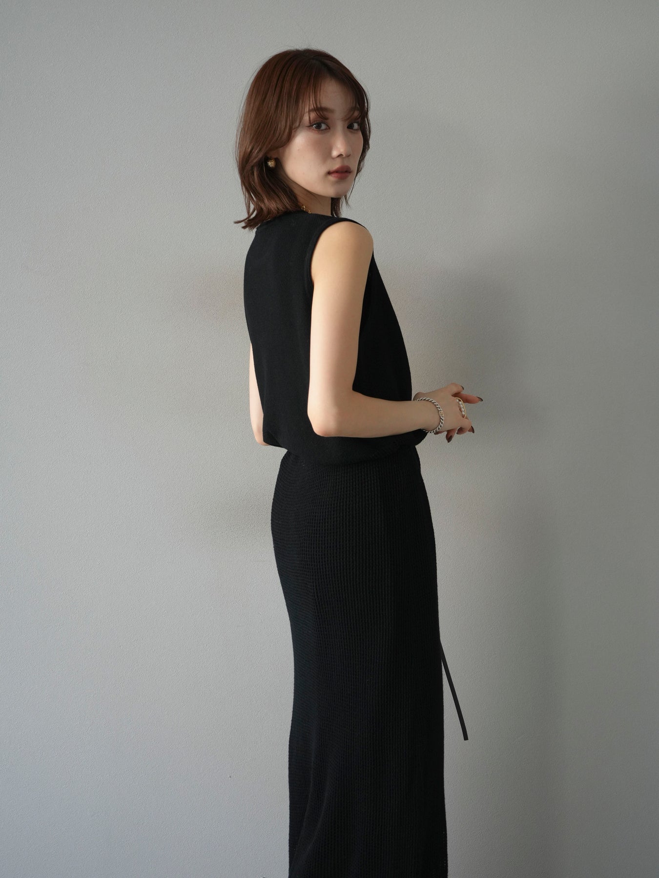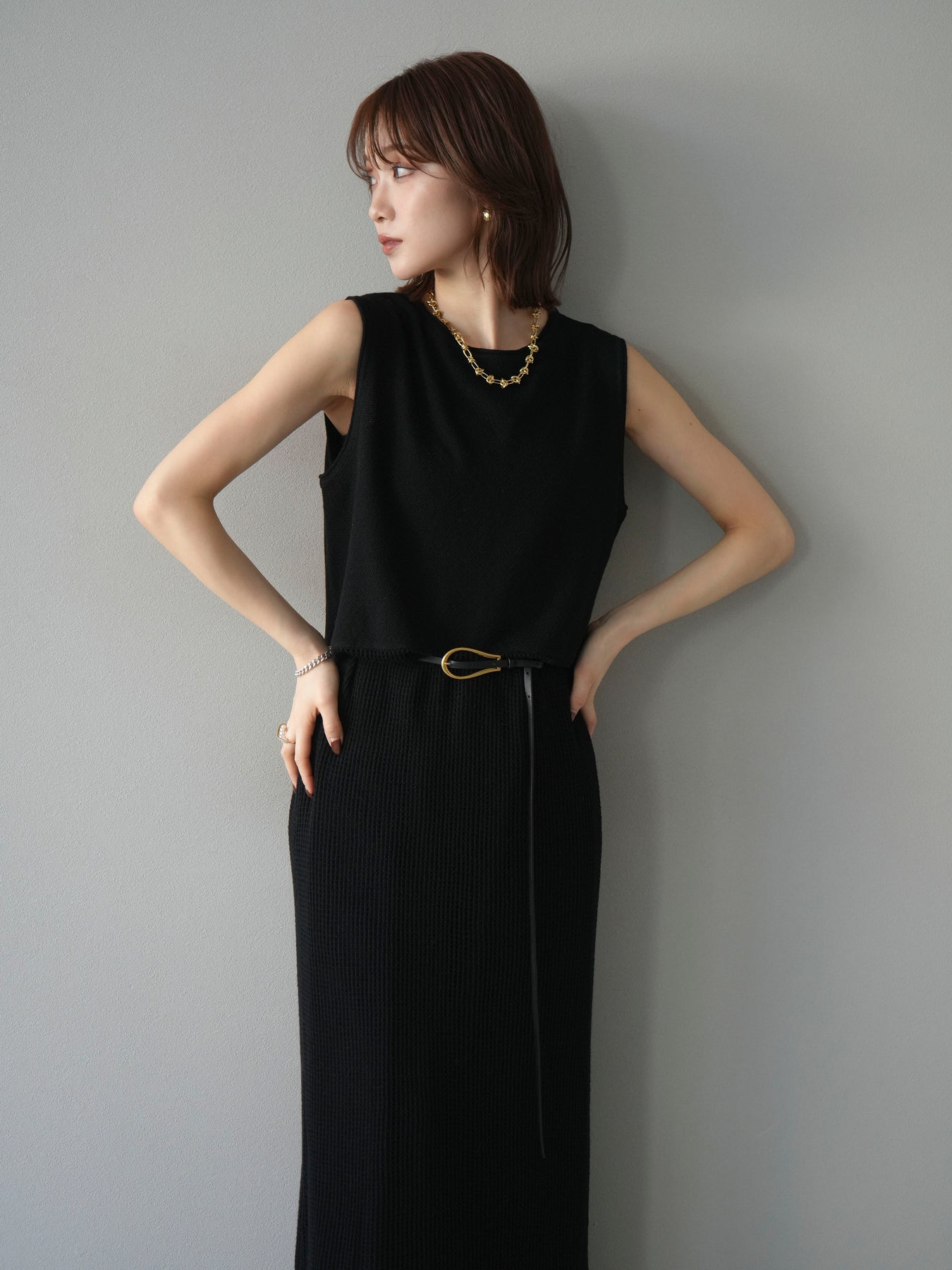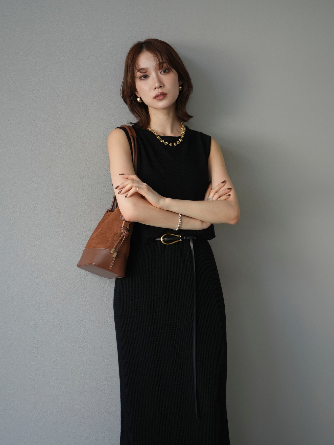 メッシュとニットの異素材コンビが特徴のノースリーブワンピース。さらっとした肌触りと落ち感のあるシルエットで、リラックス感がありながらもモードな印象に。ロング丈で一枚でも着映えし、合わせる小物で印象を変えて楽しめます。