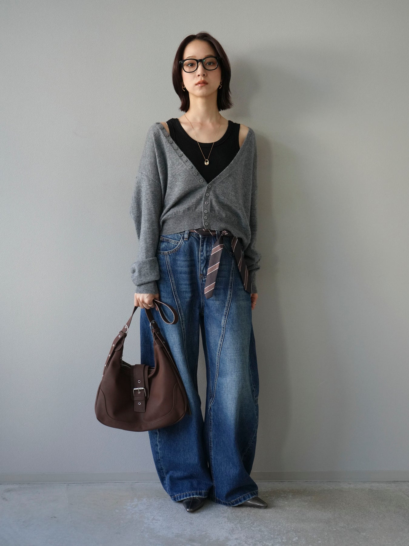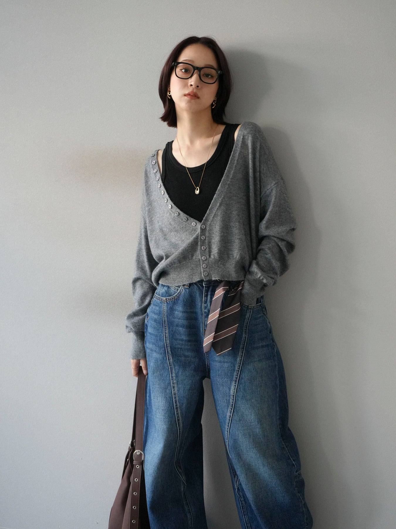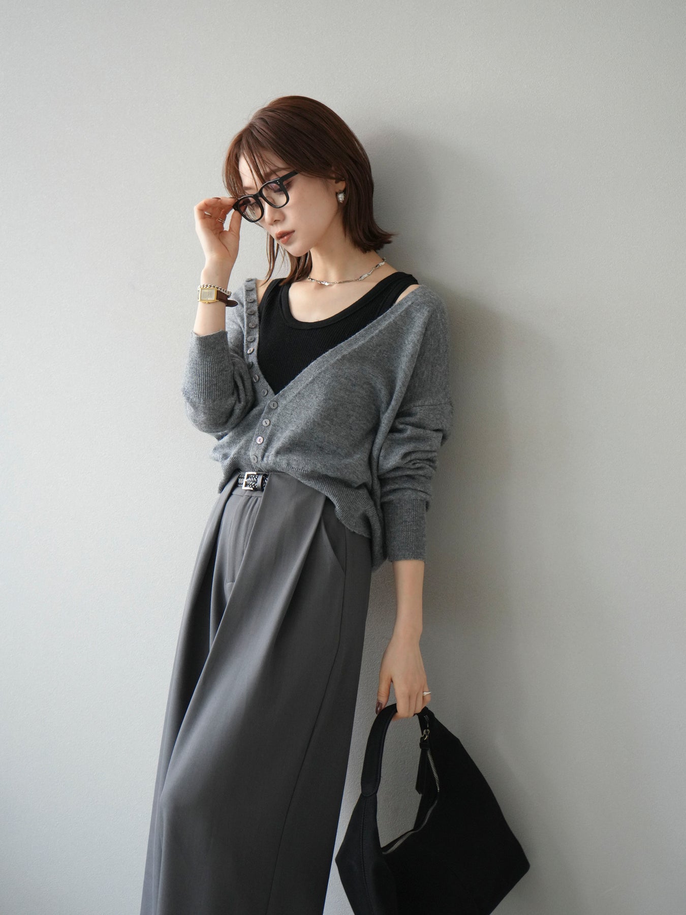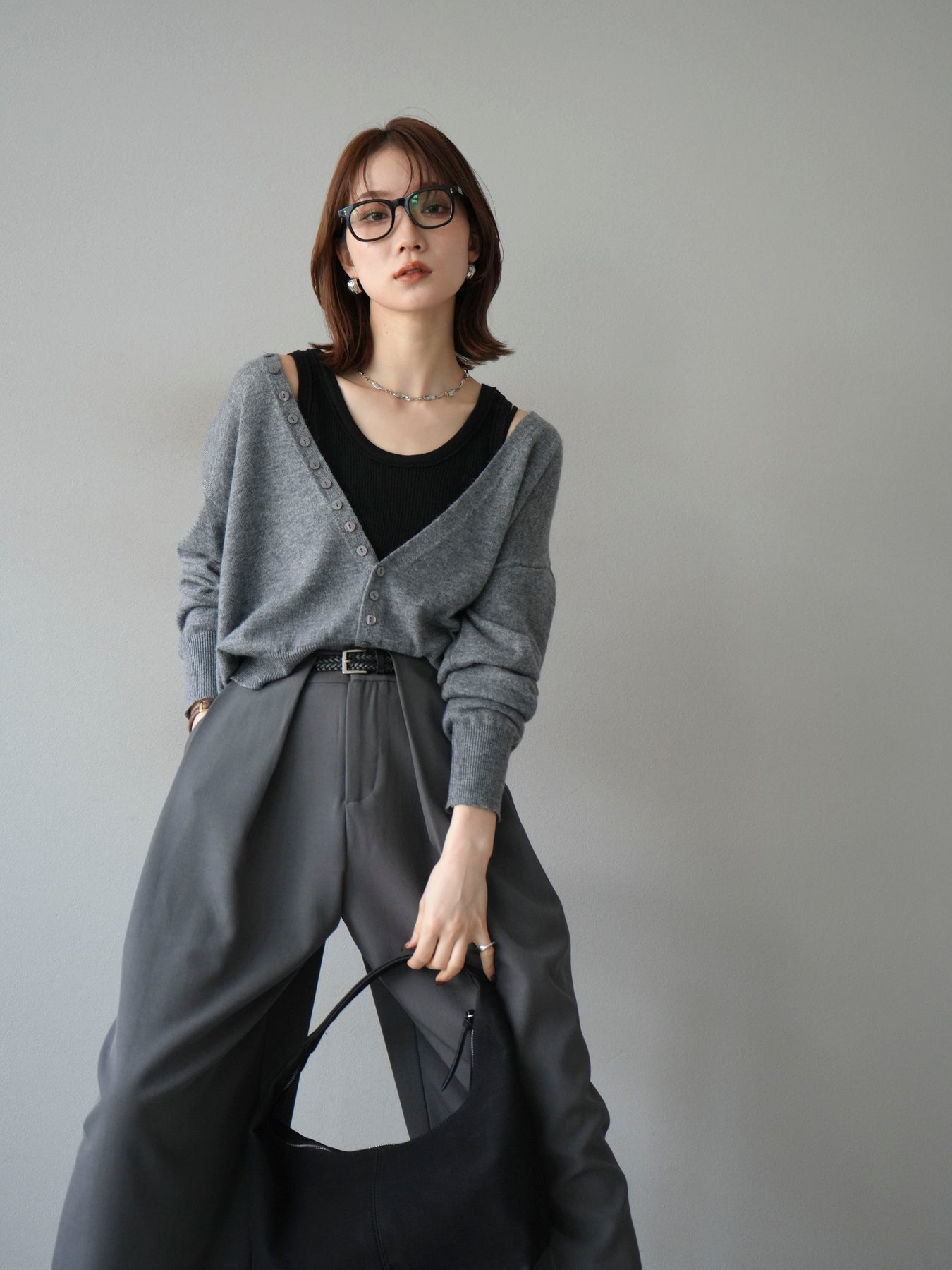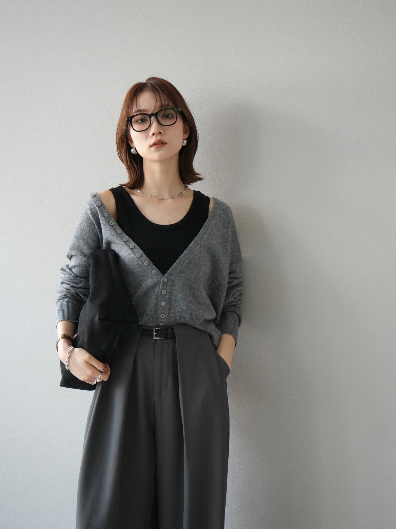 アシンメトリーに並んだボタンデザインが印象的なニットカーディガンと、リブタンクトップのセットアイテム。程よくゆとりのあるカーディガンは、デコルテラインを美しく見せる深めのVネック仕様。タンクトップとレイヤードすることで抜け感のあるスタイリングが完成します。それぞれ単体でも着回しができ、季節を問わず活躍。デニムやスカートなど、幅広いアイテムと相性の良い万能セットです。 ※ボトムス、キャミソール(インナー)以外の商品は一律でインナーは付属していません。