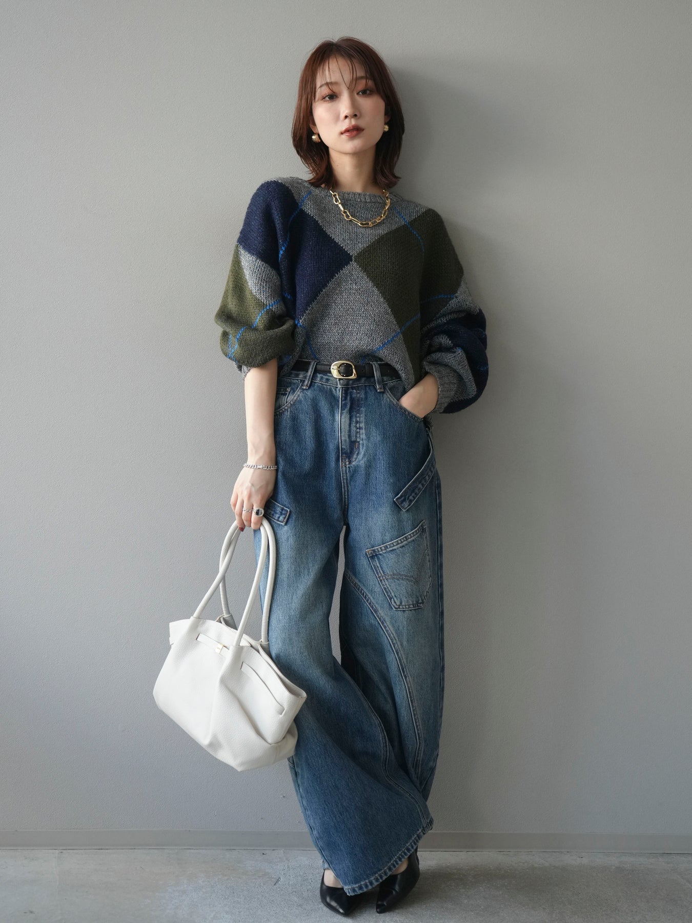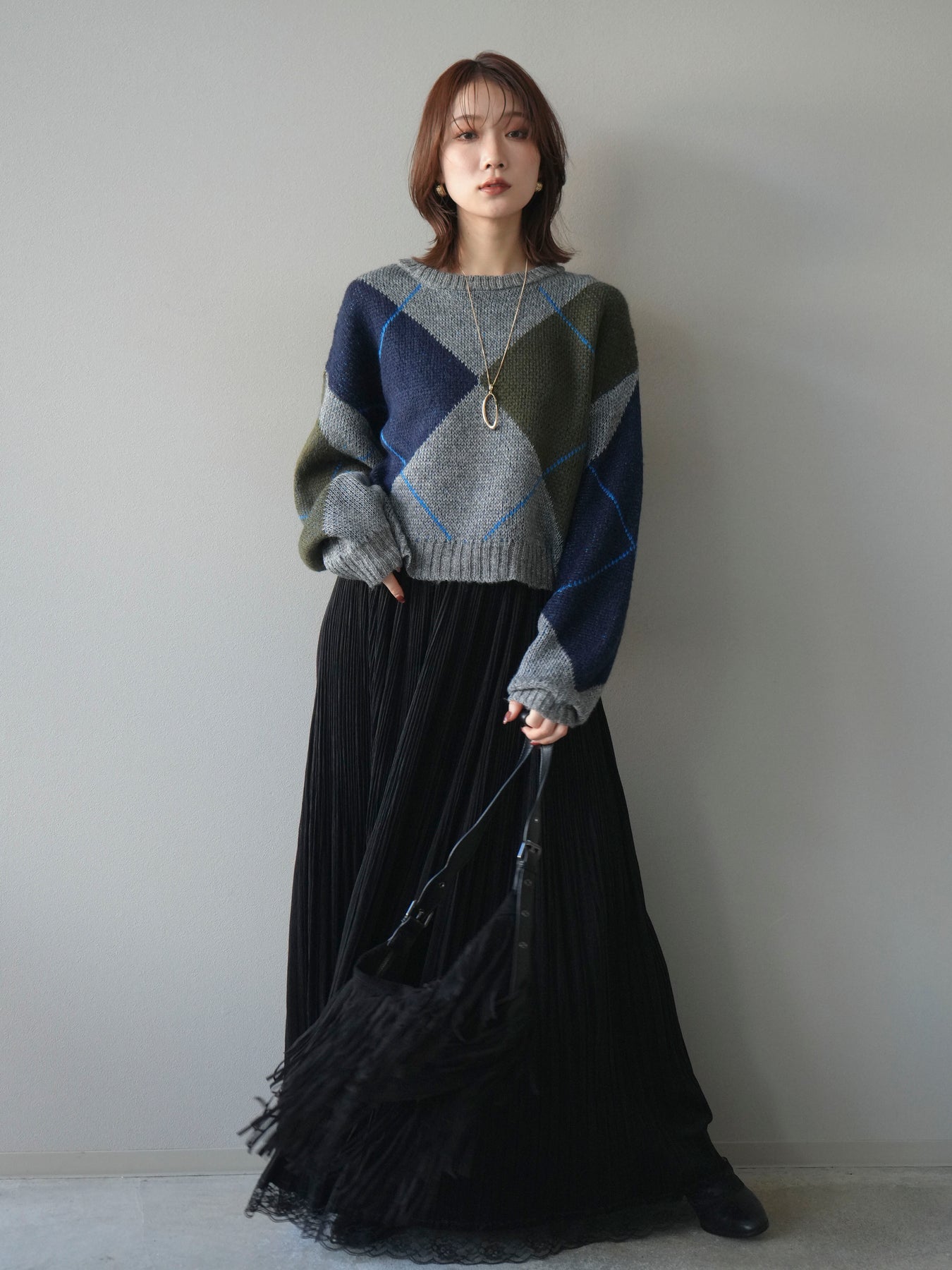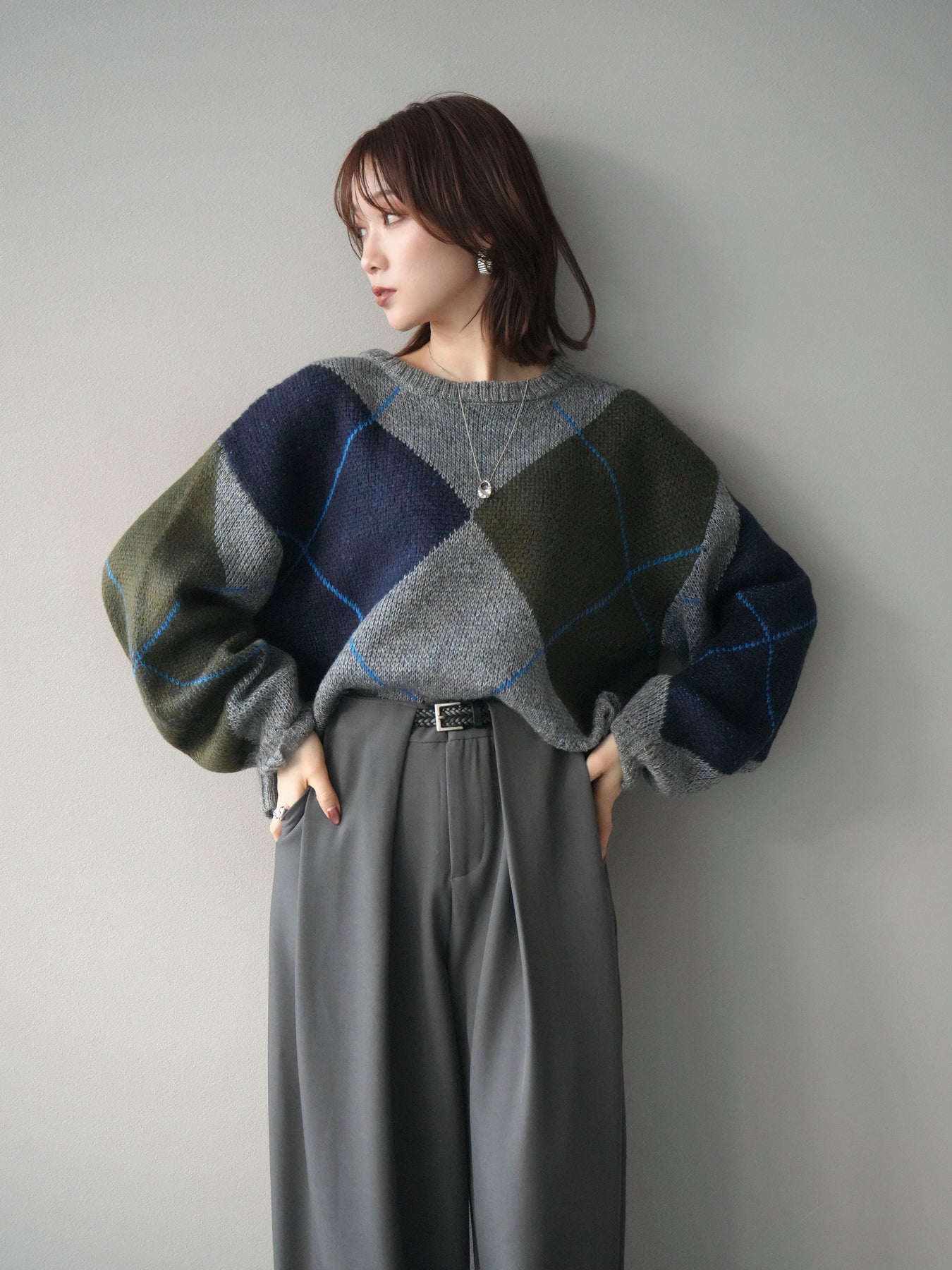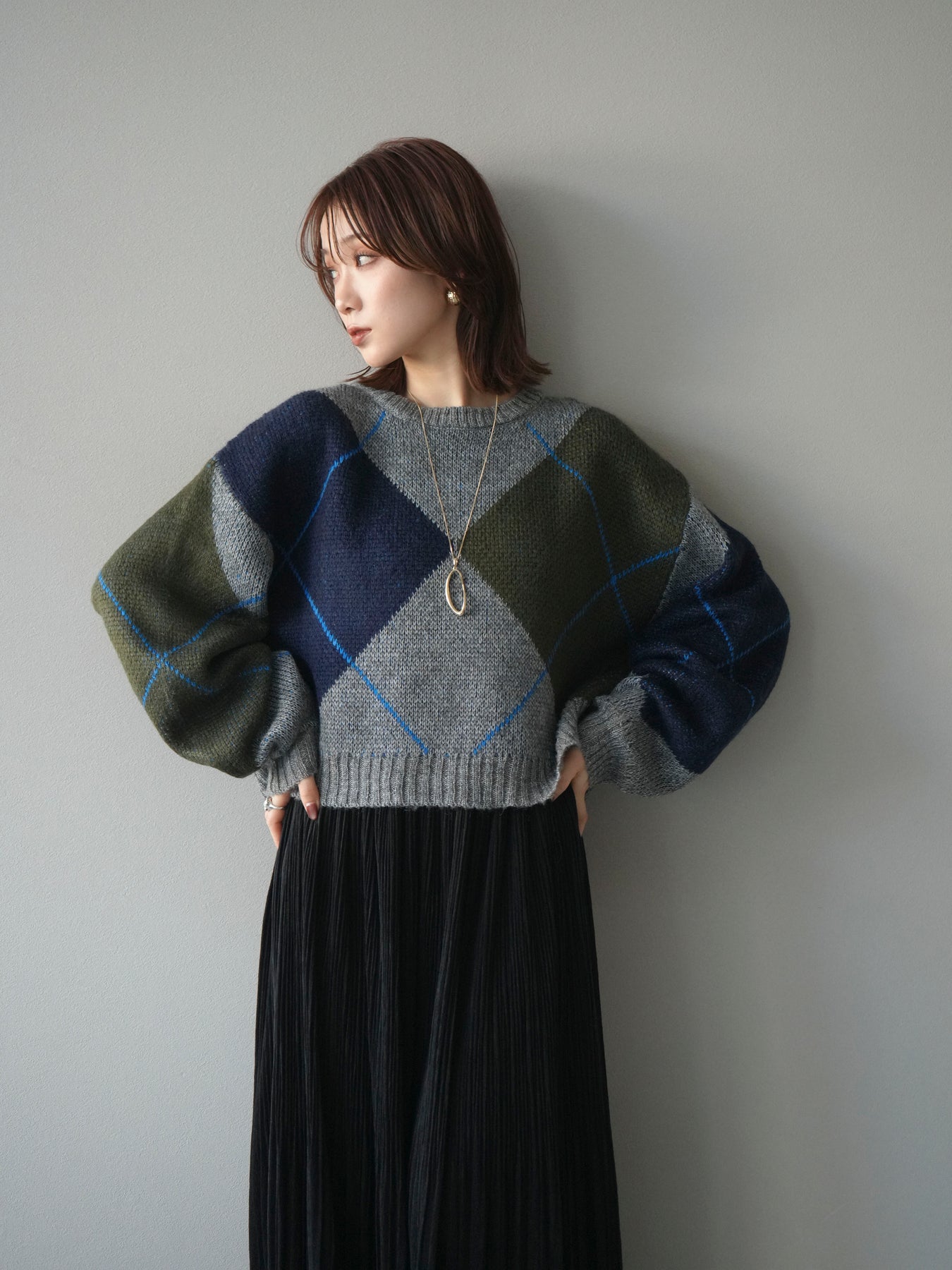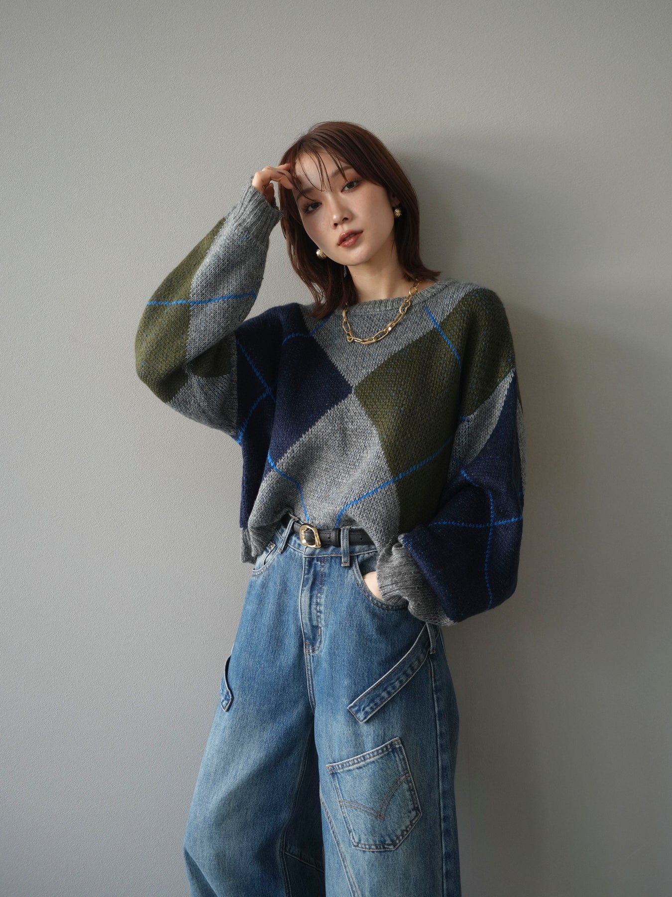 大きめのアーガイル柄とステッチ風のラインが印象的なニットプルオーバー。 異なる配色の組み合わせが目を惹き、1枚で存在感のあるスタイリングを叶えます。 ゆったりとしたシルエットで抜け感があり、リラックスした着心地ながらもこなれた印象に。 程よい丈感でスカートにもパンツにも合わせやすく、デイリー使いにぴったりです。 秋冬のコーディネートに遊び心を添える主役級の一枚です。 ※ボトムス、キャミソール(インナー)以外の商品は一律でインナーは付属していません。