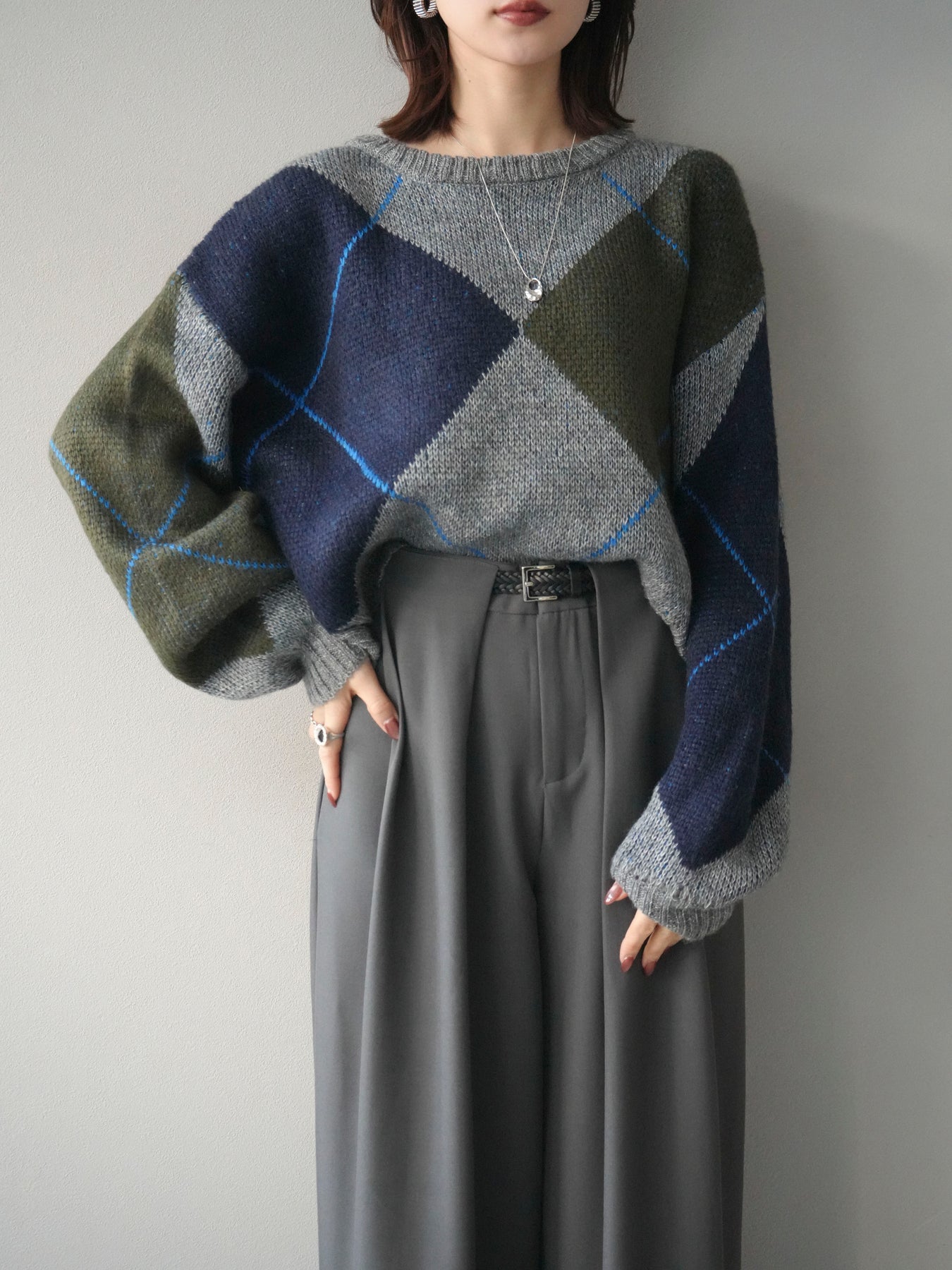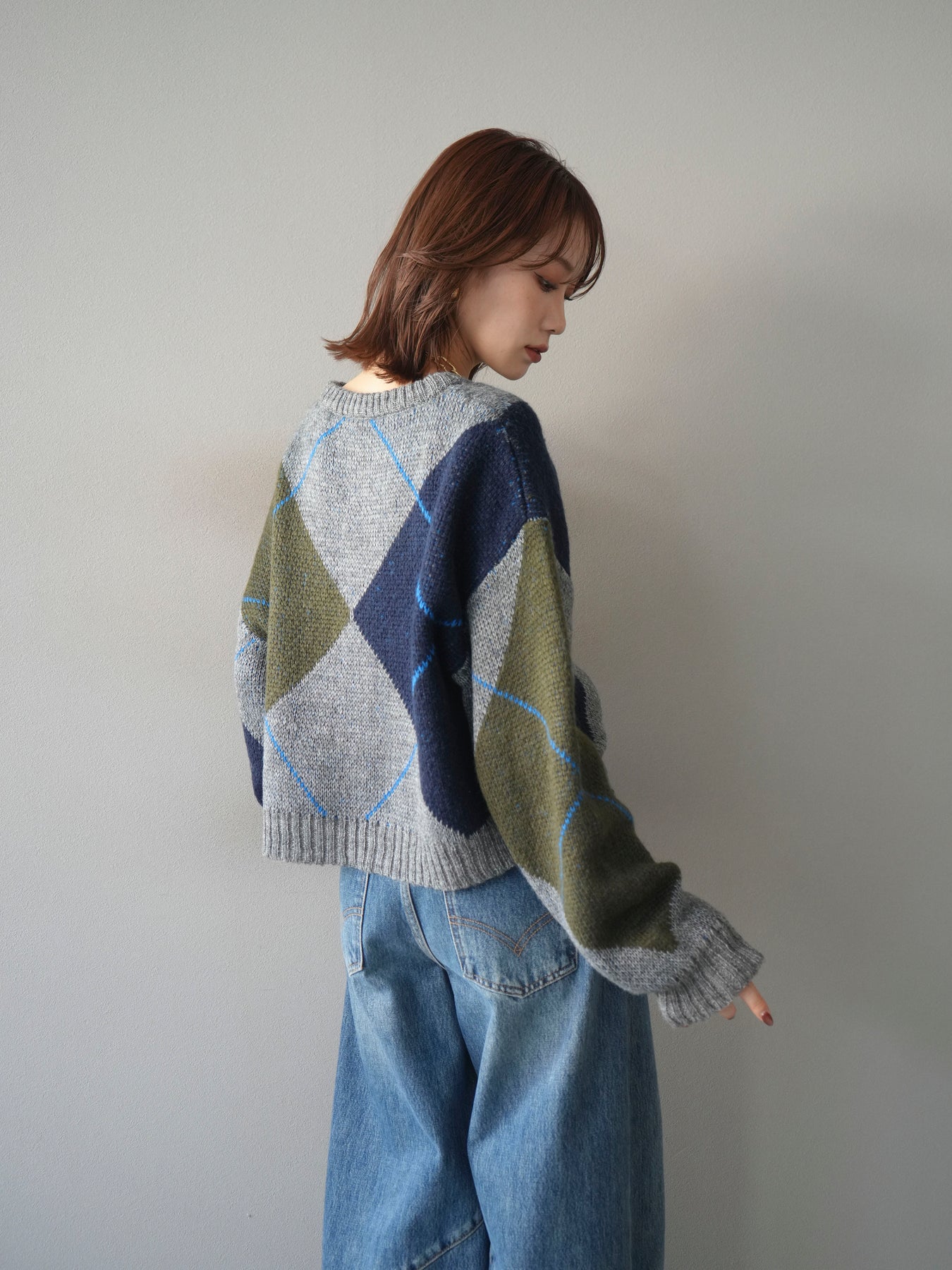 [予約]配色ステッチアーガイル柄ニットプルオーバー/gray