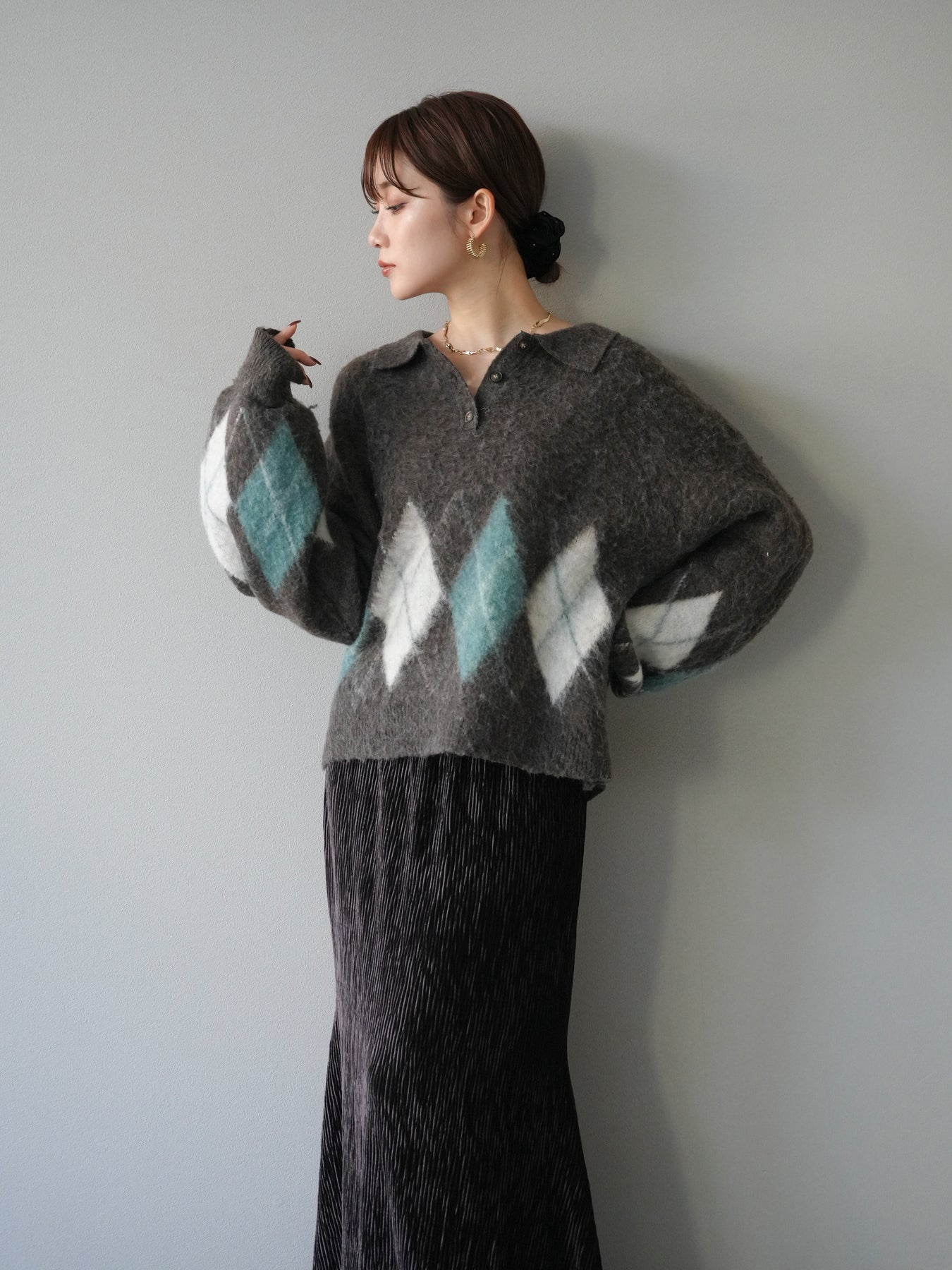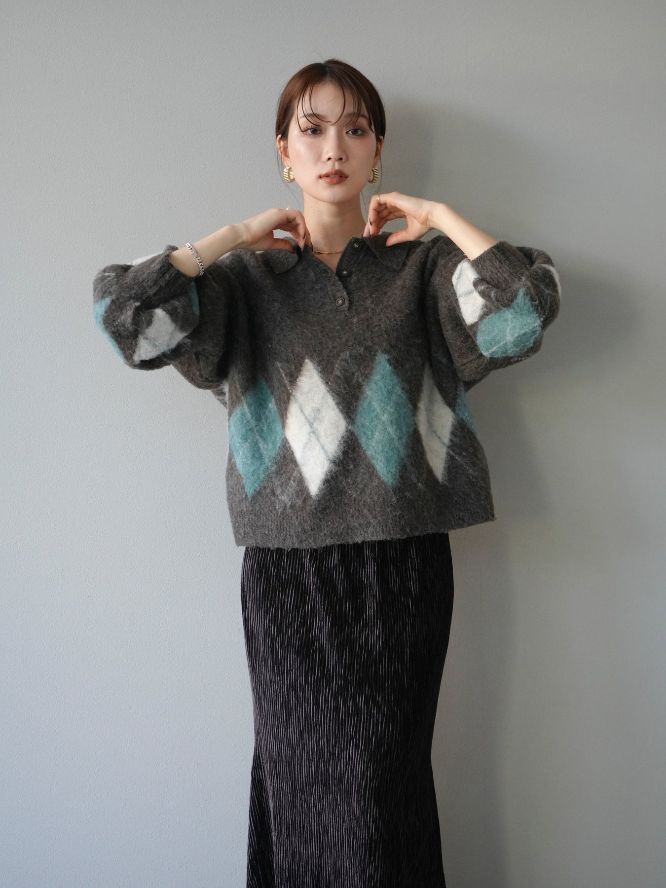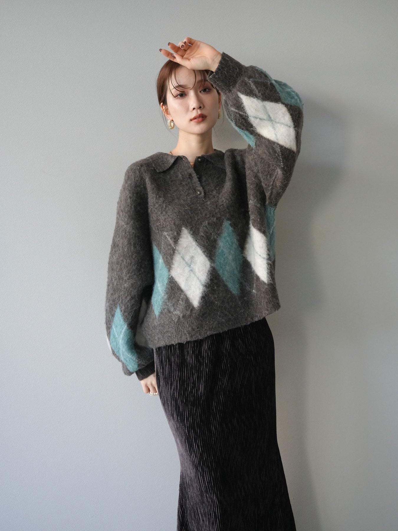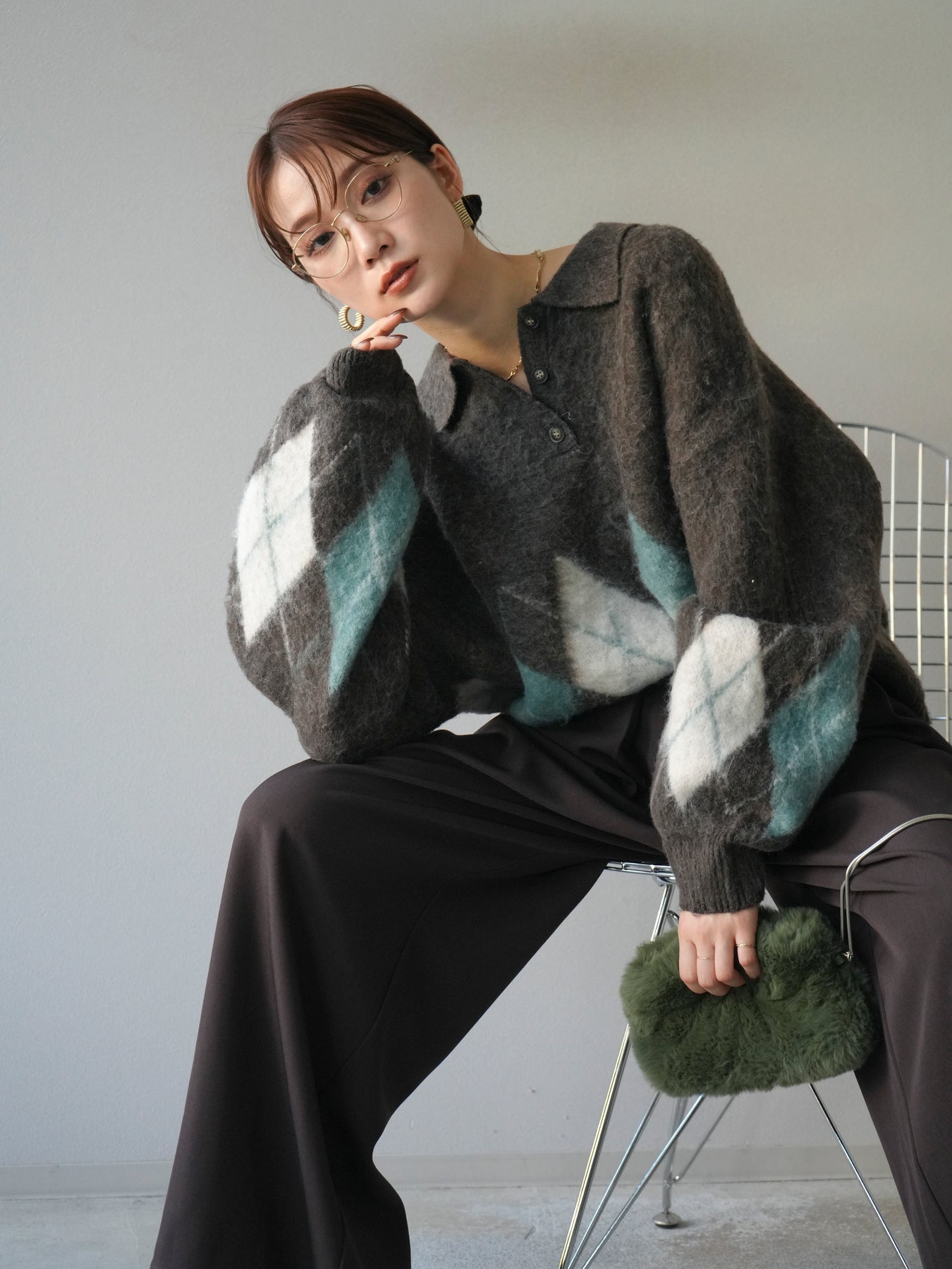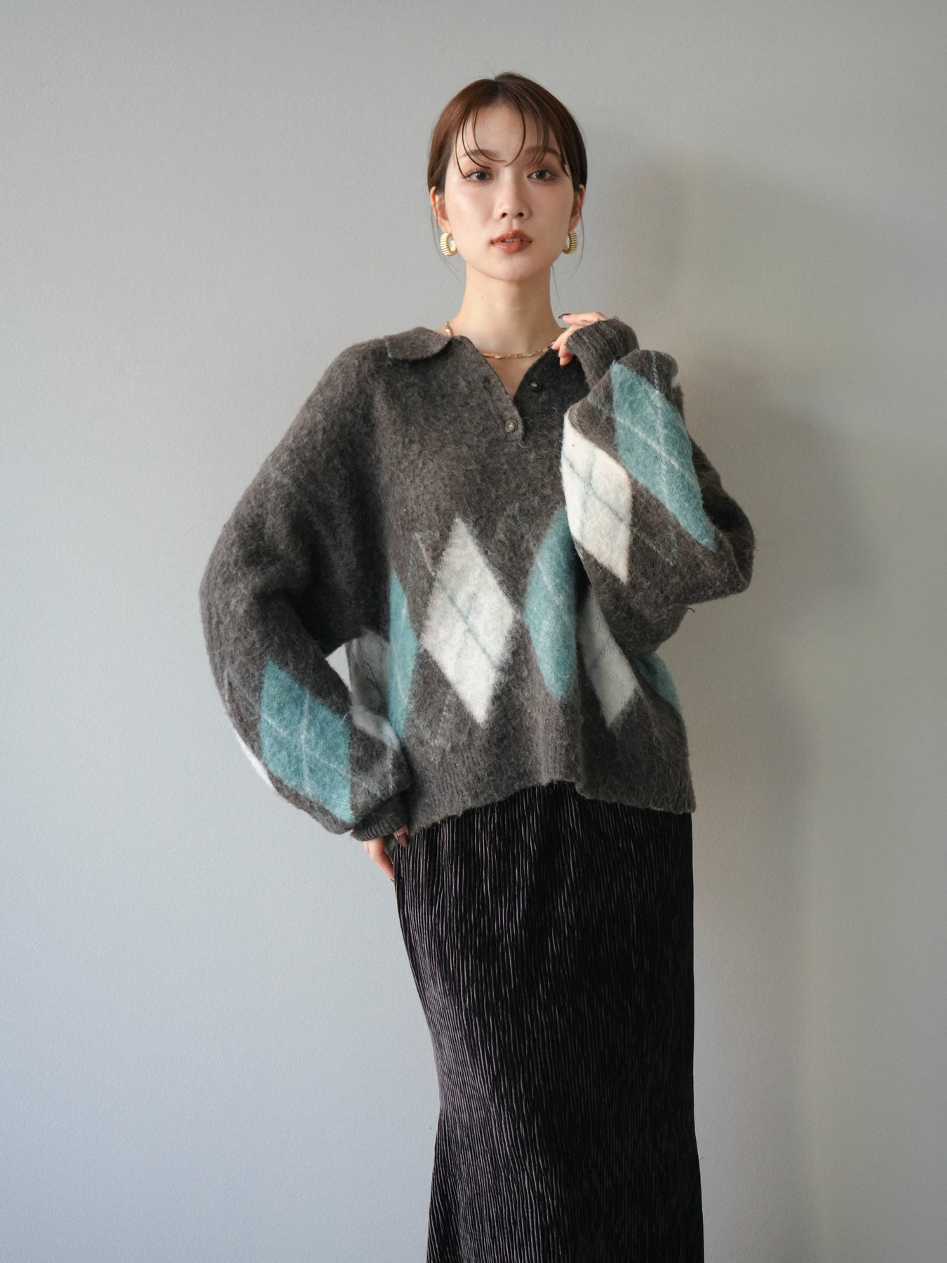 [予約]アーガイル柄ルーズポロニットプルオーバー/brown