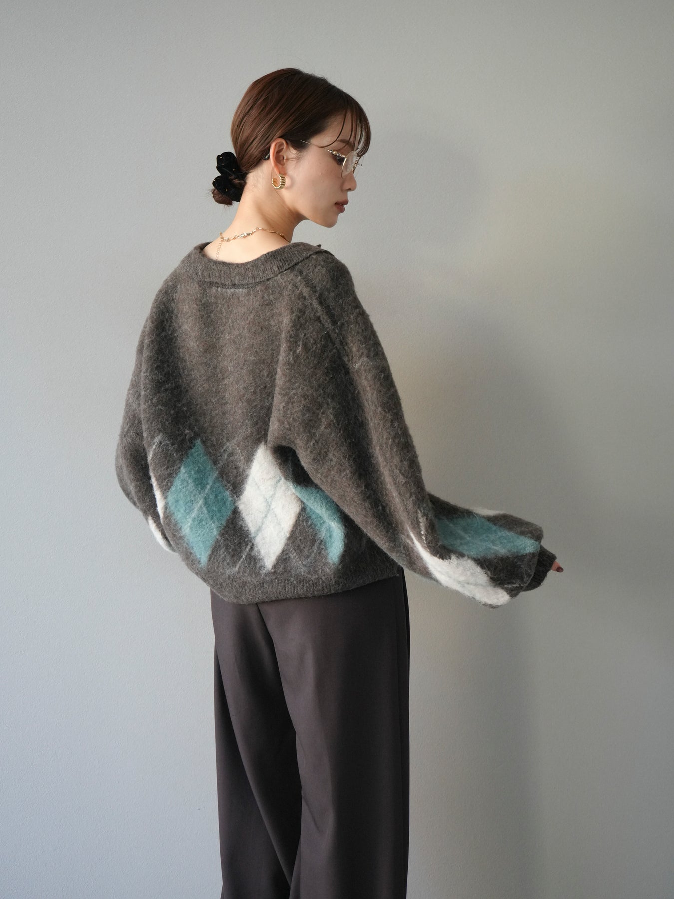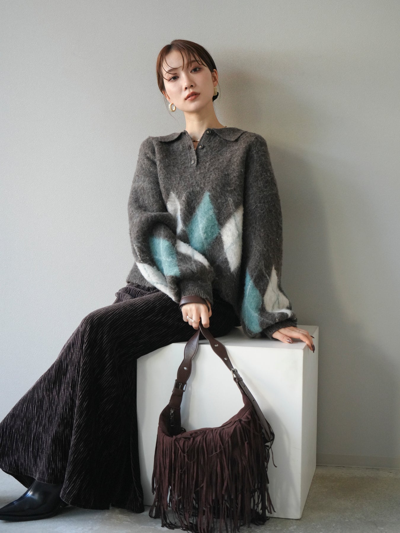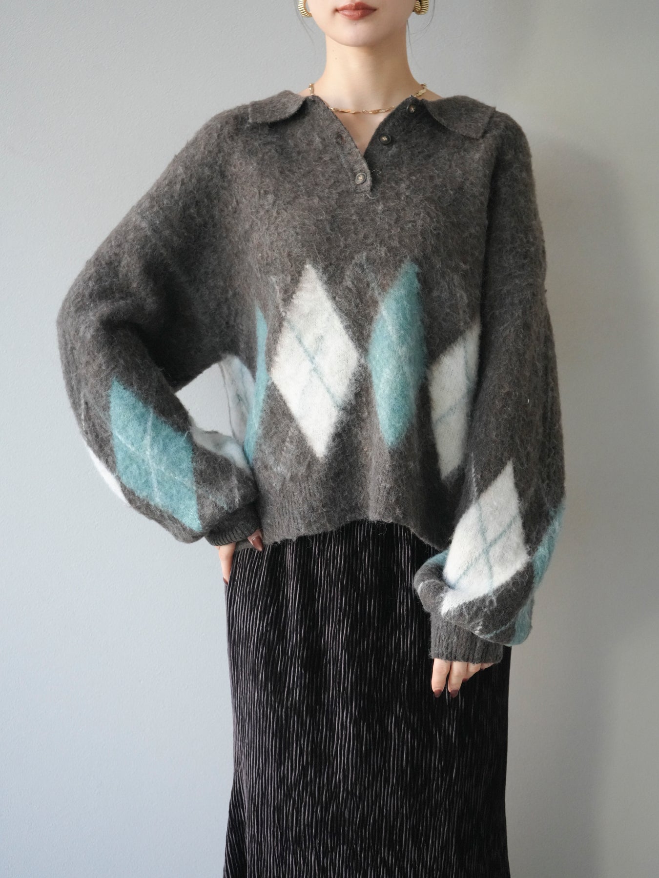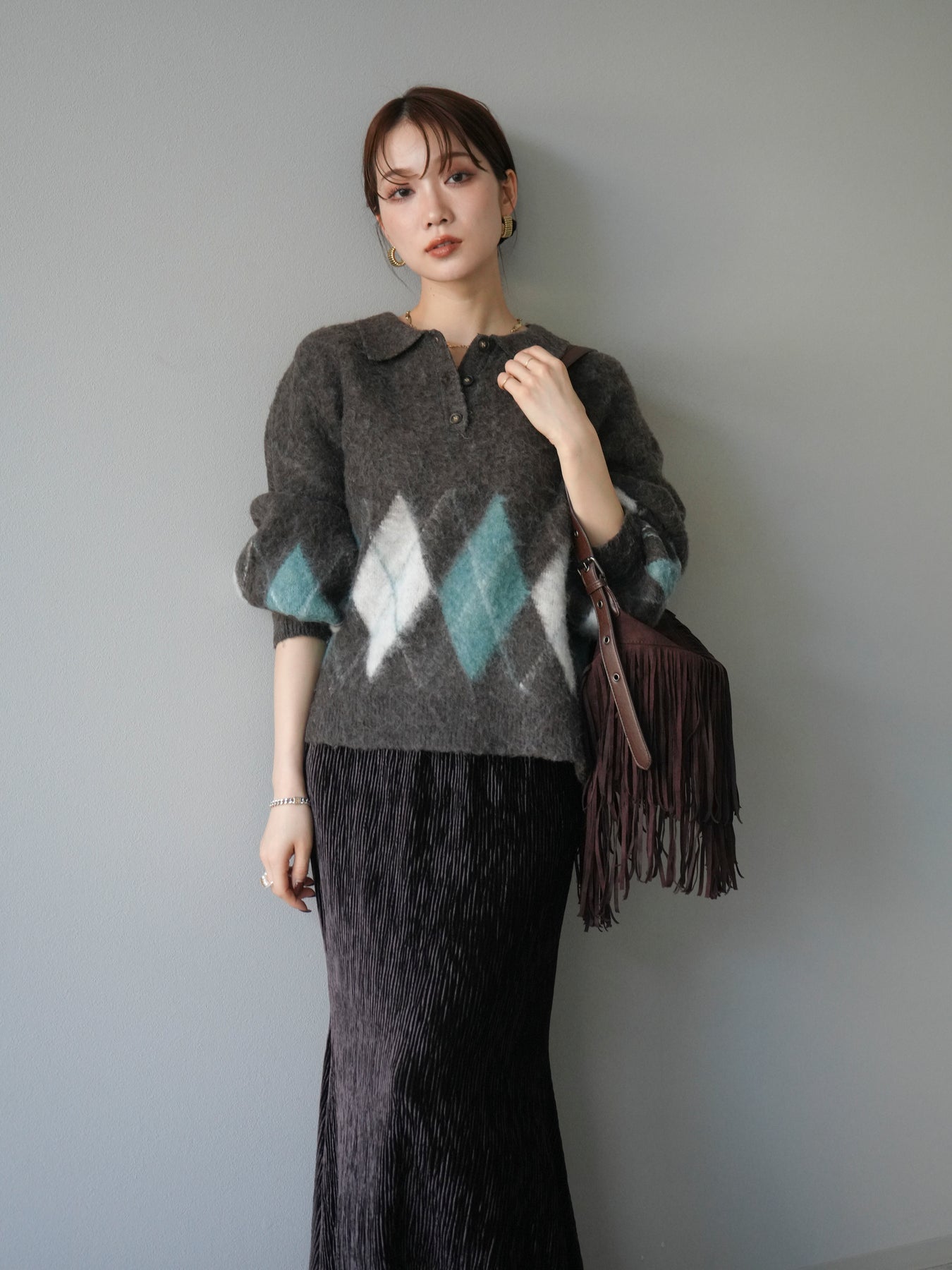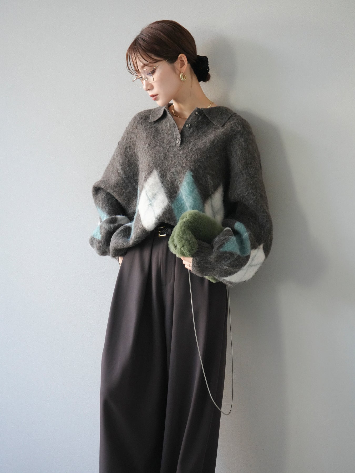 [予約]アーガイル柄ルーズポロニットプルオーバー/brown