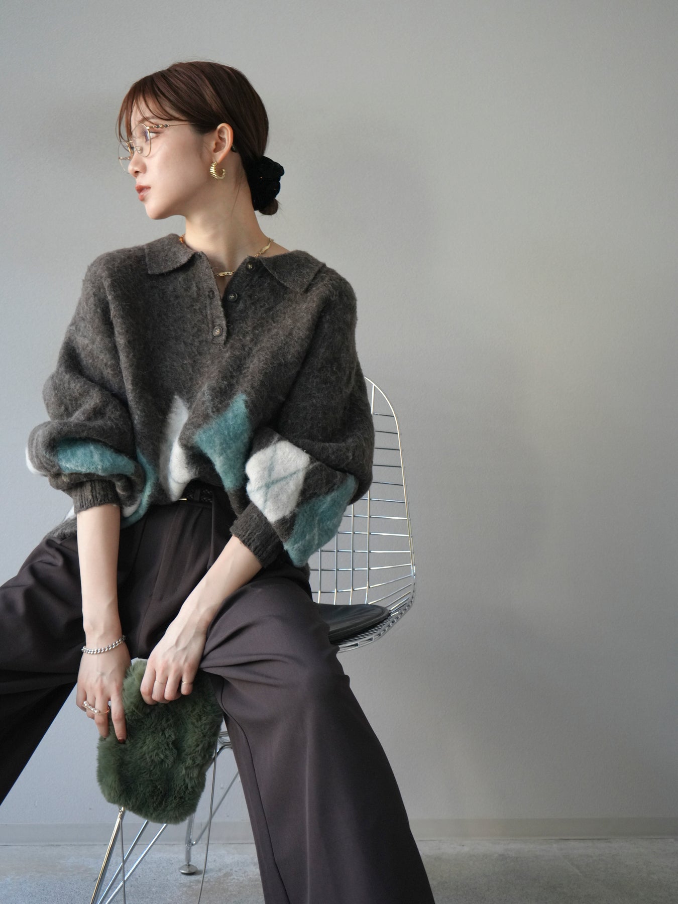 ふんわりとした起毛感が魅力のアーガイルニット。大きめのチェック柄とゆったりシルエットで、リラクシーながらも程よい存在感を演出。ポロカラーと前立てのボタンがアクセントになり、カジュアルながらもきちんと感をプラス。ボトムを選ばず、デニムにもスカートにも好相性な一枚です。