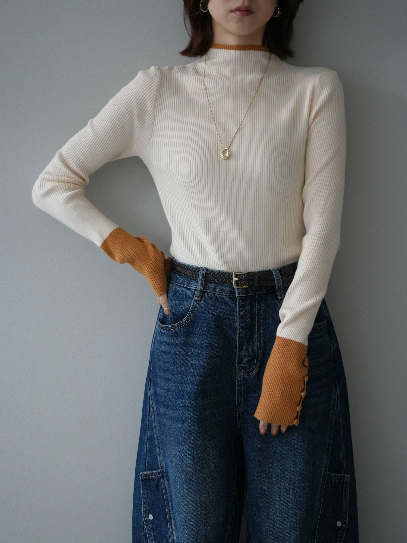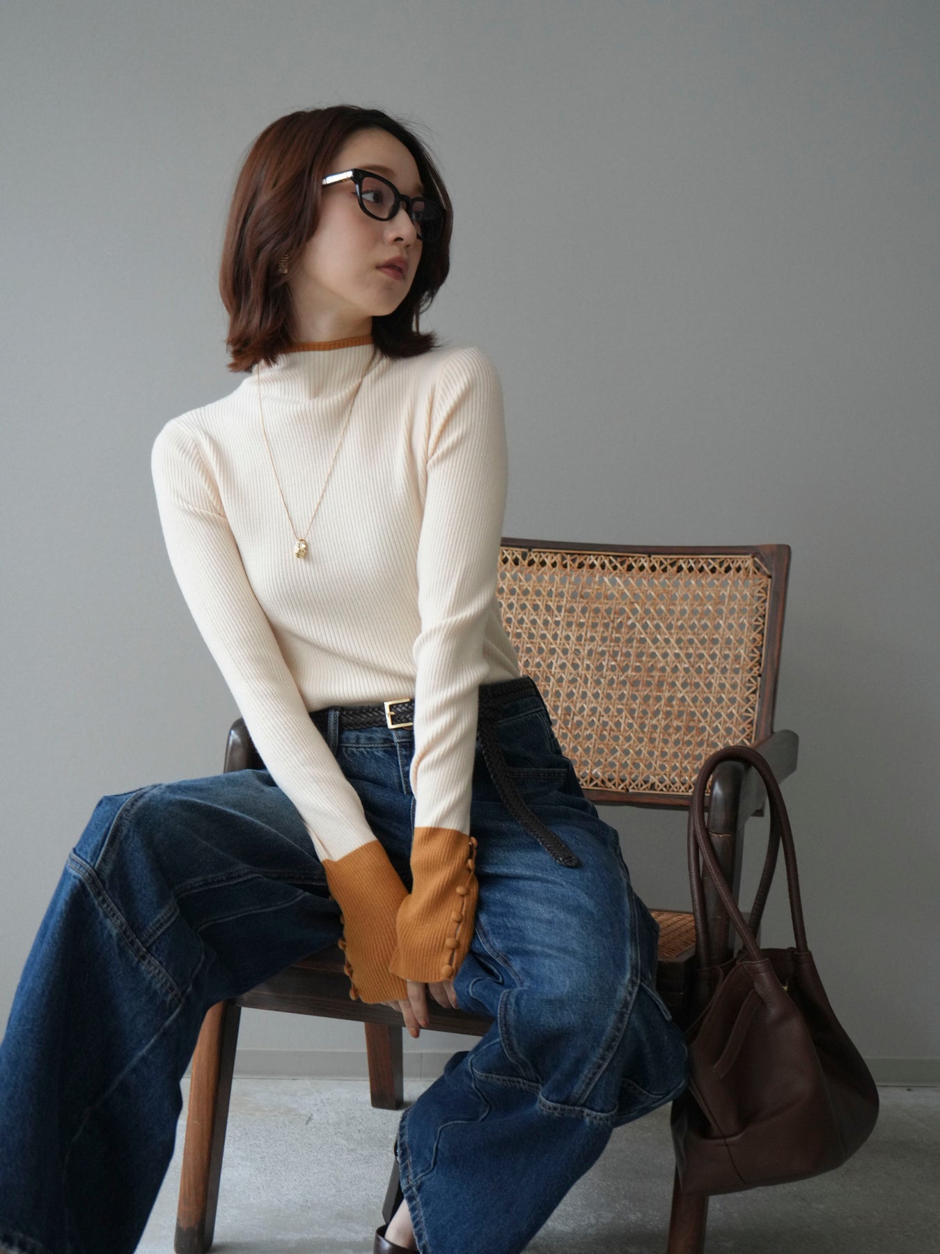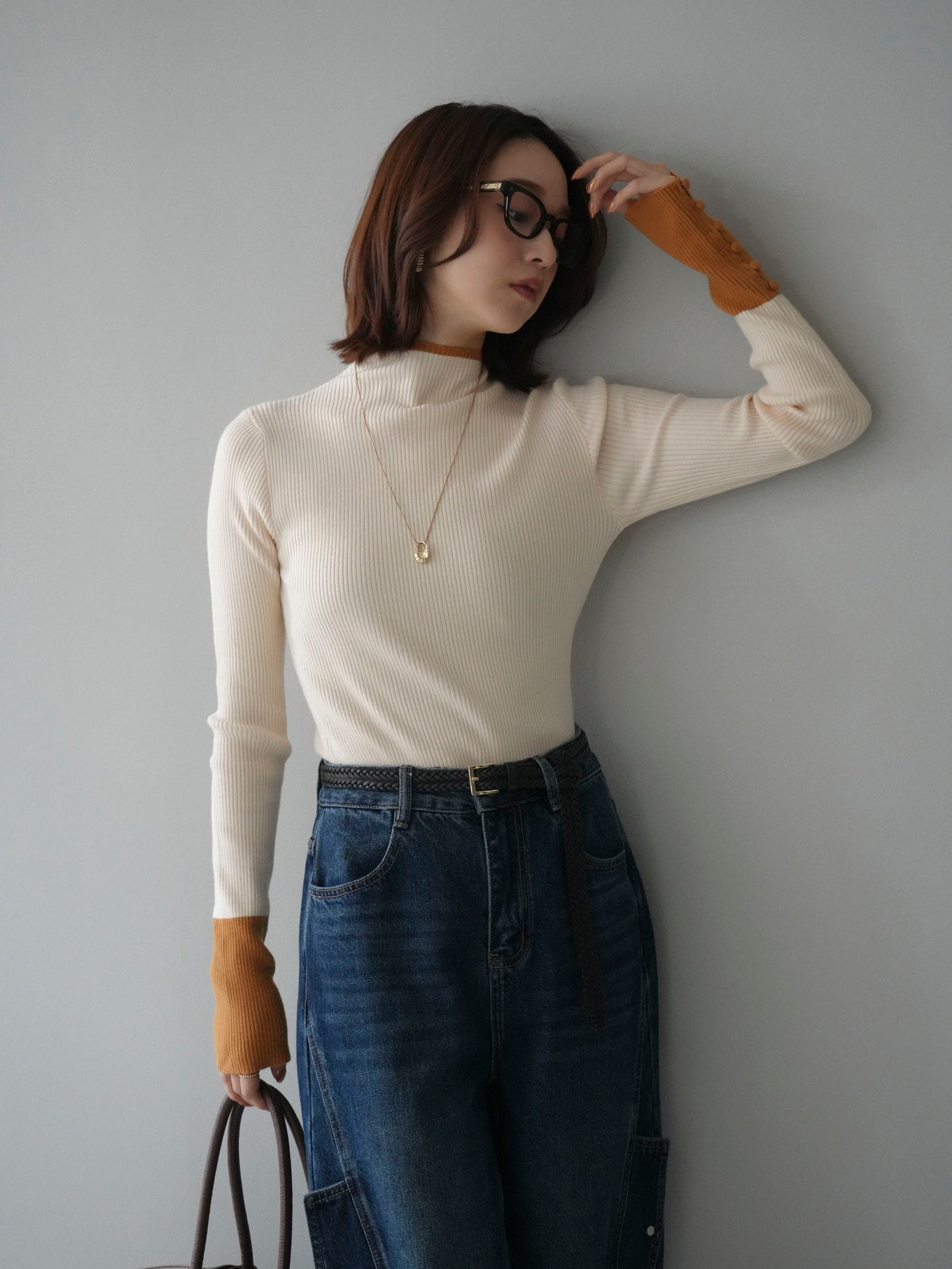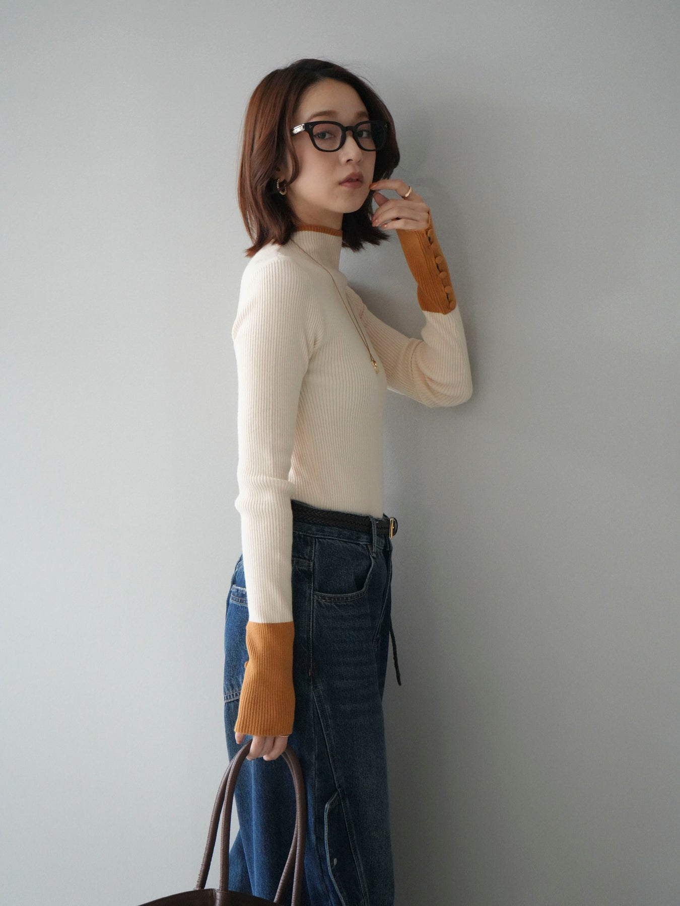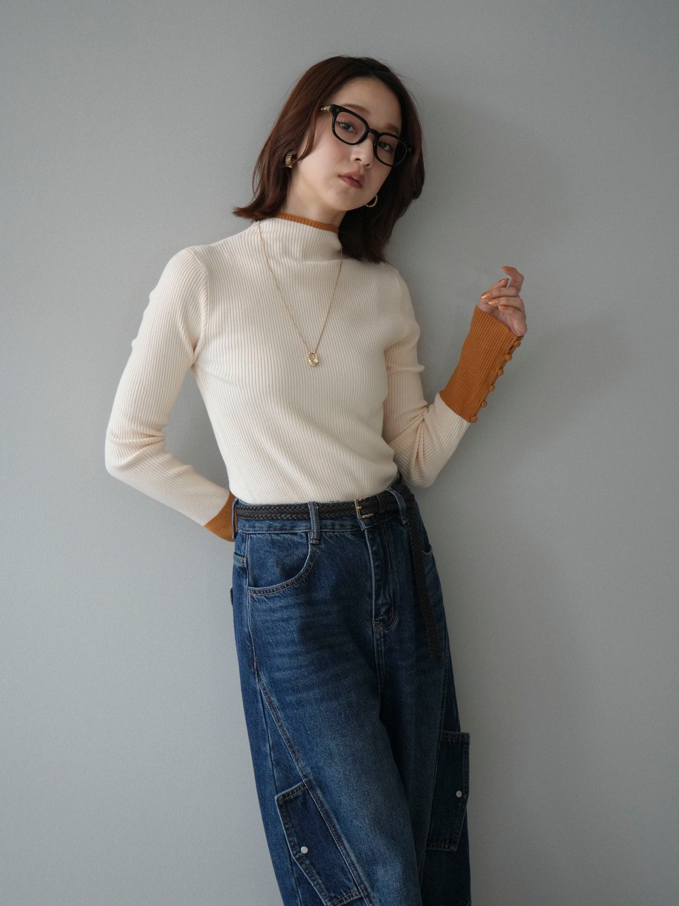 [予約]袖ボタンハイネック配色リブニットトップス/ivory