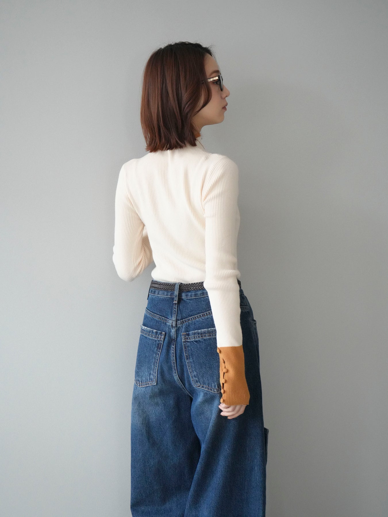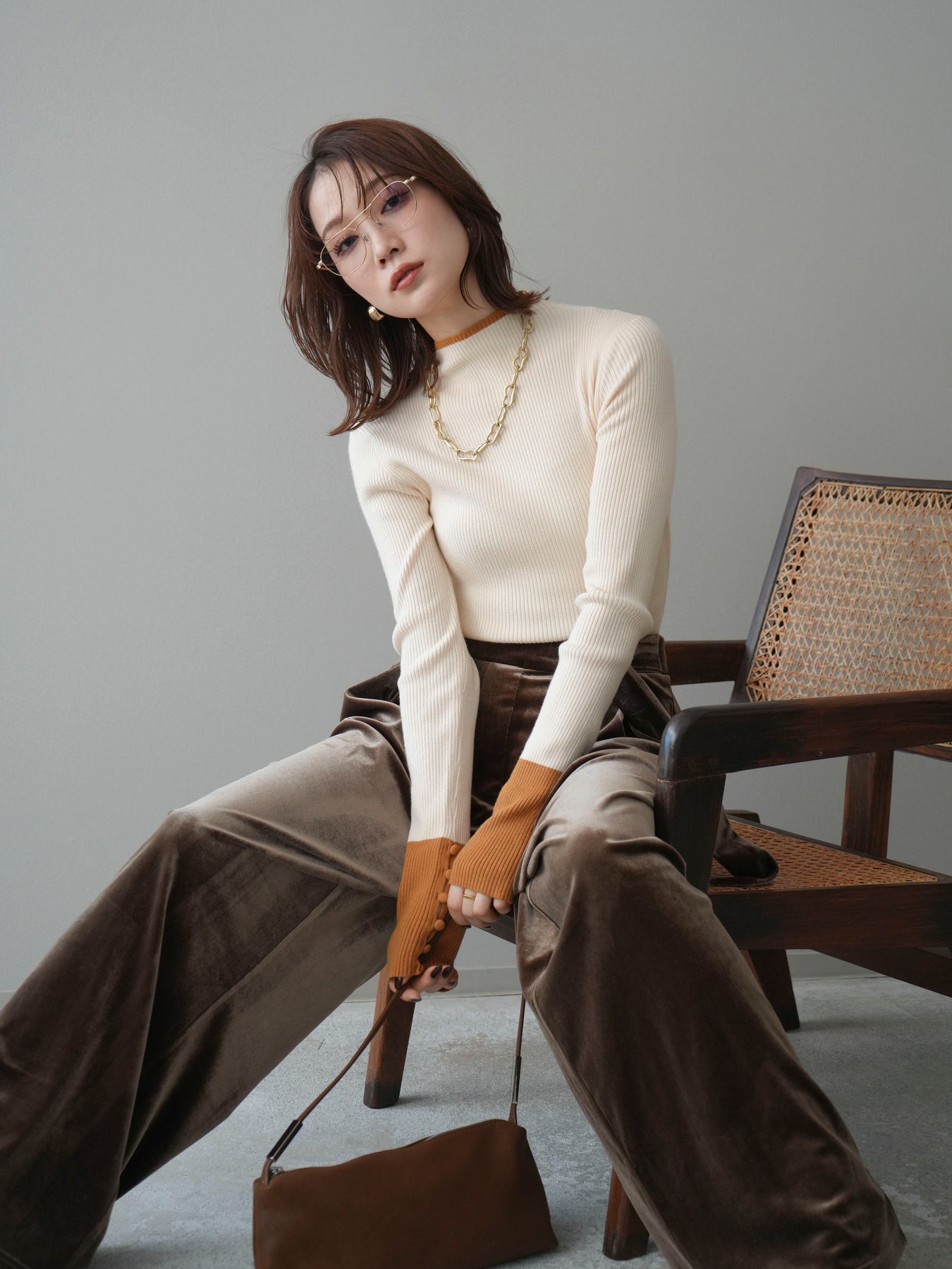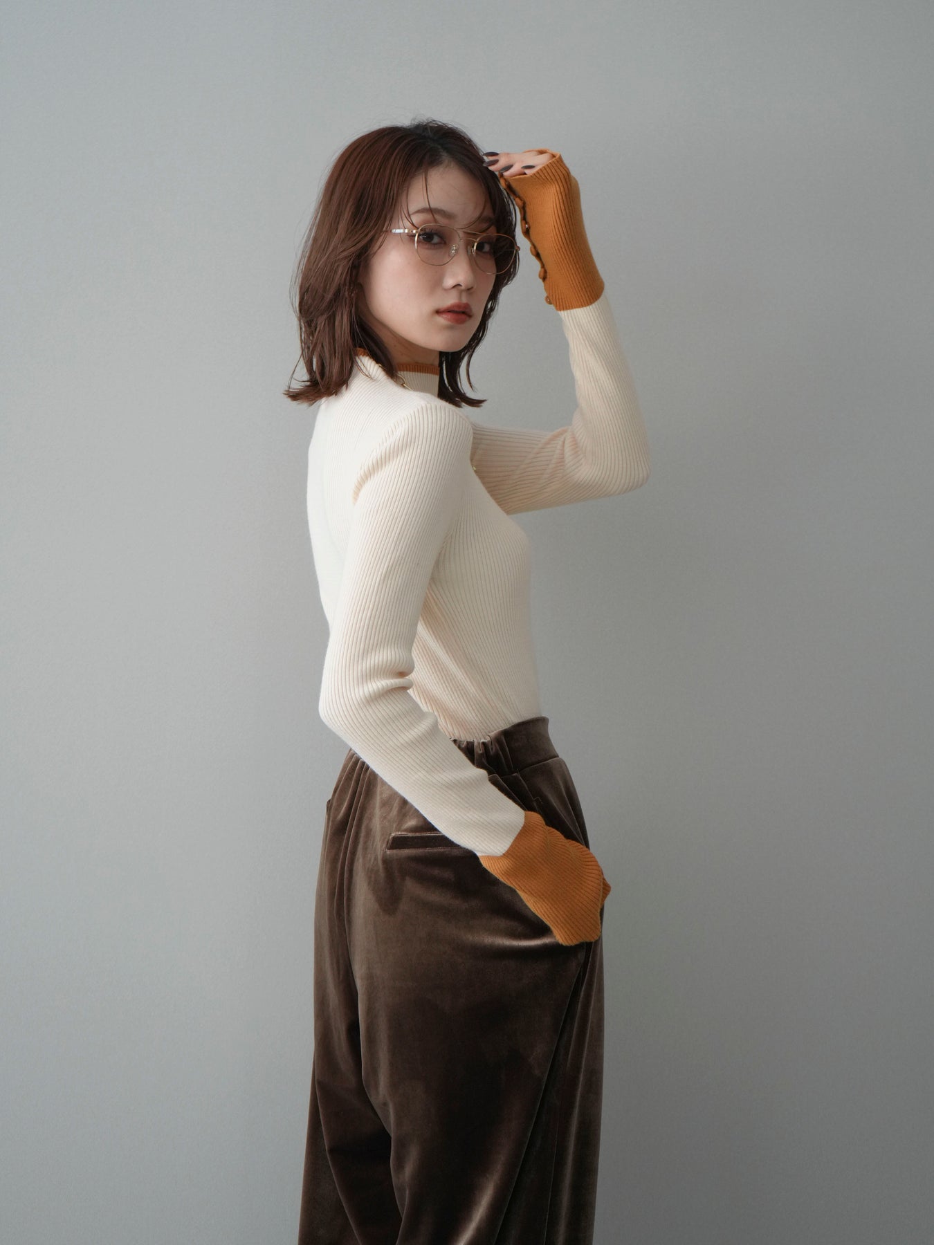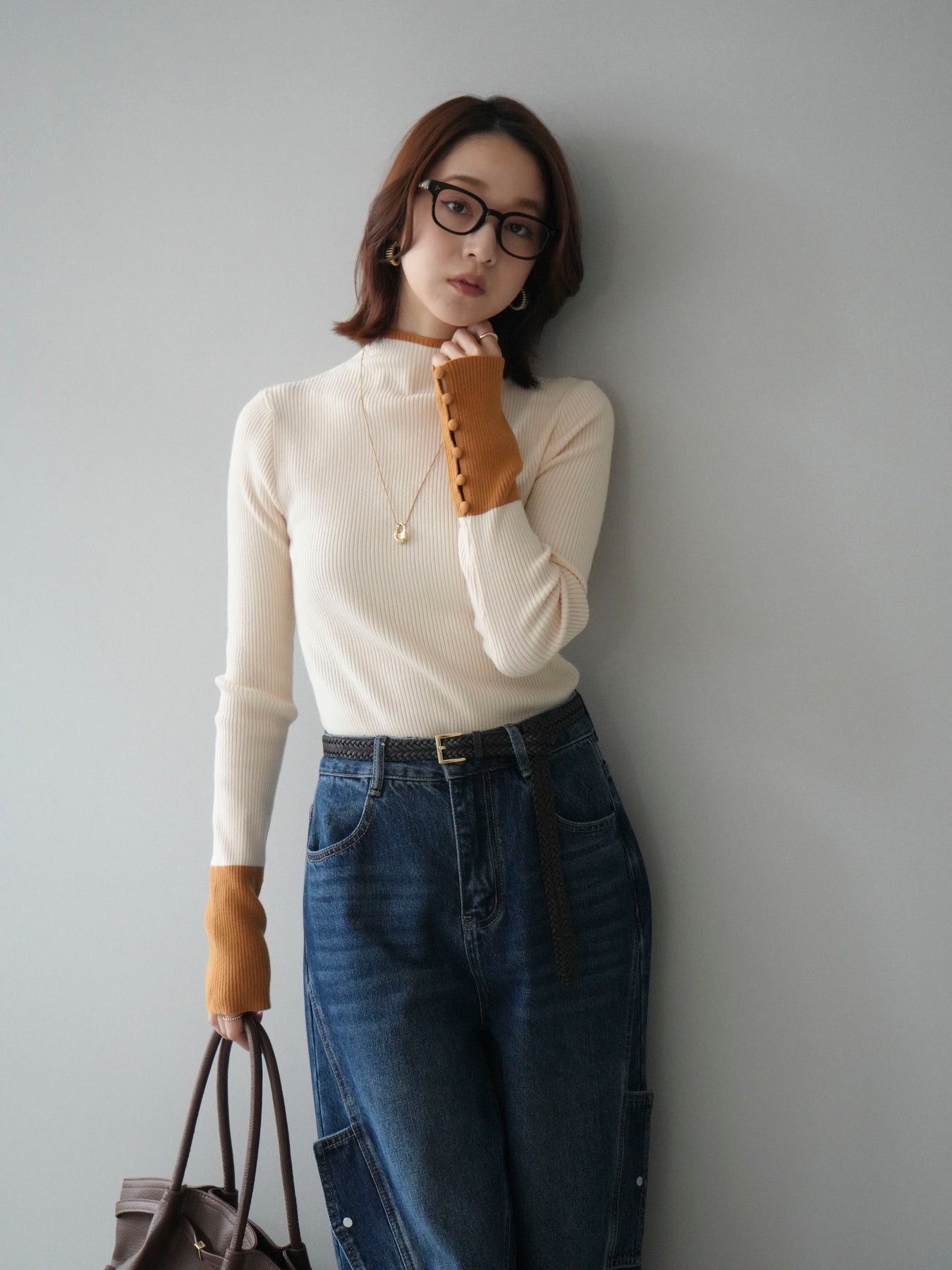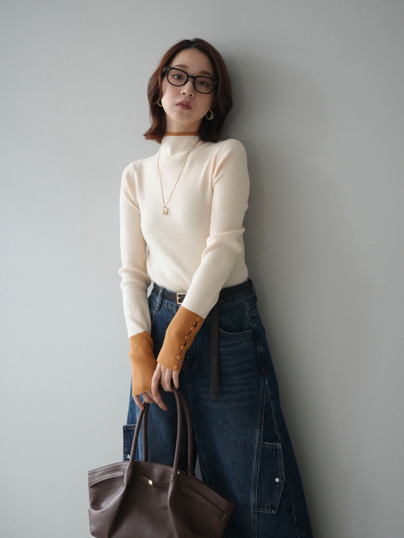 [予約]袖ボタンハイネック配色リブニットトップス/ivory