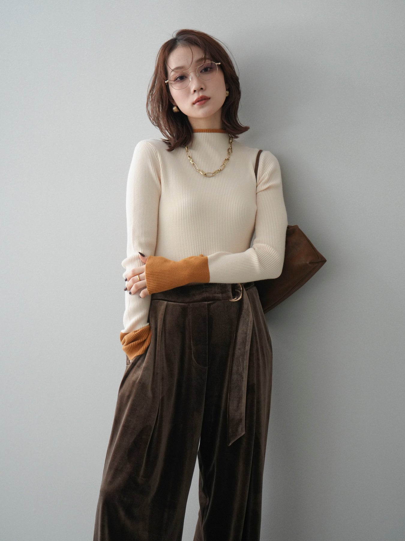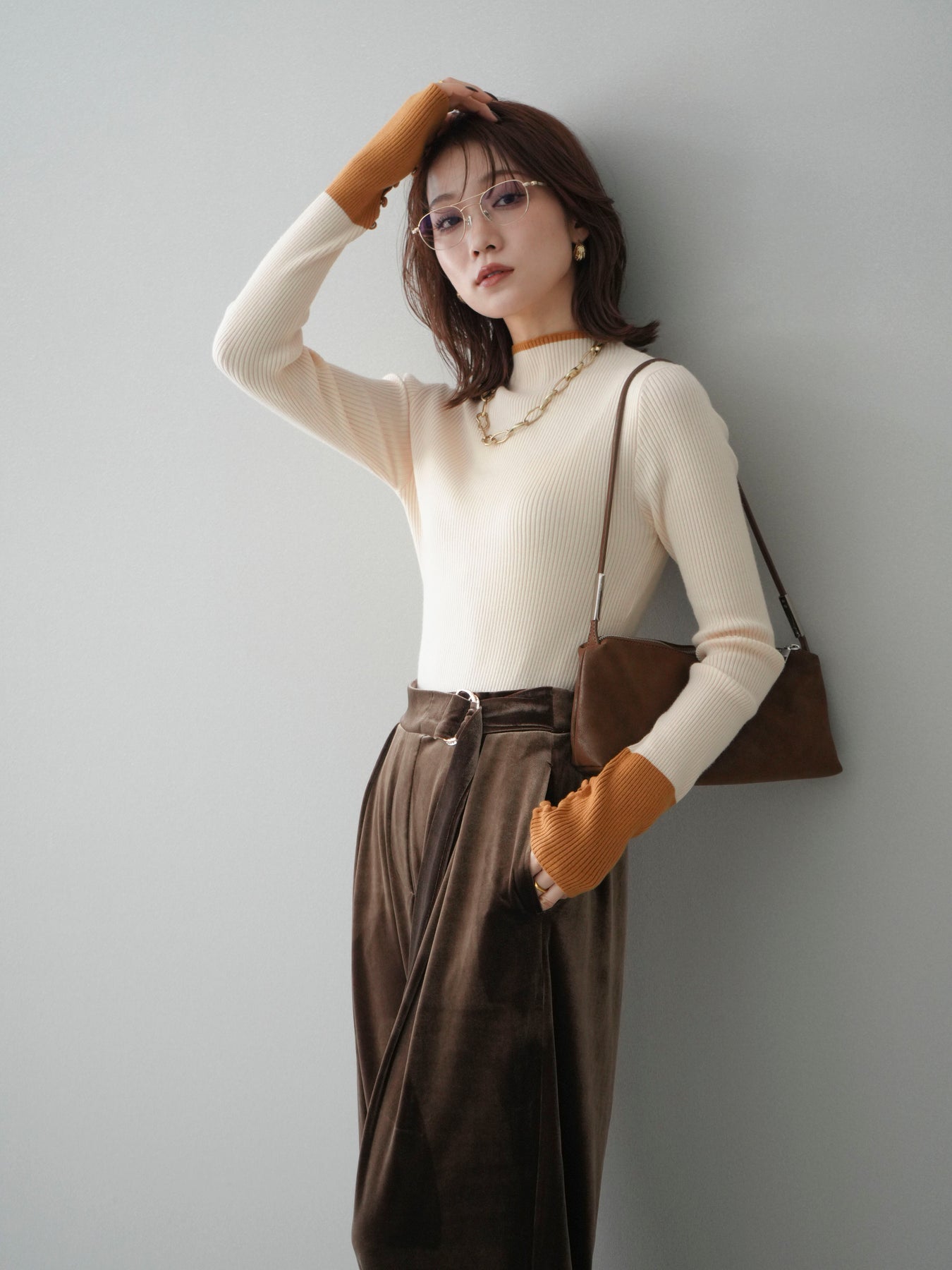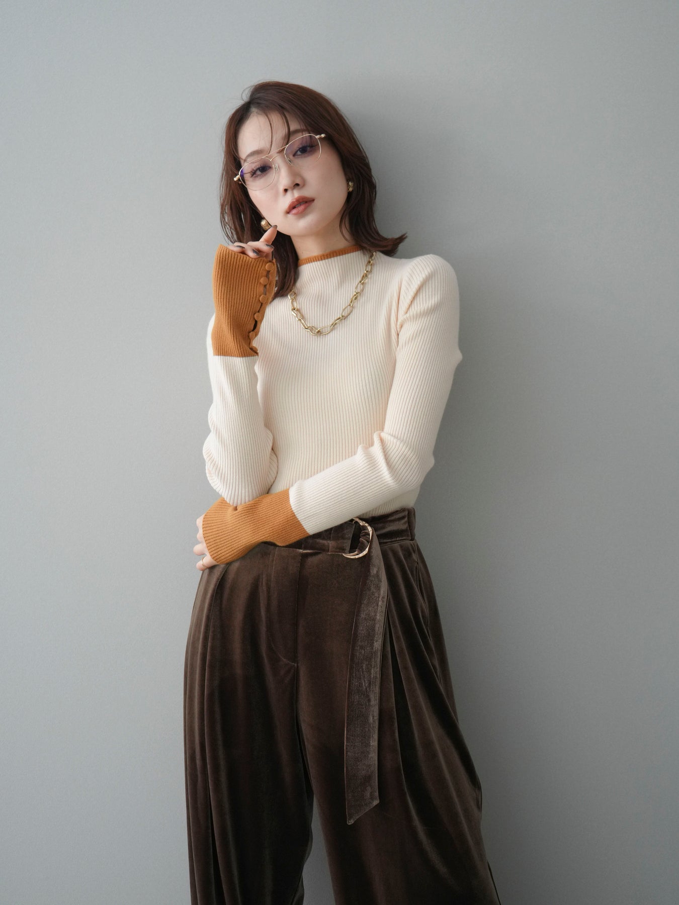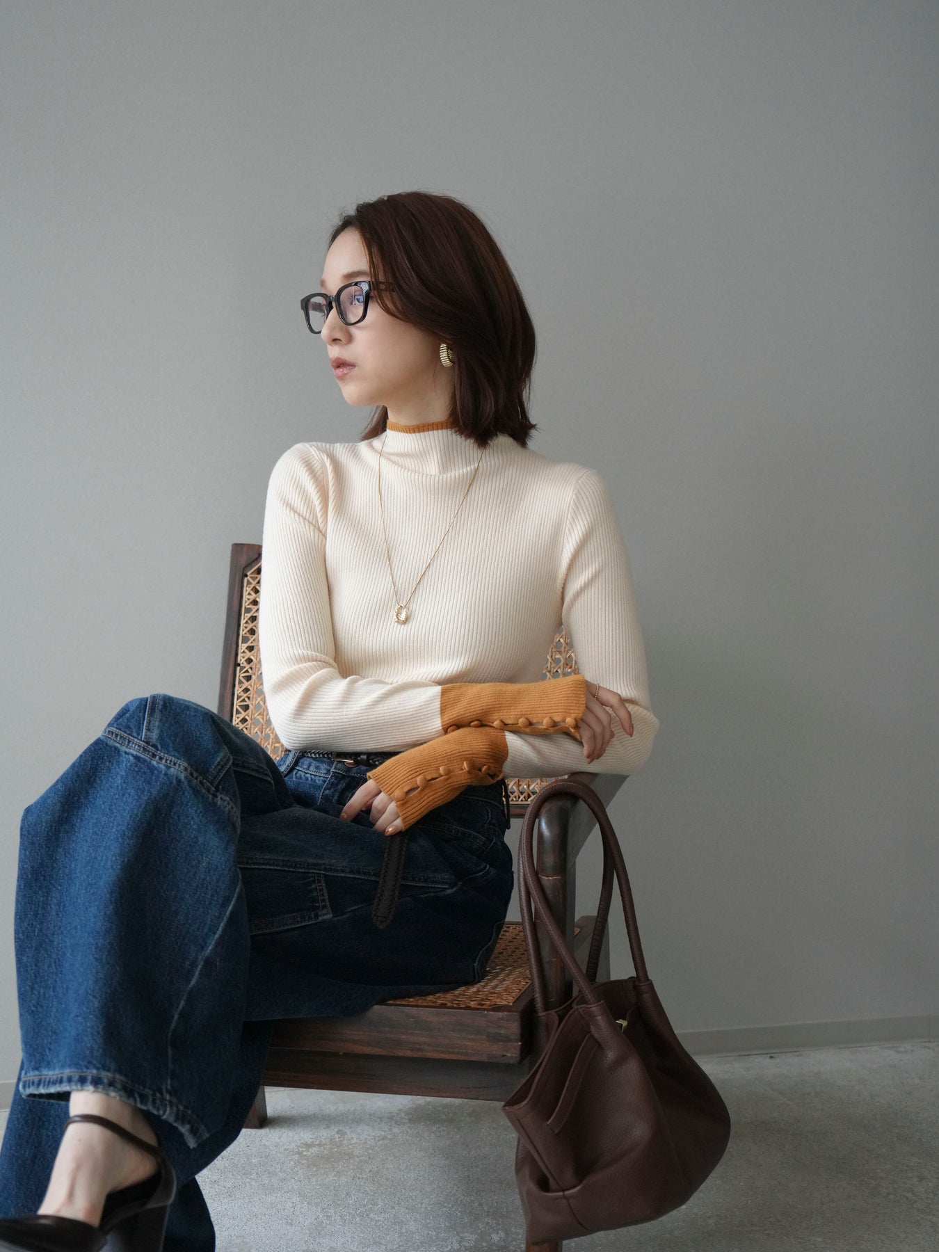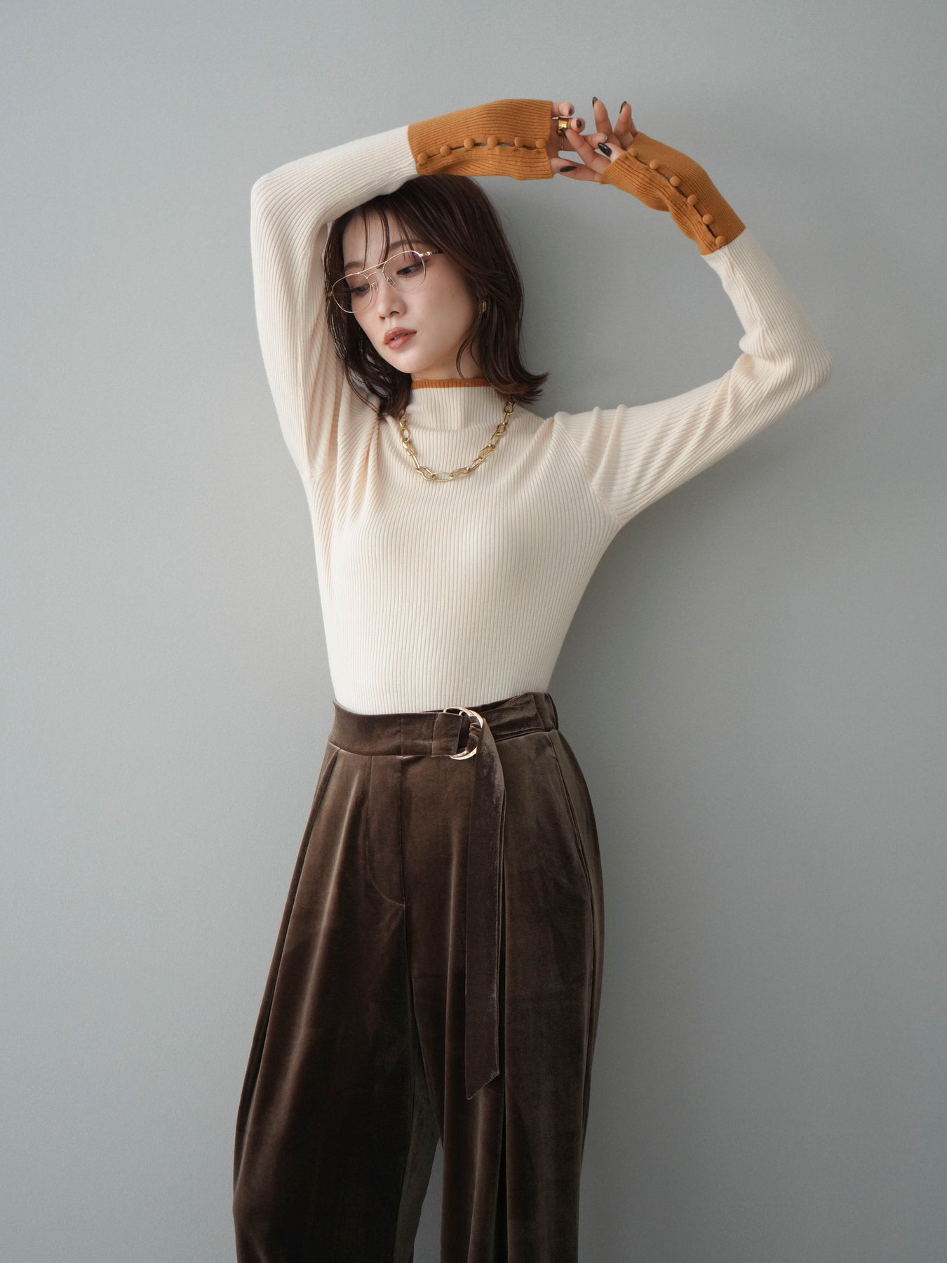 [予約]袖ボタンハイネック配色リブニットトップス/ivory