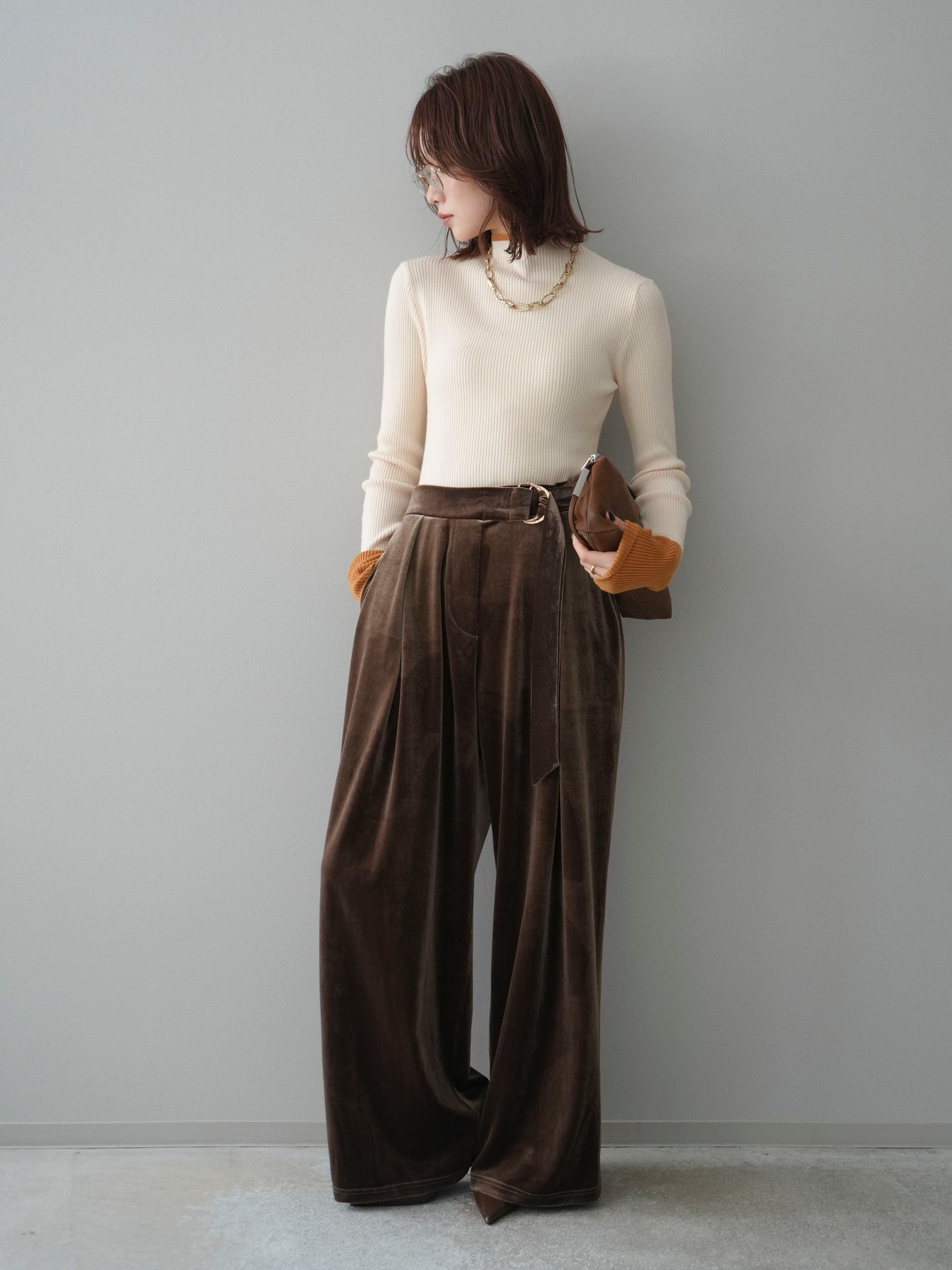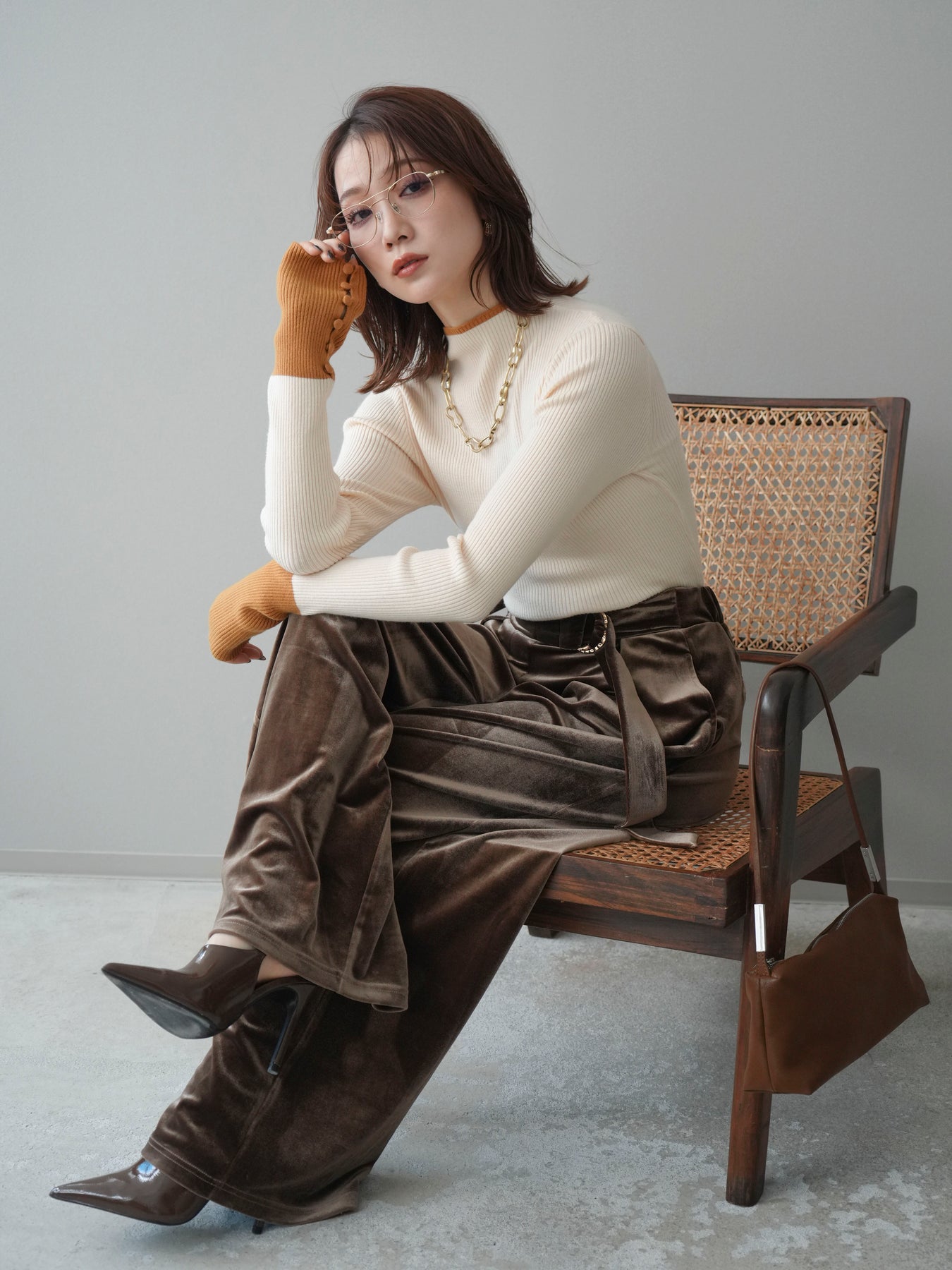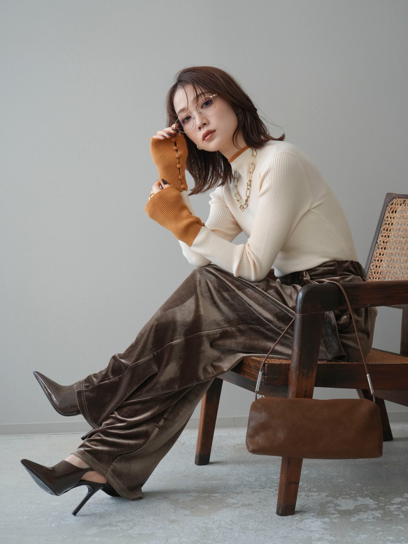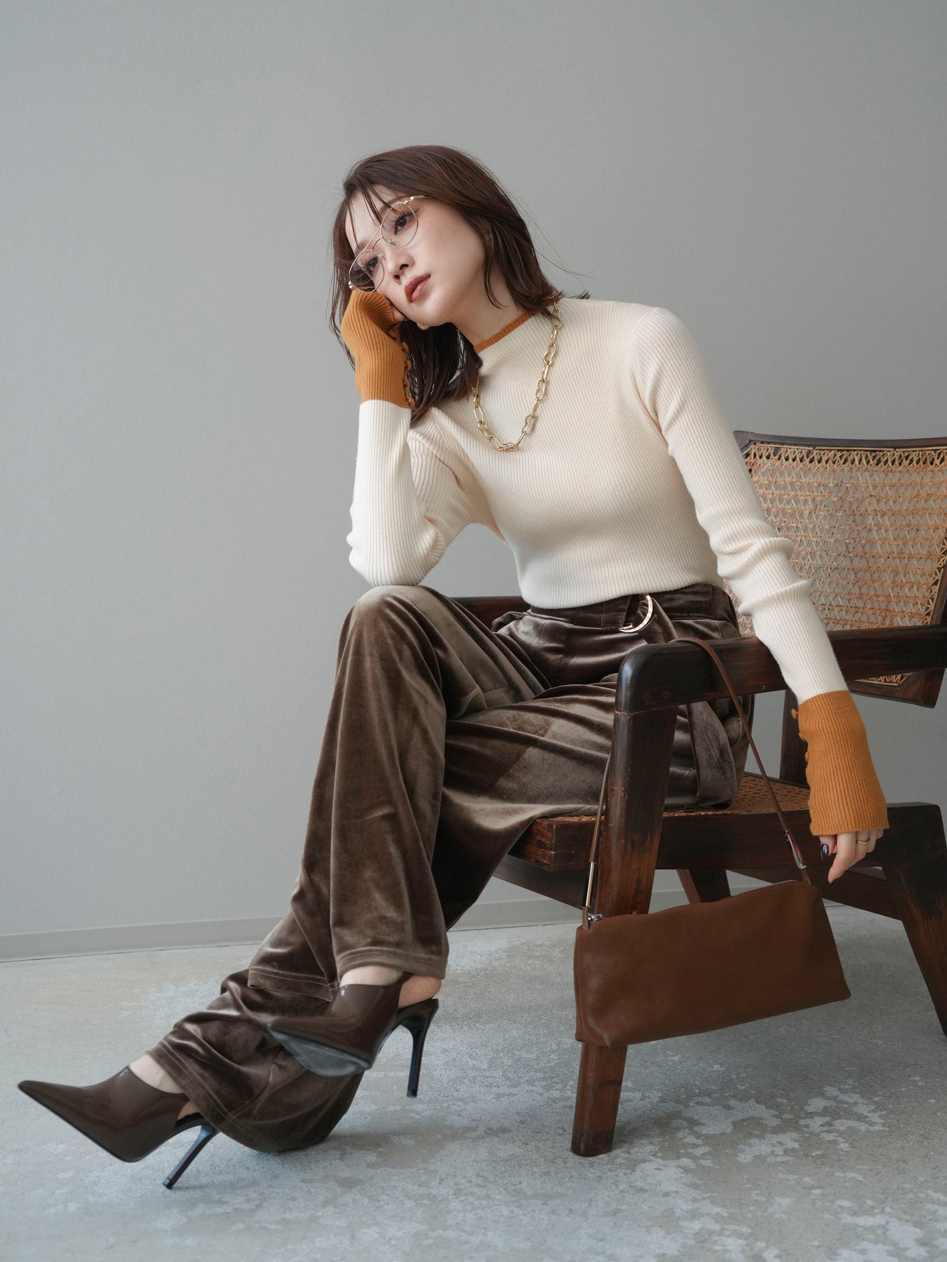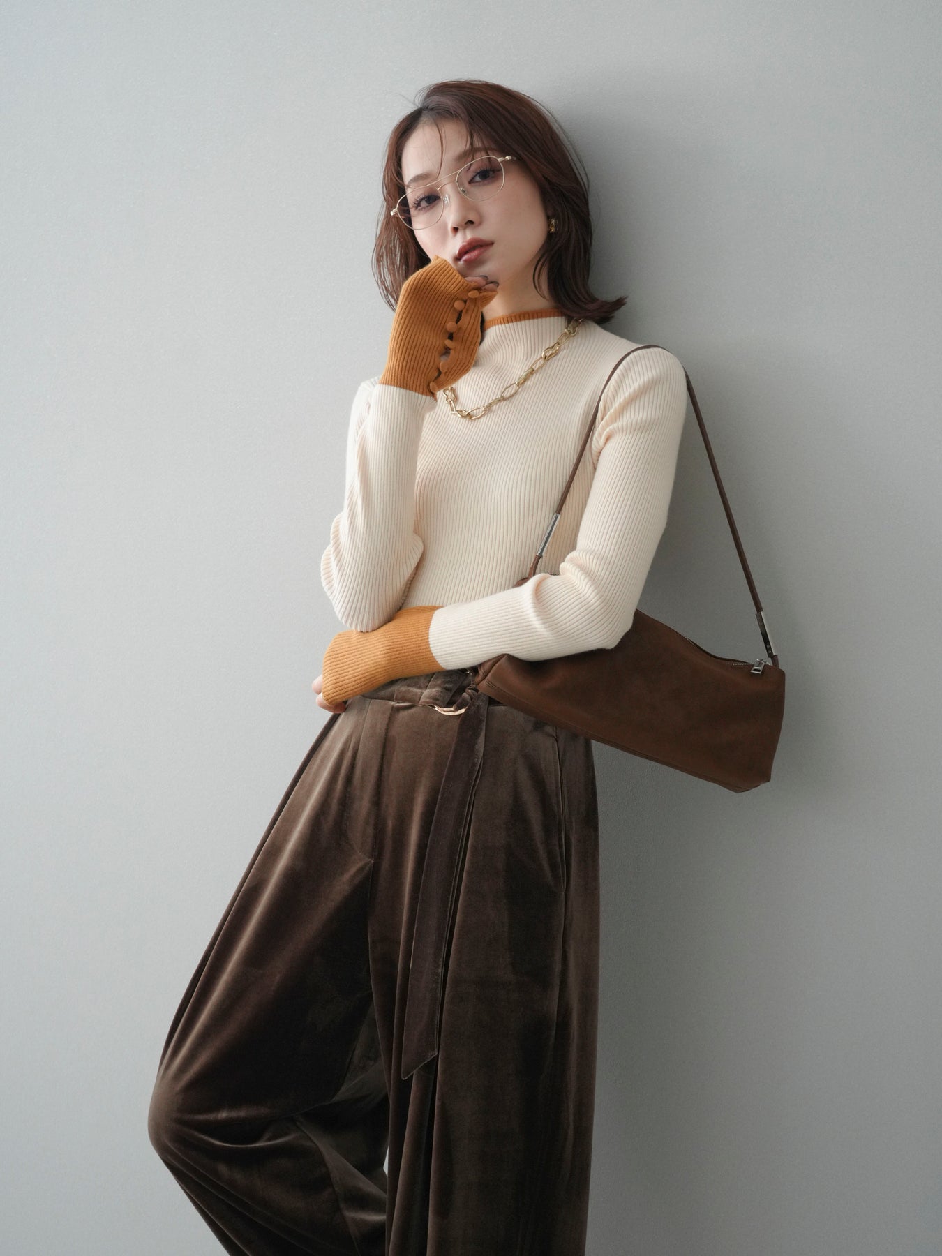 [予約]袖ボタンハイネック配色リブニットトップス/ivory