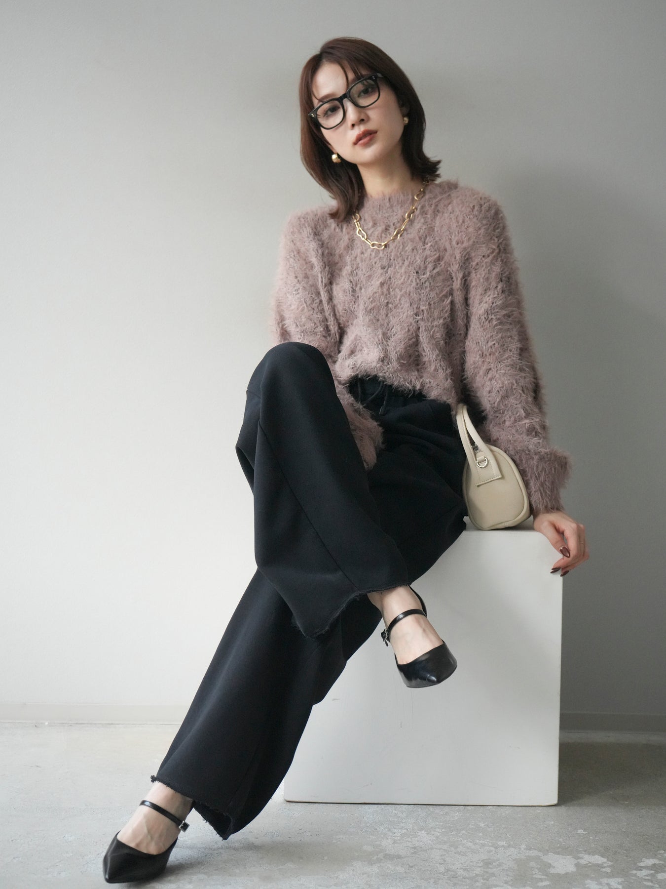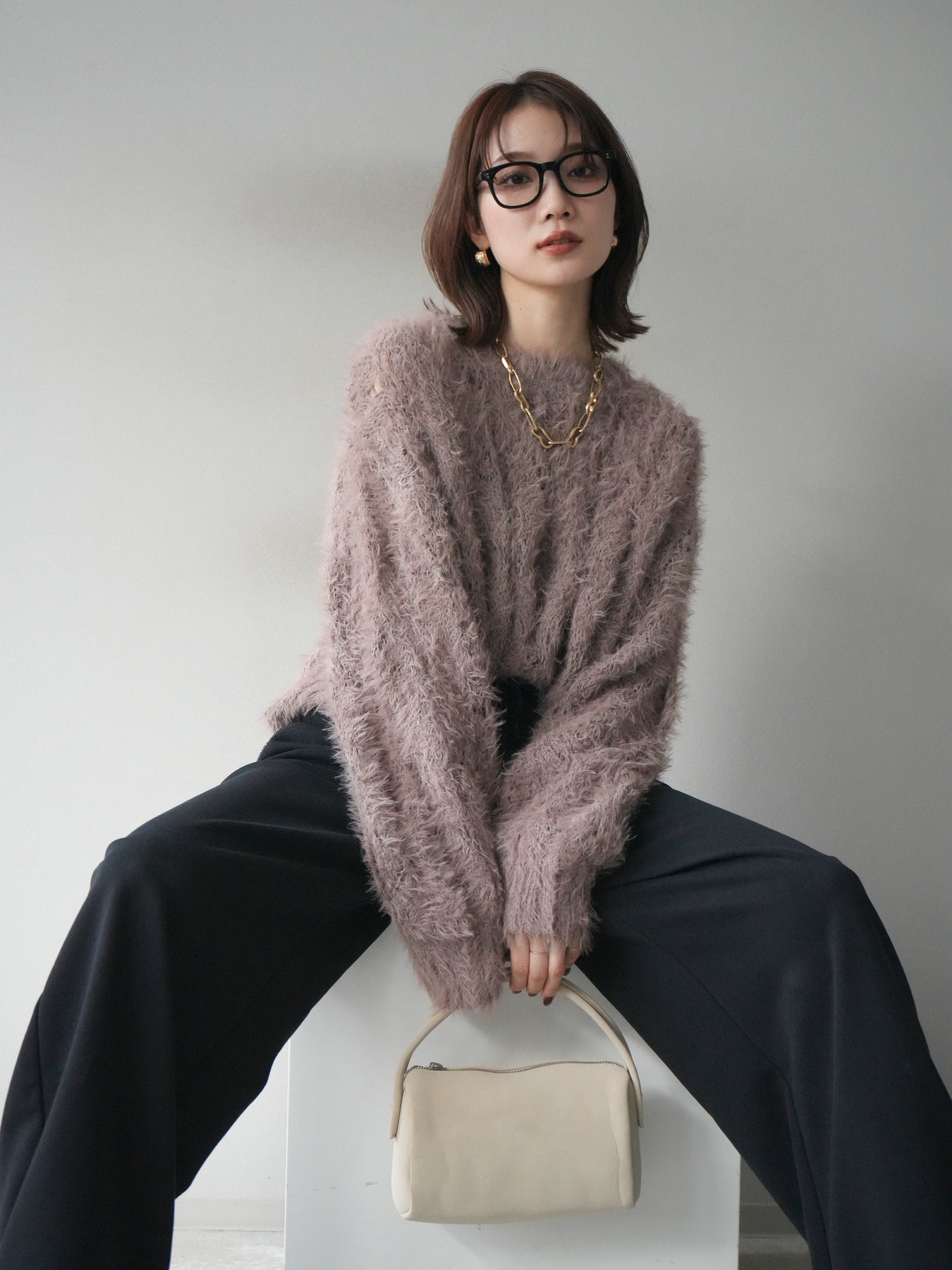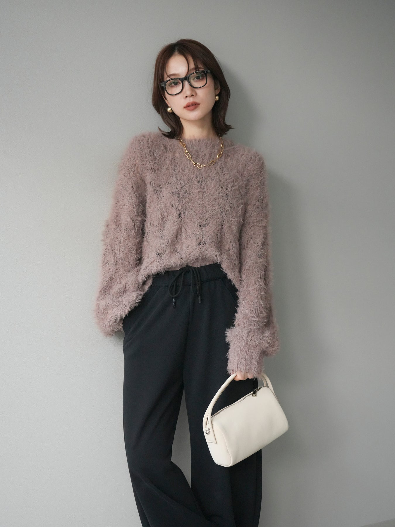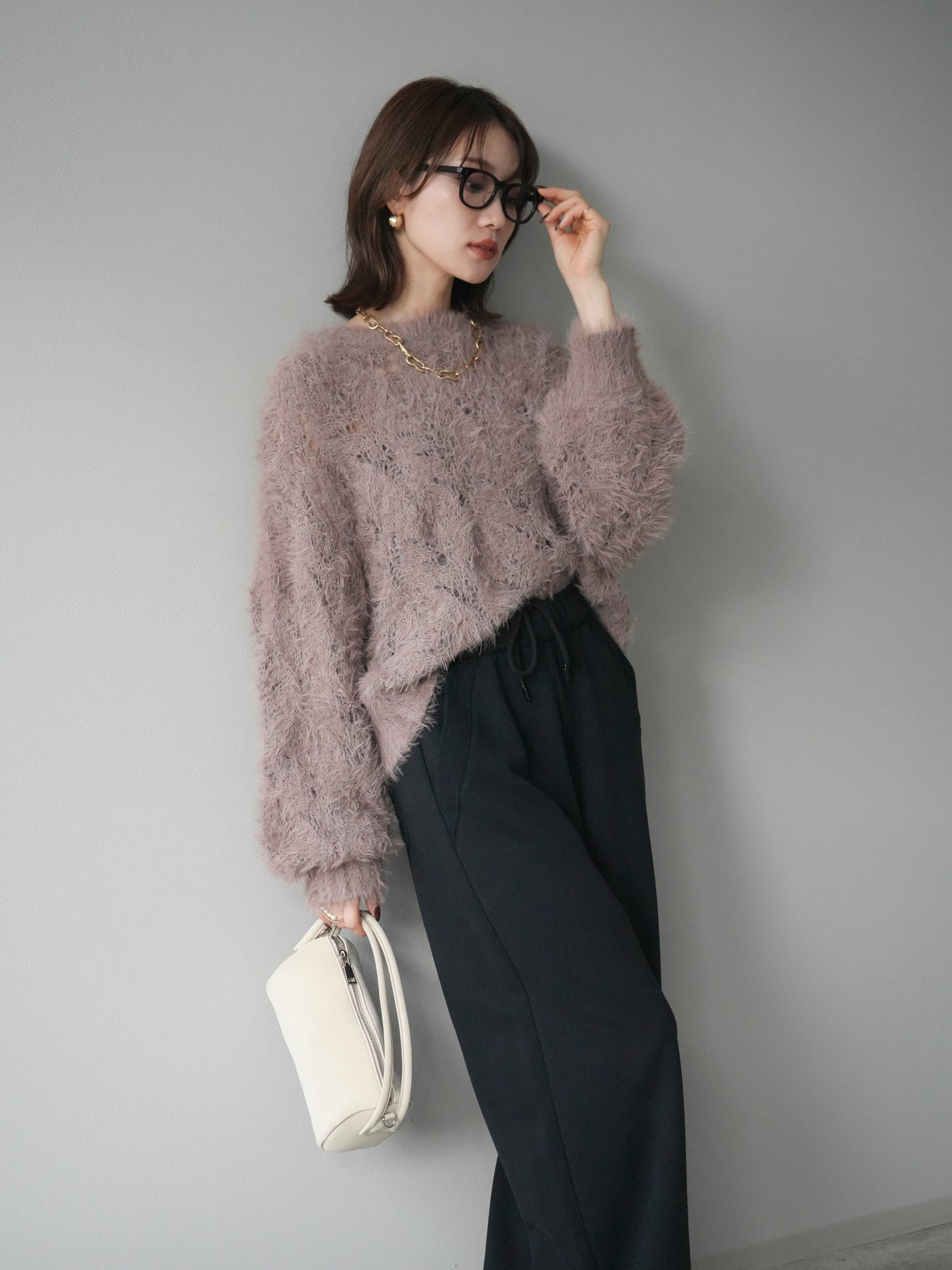 ゆるっとした抜け感と、ふわふわの素材感が魅力の透かし編みニット。 モール×フェザー糸をミックスした編地で、立体的な表情とさりげない透け感が女性らしさを引き立てます。 柔らかな肌触りで着心地も抜群。ややゆとりのあるシルエットで、インナーとのレイヤードも楽しめます。 デニムやスラックスと合わせてカジュアルにも、ロングスカートと合わせて柔らかなムードにも◎ シーズンムードを高めてくれる1着です。
