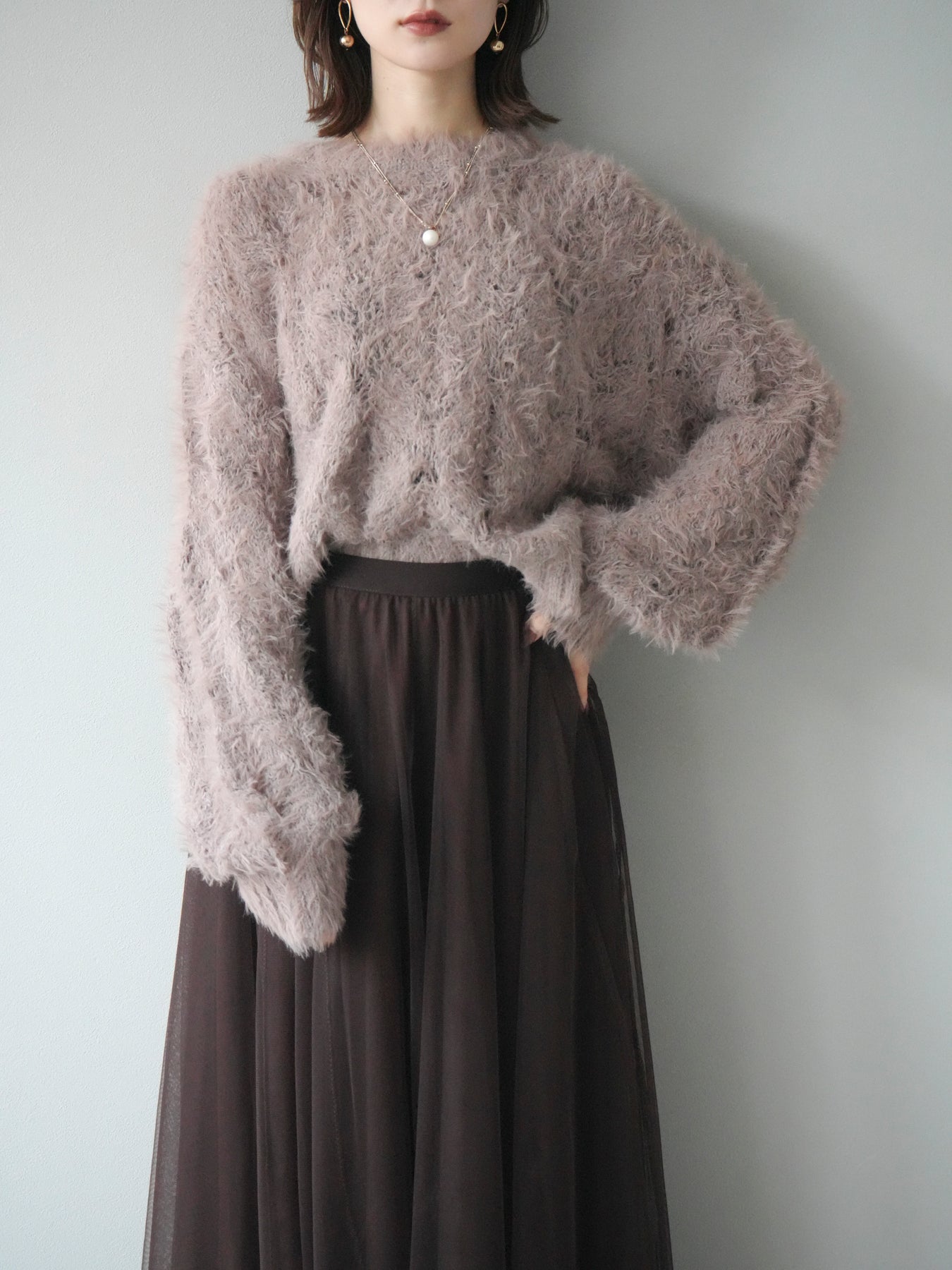 [予約]モール×フェザー透かし編みニットプルオーバー/mocha