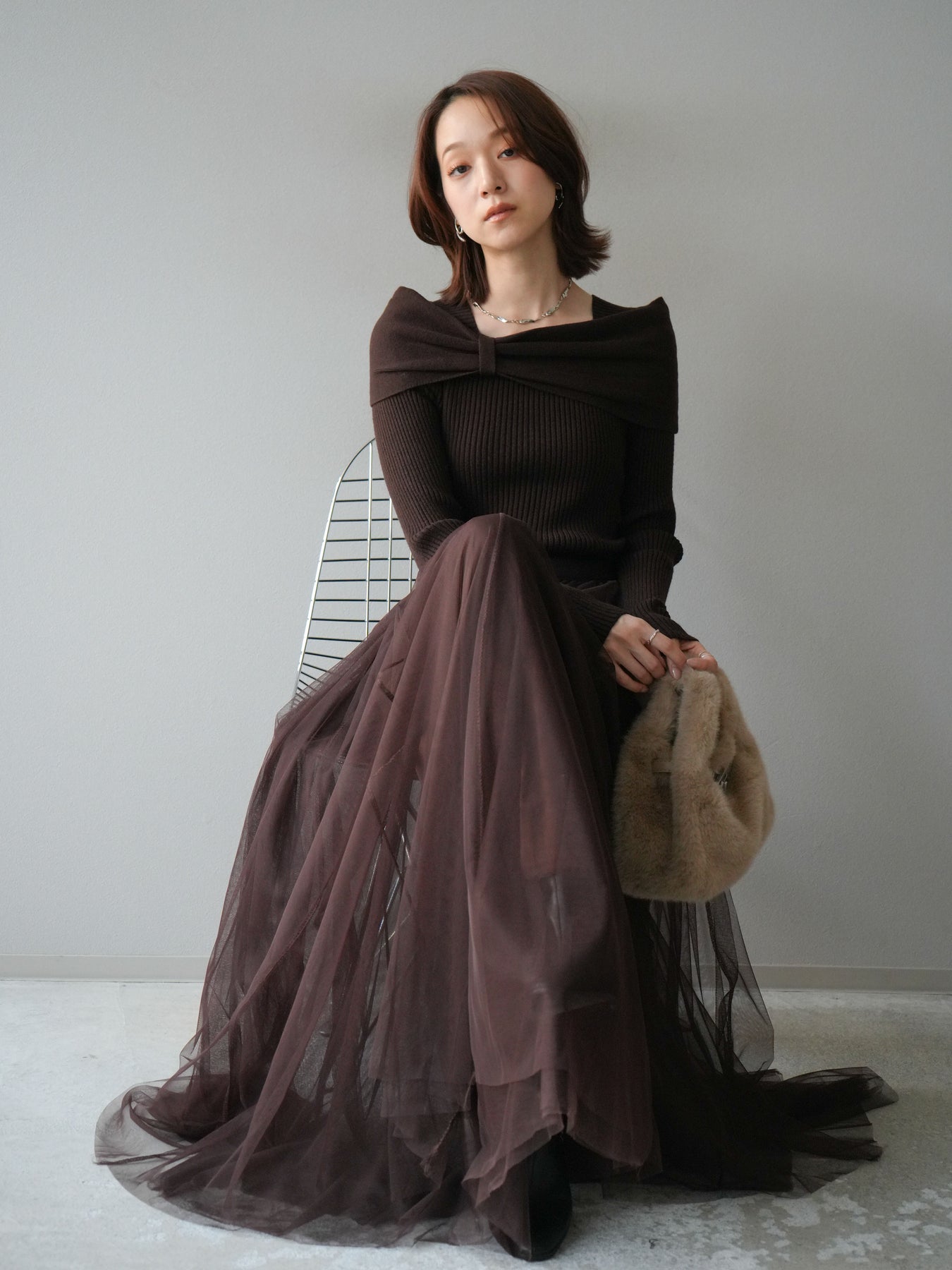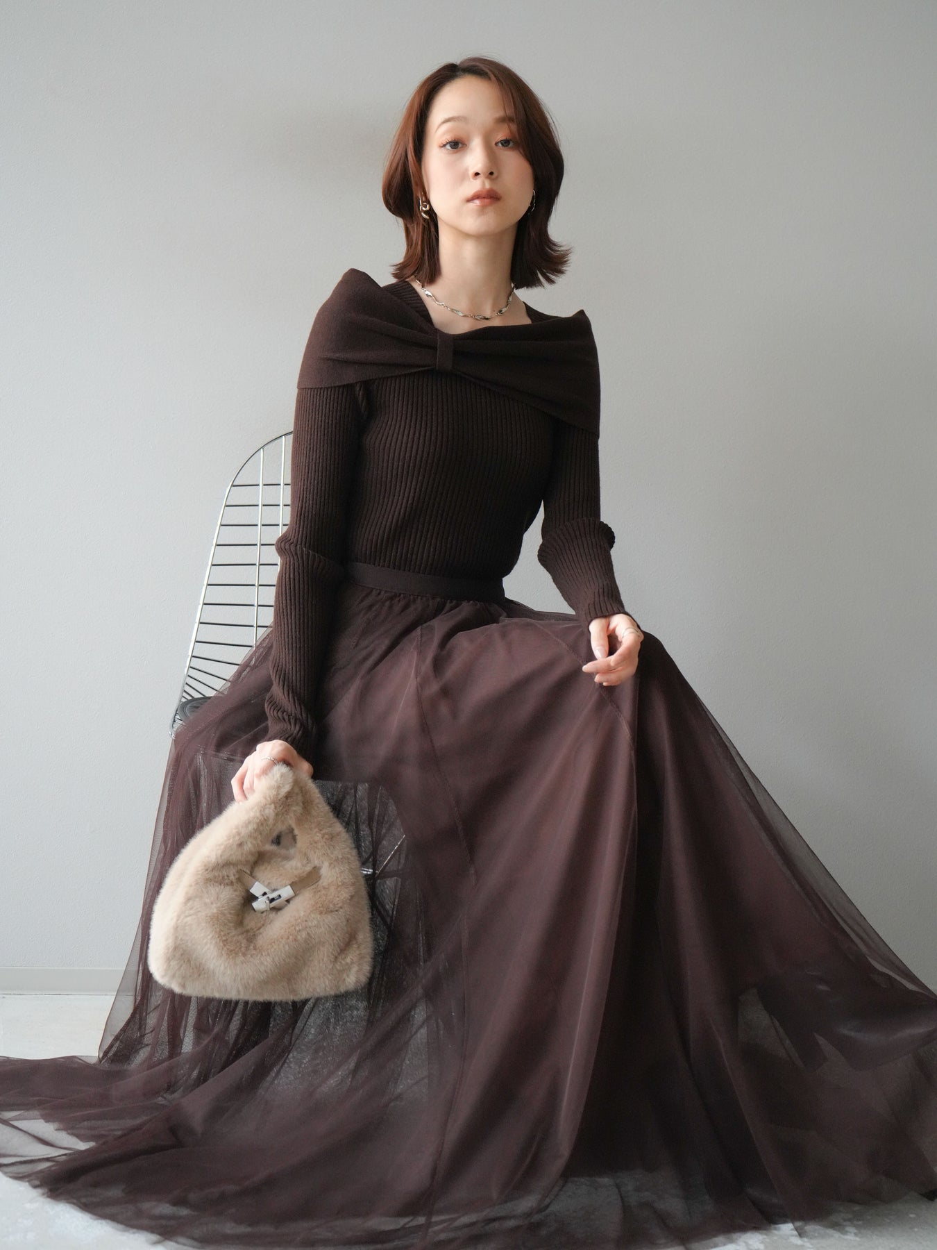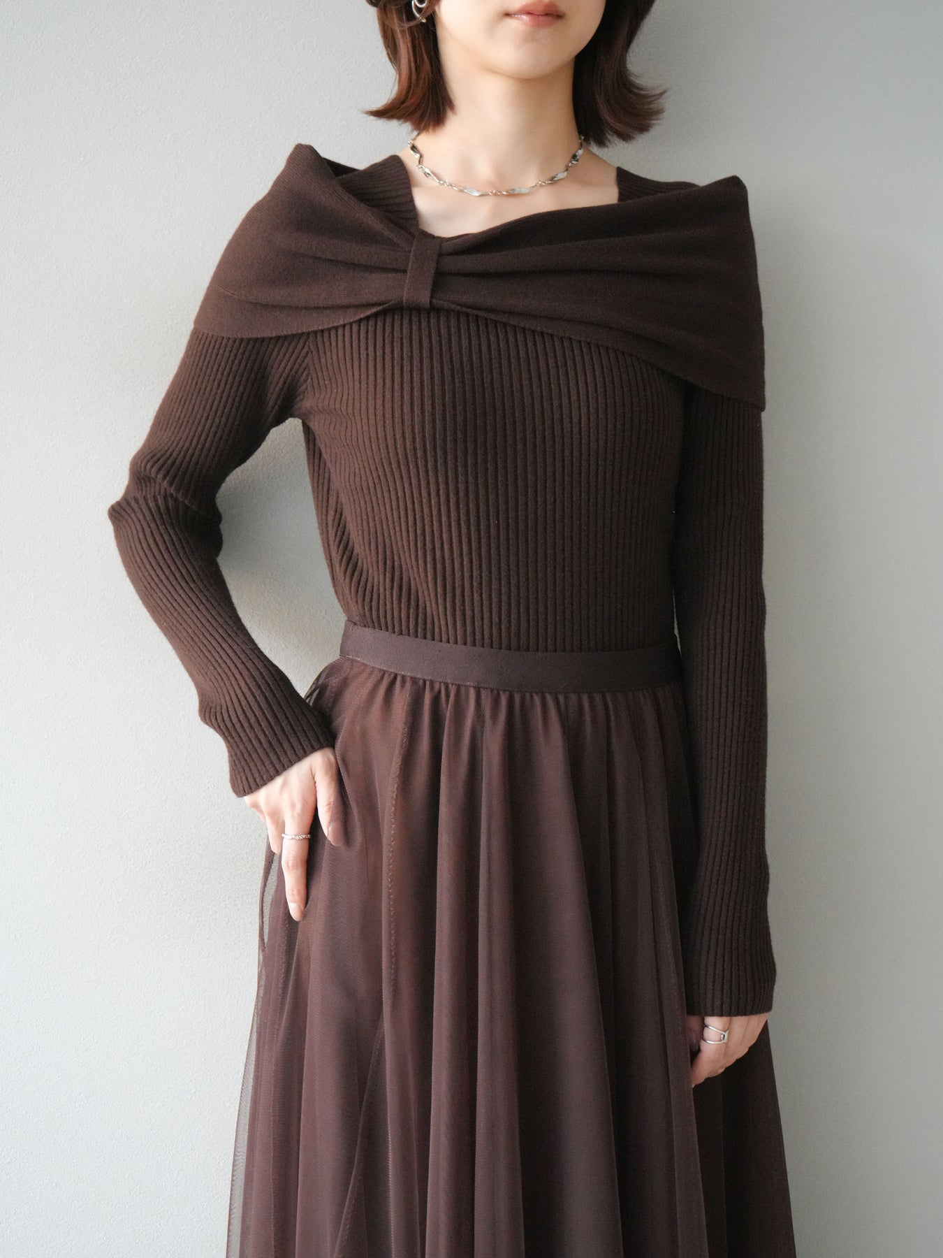 [予約]リボンモチーフオフショルリブニットトップス/brown