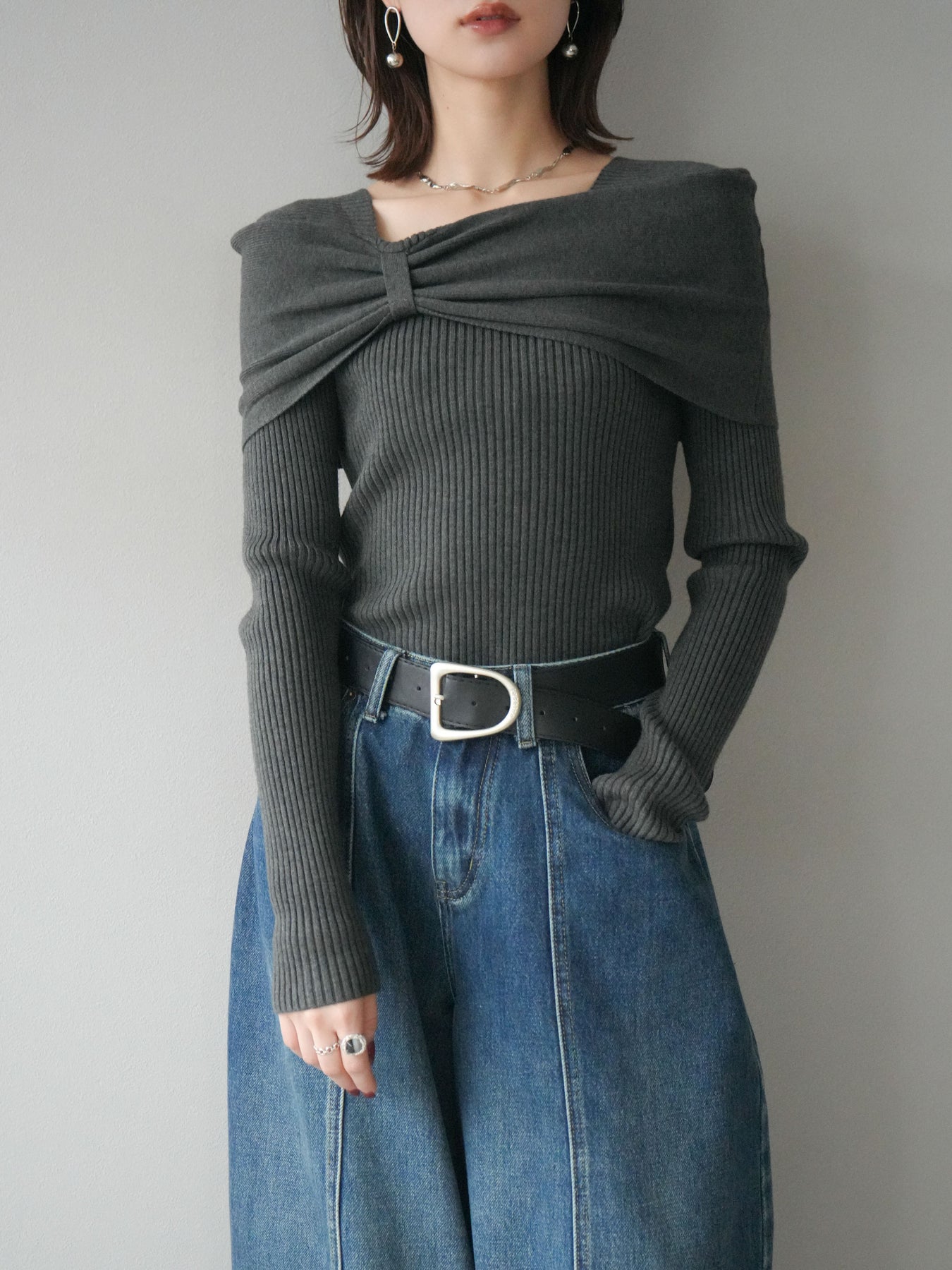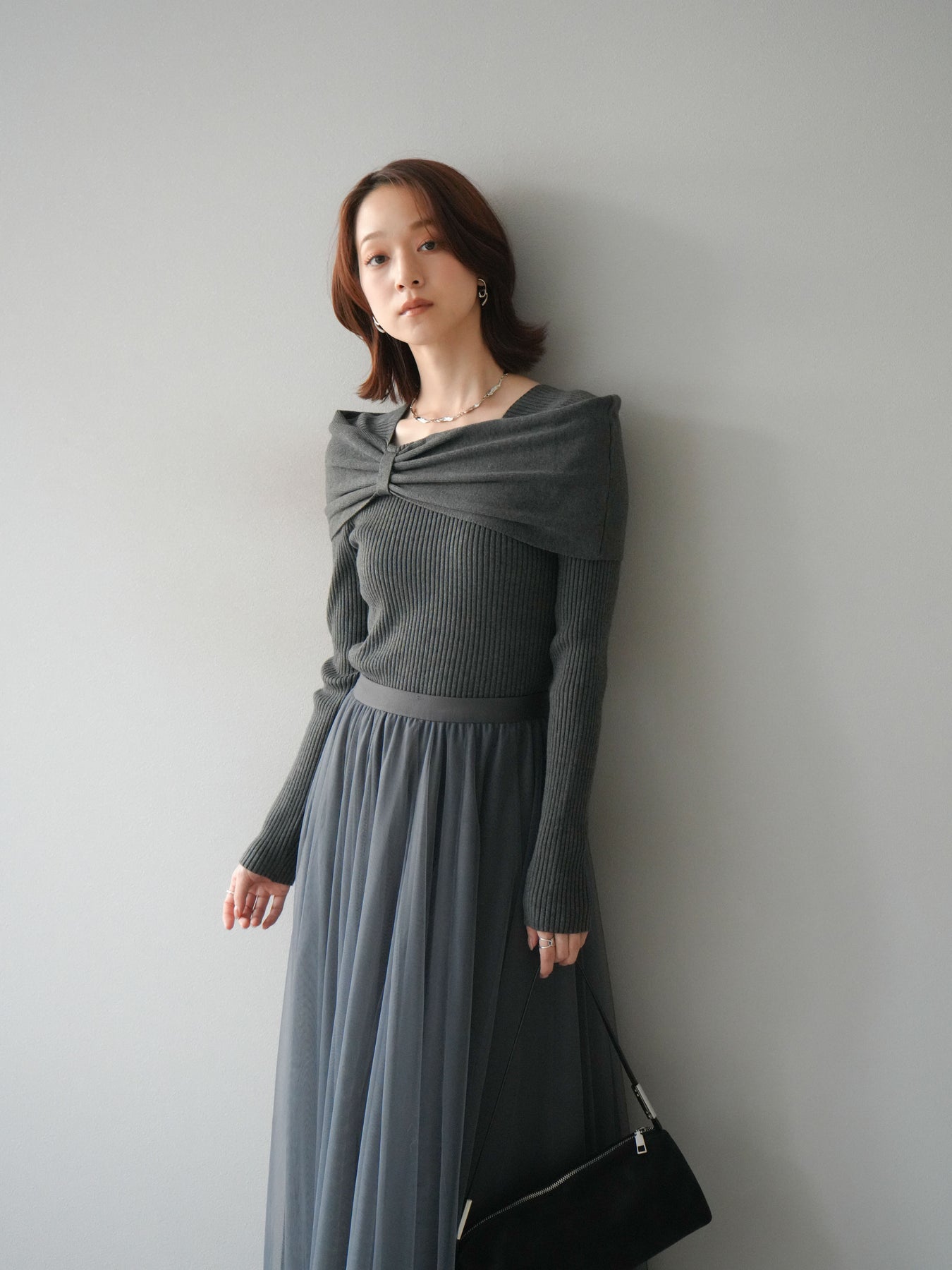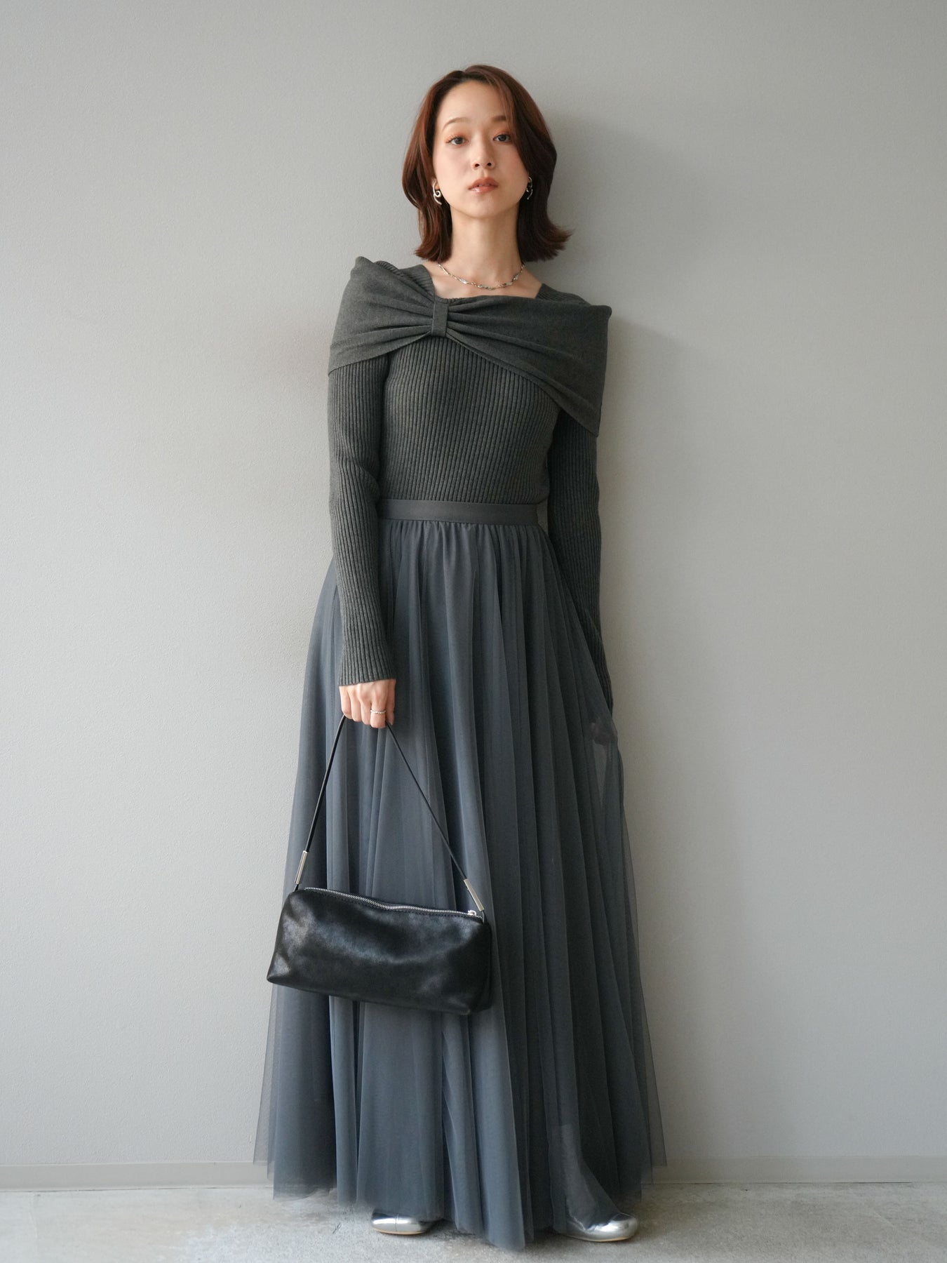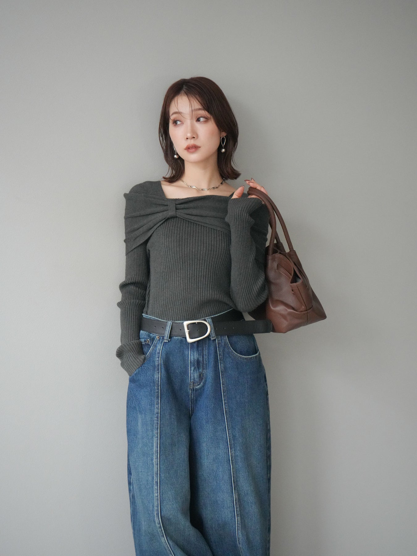 [予約]リボンモチーフオフショルリブニットトップス/gray
