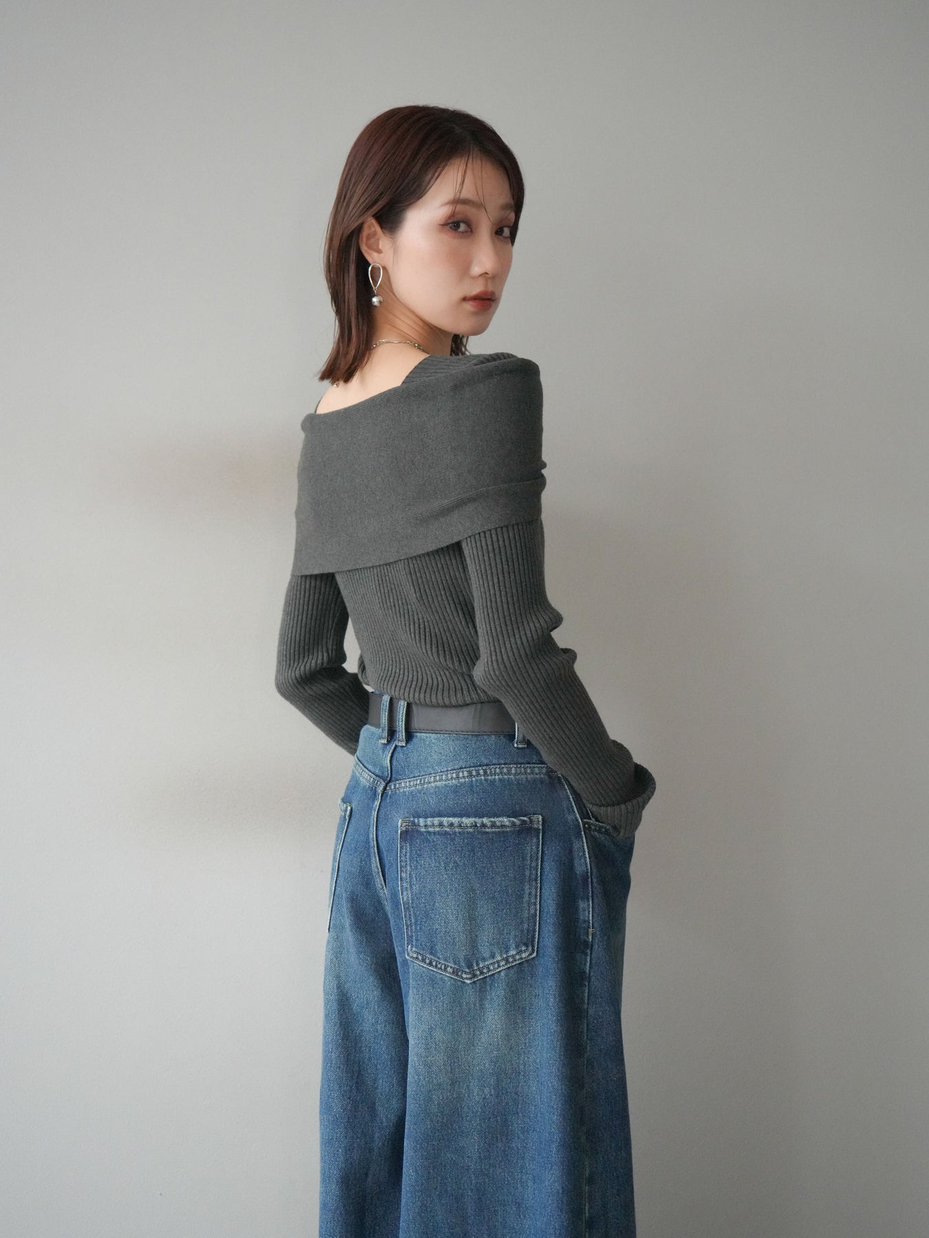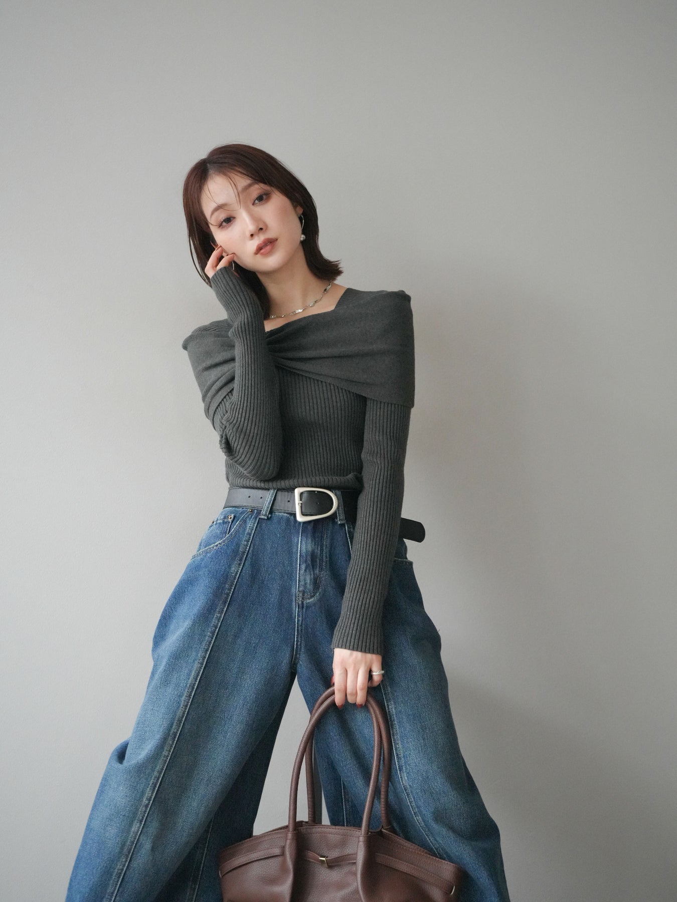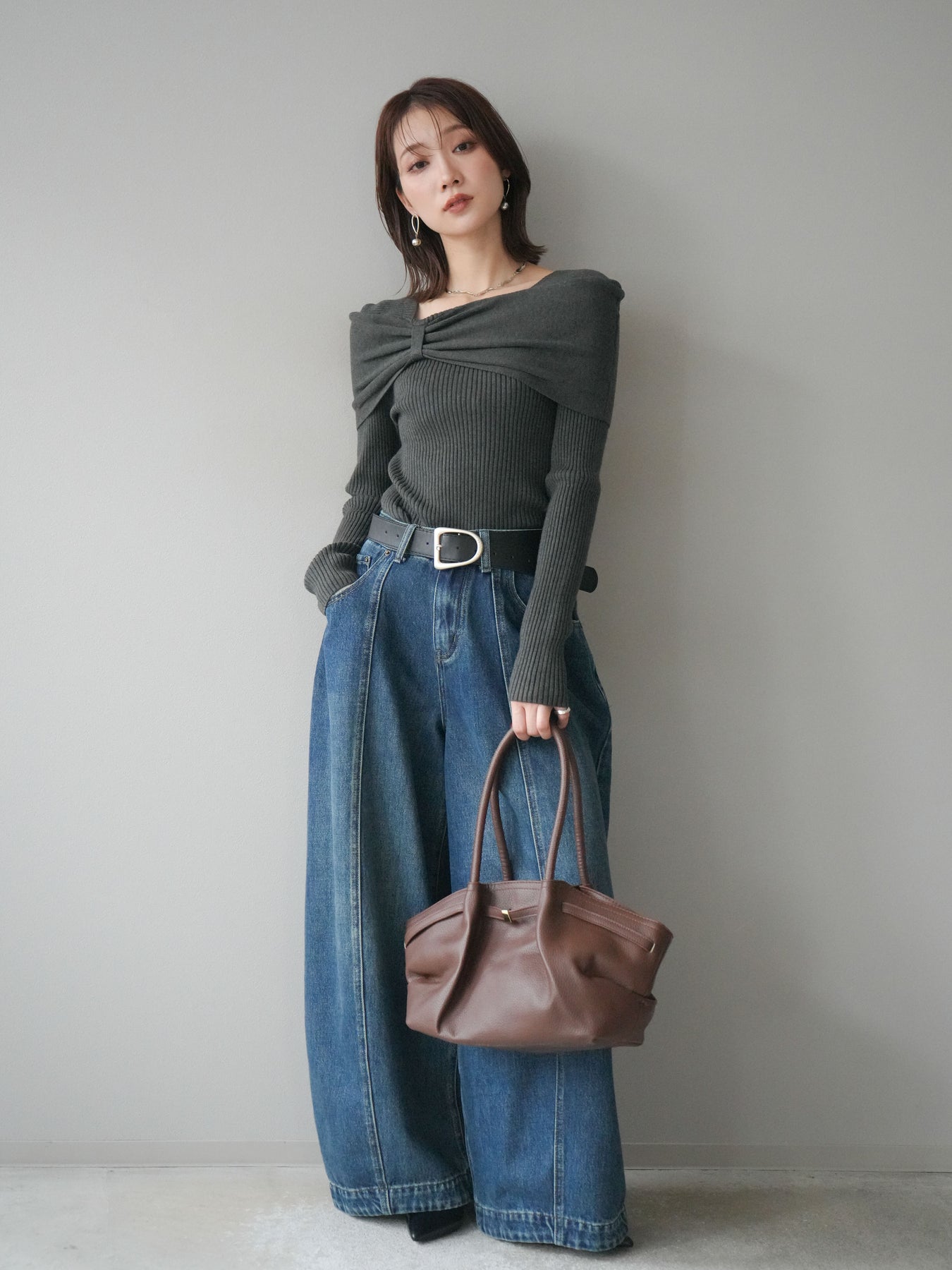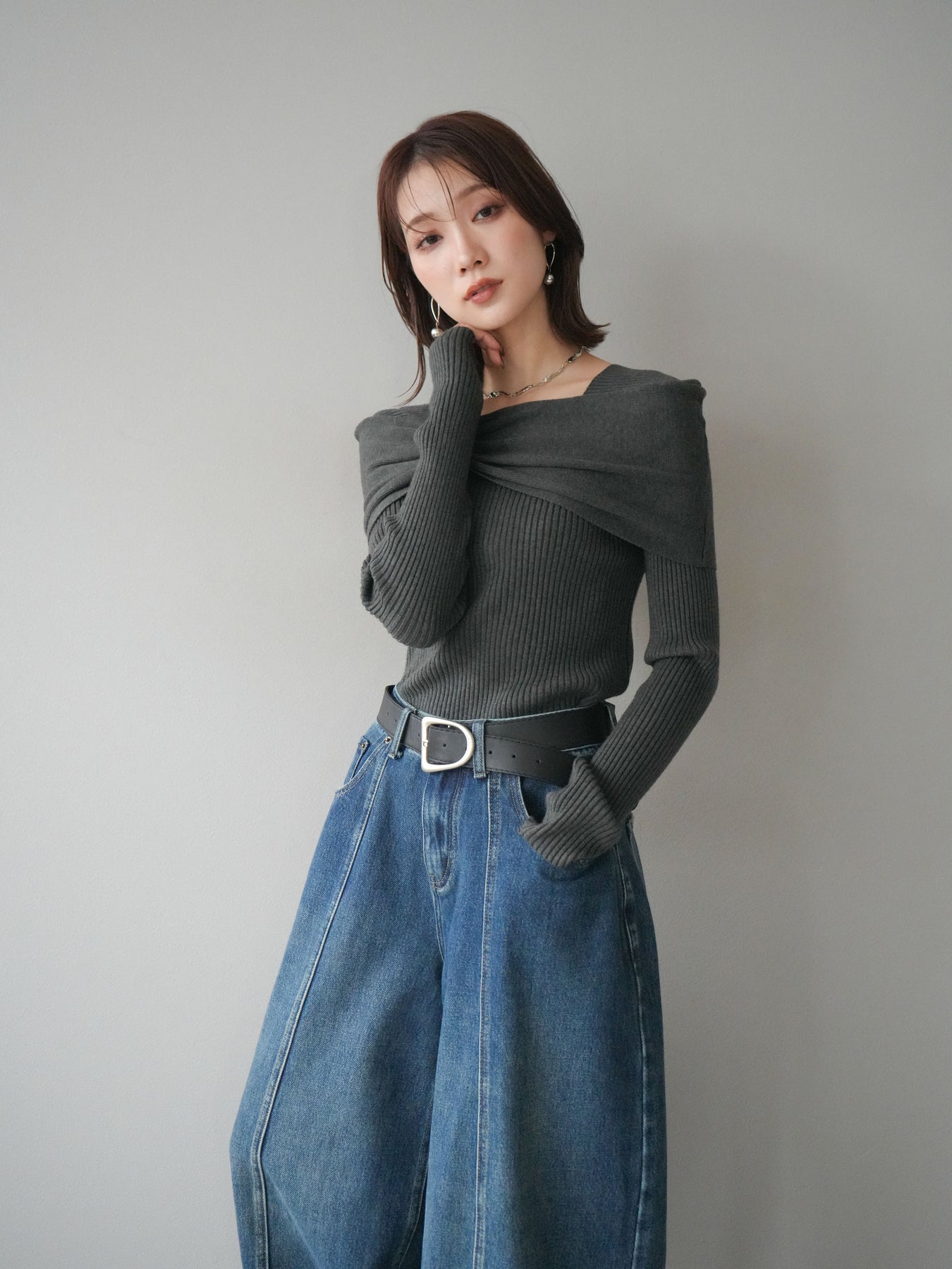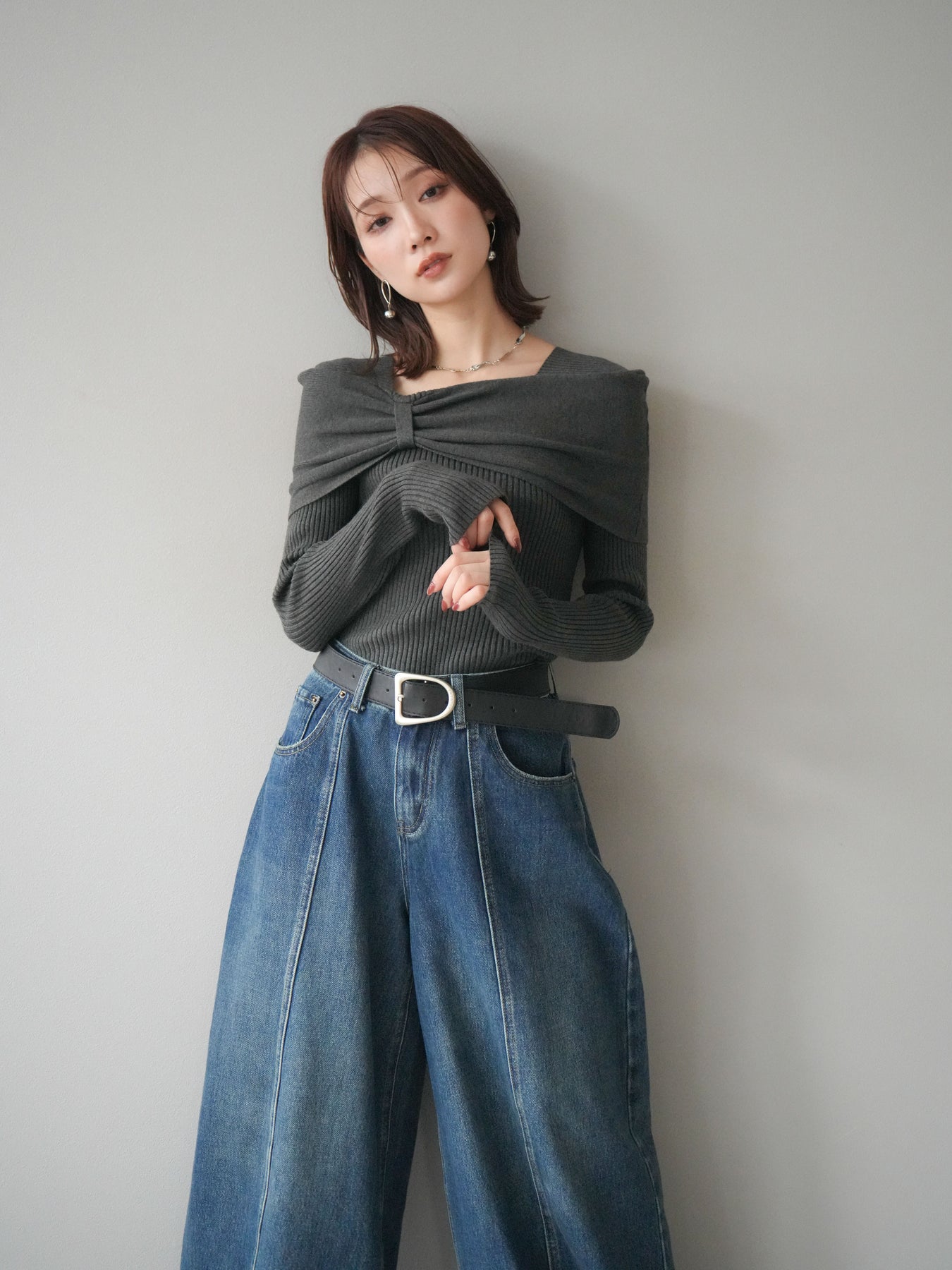 [予約]リボンモチーフオフショルリブニットトップス/gray