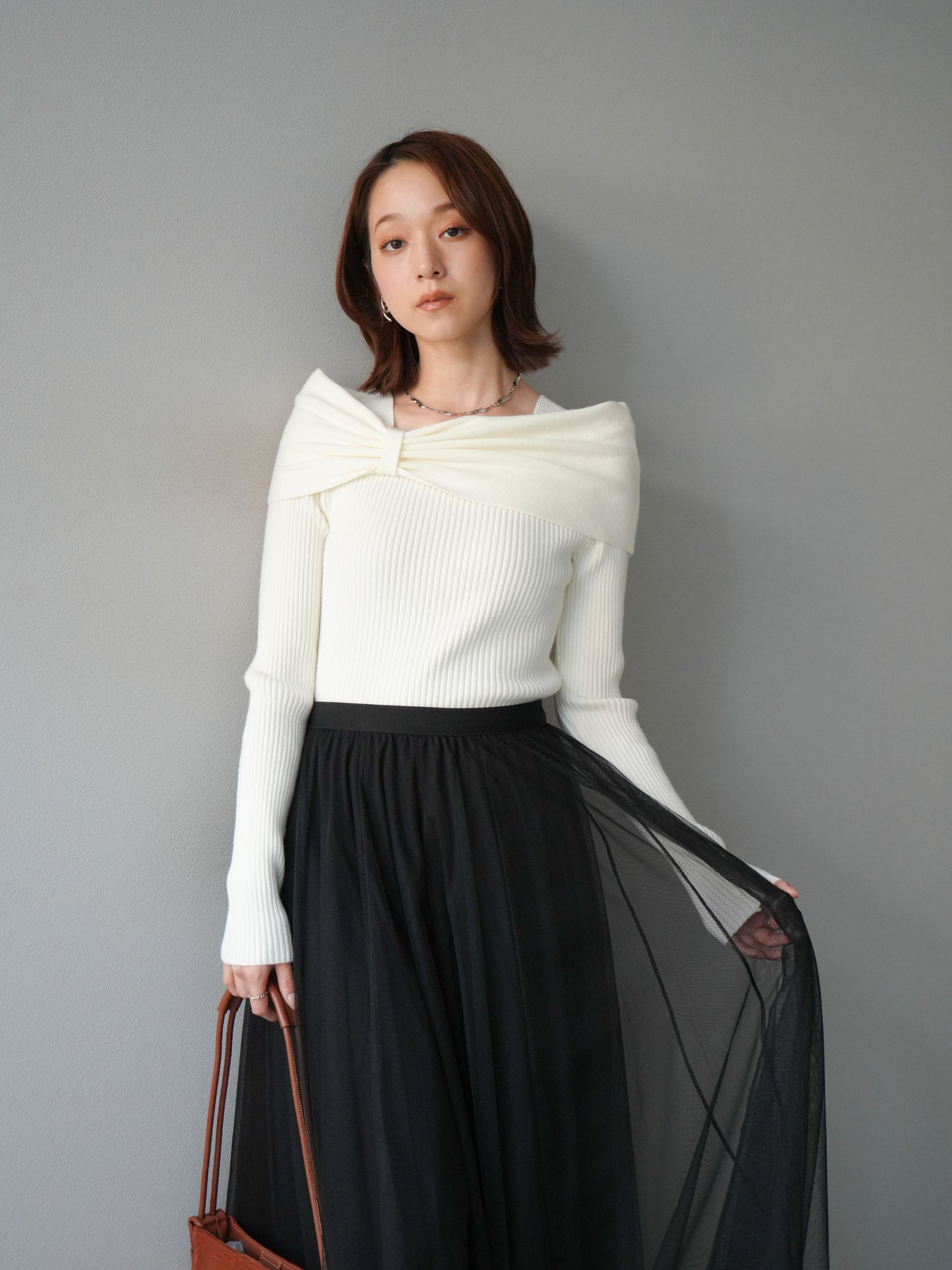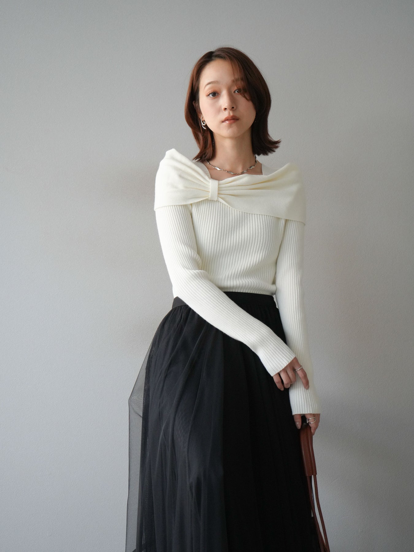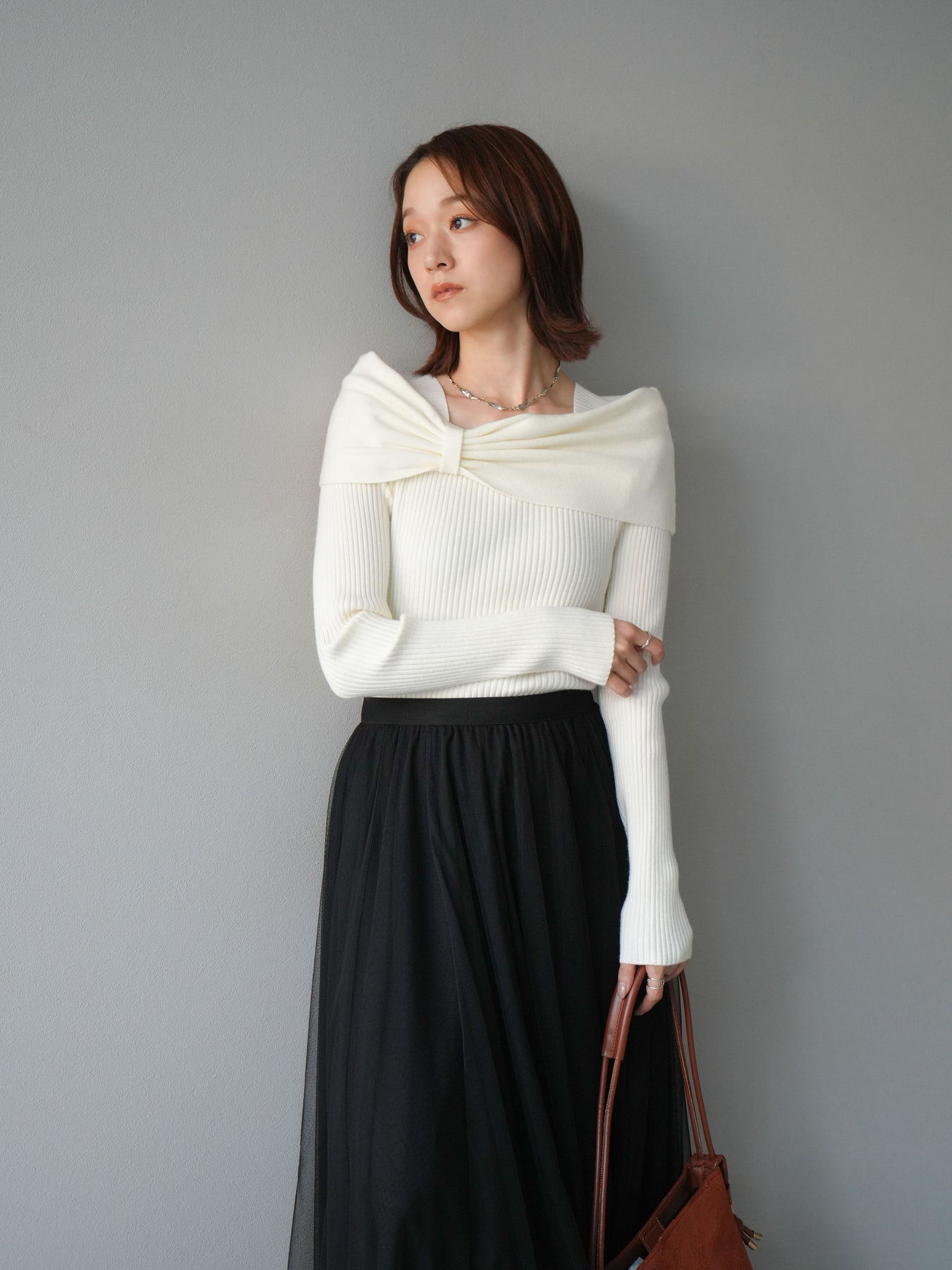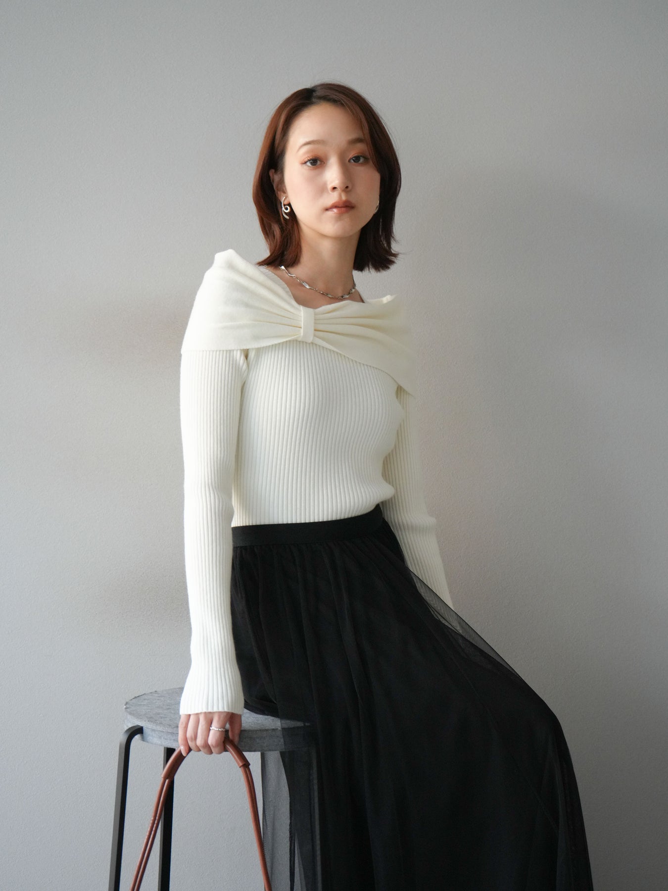 [予約]リボンモチーフオフショルリブニットトップス/white