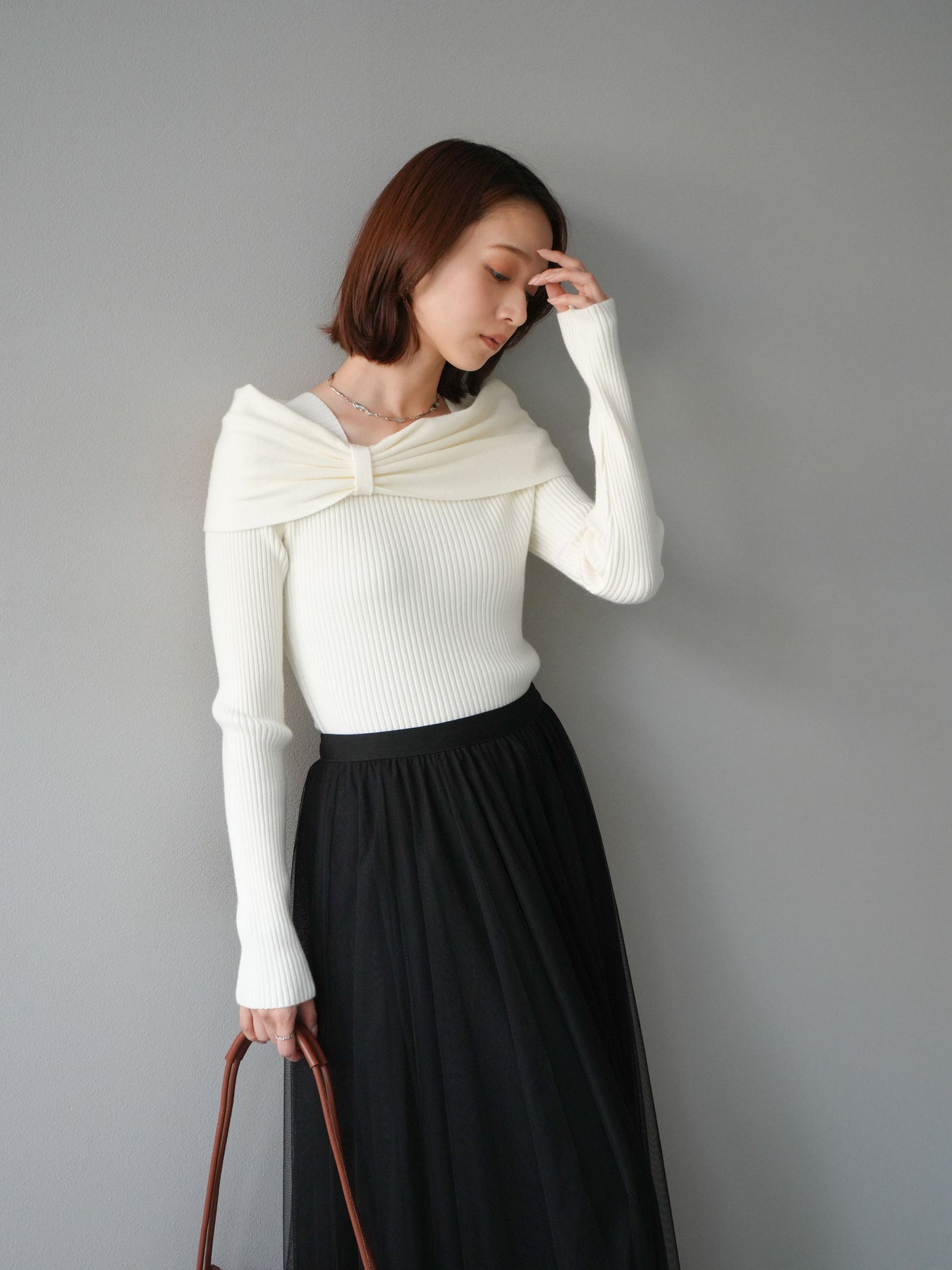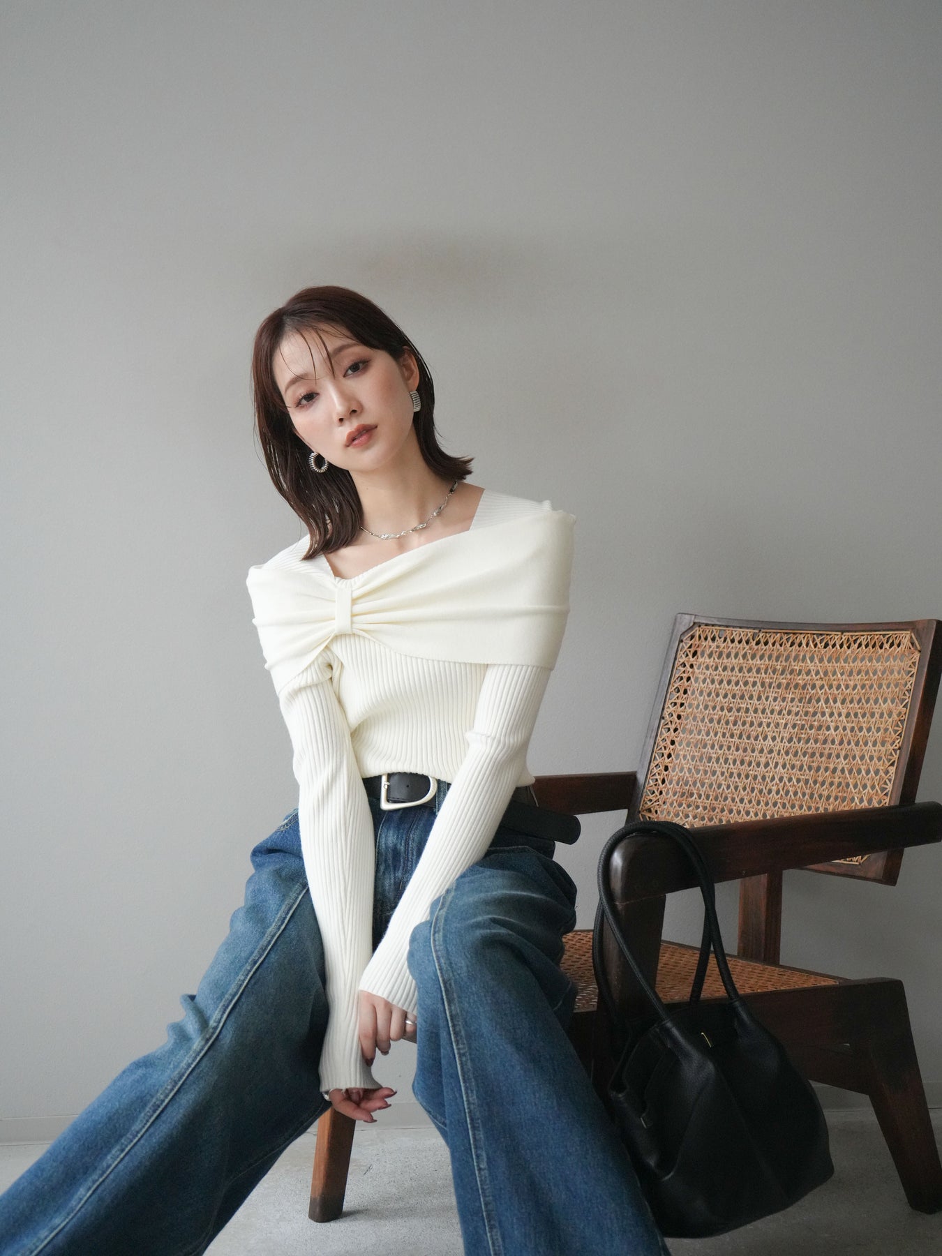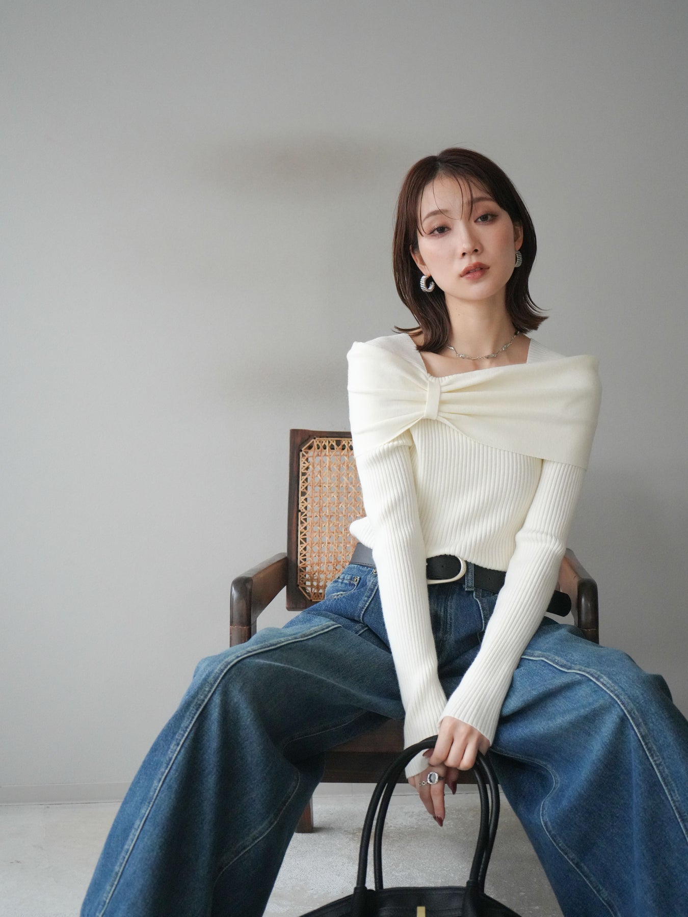 [予約]リボンモチーフオフショルリブニットトップス/white